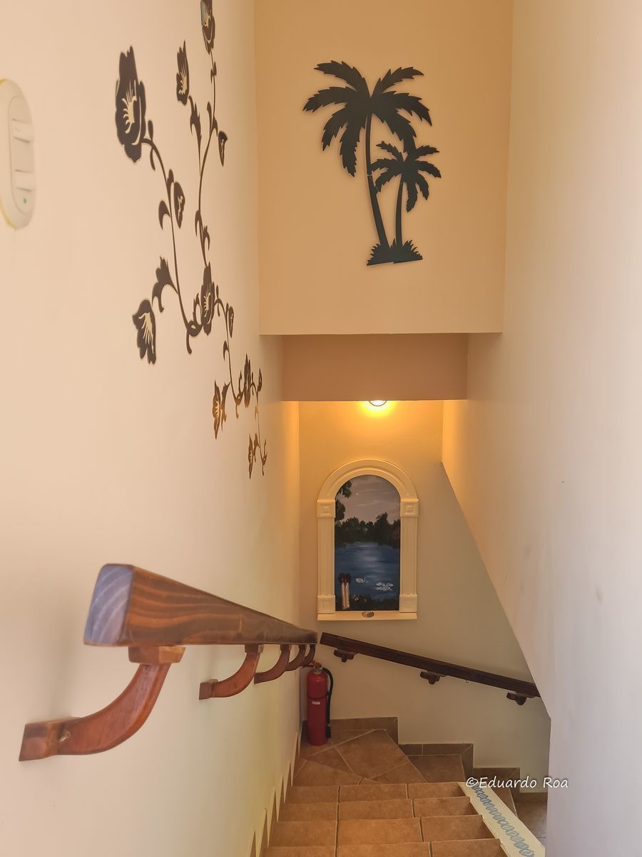 An angled staircase takes you up to the two bedrooms. The master has a king-size bed and two built-in closets, plenty of room for your clothing and storage. The attached, covered balcony invites you to relax and enjoy the view of the aqua blue pool and surrounding tropical gardens. A full bath with a large shower is in between the master and second bathroom. This bedroom also has a built-in closet and a tropical view. An outdoor staircase takes you up to the rooftop, best used at night for stargazing.