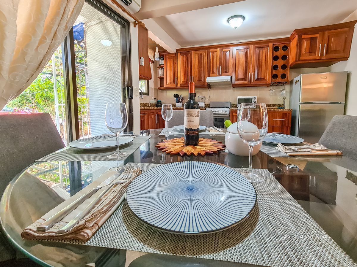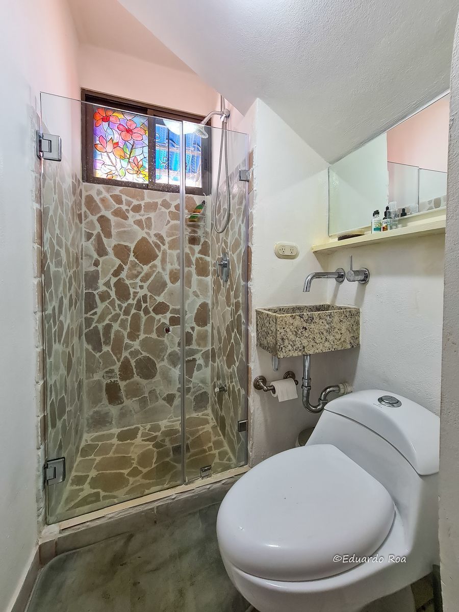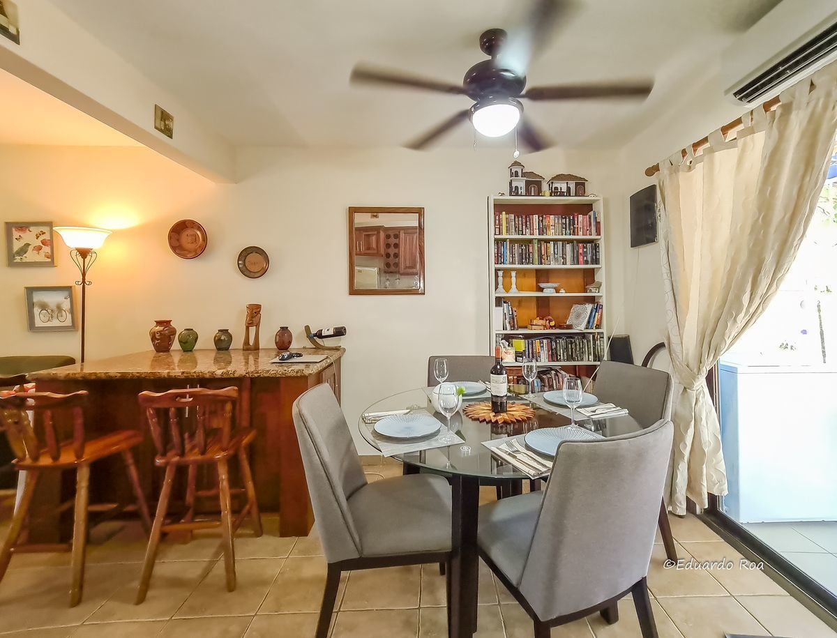 A built-in library is next to the sliding glass entry door. Across from the library is the kitchen outfitted with beautiful Guanacaste cabinet doors and nickel hardware, a wine and glass rack, granite countertops, and all the necessary appliances to prepare a delicious meal. A dining room set for four is the perfect place to share these meals and the adventures of your day. The free-standing granite and wood bar is great for entertaining and extra seating. A petite full bath has a small granite sink and a beautiful stone-sided shower. The placement of the two sofas in the living area encourages conversations and the whole room is brightened with natural light from the sliding glass doors. Completing this floor is a small terrace in front which faces the pool and is sweetly decorated with two chairs and bright flowers.