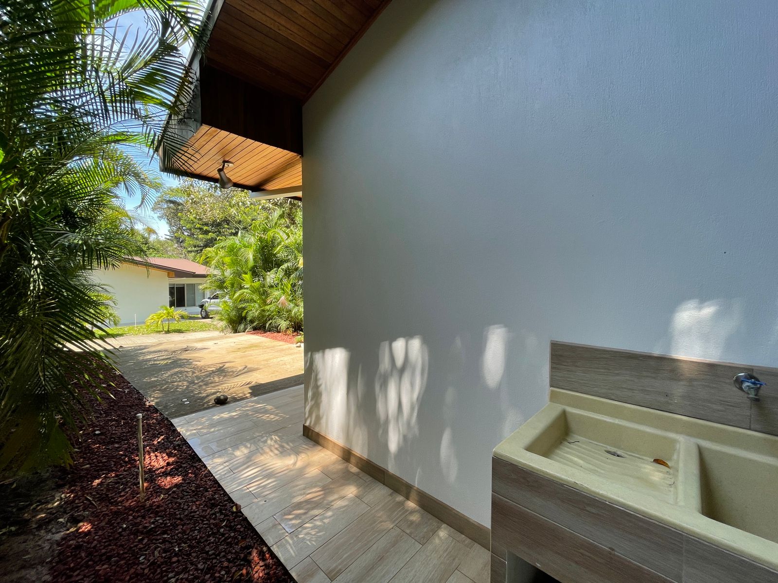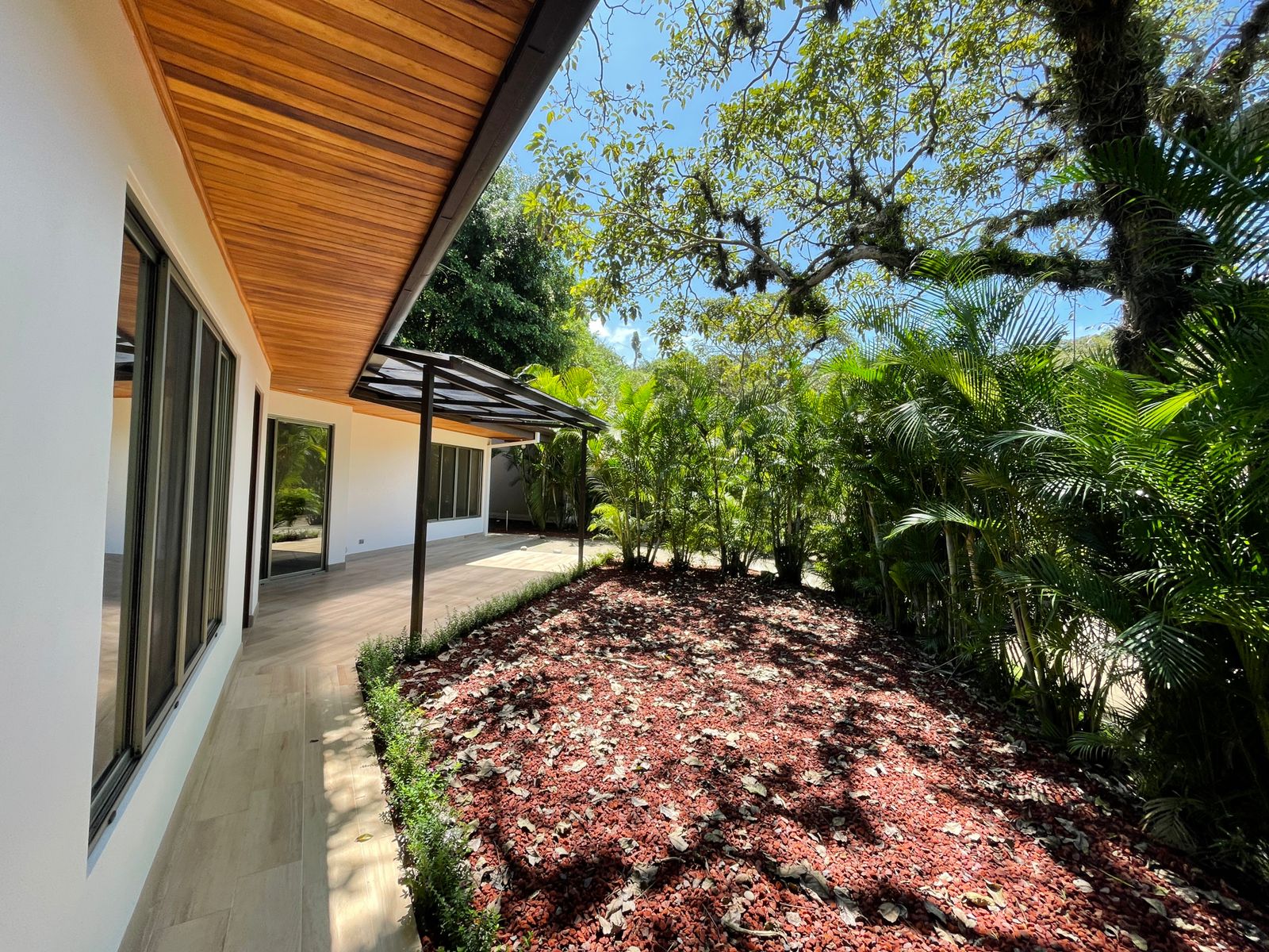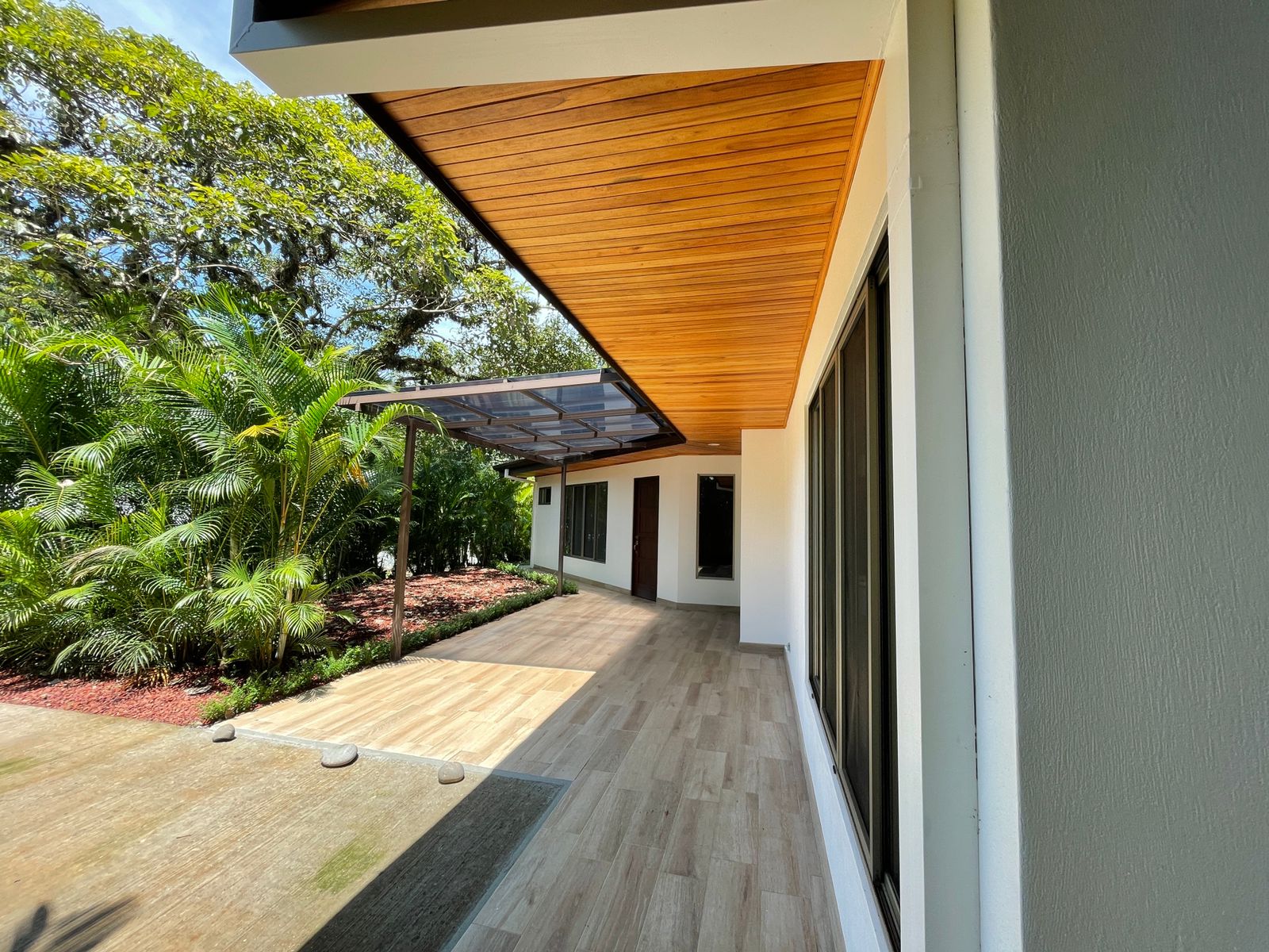 This gorgeous home features 2 bedrooms, 2 full bathrooms, a gorgeous wooden kitchen, and an open dining and living room. The exterior of the house features a cozy covered patio and a double carport. The house is surrounded by a beautiful garden. The front of the house is surrounded by palm trees that provide much privacy to the home. The house entails a beautiful interior and exterior design with the use of fine natural materials.
