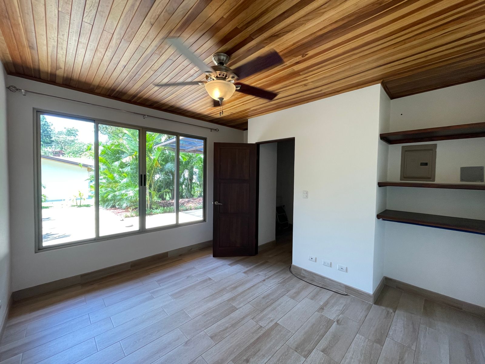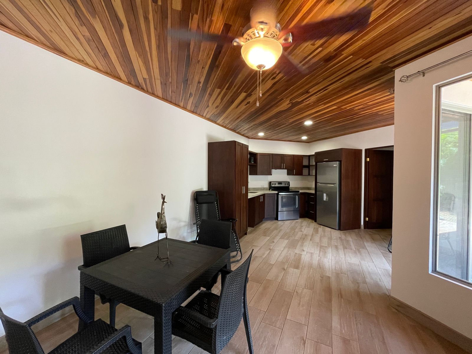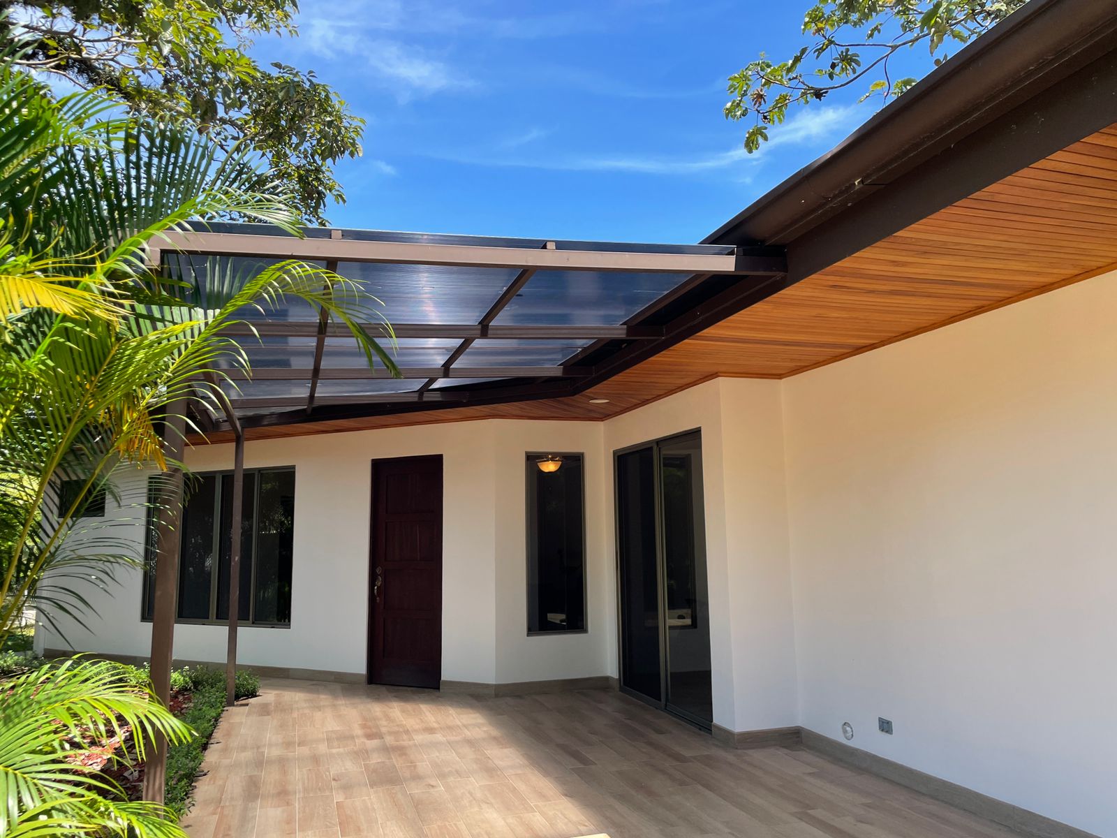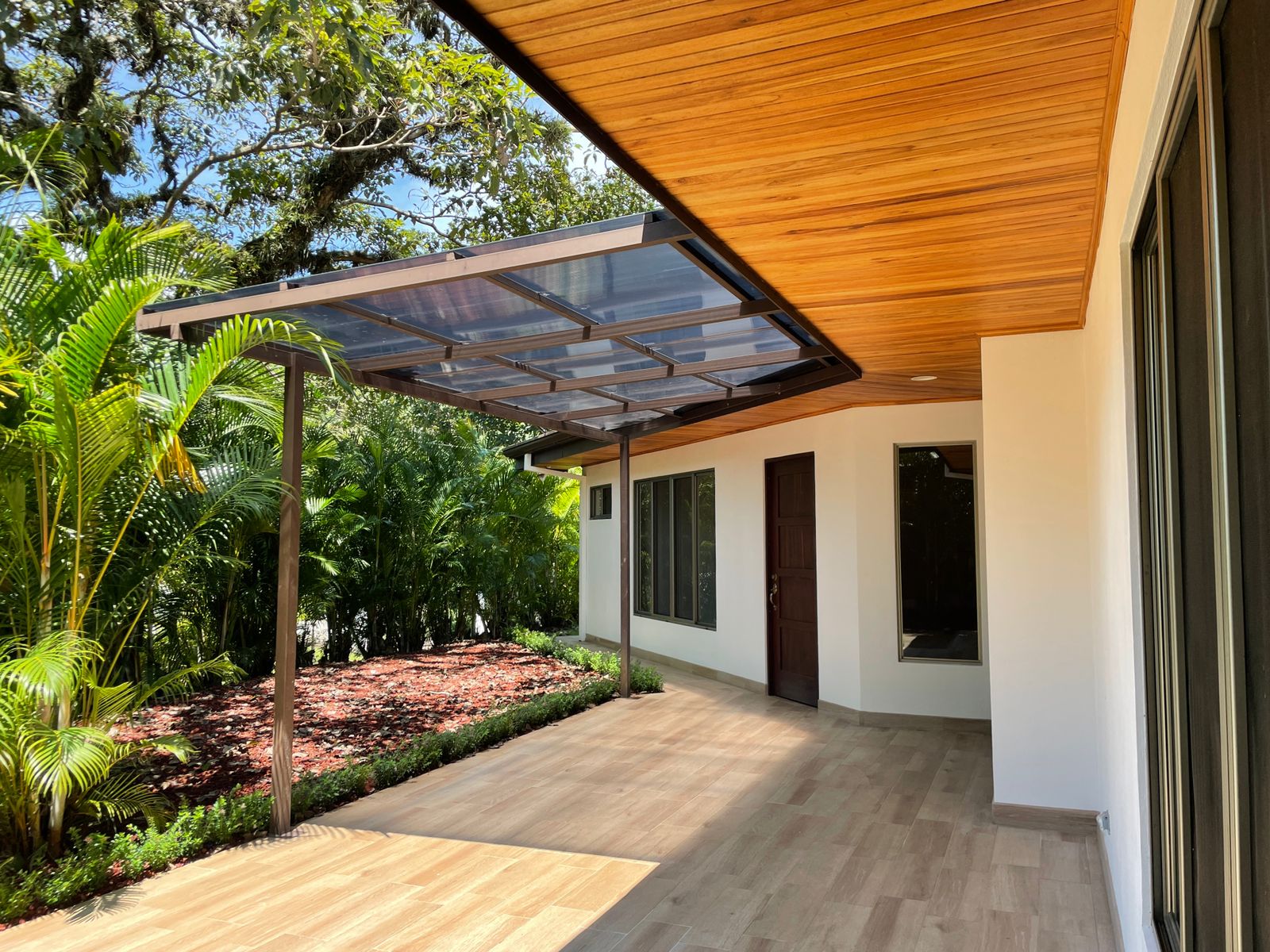 This gorgeous home features 2 bedrooms, 2 full bathrooms, a gorgeous wooden kitchen, and an open dining and living room. The exterior of the house features a cozy covered patio and a double carport. The house is surrounded by a beautiful garden. The front of the house is surrounded by palm trees that provide much privacy to the home. The house entails a beautiful interior and exterior design with the use of fine natural materials.