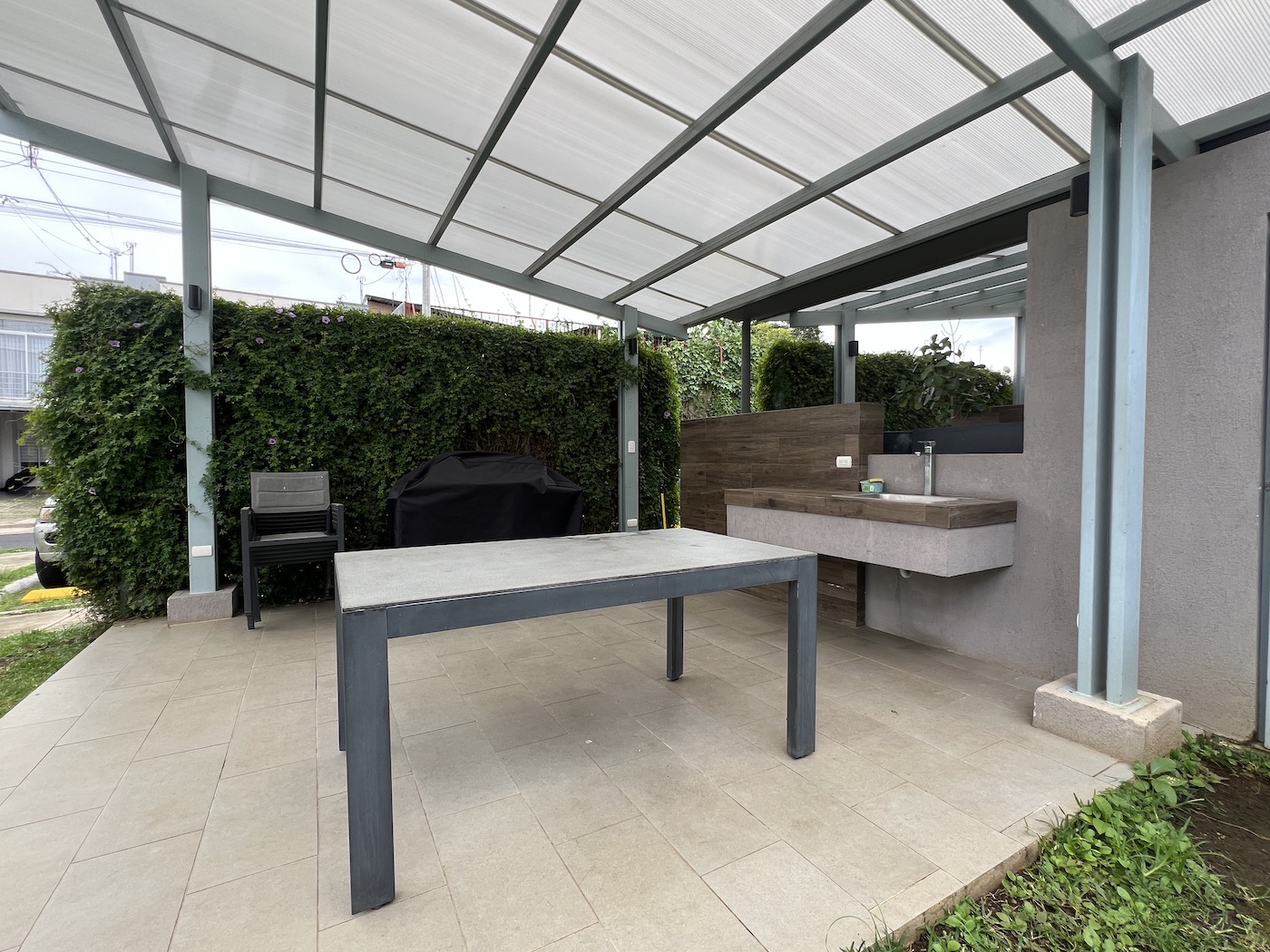 El patio privado es un espacio perfecto para disfrutar de la tranquilidad y el buen clima, ideal para desayunos al aire libre o simplemente para relajarse. Además, la casa cuenta con dos espacios de estacionamiento.