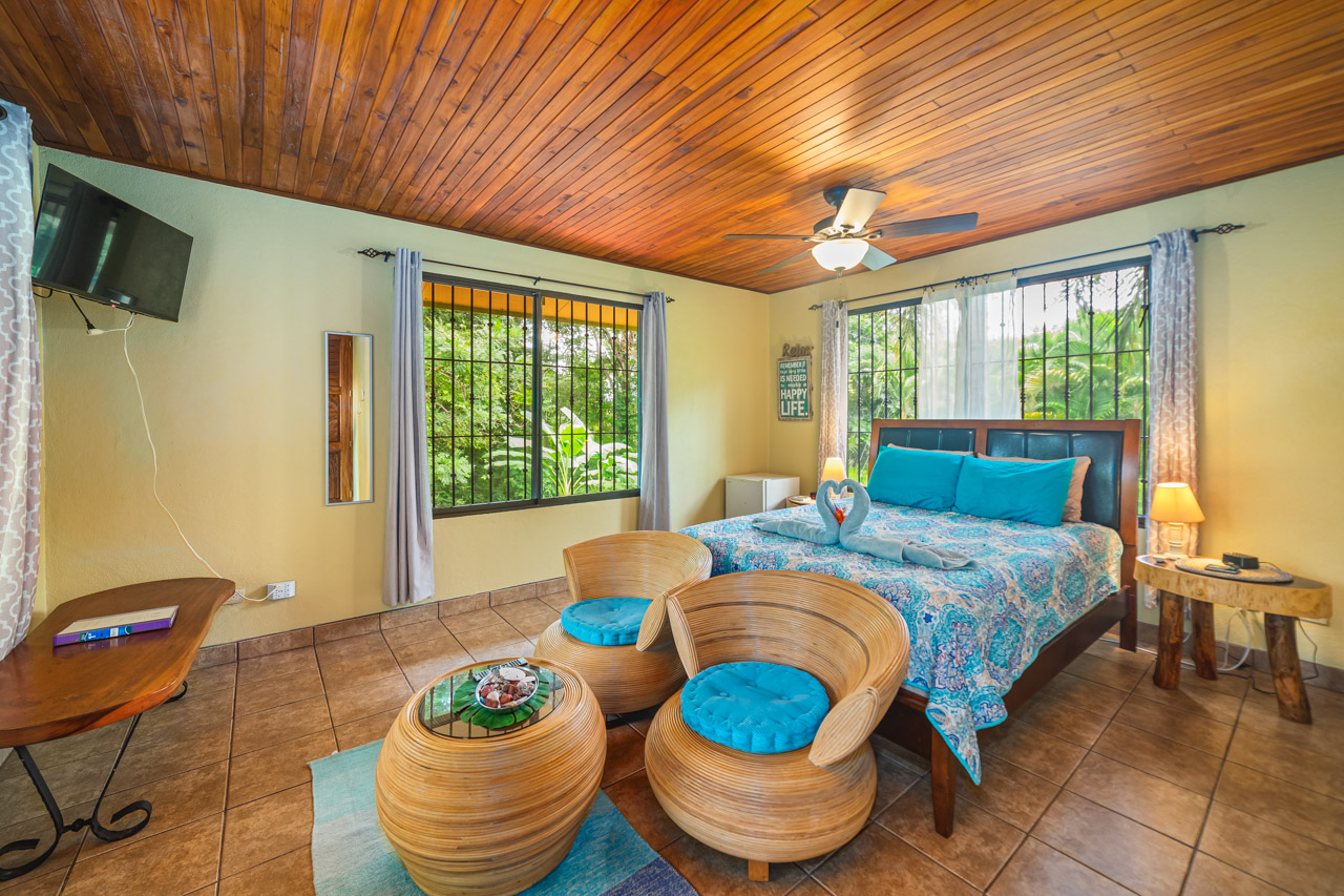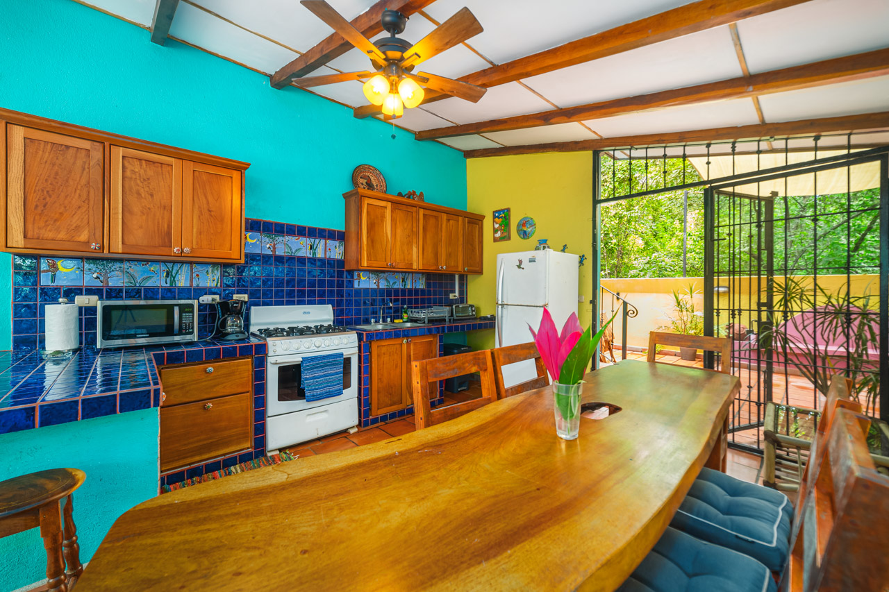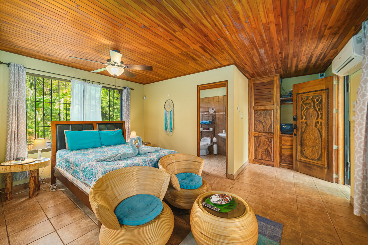 The home is simple yet cozy, featuring two separate living units. This thoughtful design allows for individual renters to share the space or gives you the opportunity to host family and friends with added privacy compared to a traditional layout. Constructed with solid concrete block, teak wood ceilings, tile floors, and high-quality, durable materials, this property is built to last. Its lush tropical gardens provide privacy as well as serene views from your terrace and balcony, overlooking both your garden and the surrounding jungle.