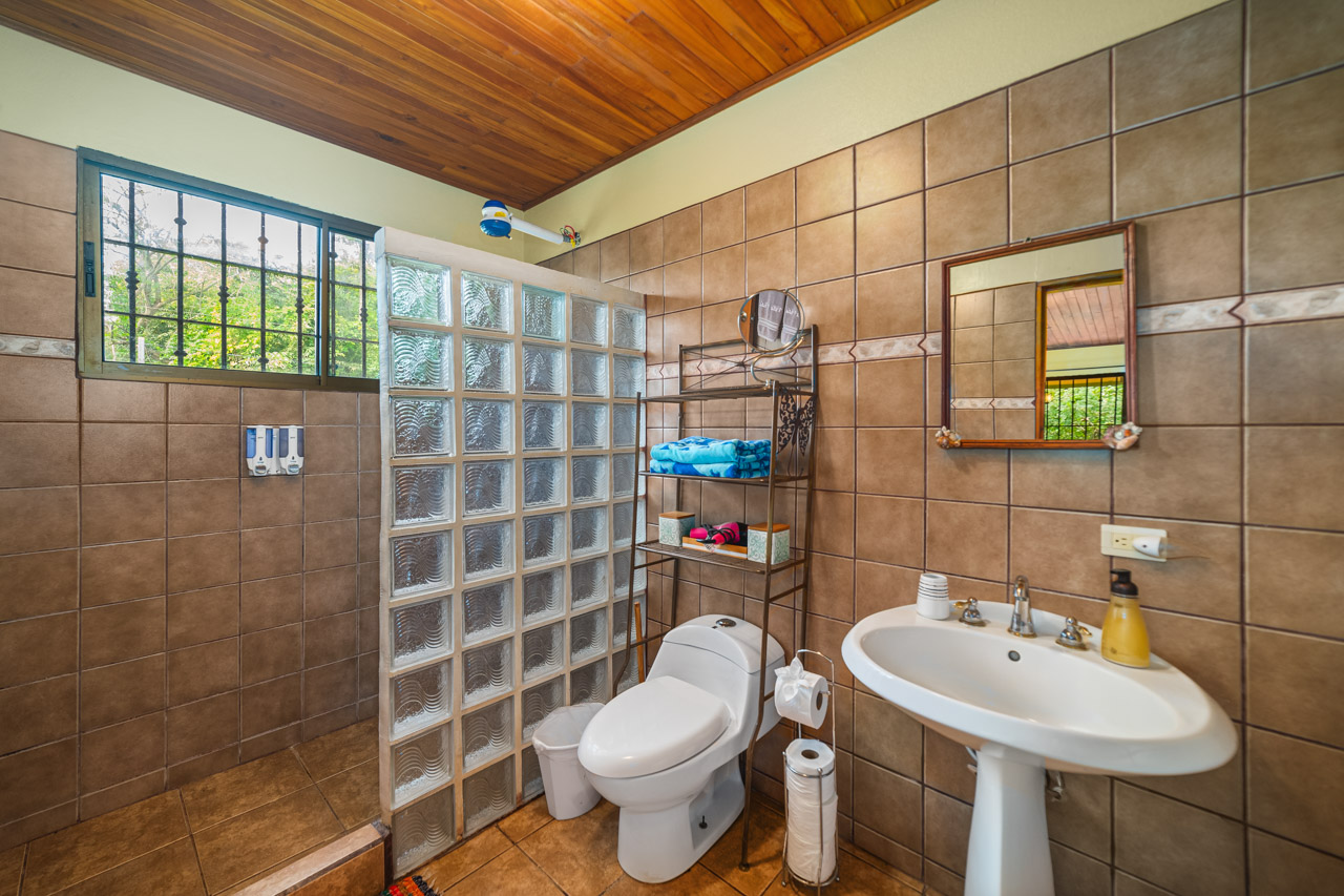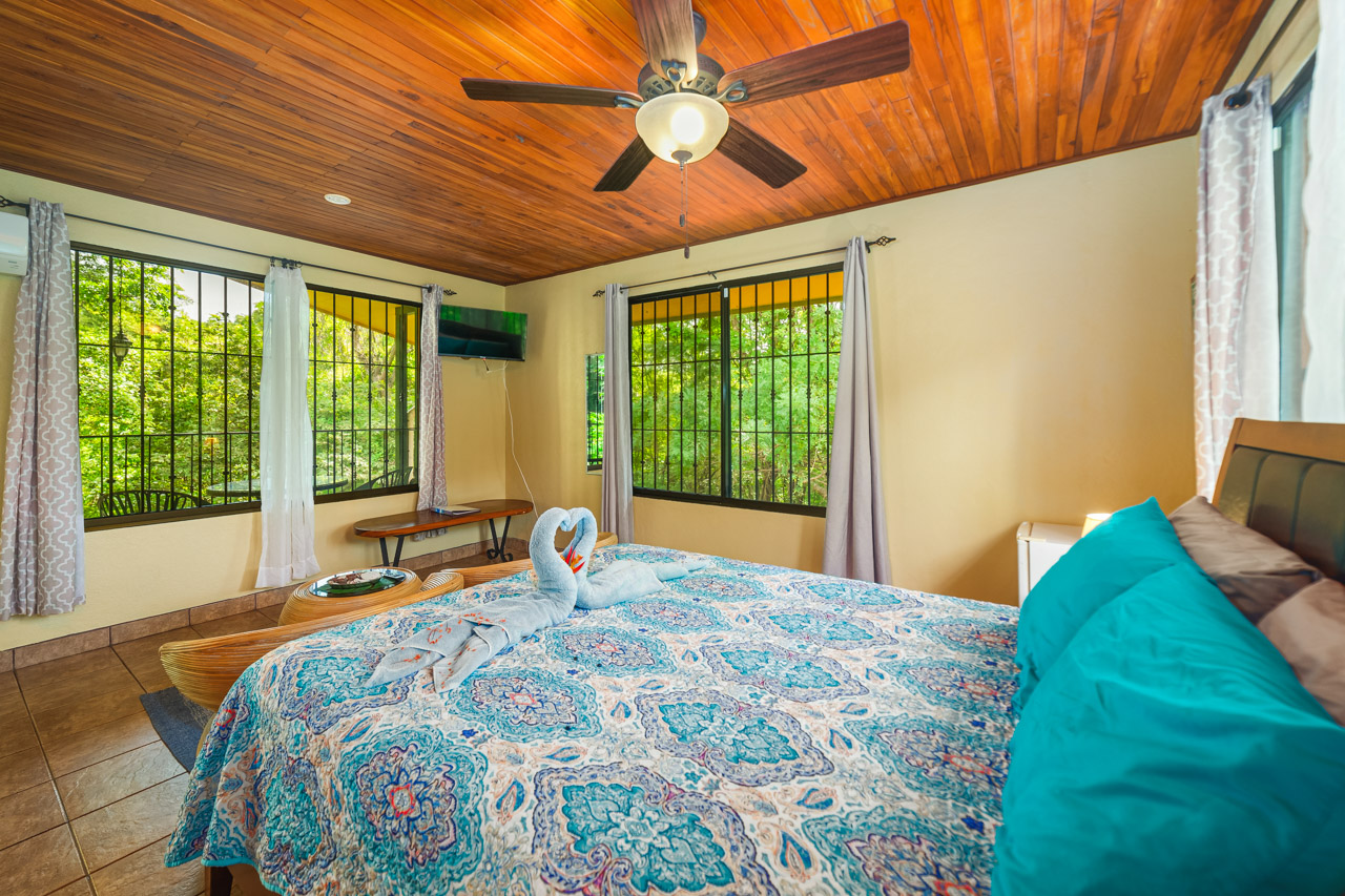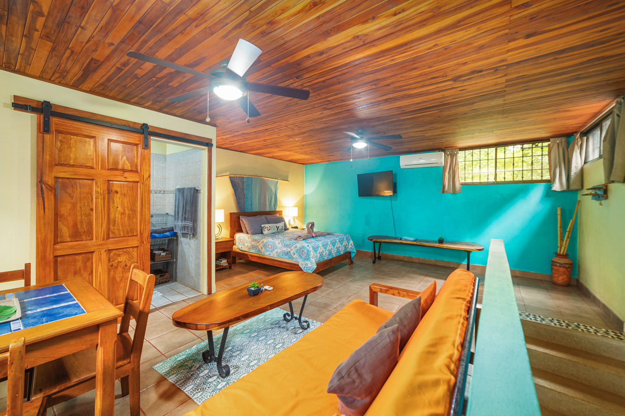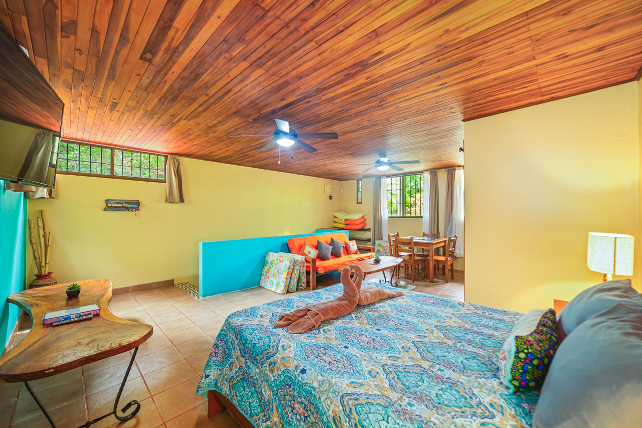 The second-story bedroom is accessible from a beautifully designed courtyard, which serves as an ideal gathering spot for family and friends. An open staircase leads to the upstairs suite, with stunning jungle views along the way. In the surrounding trees, you’ll often spot howler monkeys, armadillos, deer, and other wildlife. Upon reaching the balcony—a perfect place for your morning coffee with the monkeys—the upstairs bedroom offers its own en-suite bathroom and green views through every window.