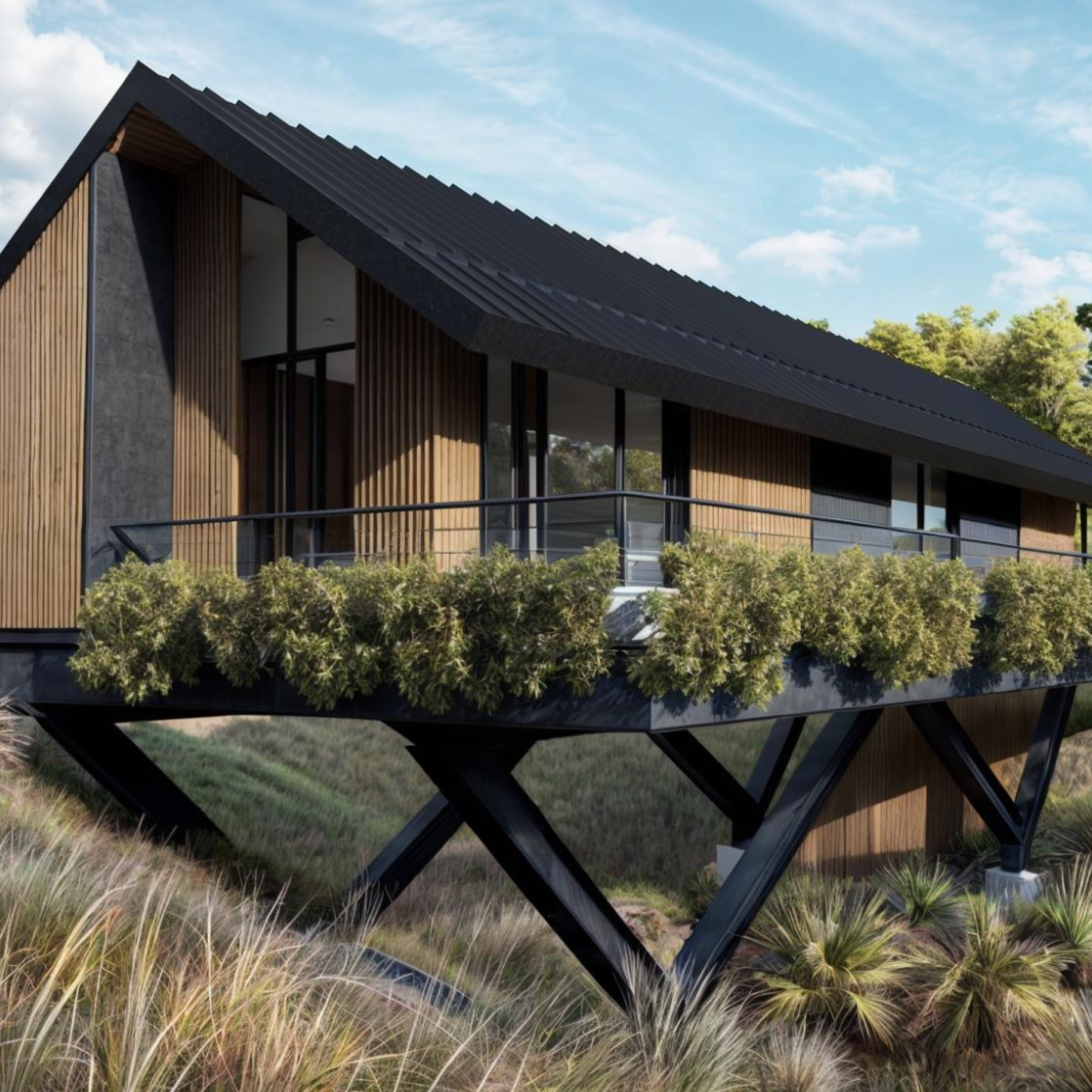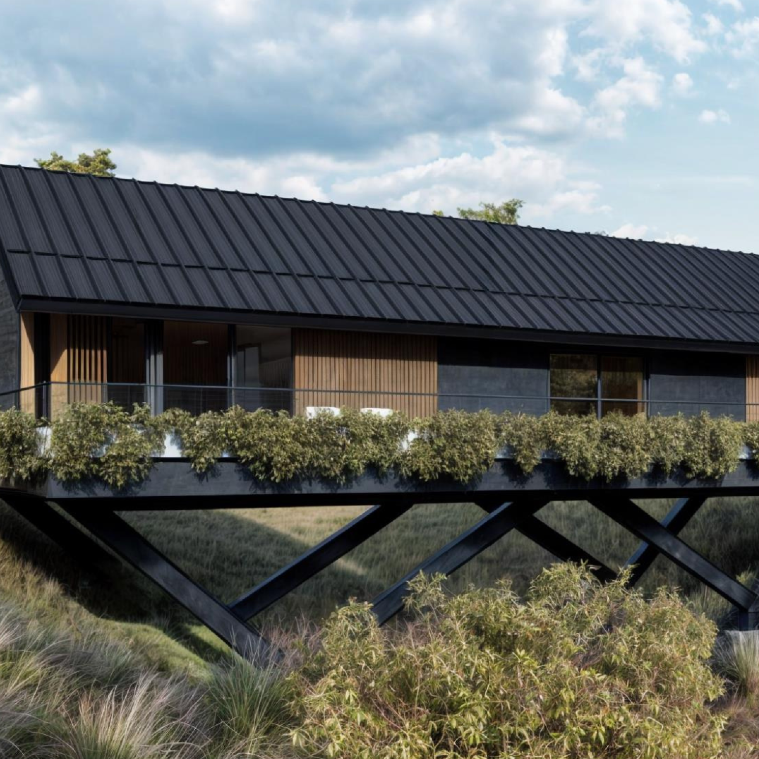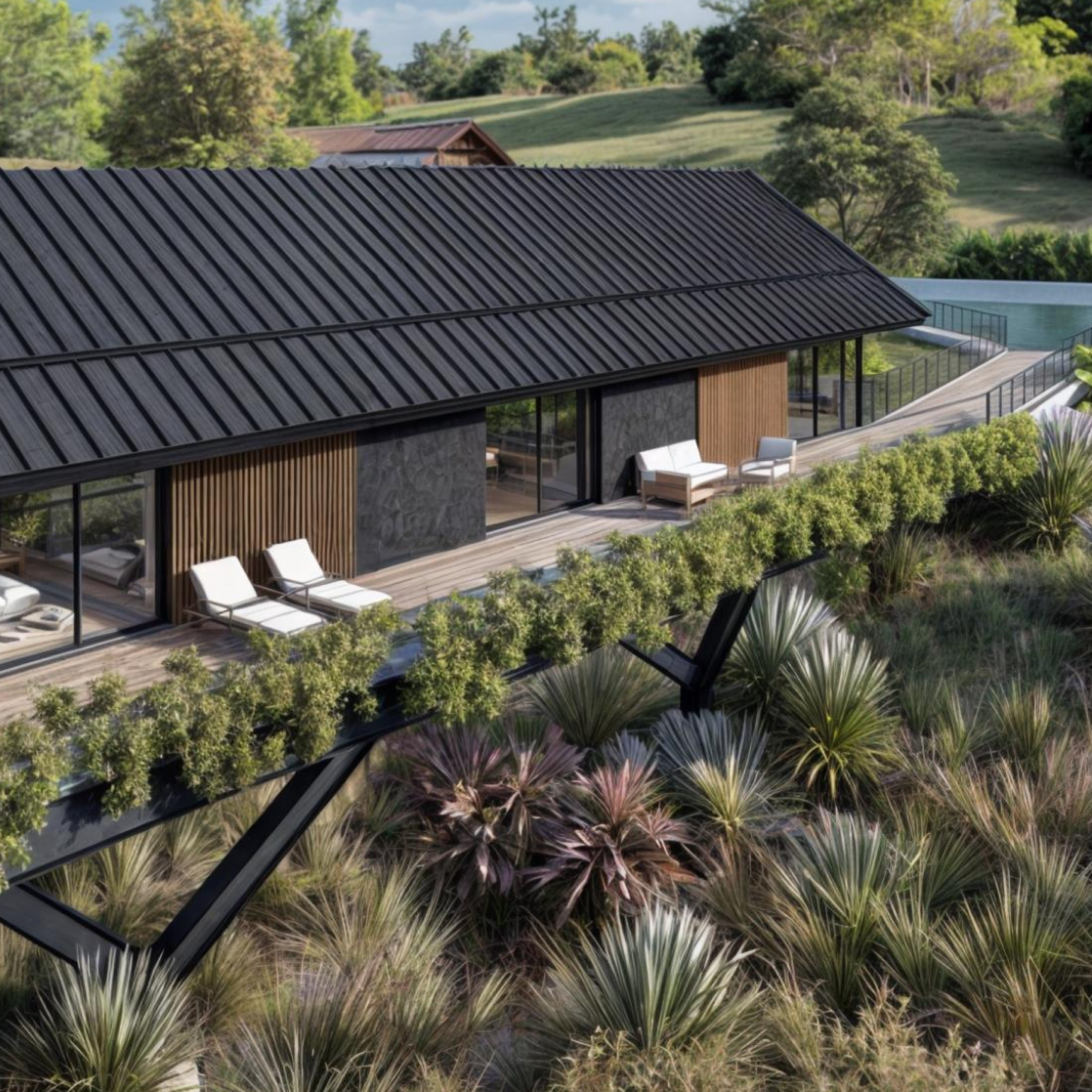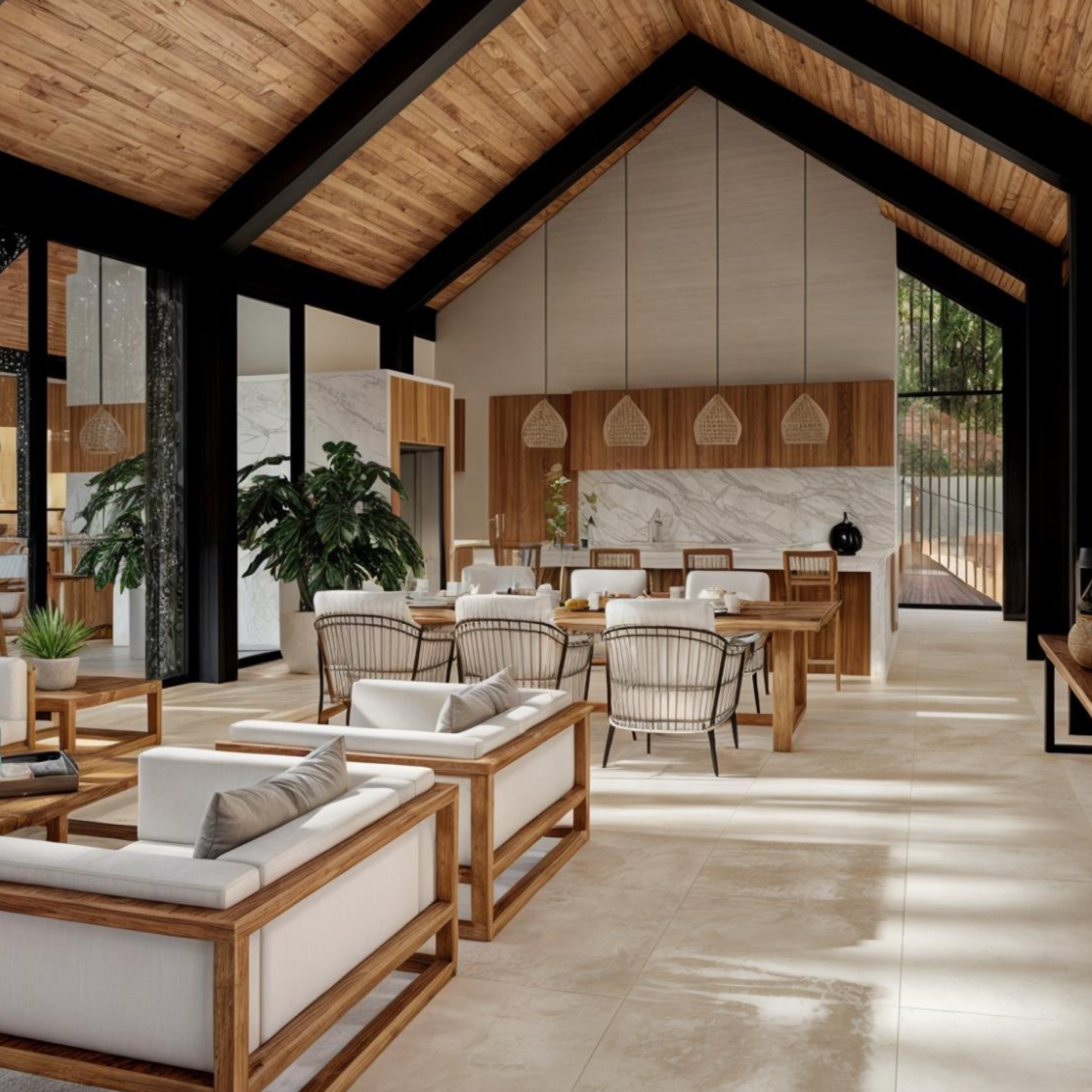 • Includes solar panels and battery systems for energy efficiency. • Rainwater Management: The sloped roof and landscaping efficiently direct rainwater to reduce soil erosion and support local biodiversity. • Minimal Land Disruption: Construction and site planning prioritize the preservation of existing flora and fauna. • Optimized Natural Lighting: Floor-to-ceiling windows and open layouts reduce the need for artificial lighting during the day. • Durable Finishes: Use of high-quality, long-lasting materials such as porcelain tile and teak wood, ensuring longevity and reducing waste. • Thermal Comfort: Designed for the tropical climate with materials and architectural solutions that naturally moderate interior temperatures. • Passive Cooling Design: Strategically positioned to leverage natural airflow and cross-ventilation, minimizing the need for artificial cooling systems. • Movable Architectural Elements: Adaptable walls allow control over natural light, shade, and airflow to enhance energy efficiency. • Elevated Structure: Designed on a raised platform to adapt to the site’s terrain while protecting the natural ecosystem beneath. • Energy Efficiency: The home’s layout and design reduce reliance on energy-intensive systems, supporting a lower carbon footprint. • Sustainable Materials: Utilization of natural and locally sourced materials such as teak wood and stone, reducing transportation emissions.
