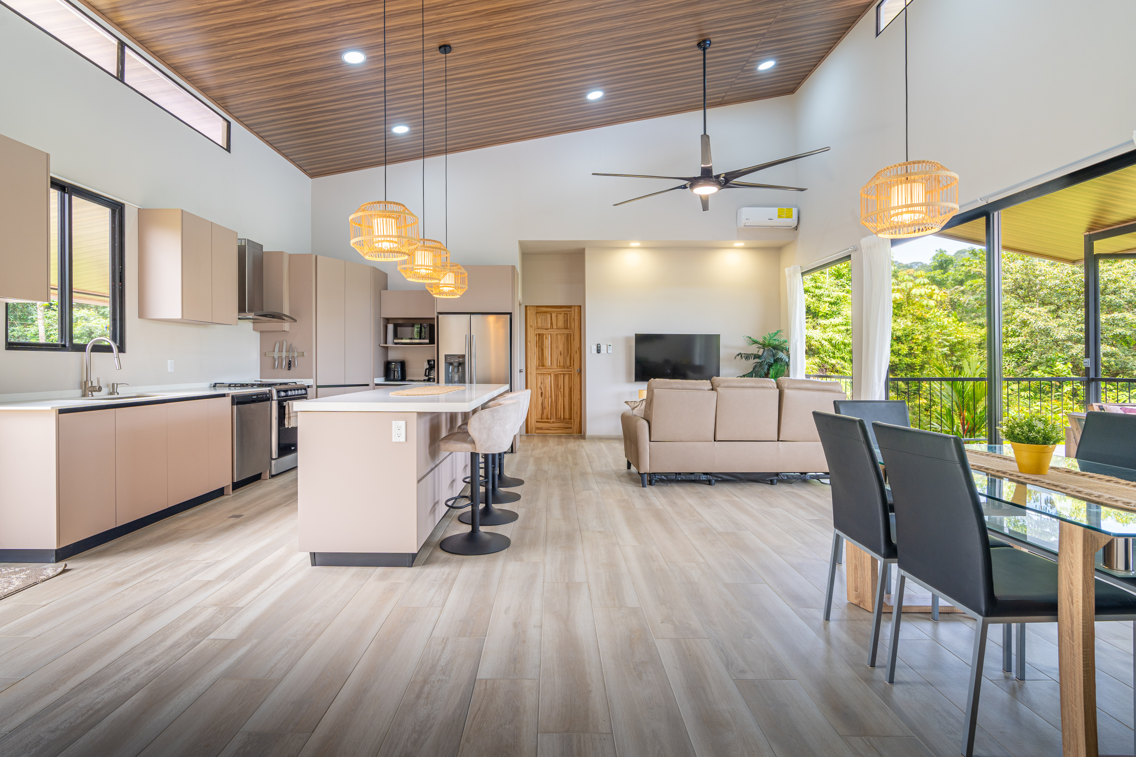 Inviting Living & Dining Area: Filled with natural light, a large-screen TV, and wall-to-wall sliding glass doors that open to the tropical outdoors.