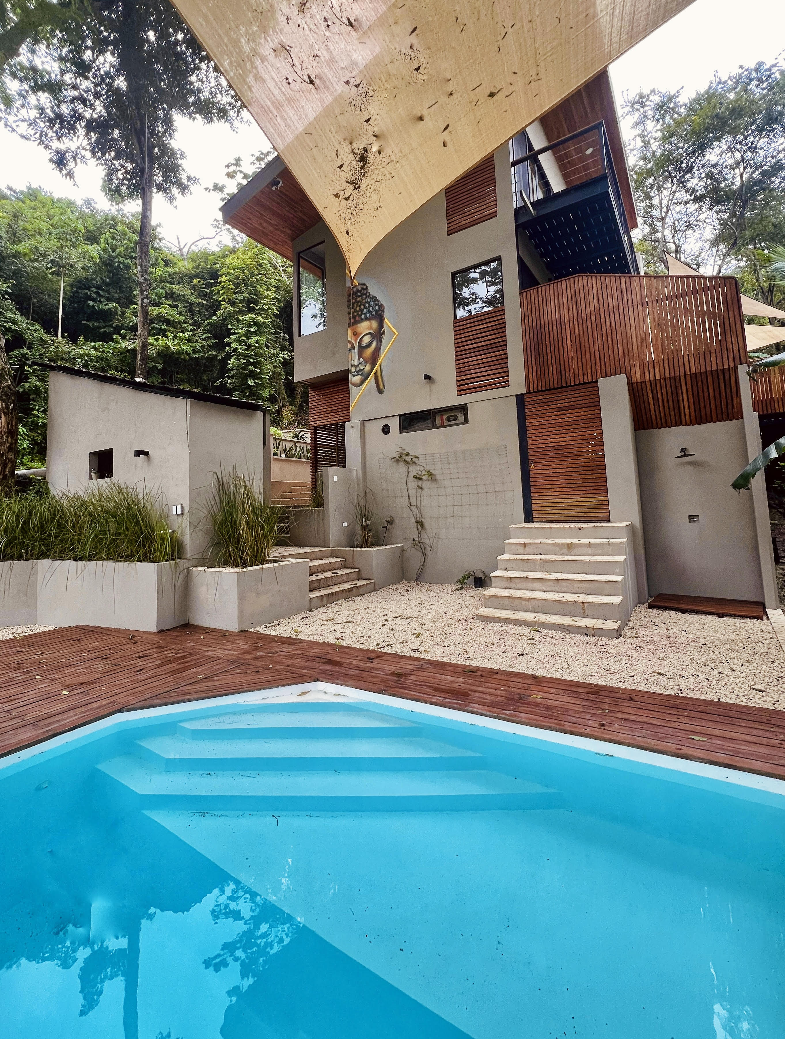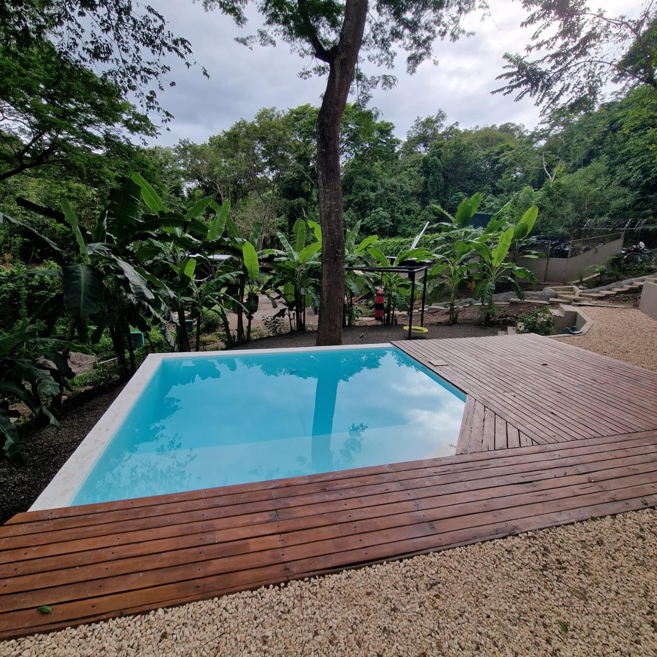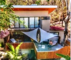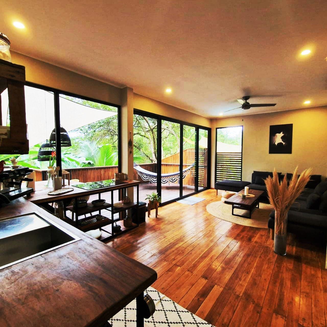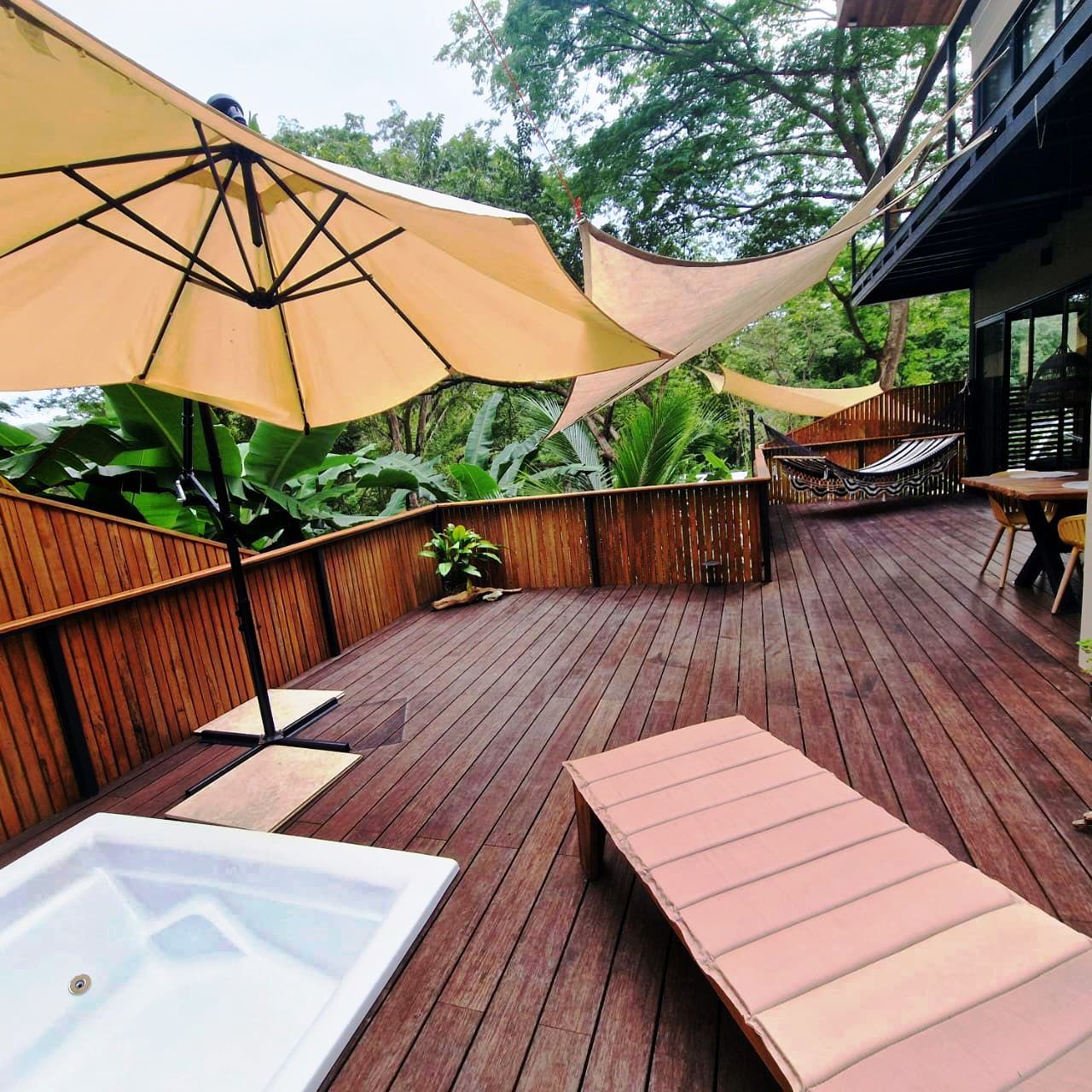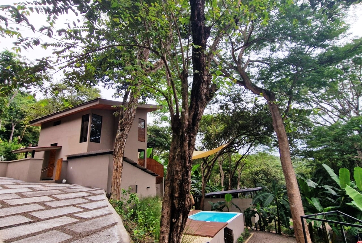 . A New Home in a New Beachside Community – Best of Tropical Living! Recently completed, this home is located in the newly established beach-side community of Playa Organos. This creative 3-level home offers the the best in tropical coastal living. Not only can you walk to the uncrowded, sandy beach but you are also surrounded by hundreds of acres of undeveloped forest land, home to parrots, monkeys, coatis, squirrels and dozens of other typs of birds. The home itself is designed for spacious socializing while maintaining the privacy and intimacy of a personal home. The first level has a small pool on a large deck and a kitchen area to provide for the poolside guests. On the second level there is another large deck with shading leading into the living room kitchen area. Also on this level, there is a large bedroom and bath. The stairs lead up to the 3rd level and the spacious bedroom and private deck. On the deck you have the views of the surrounding forests leading down to the nearby beach. Enjoy the jacuzzi on this deck, just off the bedroom. The custom bathroom adjoining this bedroom is complete with an outdoor open-to-the-sky, shower. A comfortable home while providing a variety of social options for entertaining or complete privacy. The Playa Organos beach is over a kilometer long and protected from large surf by the nearby Isla Tortuga islands. Swim in the 82-degree water, body surf or take a ride to the white sands of nearby Isla Tortuga. Just a few miles down the coast is the National Reserve of Curu with paths, tours and great opportunity to take pictures of the domesticated monkeys and deer there. A ten-minute drive from this home you will arrive in the small town of Paquera. Small, but complete with supermarkets, restaurants, hotels, a 24/7 hospital, hardware stores, a gas station and much more. Crime is almost non exixtent here and the local people are said to be the friendliest in Costa Rica.