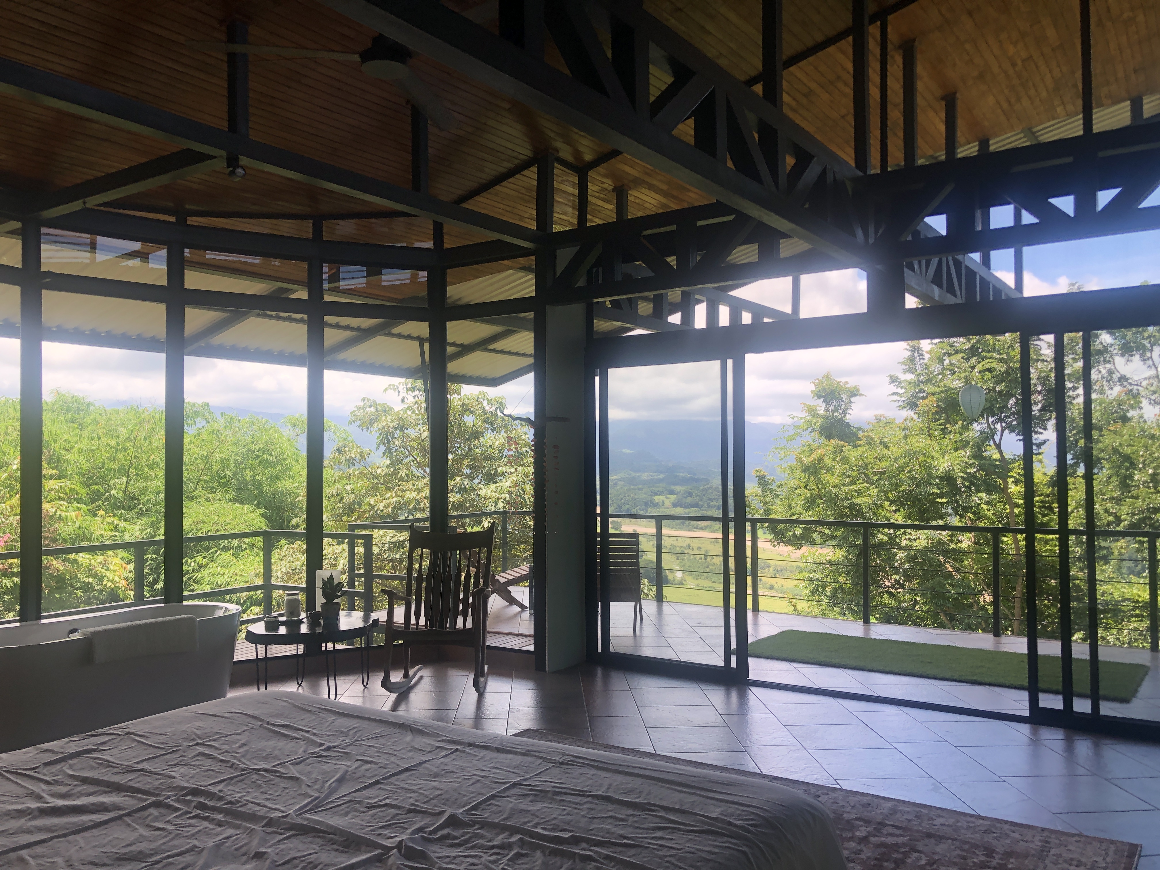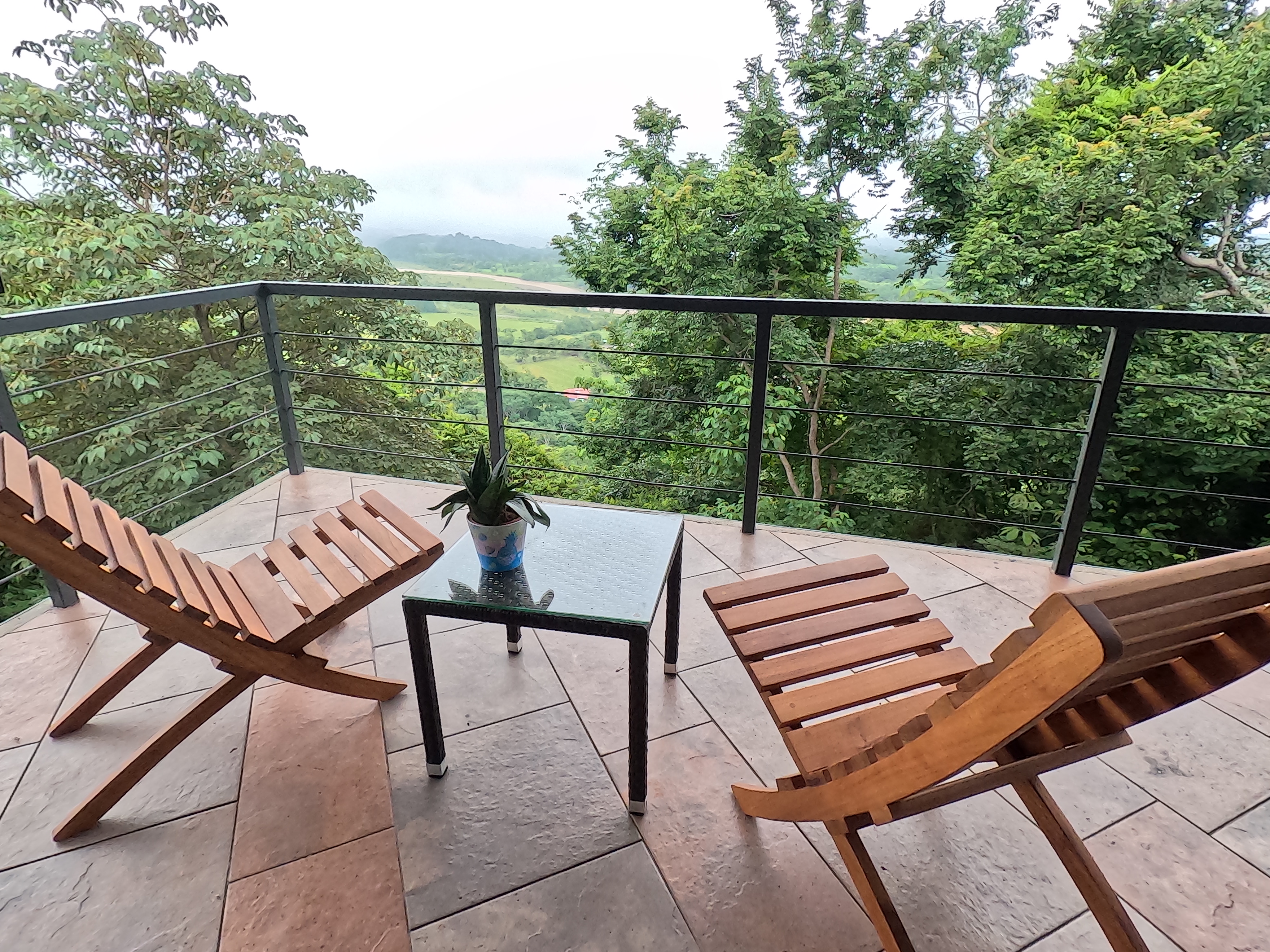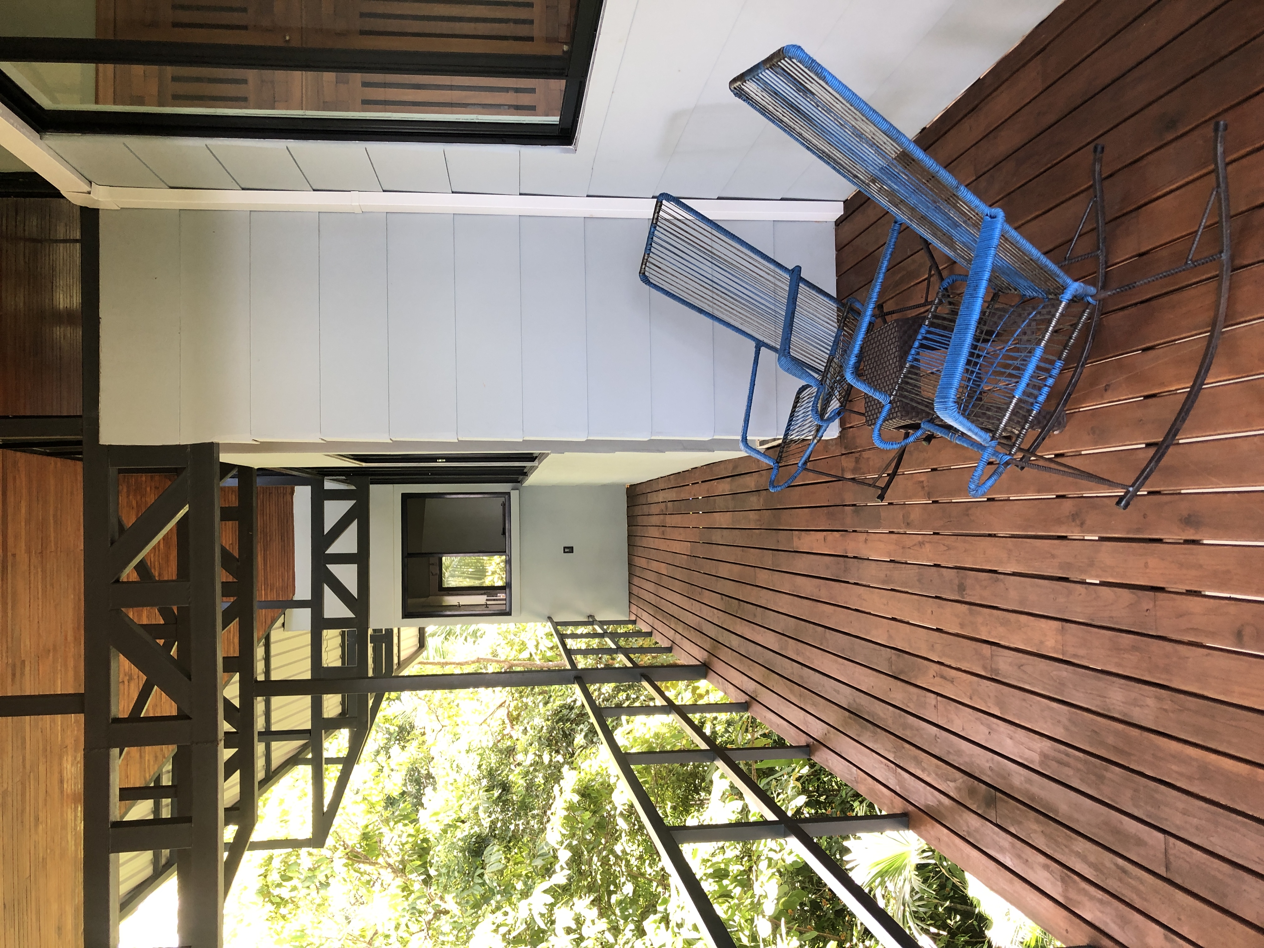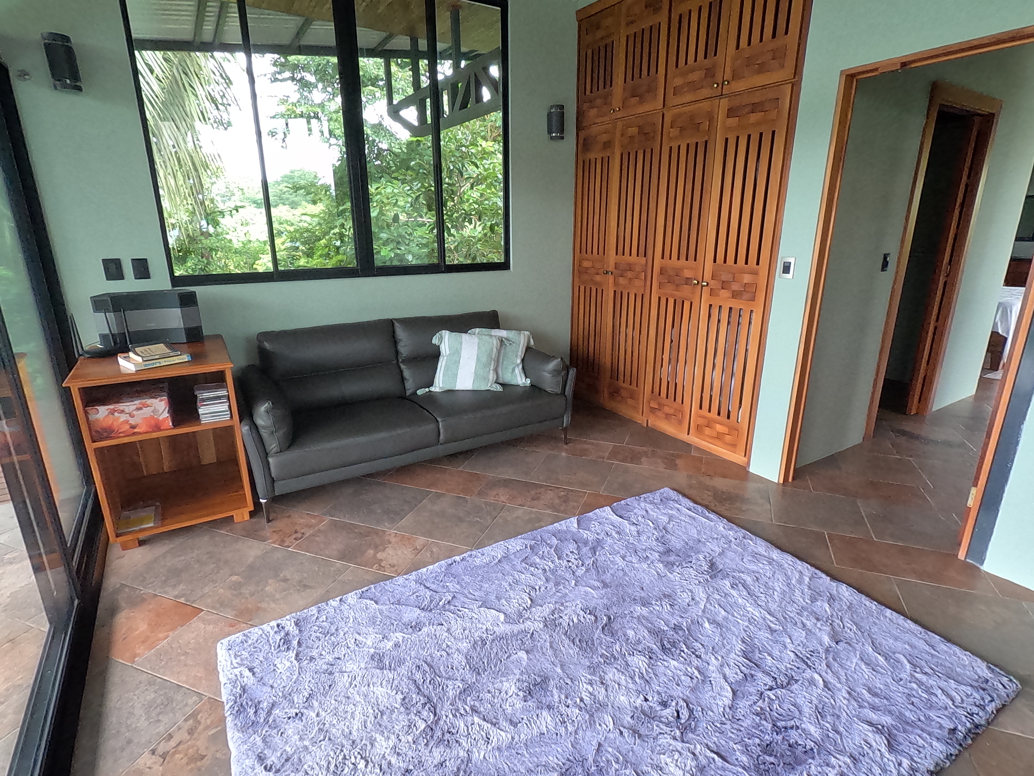 The secure private retreat features beautiful ceramic tile floors throughout. Upstairs you have an absolutely breathtaking view overlooking a spectacular rainforest river valley with majestic mountain in the distance, all from your immense master bedroom retreat, with custom made king sized bed, high teak wood ceilings, windows all around and a large bathroom with beautiful bathtub overlooking the expansive vista, a huge shower and bidet. This bedroom also has a large walk- in closet.