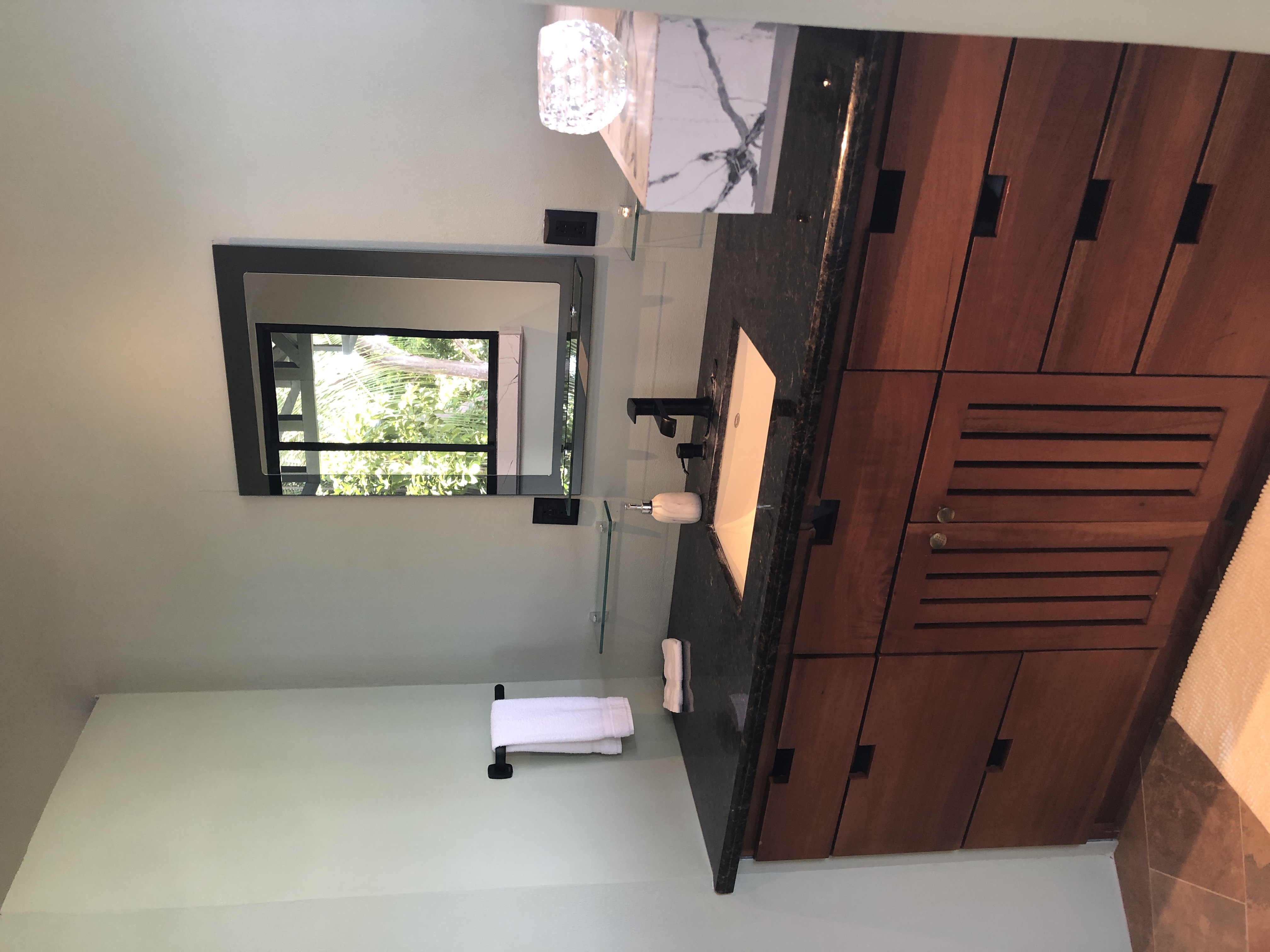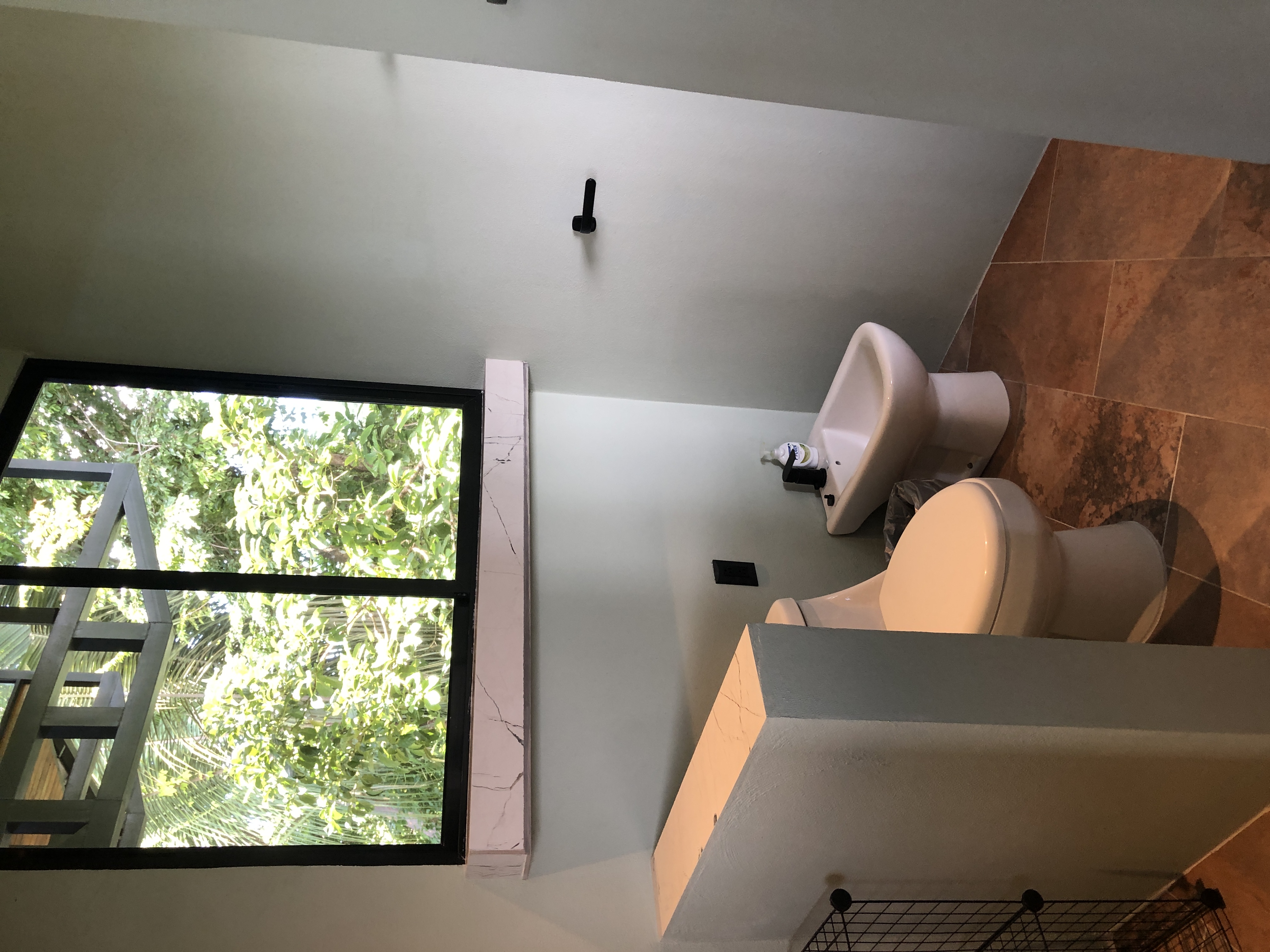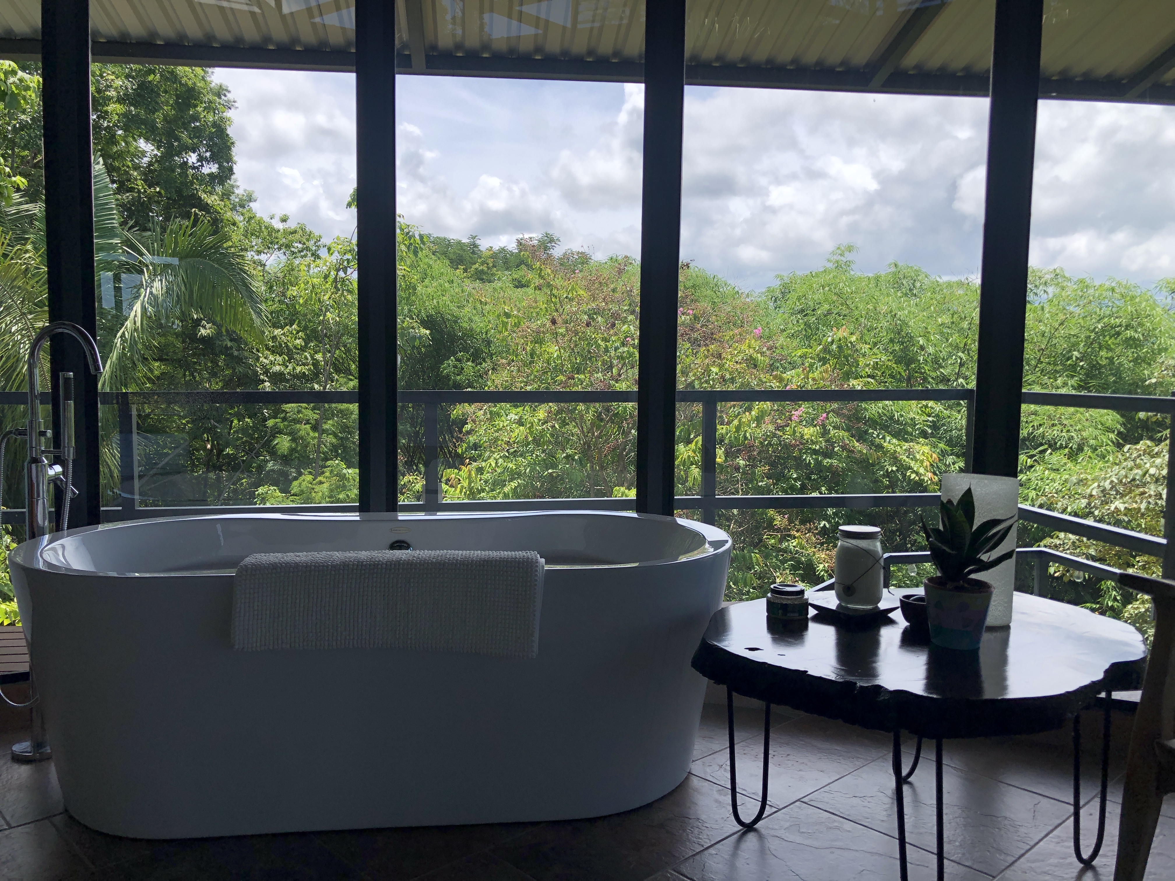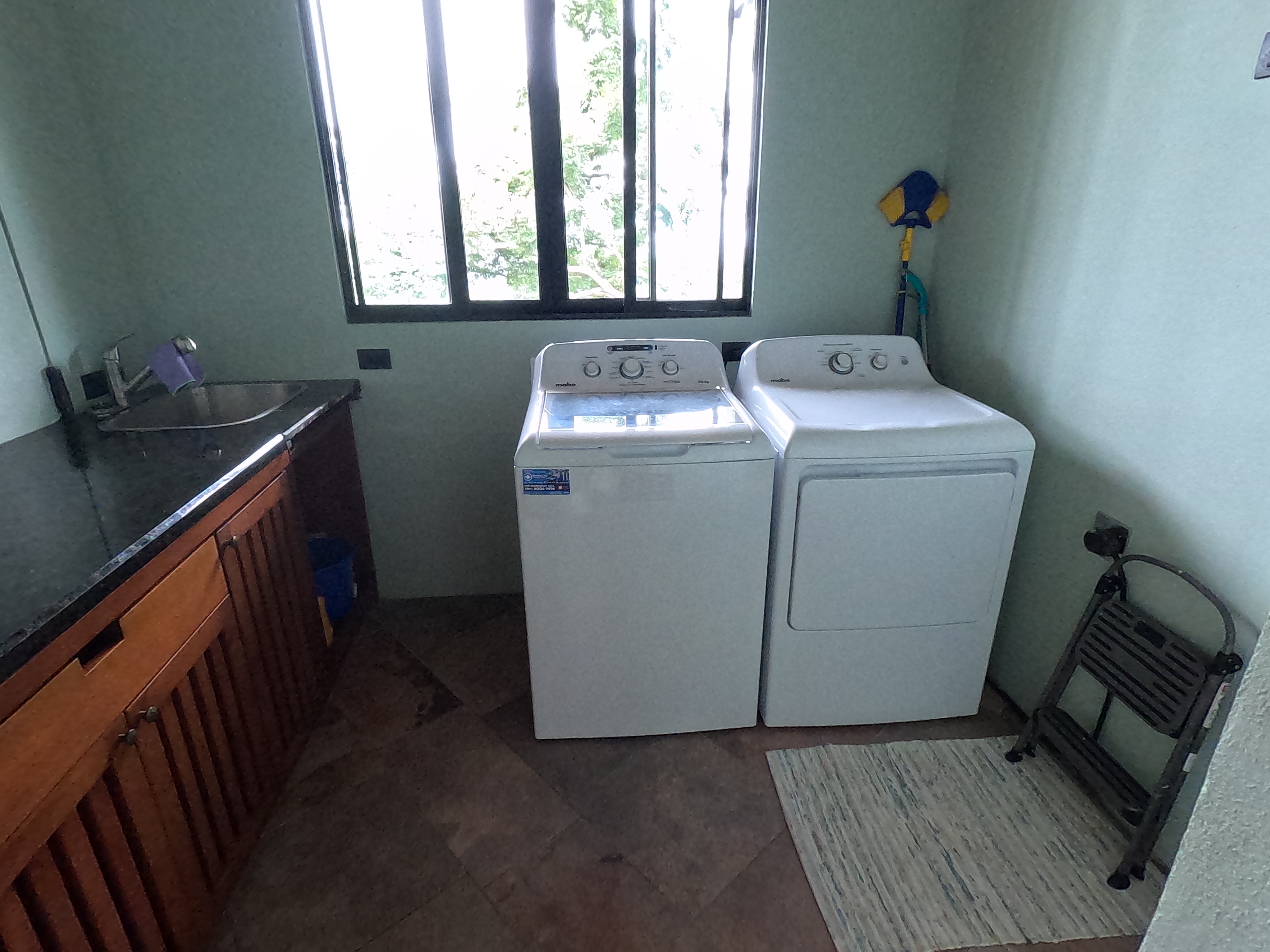 The secure private retreat features beautiful ceramic tile floors throughout. Upstairs you have an absolutely breathtaking view overlooking a spectacular rainforest river valley with majestic mountain in the distance, all from your immense master bedroom retreat, with custom made king sized bed, high teak wood ceilings, windows all around and a large bathroom with beautiful bathtub overlooking the expansive vista, a huge shower and bidet. This bedroom also has a large walk- in closet.