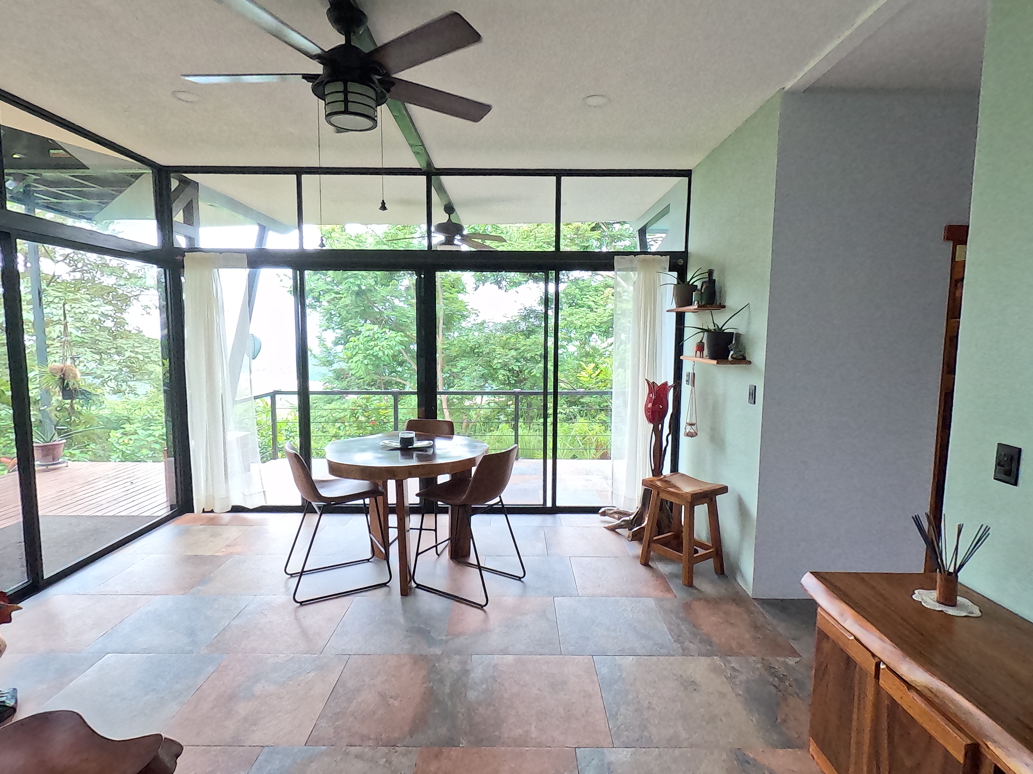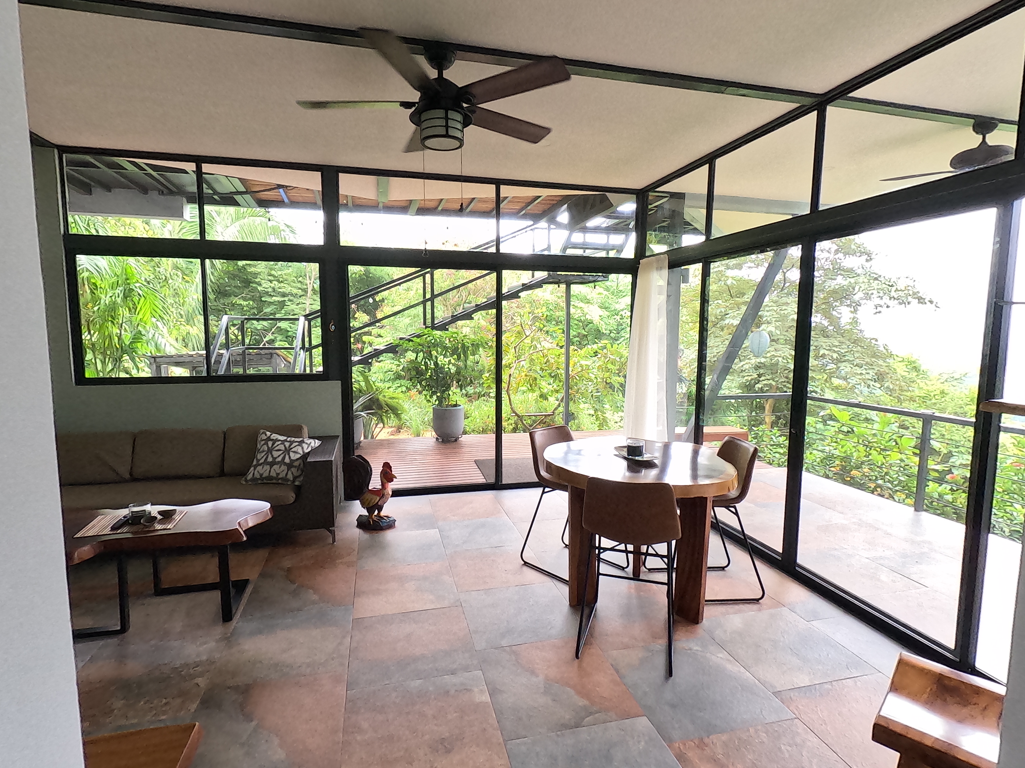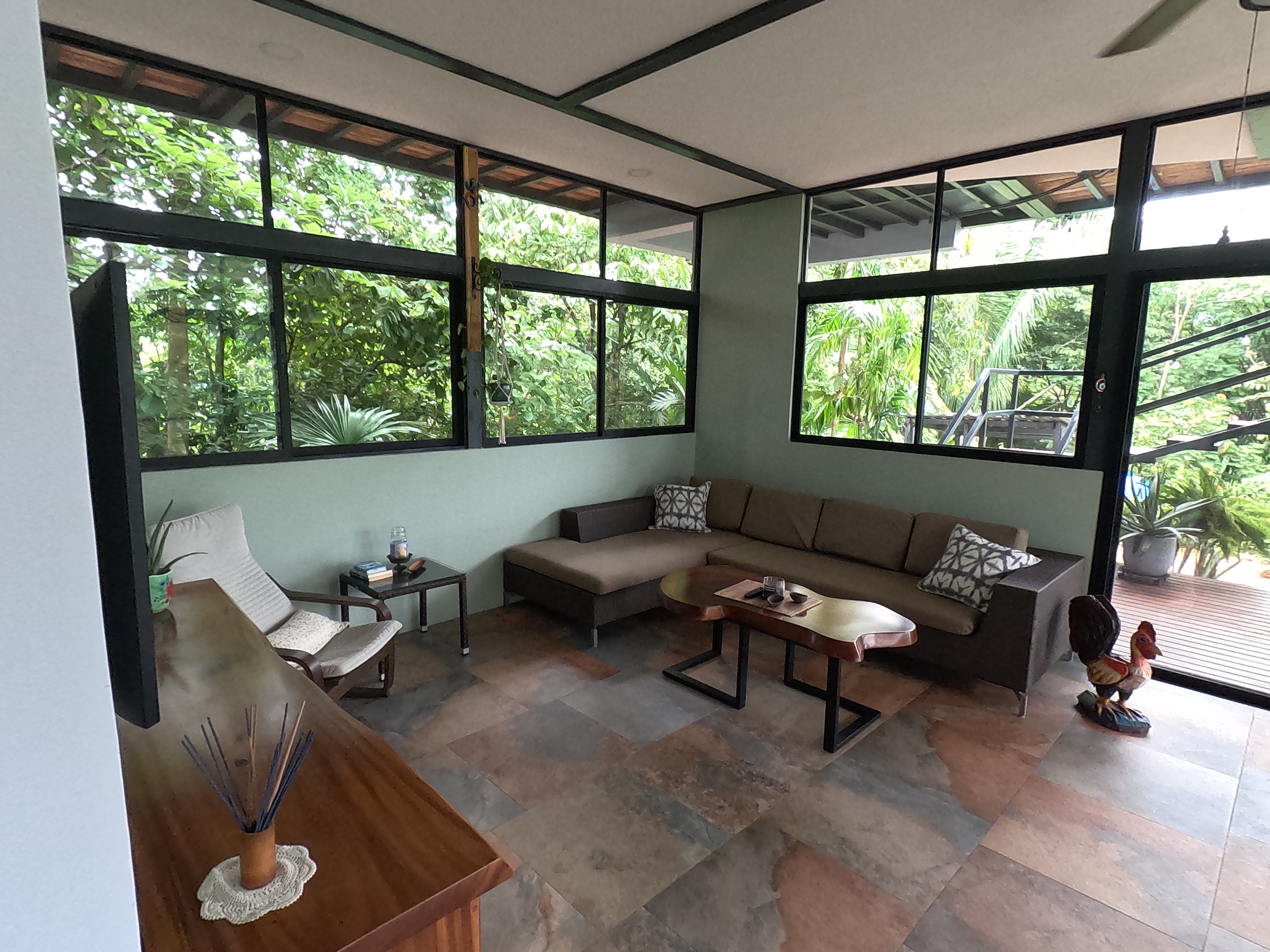 As you step inside, prepare to be mesmerized by the breathtaking panoramic views that surround you. Immerse yourself in nature's symphony, with the tranquil sounds of the jungle and the vibrant colors of tropical wildlife at your doorstep.a beautiful screened living area to immerse yourself in the sights and sounds of the jungle. The kitchen and bathroom feature ceramic tile floors which makes for easy clean ups. And one of the home's best features is an open to the sky large deck overlooking the rainforest river valley where you can breathe in nature from your own private coastal jungle retreat.