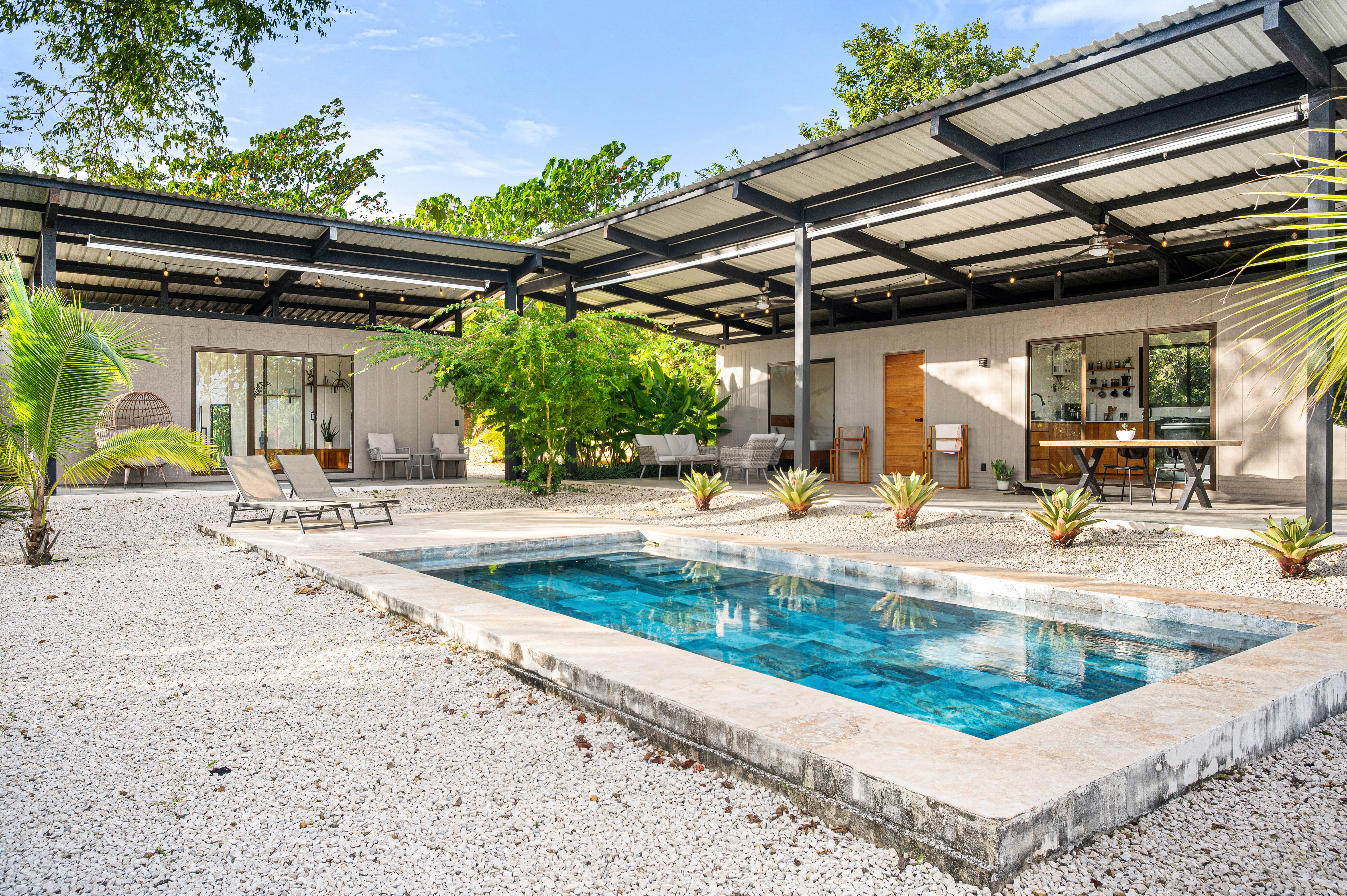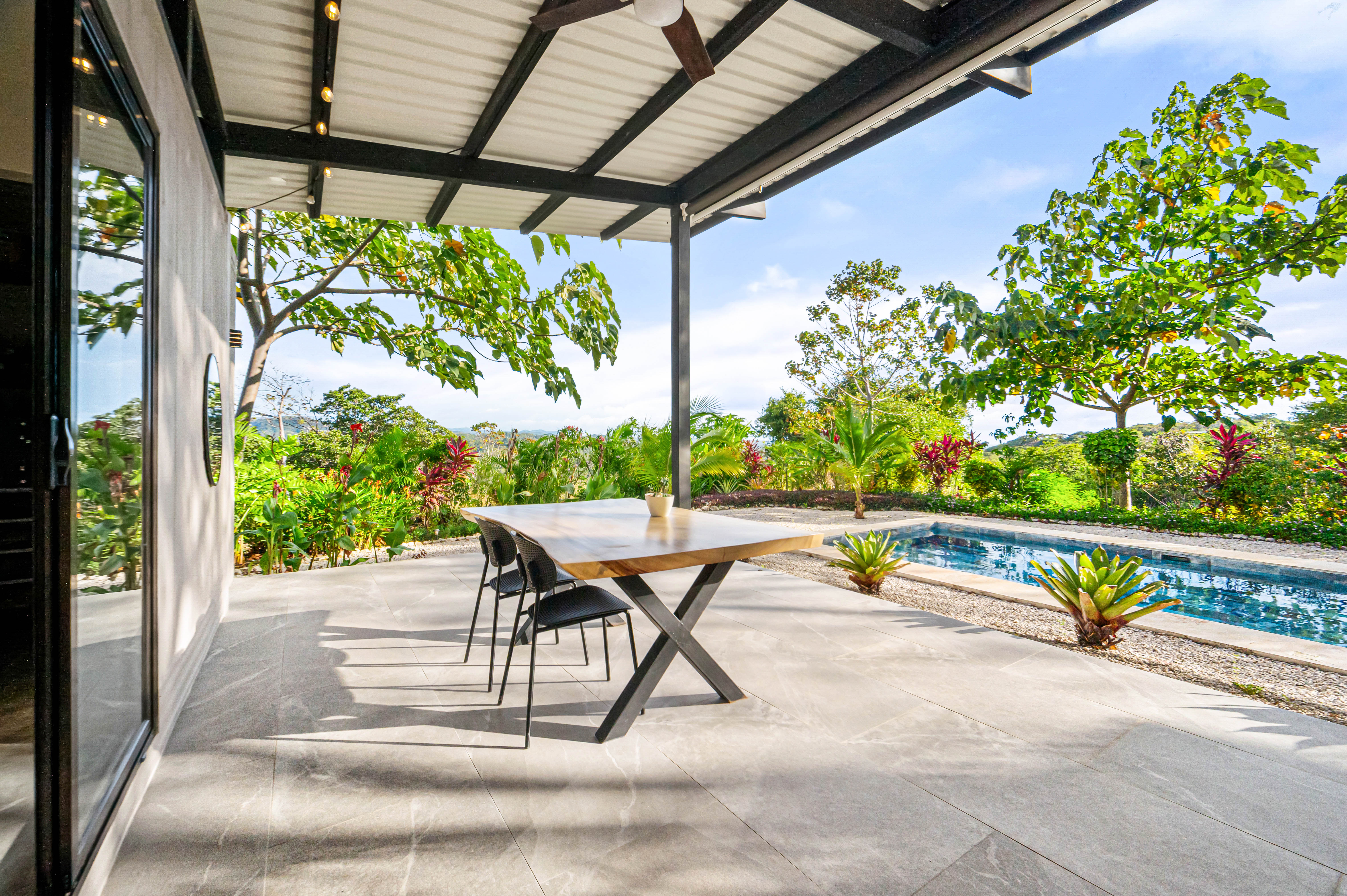 The outdoor living space is designed for the Costa Rica lifestyle, with an inviting pool ideal for entertaining, cooling off on sunny days, or relaxing under the stars. A spacious covered terrace provides shade and comfort, making it perfect for barbecues, gatherings, and seamless indoor-outdoor living.