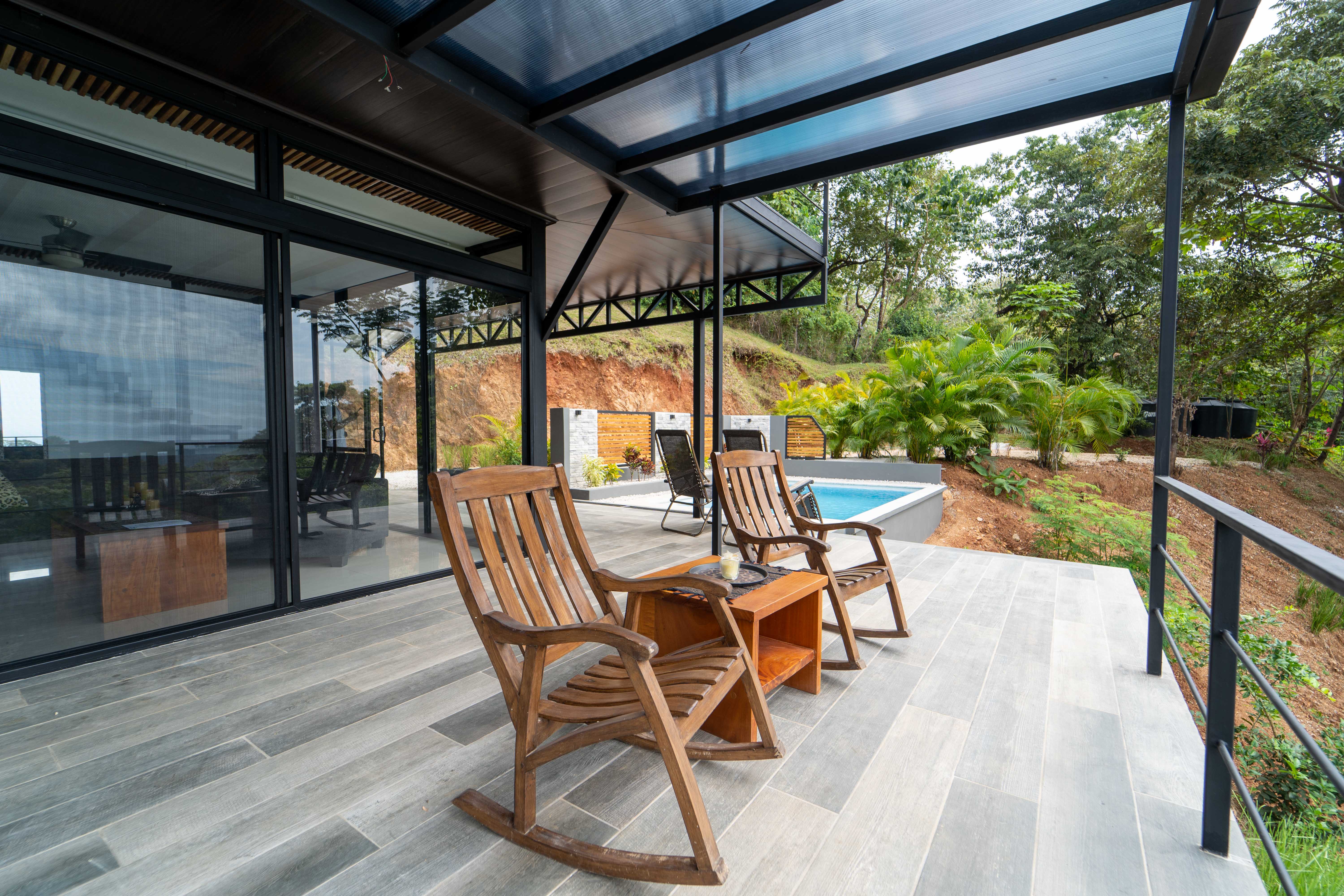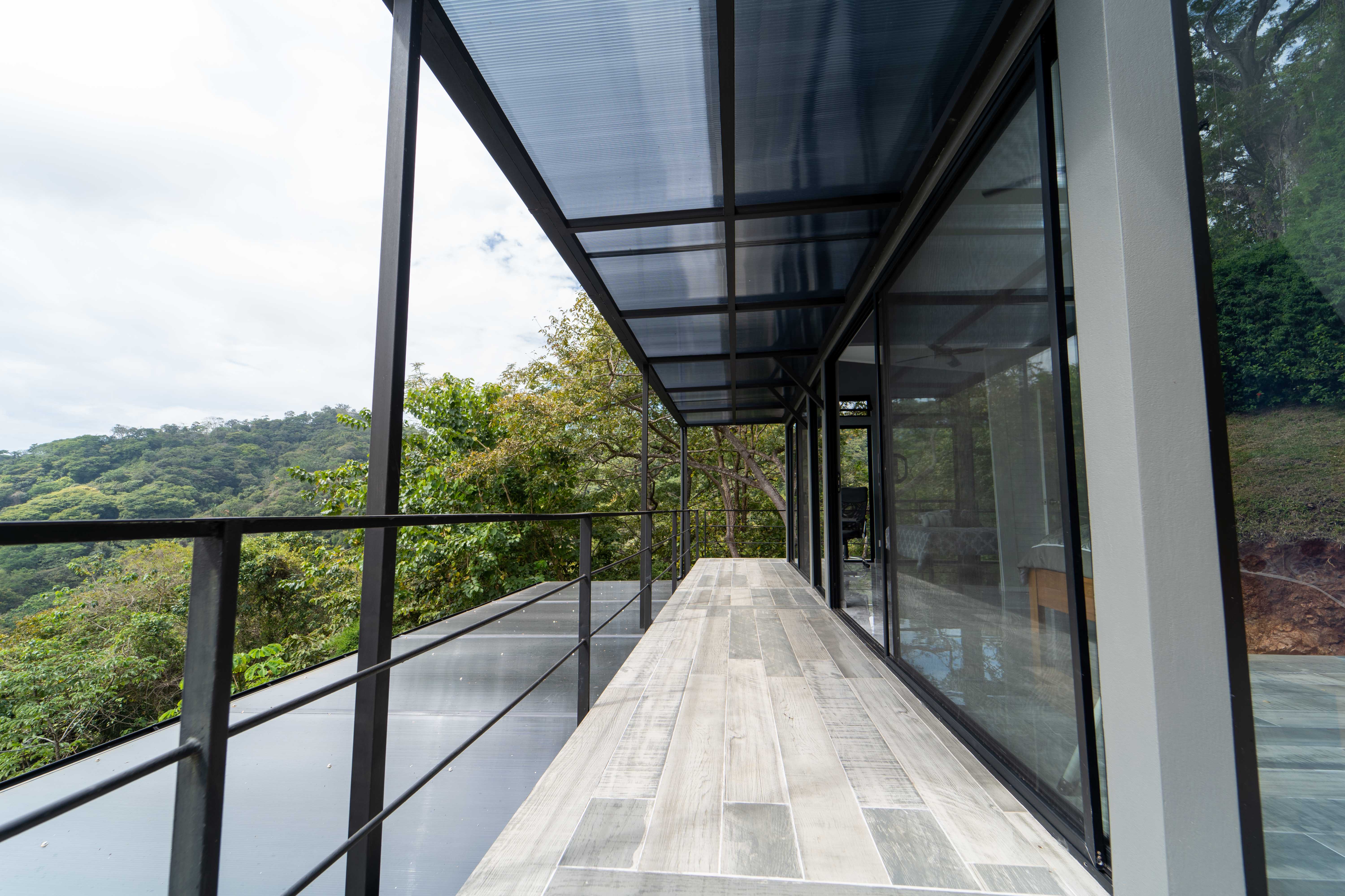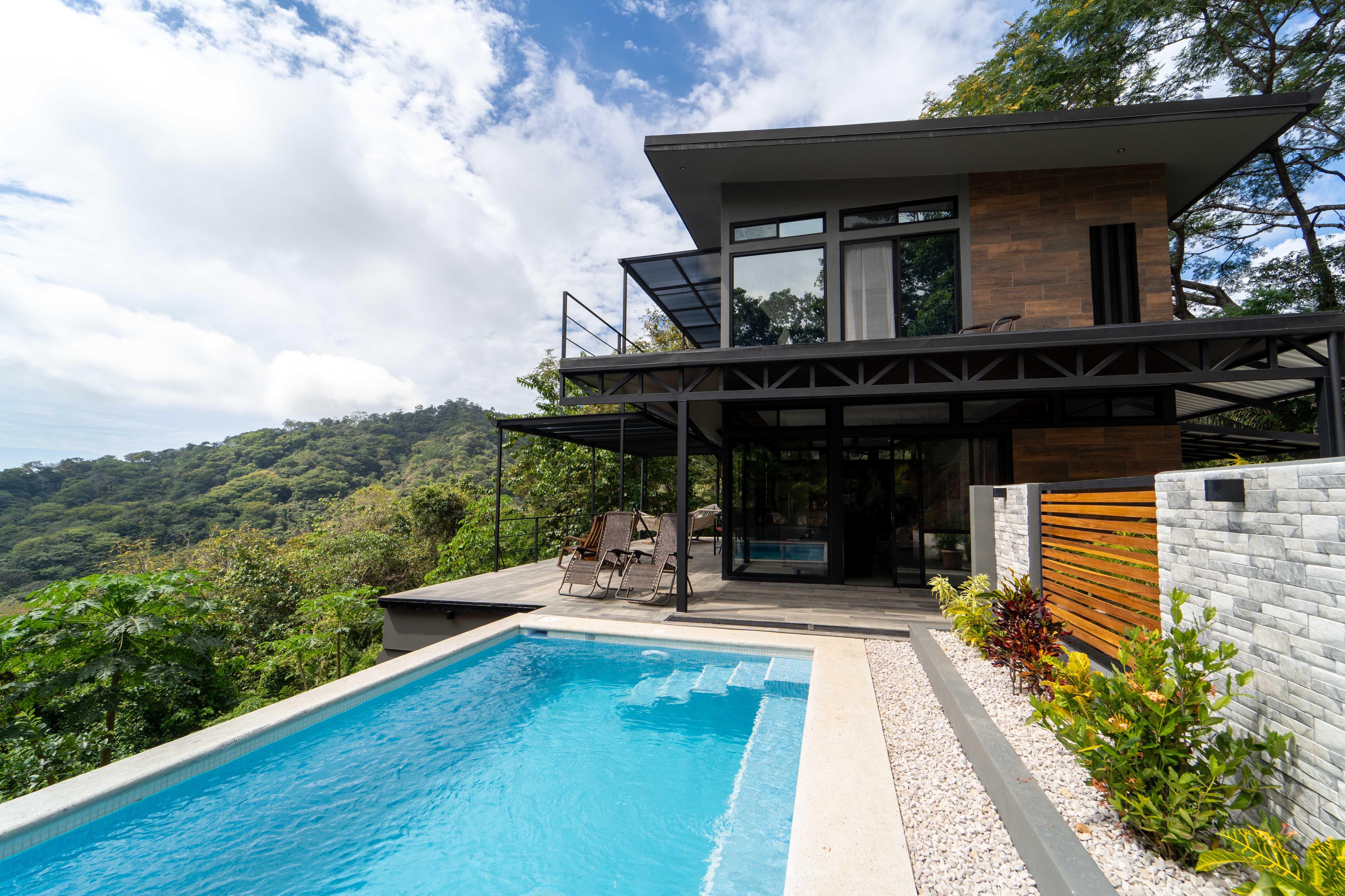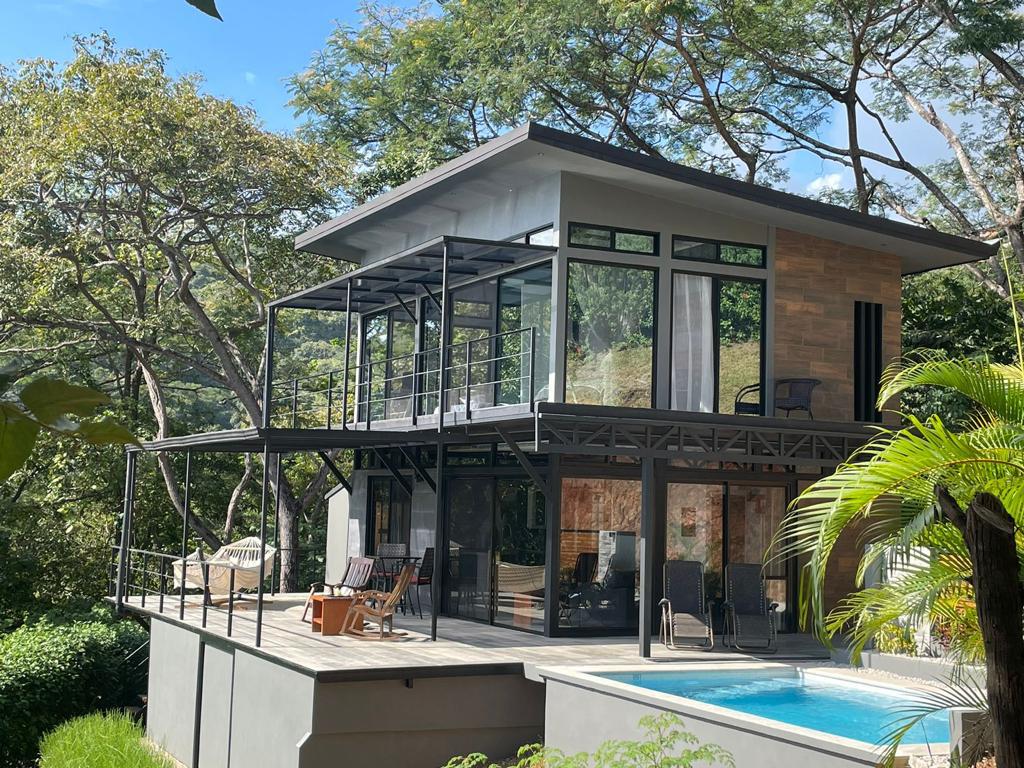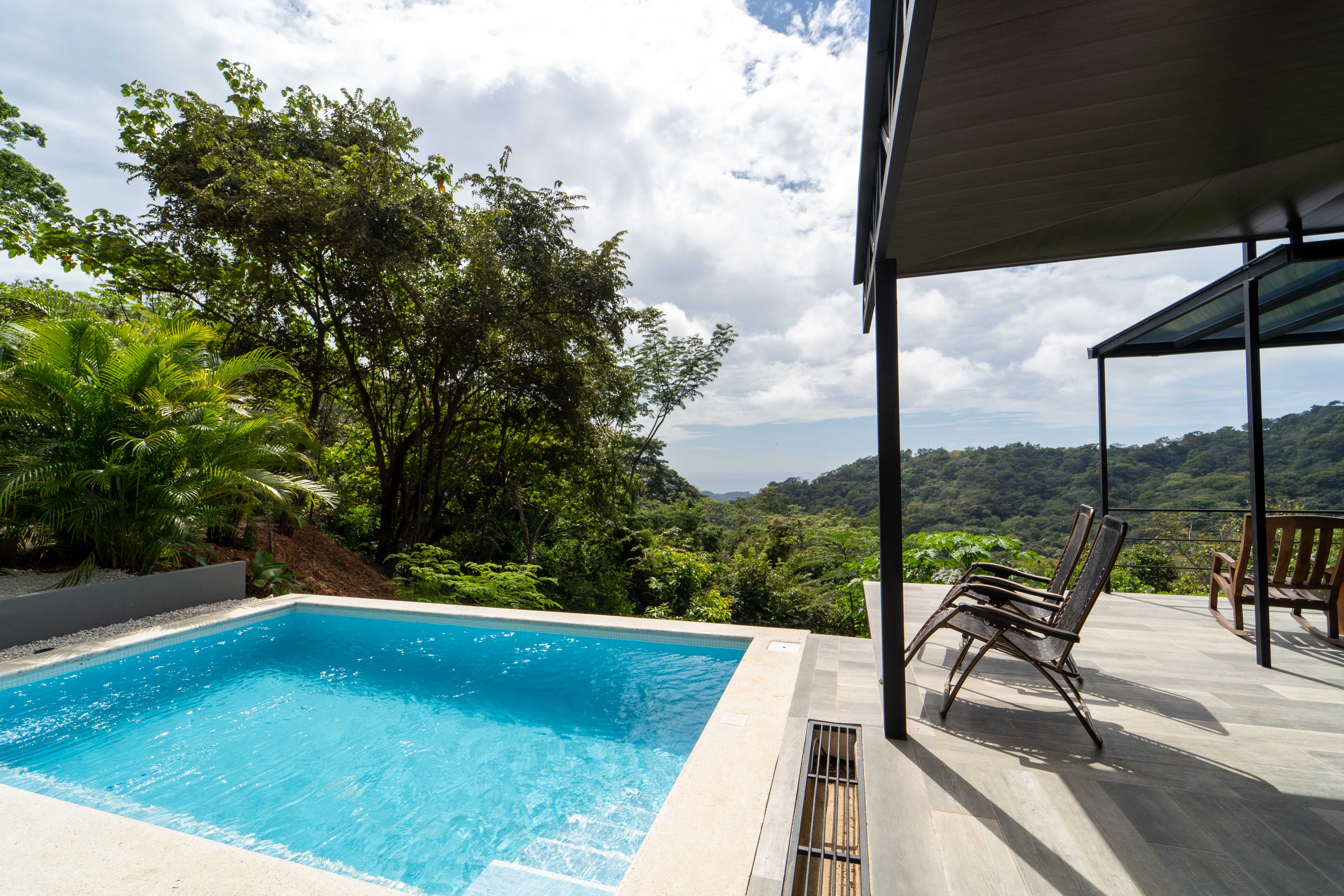 As you walk into this modern and contemporary house you can't help but notice the impeccable jungle and ocean views. The open living area walks out to a spacious terrace as well as to a well-sized pool. Even from the commodious kitchen, that includes all appliances, you get to enjoy the vibrant green that the home is surrounded by. One of the two bathrooms is adjacent to the living area on the first floor. A beautiful wooden staircase takes you to the second floor, where the 2 bedrooms and the second full bathroom are located. Both rooms feature ocean and jungle views and you can access the wrap around balcony.