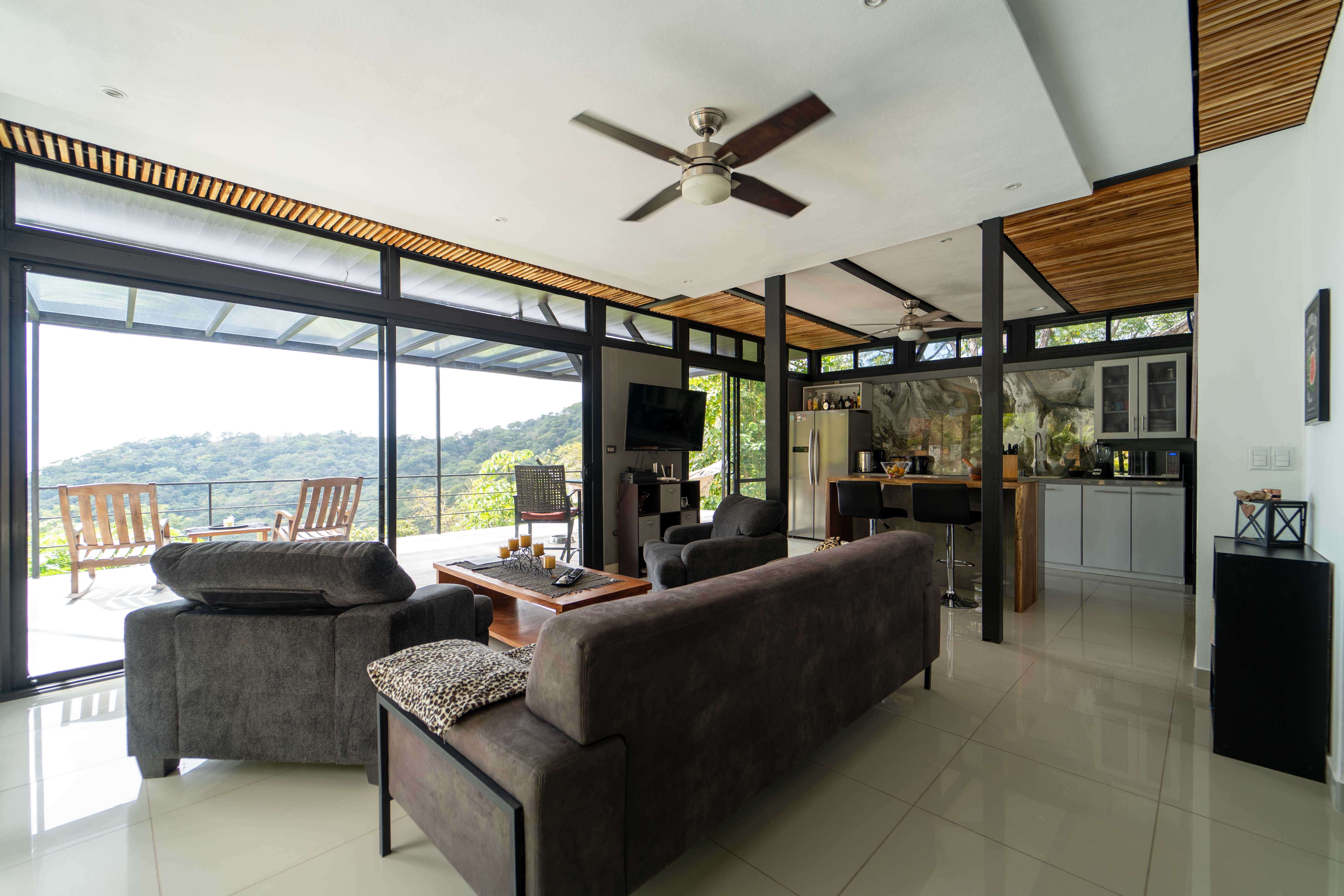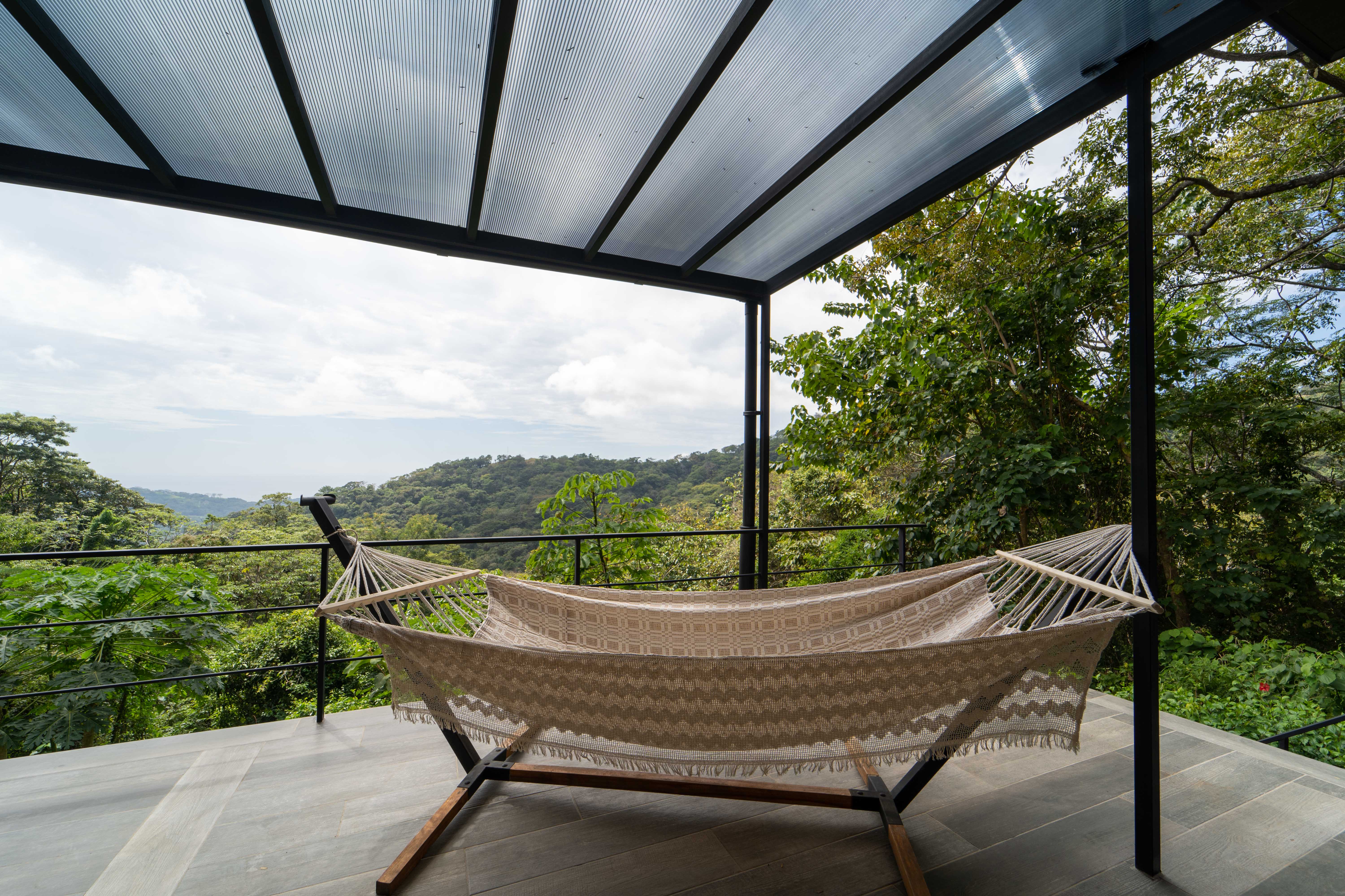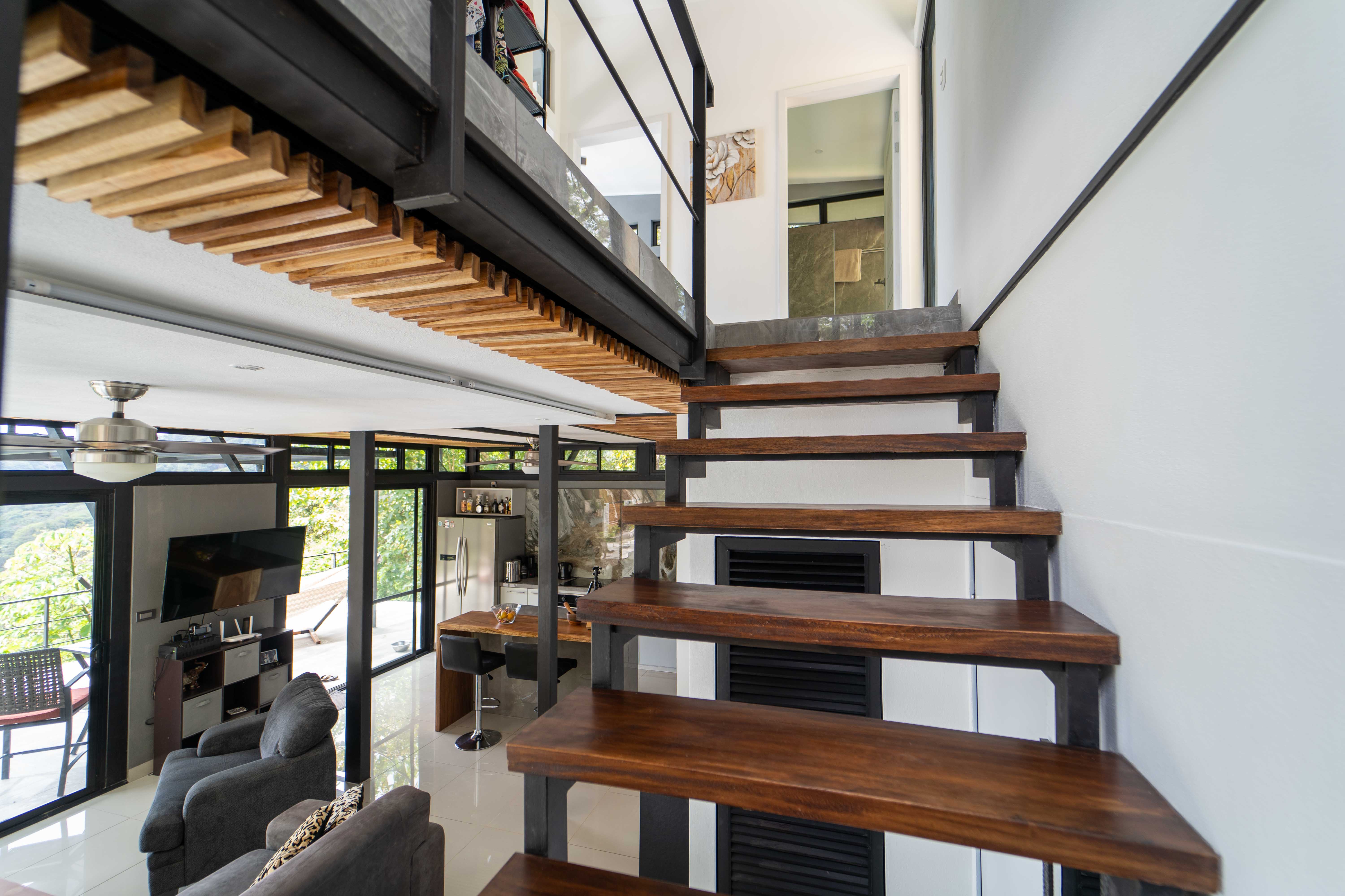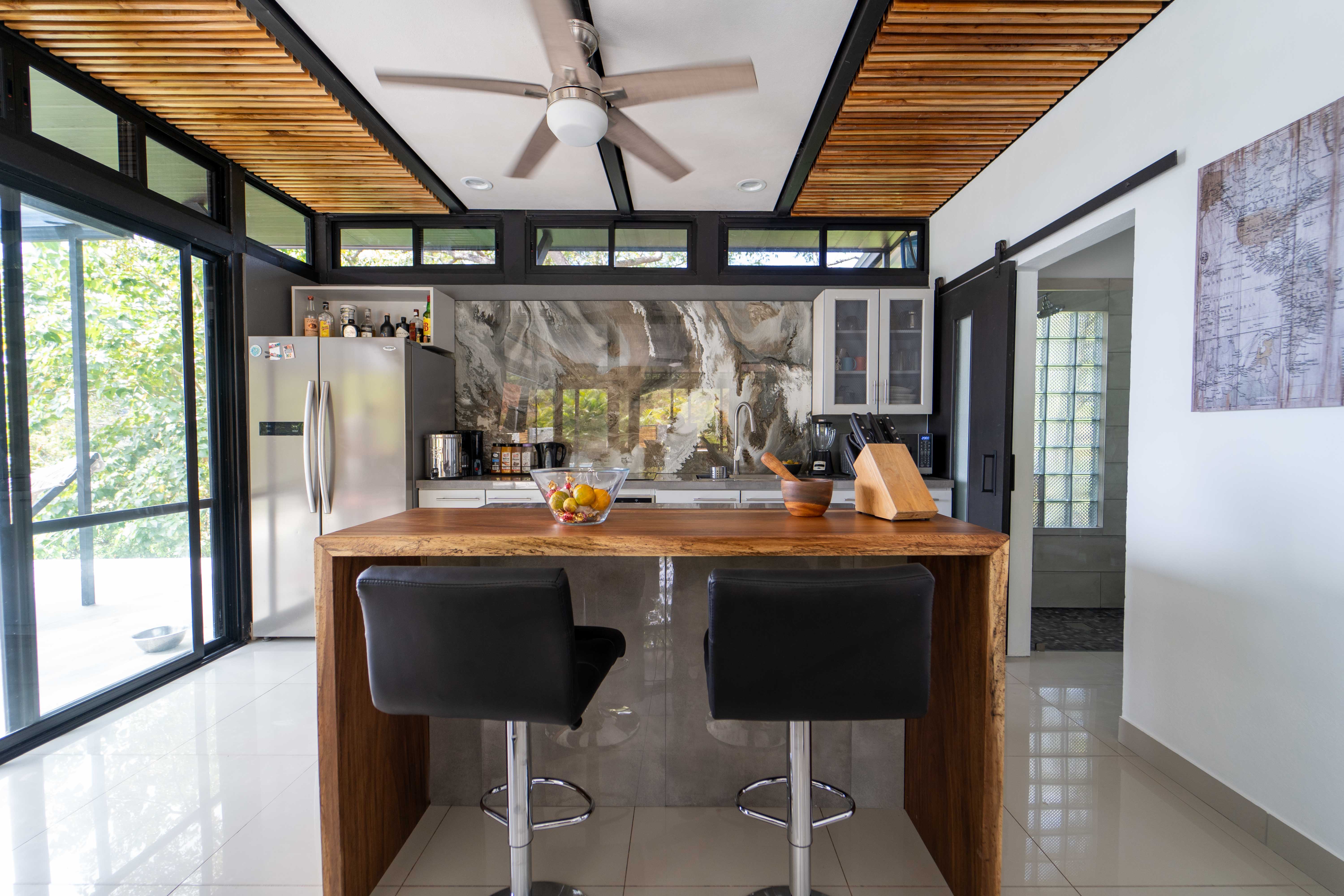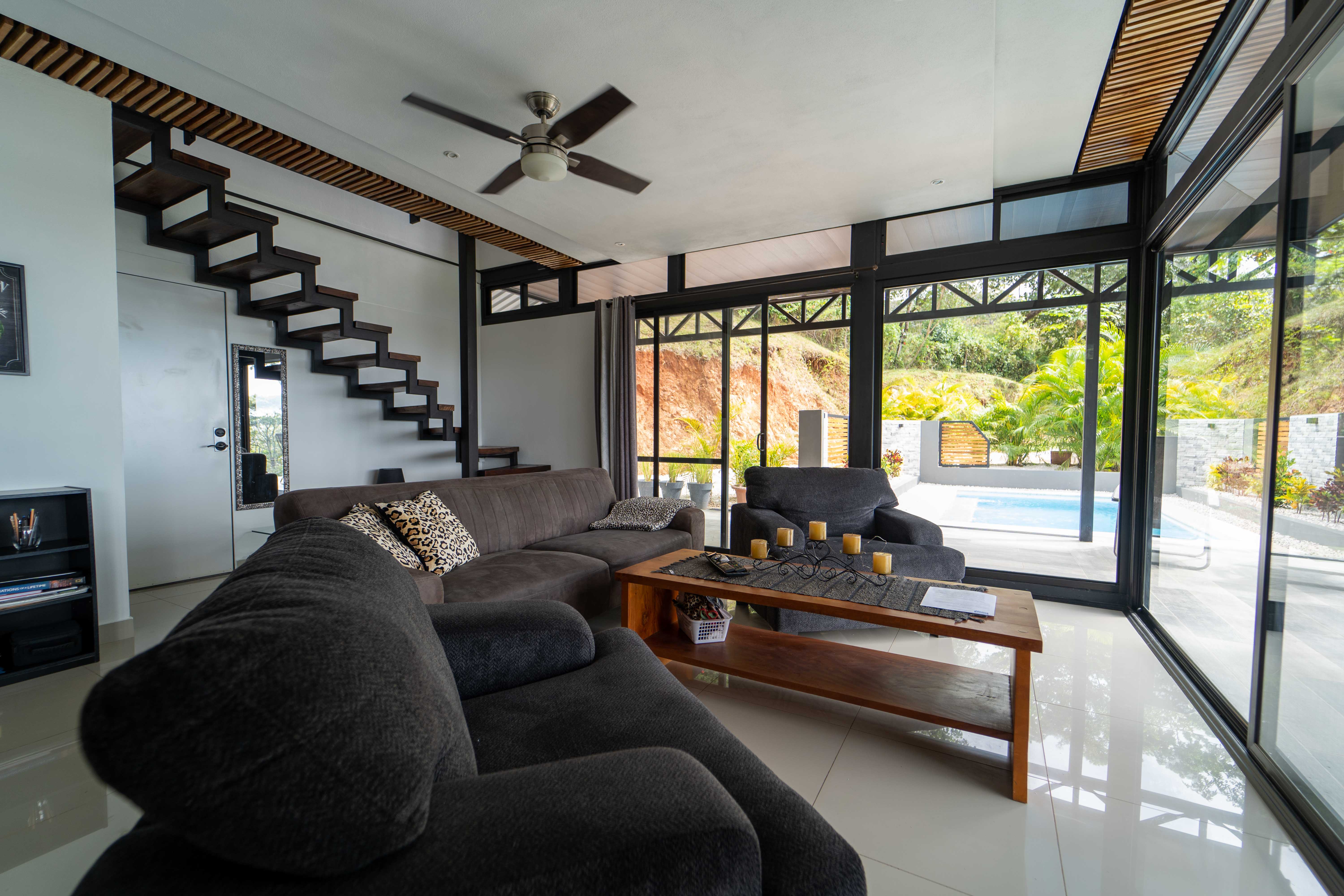 As you walk into this modern and contemporary house you can't help but notice the impeccable jungle and ocean views. The open living area walks out to a spacious terrace as well as to a well-sized pool. Even from the commodious kitchen, that includes all appliances, you get to enjoy the vibrant green that the home is surrounded by. One of the two bathrooms is adjacent to the living area on the first floor. A beautiful wooden staircase takes you to the second floor, where the 2 bedrooms and the second full bathroom are located. Both rooms feature ocean and jungle views and you can access the wrap around balcony.