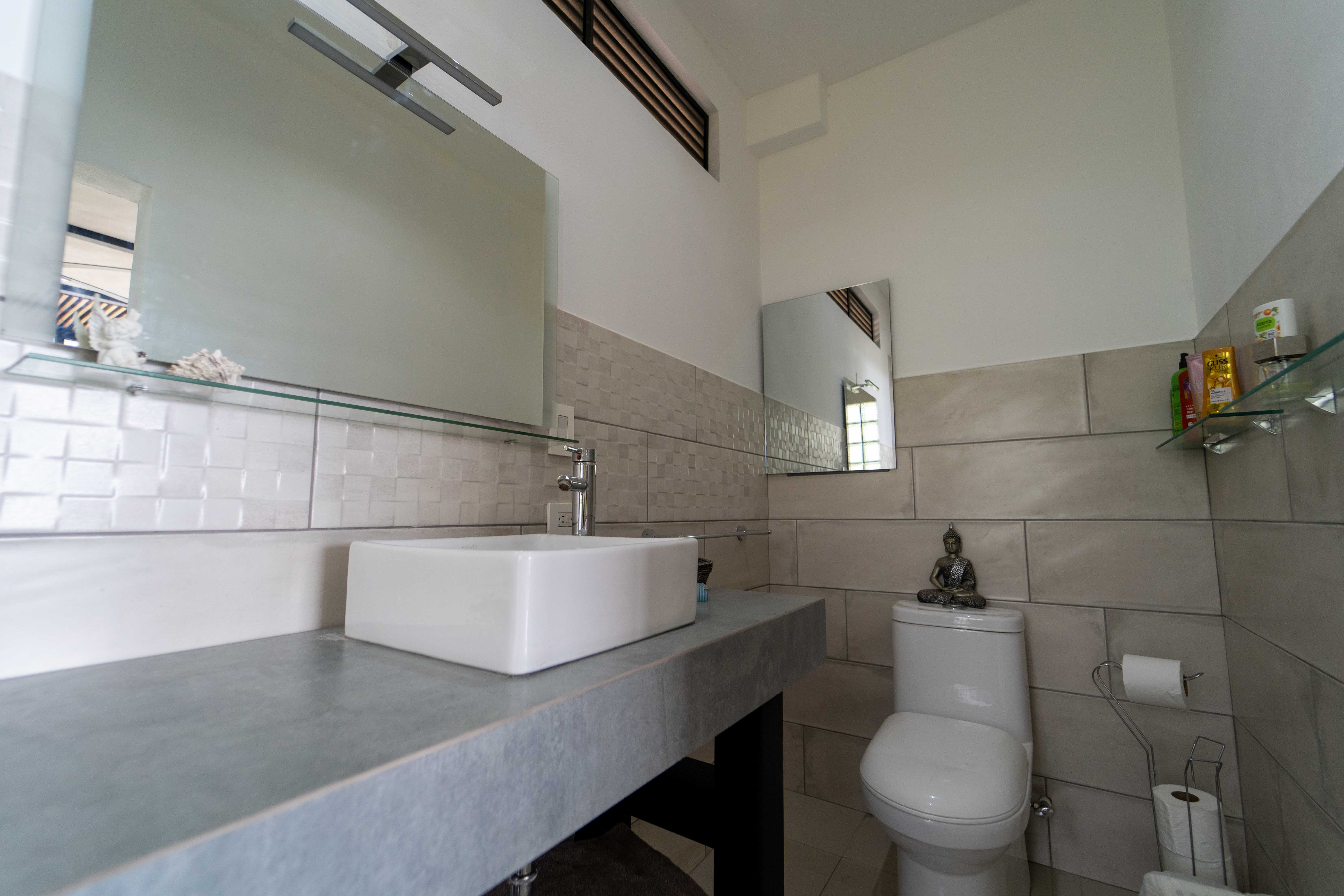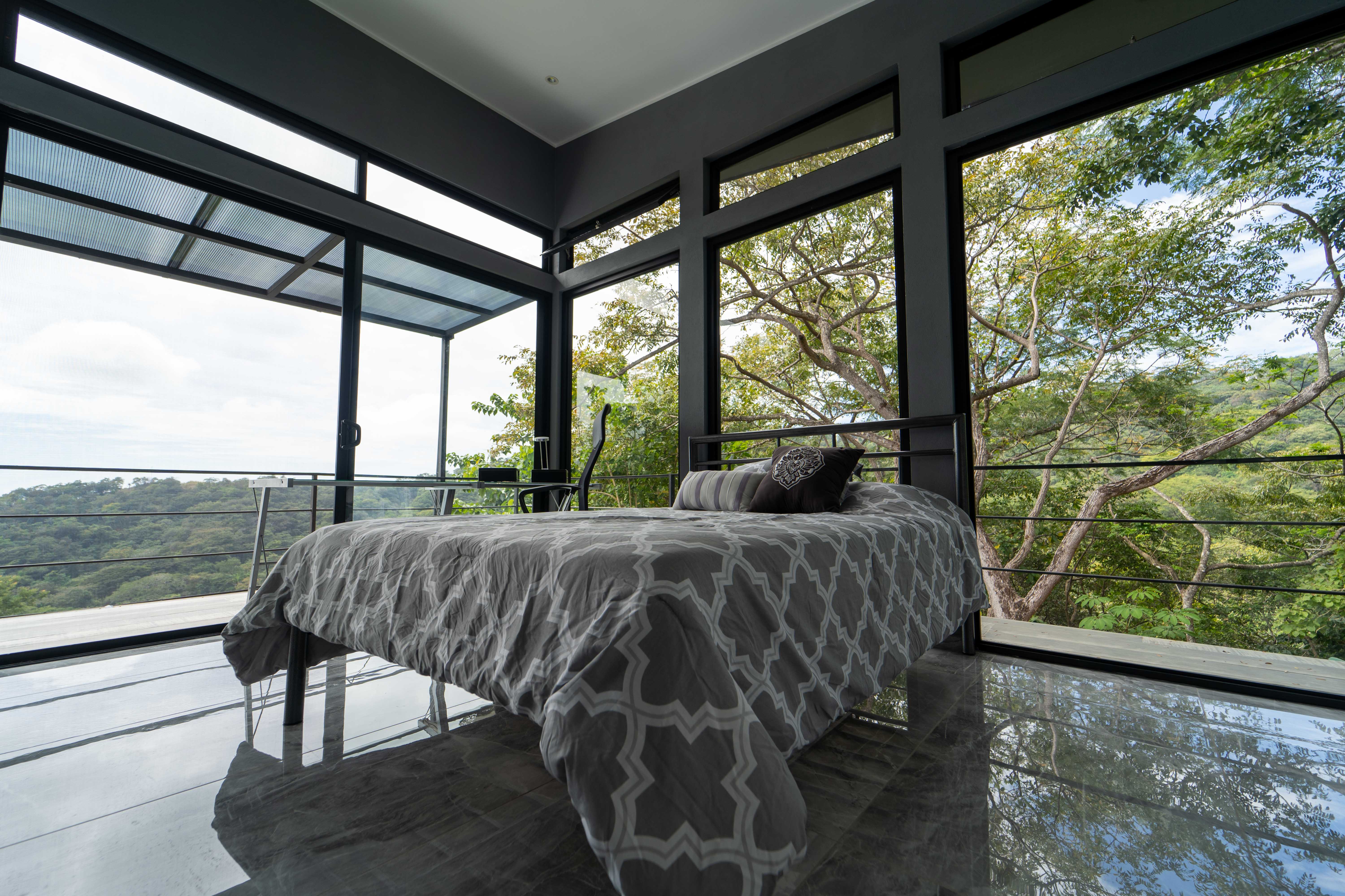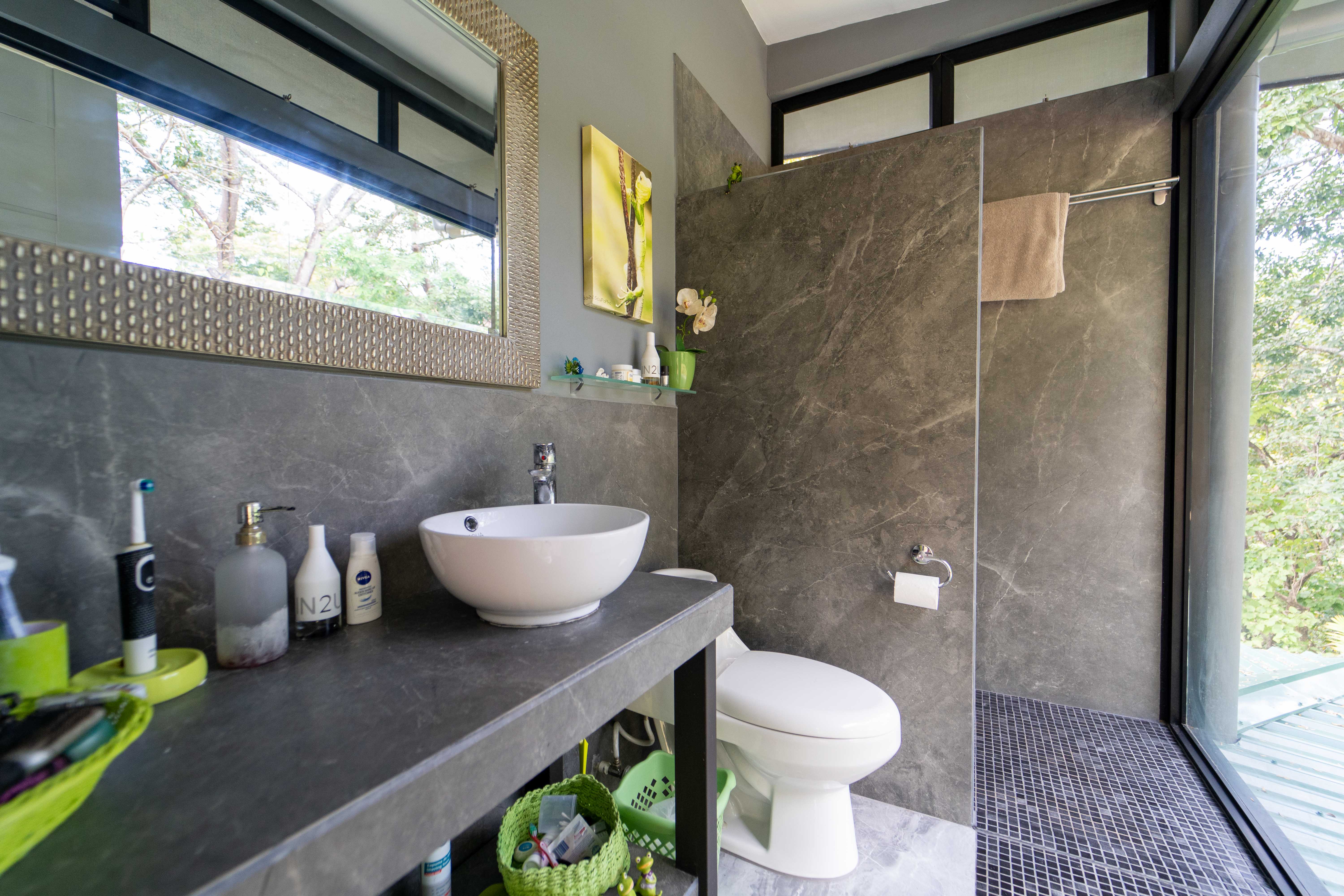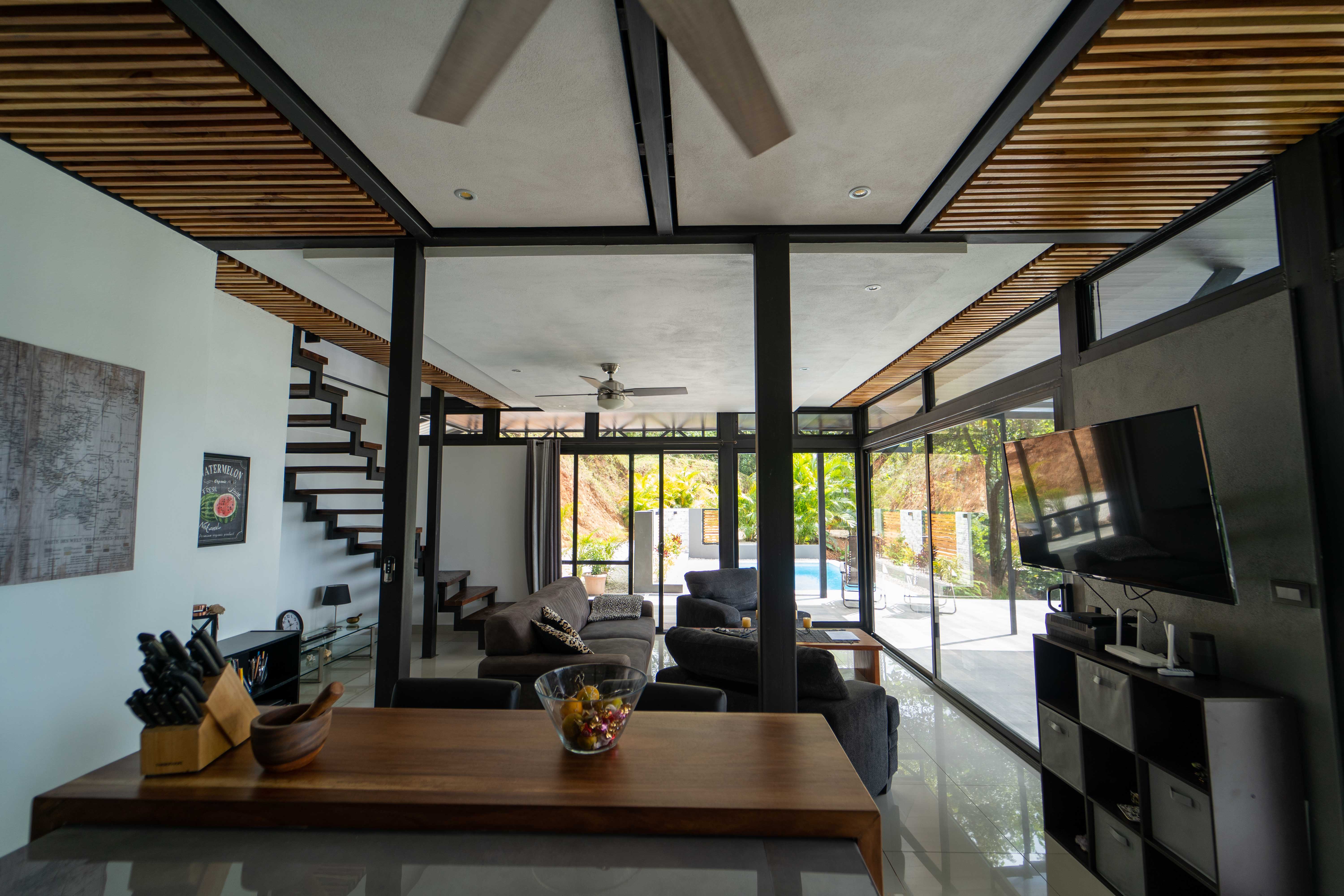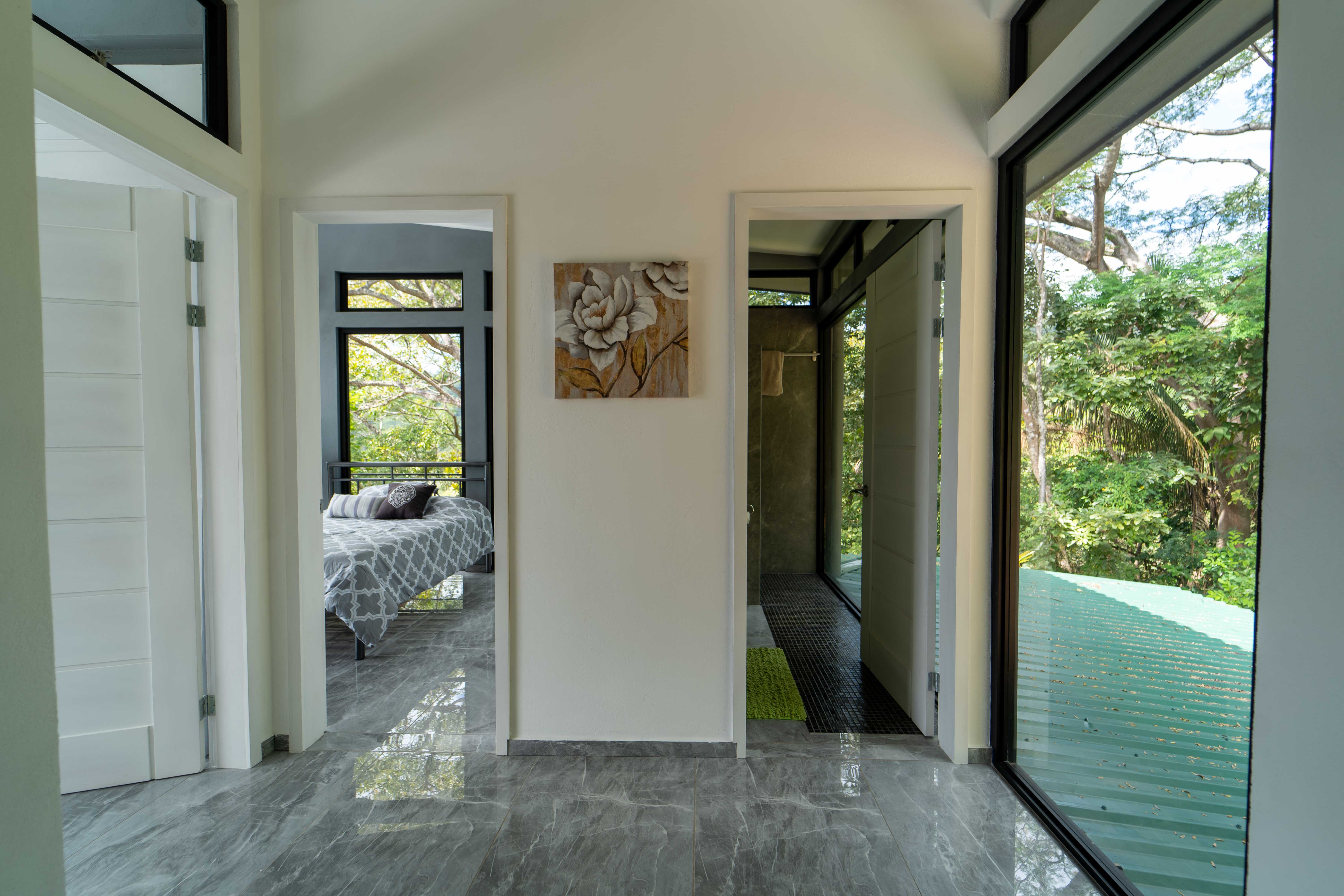 As you walk into this modern and contemporary house you can't help but notice the impeccable jungle and ocean views. The open living area walks out to a spacious terrace as well as to a well-sized pool. Even from the commodious kitchen, that includes all appliances, you get to enjoy the vibrant green that the home is surrounded by. One of the two bathrooms is adjacent to the living area on the first floor. A beautiful wooden staircase takes you to the second floor, where the 2 bedrooms and the second full bathroom are located. Both rooms feature ocean and jungle views and you can access the wrap around balcony.