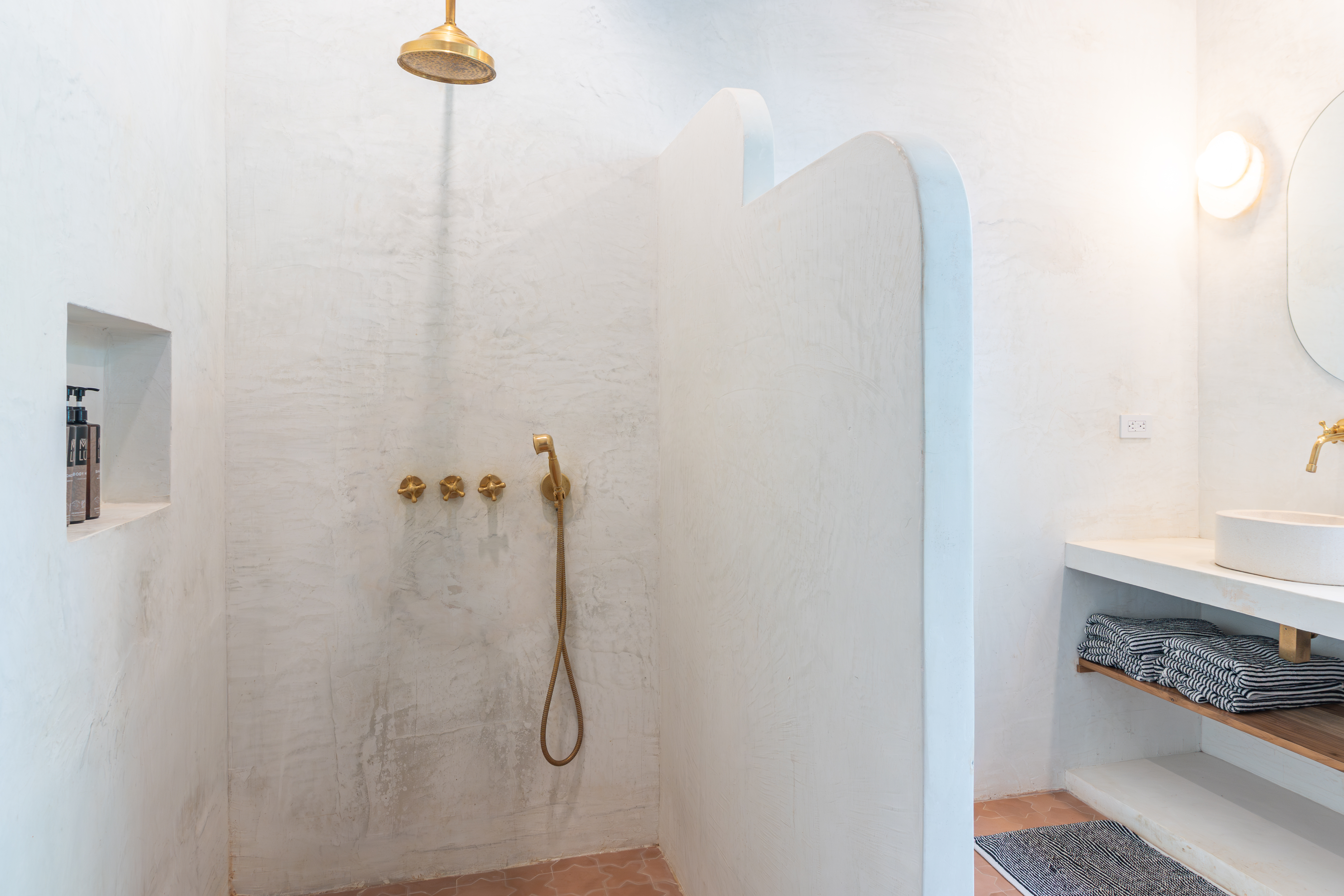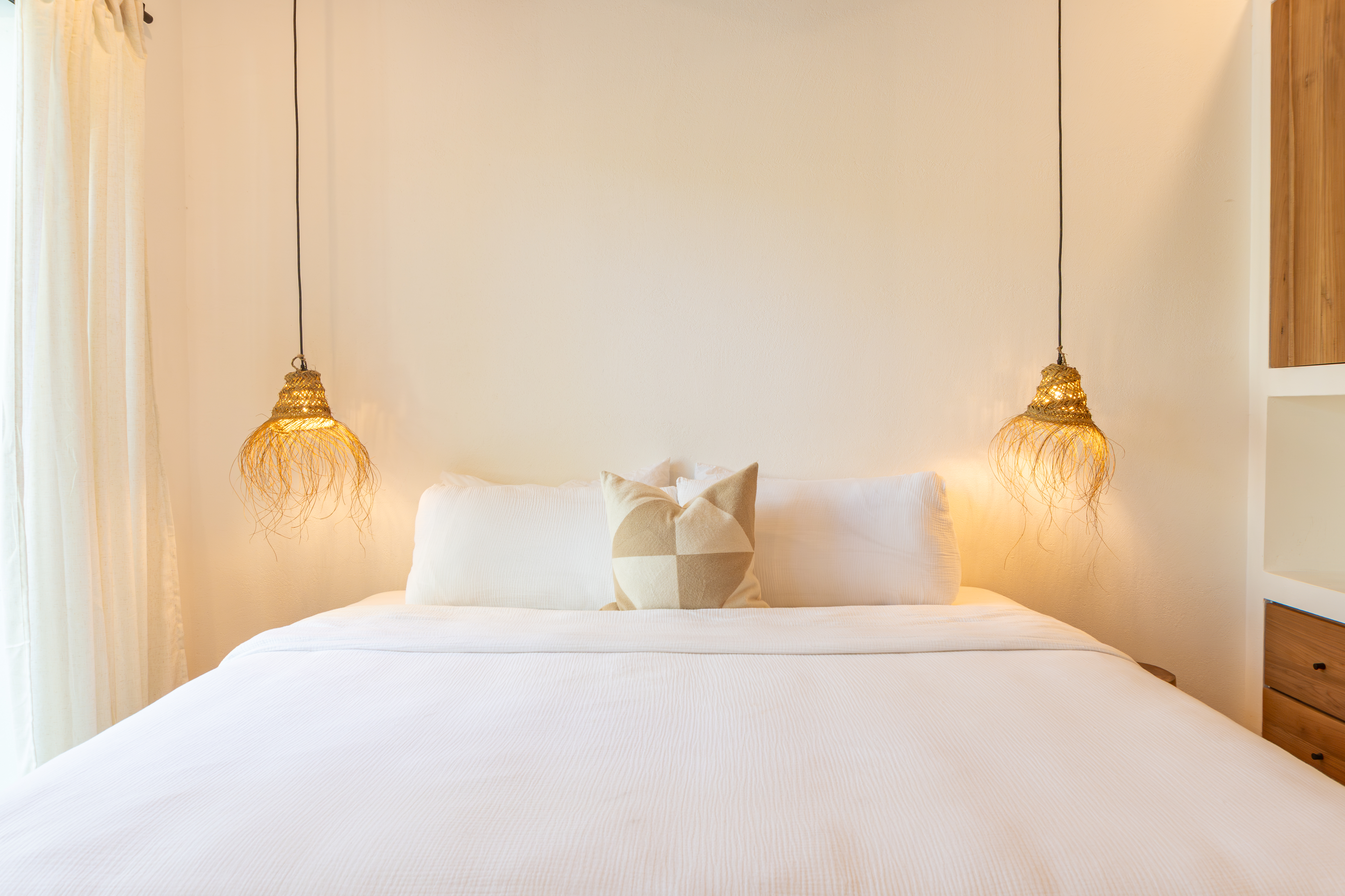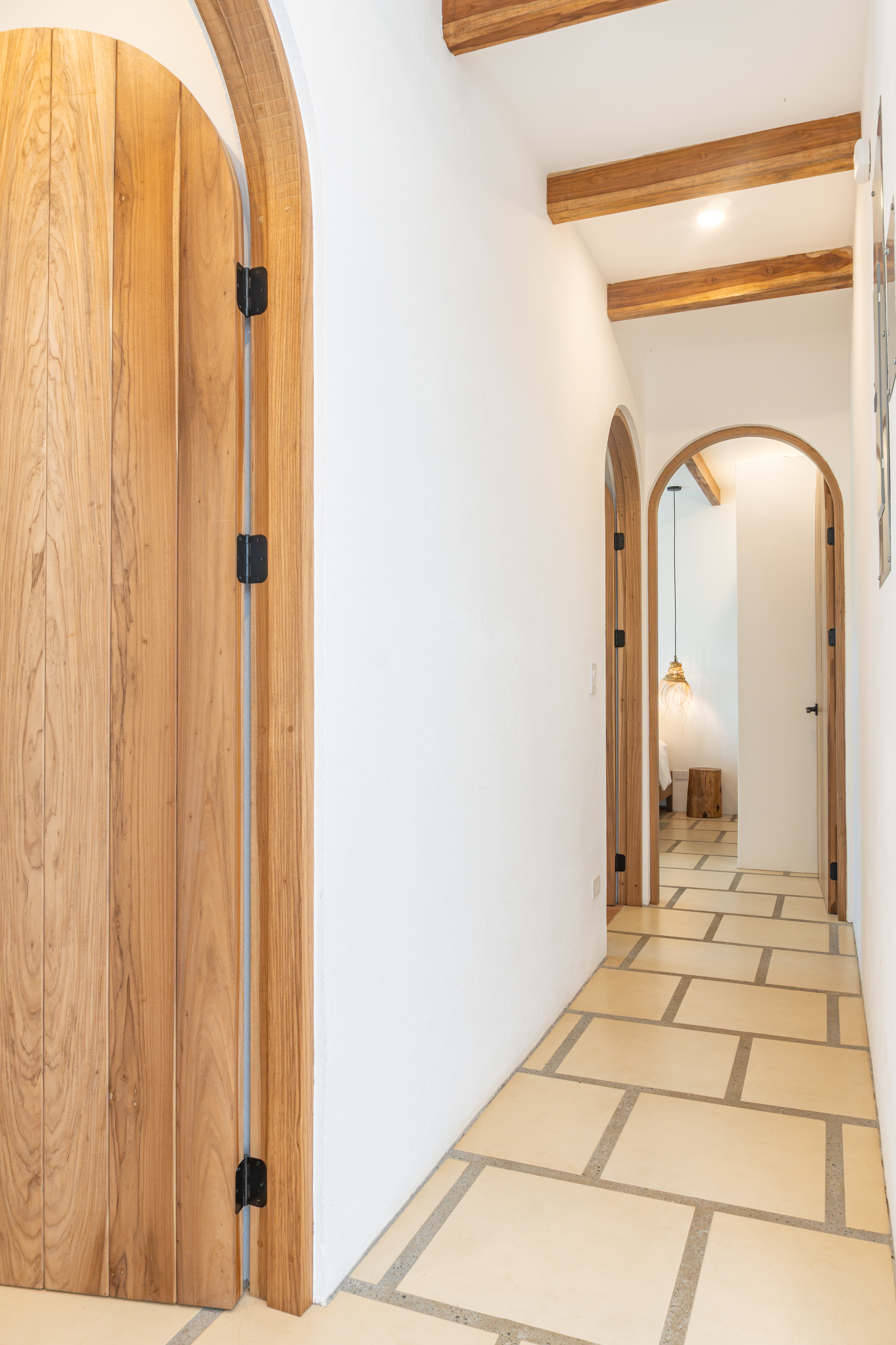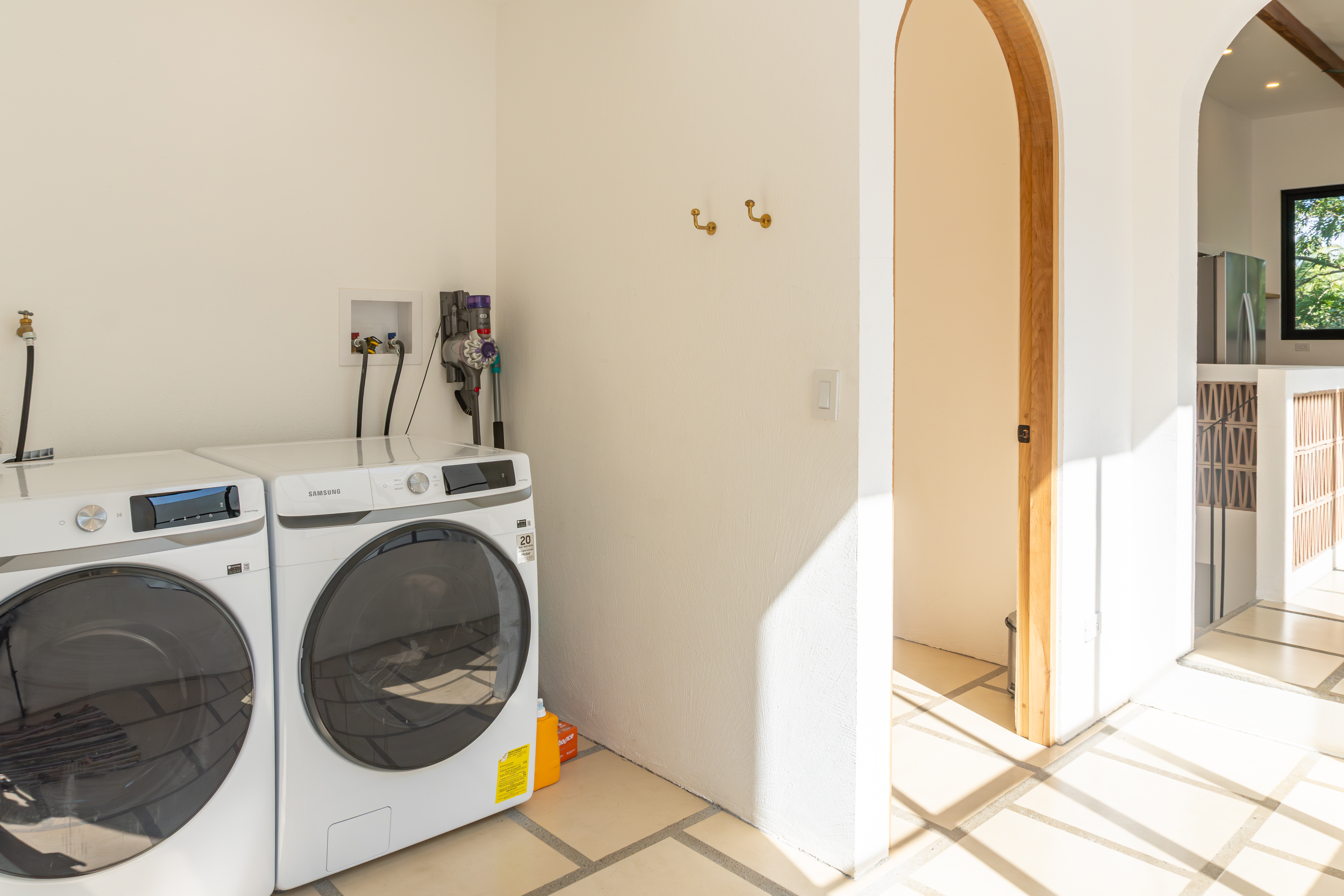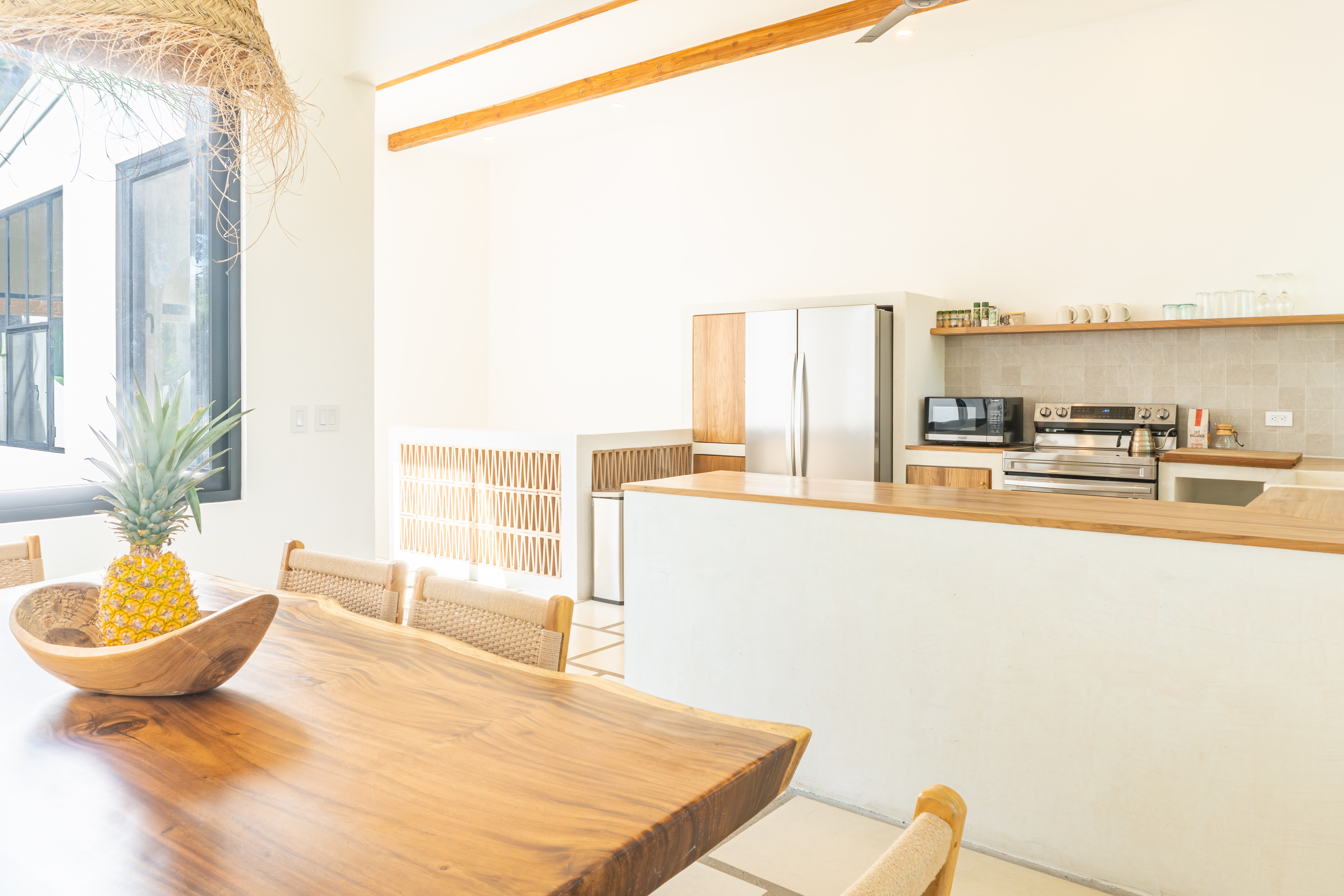 Spread across two levels, Villa Indy effortlessly combines luxury, function, and warmth. The main floor features a modern kitchen with stainless steel appliances, a handmade concrete sink with Moroccan faucets, and custom light fixtures. The dining area showcases a Guanacaste wood table and handmade Teca furnishings that enhance the villa’s natural aesthetic. A guest half bath and laundry area with washer and dryer complete this level.