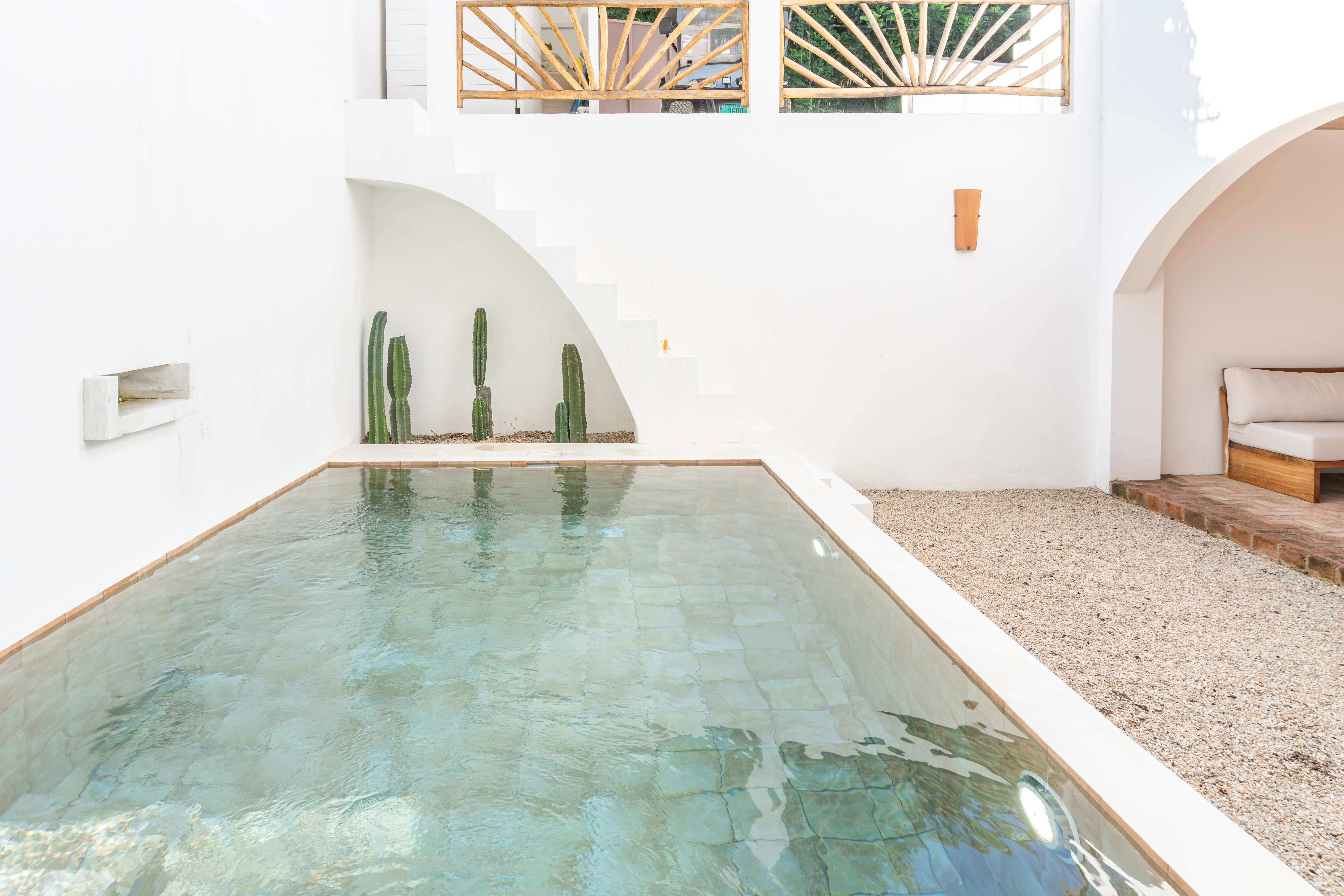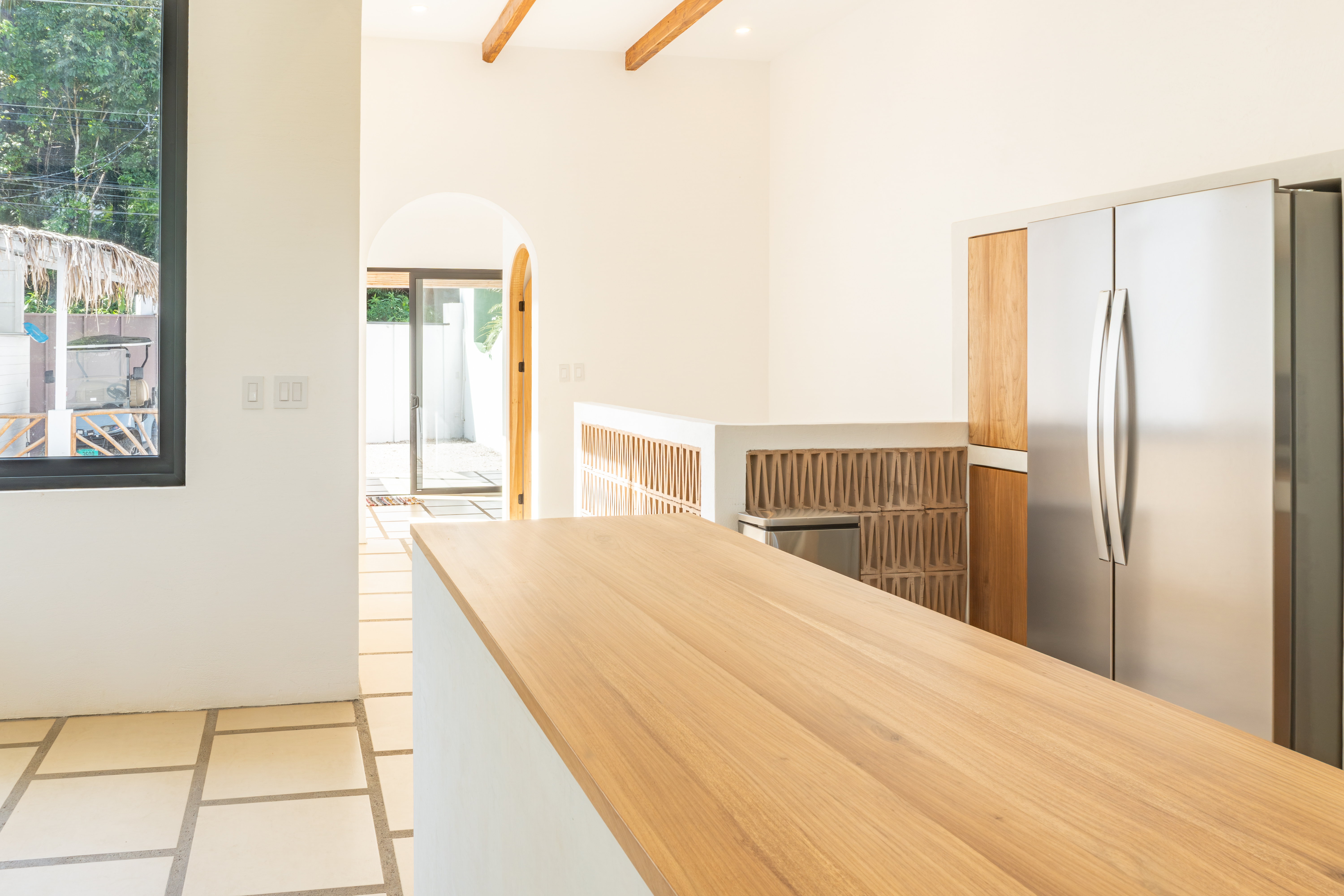 Passing through the private gate, you’ll find a dedicated parking space for your golf cart — conveniently included in the sale. Inspired by the serene courtyards of a traditional riad, the home is centered around a tranquil internal courtyard featuring a saltwater pool. Refined architectural details abound, including upgraded windows and doors, teak ceiling beams, and distinctive Celosia brickwork designed by renowned Spanish architect Patricia Urquiola, adding a distinctive artistic flair.