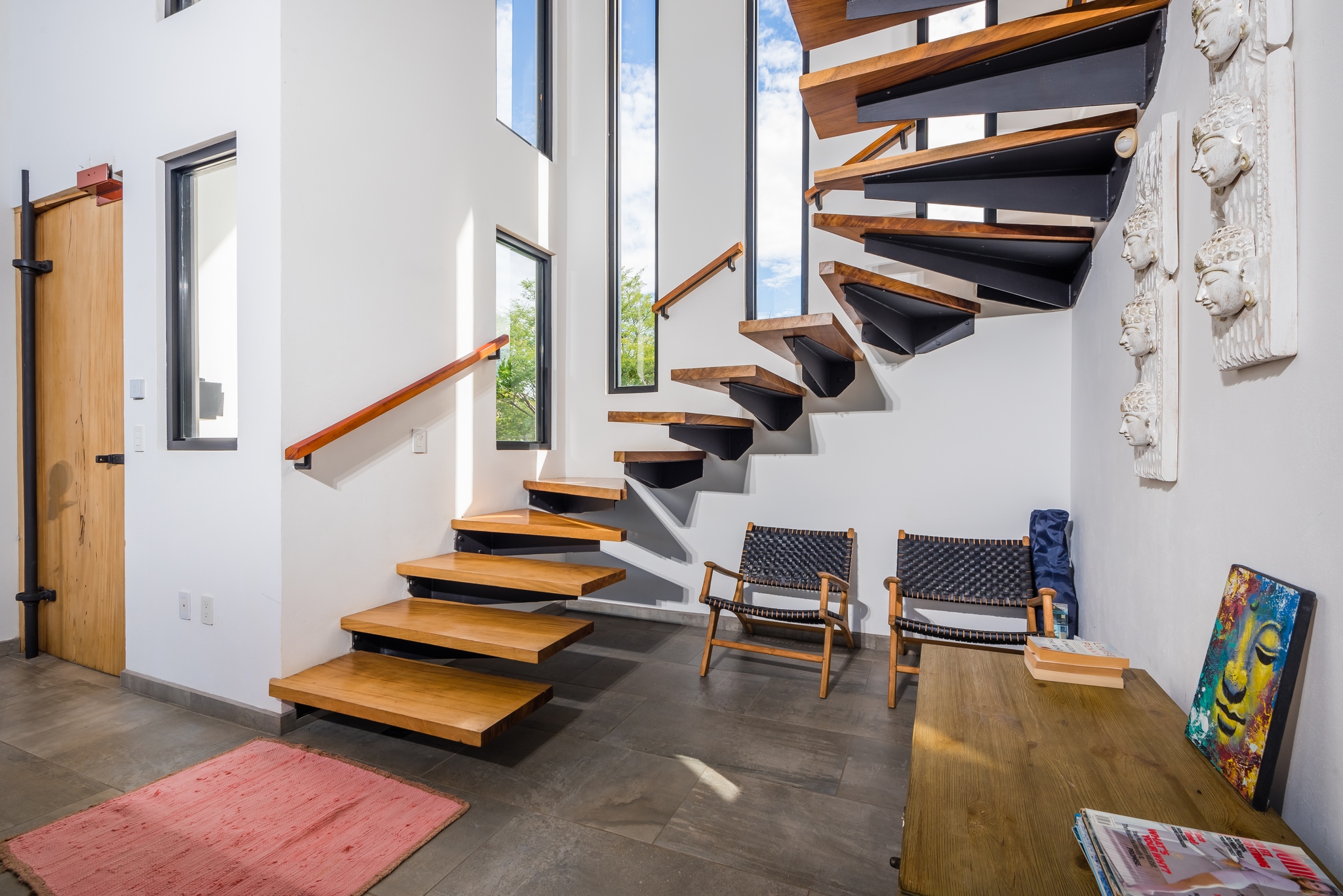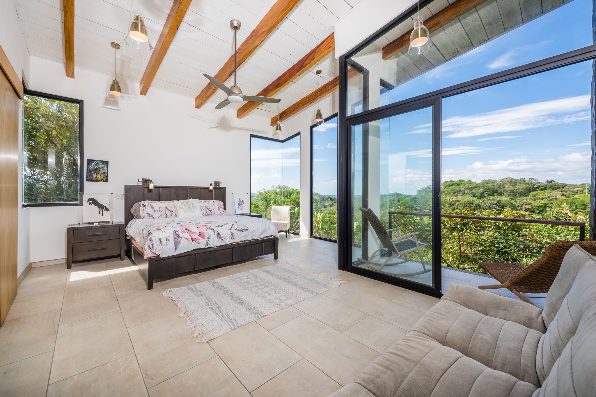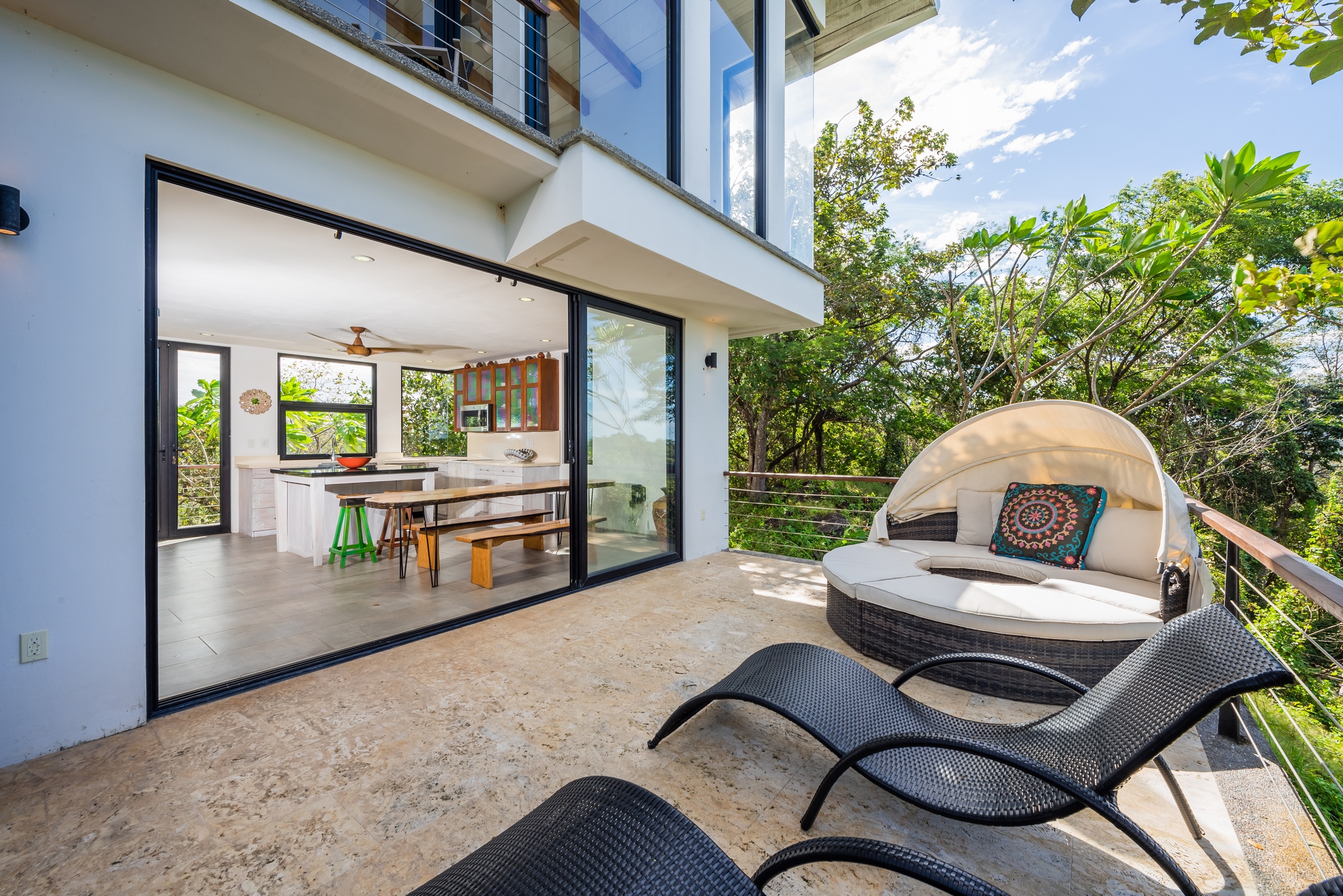 The two-story residence is fully furnished with high-end furniture and features two spacious bedrooms with private balconies overlooking the ocean and pool, plus two bathrooms. There is potential to add a third bedroom. The home’s kitchen, living, and dining areas are tastefully decorated, and it was built by American contractor Cody Qualls with Guanacaste wood, hurricane-proof windows, and custom cabinetry.