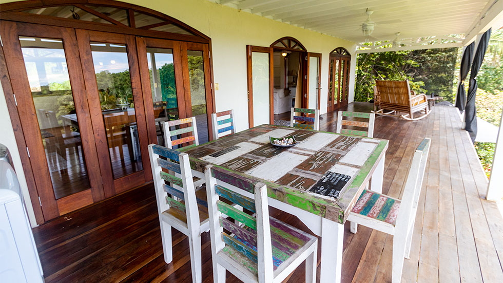 The master bathroom is located on the left side of the bedroom just outside the sliding panel doors, adjacent to the upper deck. It is complete with a large vanity mirror, 2 sinks, personal storage space, a restroom area, and a rain-shower with open-windows overlooking the property. While maintaining the feeling of privacy this bathroom has a great indoor/outdoor vibe. The 2nd story deck is perfect for all your personal and social needs. It’s a great space for doing yoga, sunbathing, star gazing, BBQs, and more.