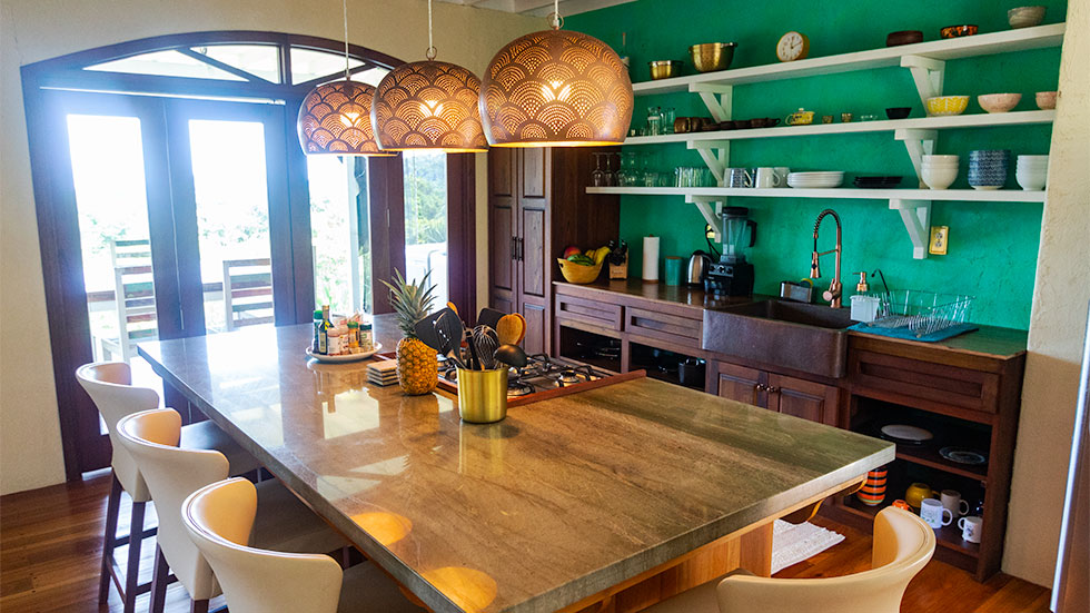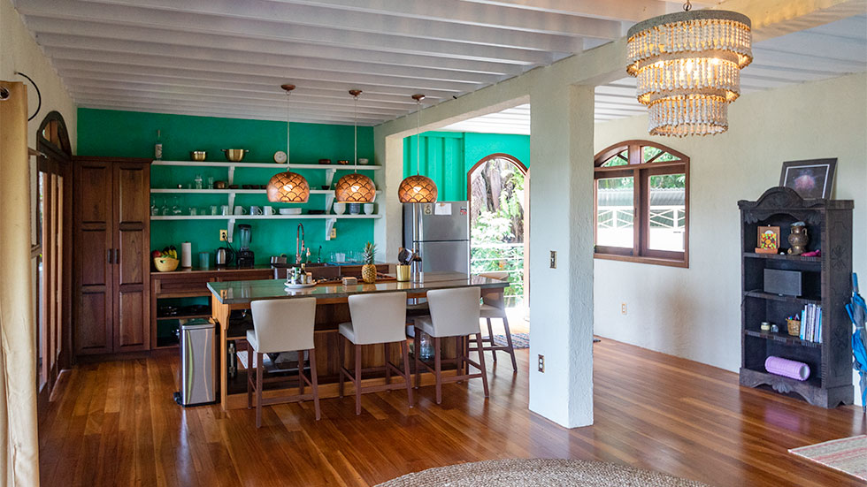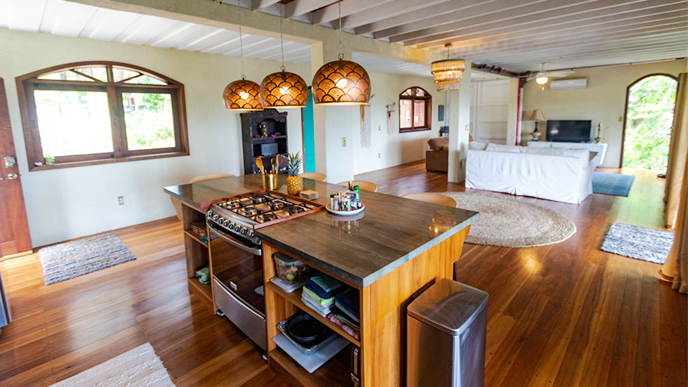 To your left is a living room and to your right is a spacious kitchen complete with ample storage space, a large copper sink, stained wood countertops, and a marble island with a built-in 6 burner stove on one side and a bar top on the other. This kitchen set up is perfect for those who enjoy prepping and cooking while entertaining guests. There is also a UV reverse-osmosis water filtration built into the sink, although the ASADA community water is very good, you can rest assured that you are getting optimum drinking water.