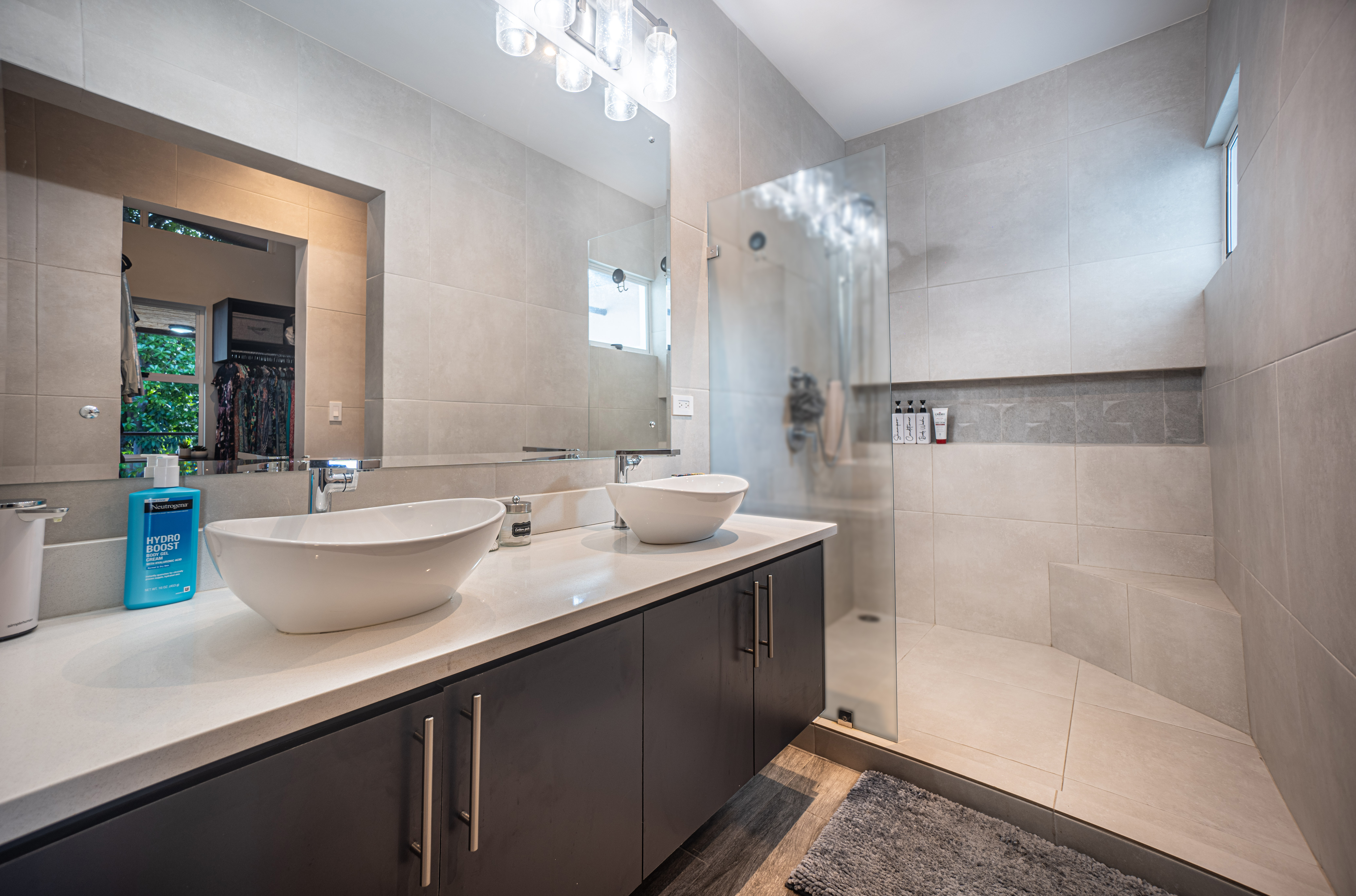 The master suite is a true retreat, featuring a luxurious en-suite bathroom with custom tiled showers, dual vanities, and a spacious walk-in closet with a dedicated vanity area. A private outdoor balcony completes this serene space.