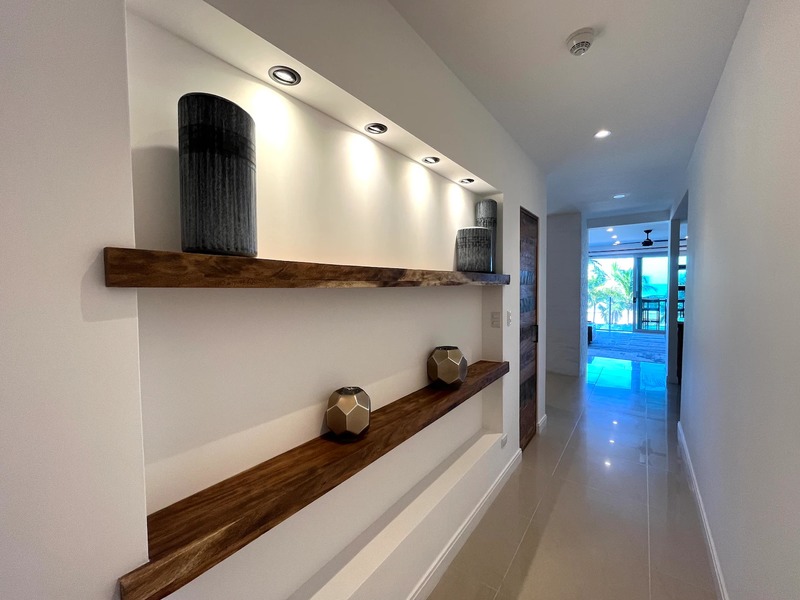 The open-concept layout features a bright living and dining area that flows seamlessly into a fully renovated kitchen with contemporary cabinetry, quality appliances, and ample storage—ideal for entertaining or relaxed beach living. Large sliding glass doors lead to a private balcony overlooking the lush pool area, creating an inviting indoor-outdoor atmosphere.