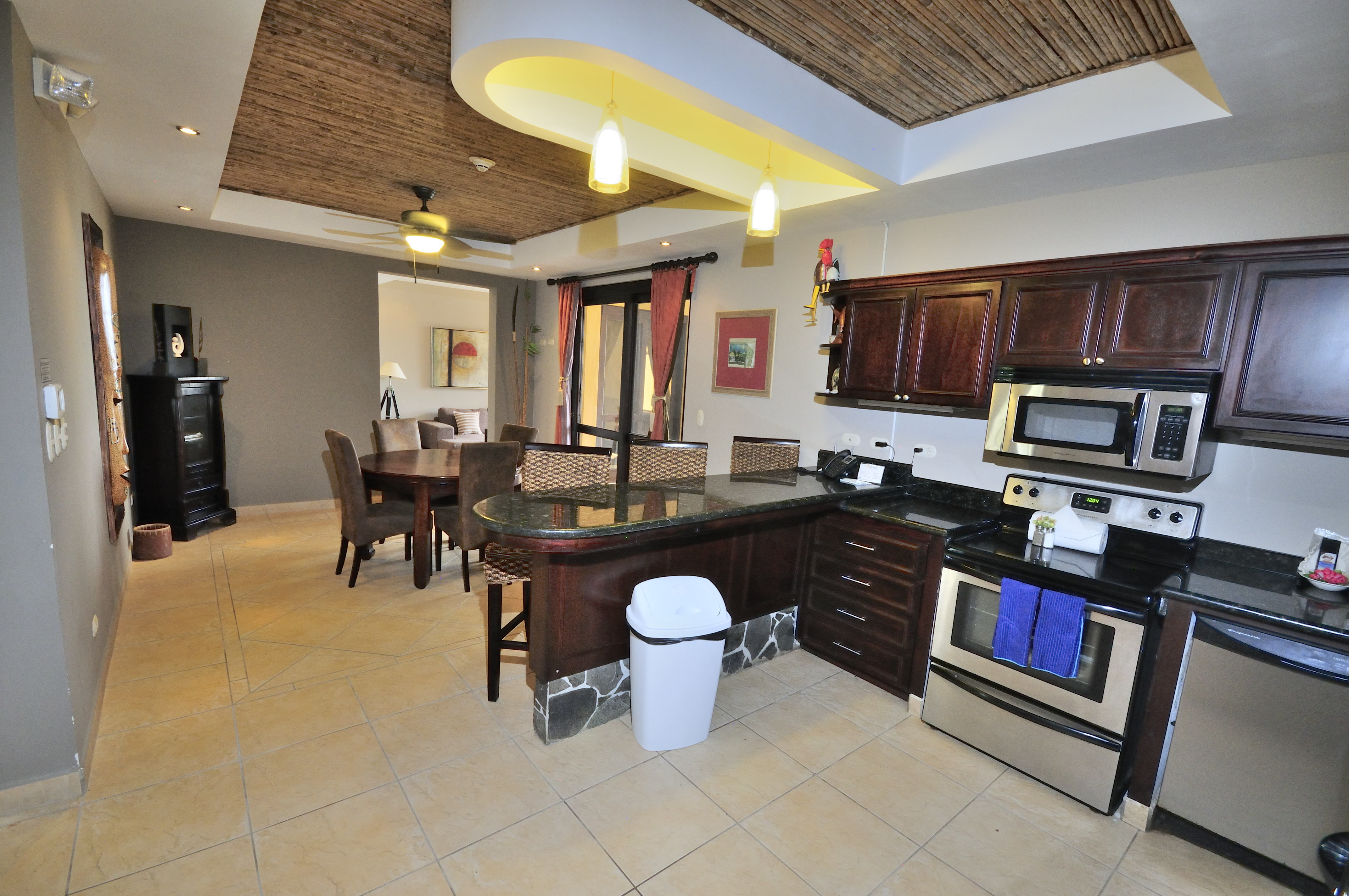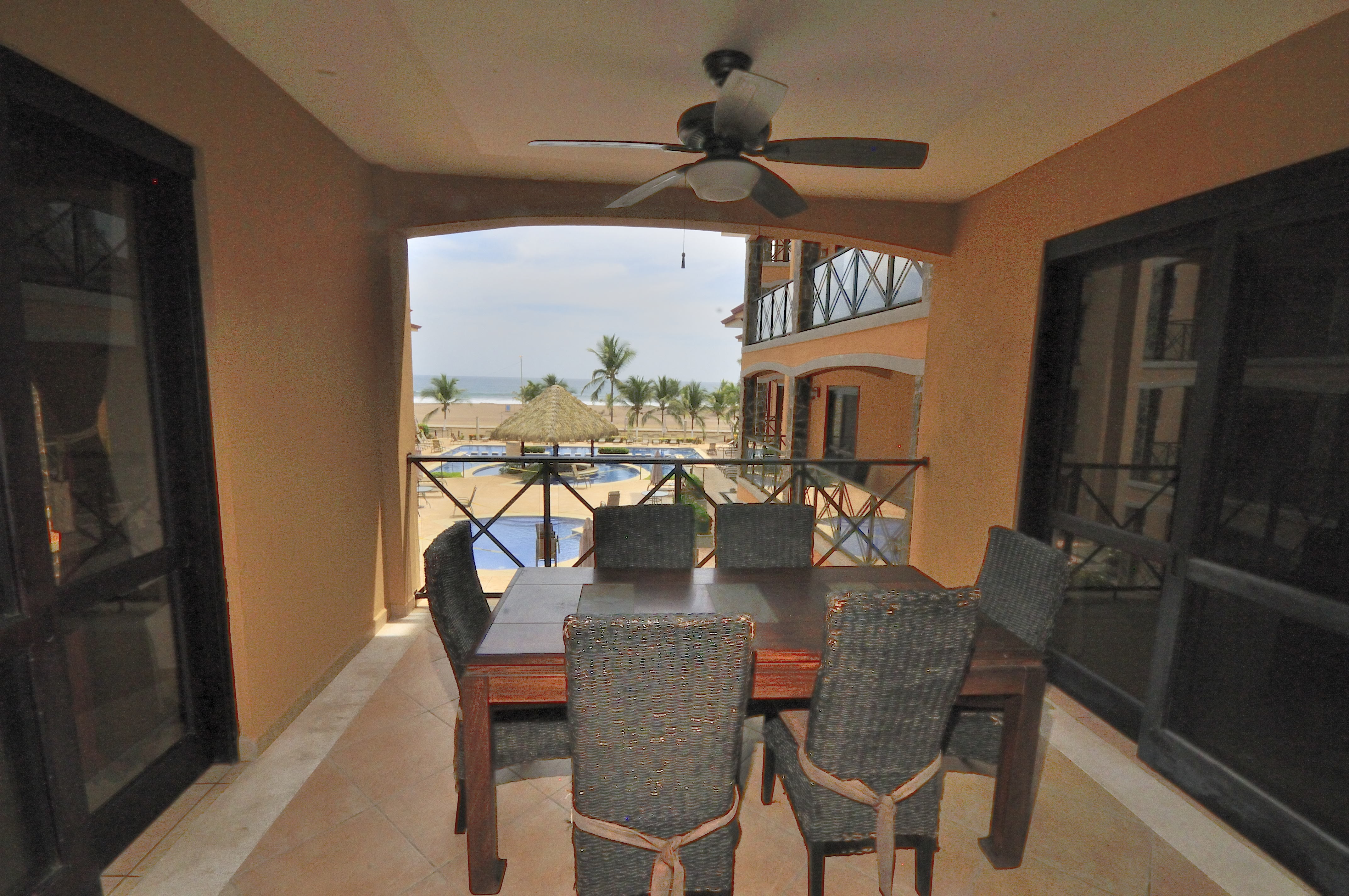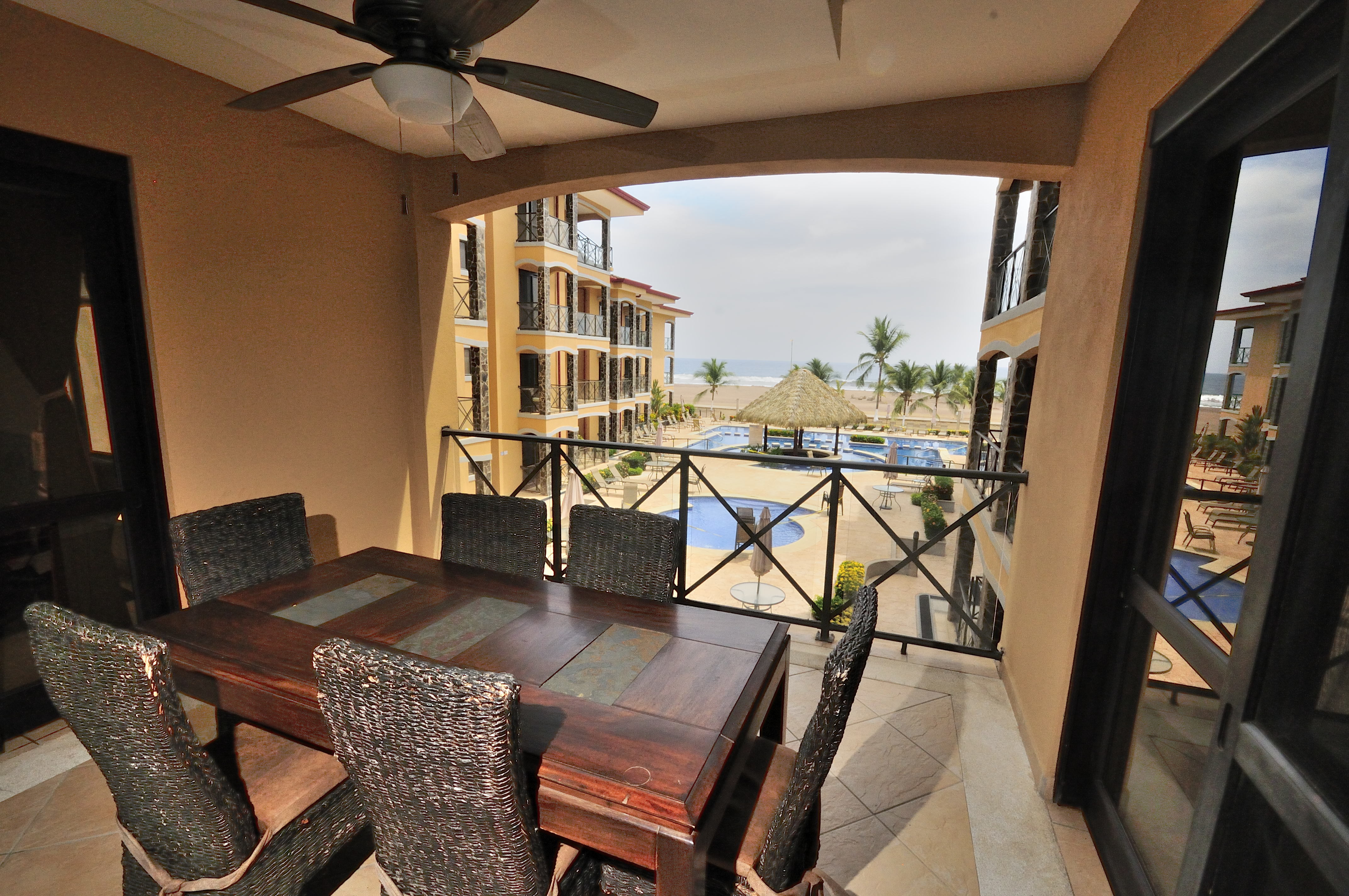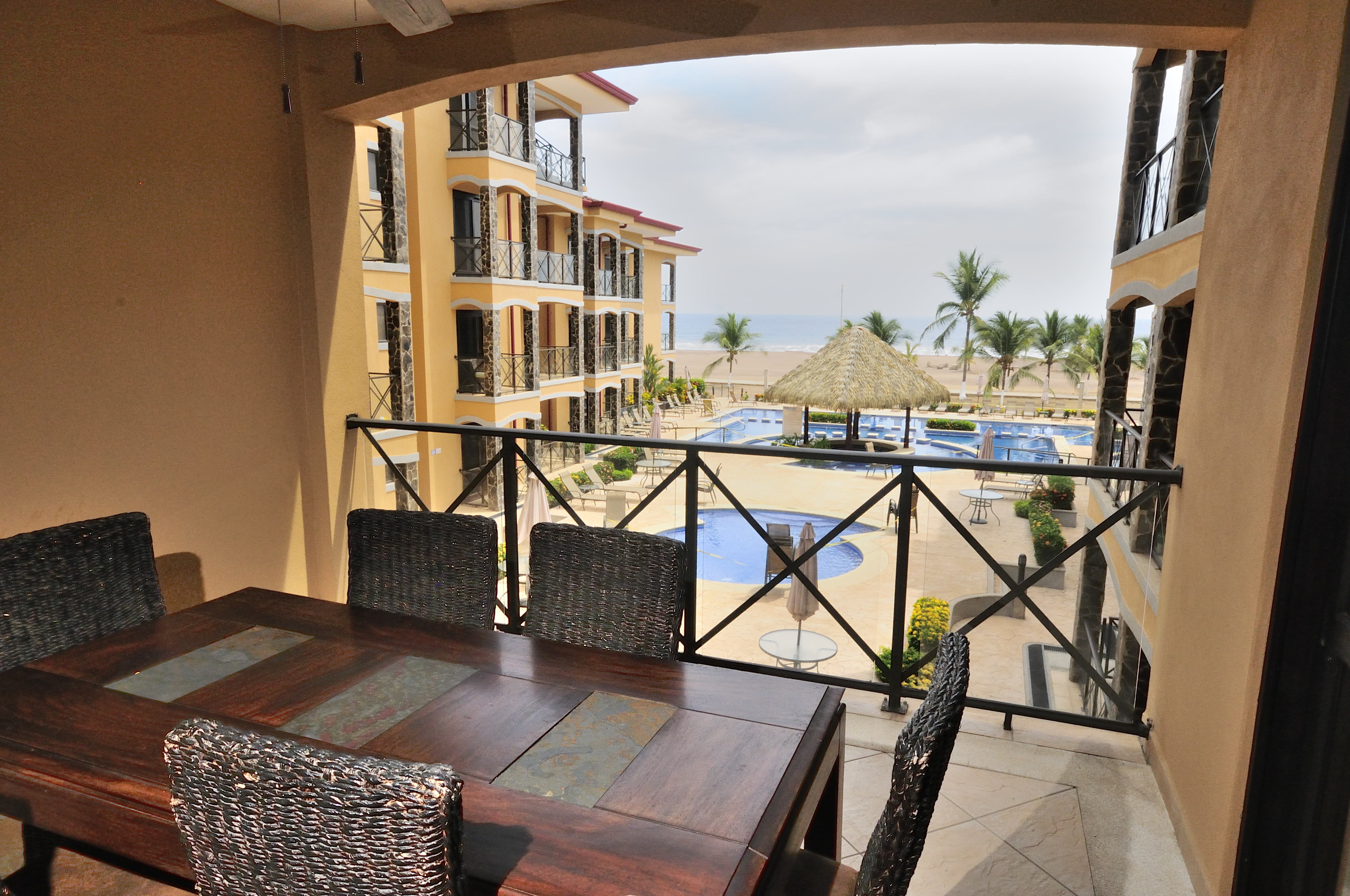 Bahia Encantada F2 is an ocean view three bedroom condo in Jaco Beach. Located on the second floor, this residence affords views over the expansive pool to the Pacific. The unit spans 1,635 square feet with 3 bedrooms and 2.5 bathrooms. This condominium is being offered fully furnished and includes stainless steel appliances and granite countertops. Upgrades include new A/C units, remodeled master bathroom, bamboo ceilings, new refrigerator, BBQ, dishwasher and 2 new beds.