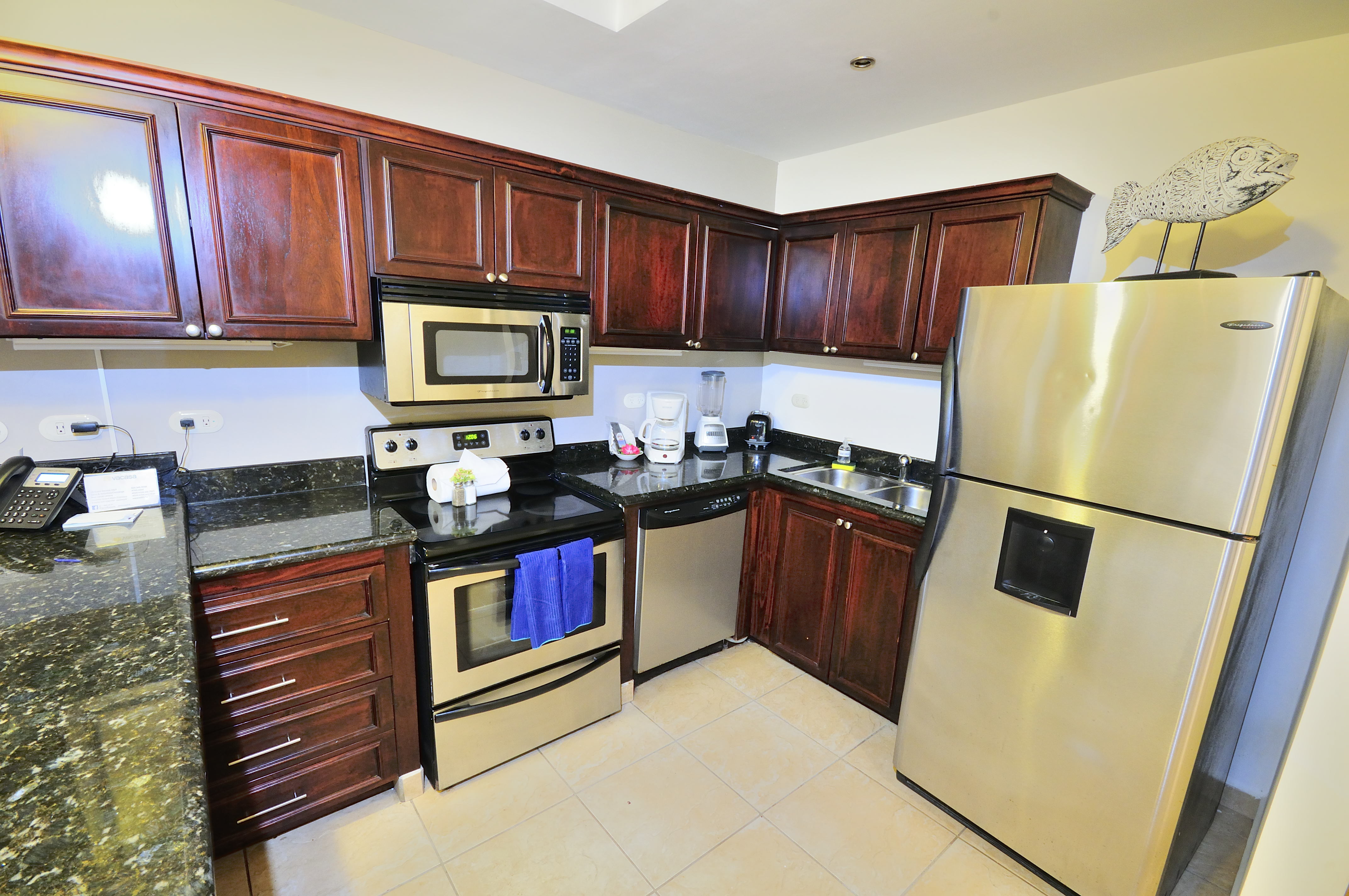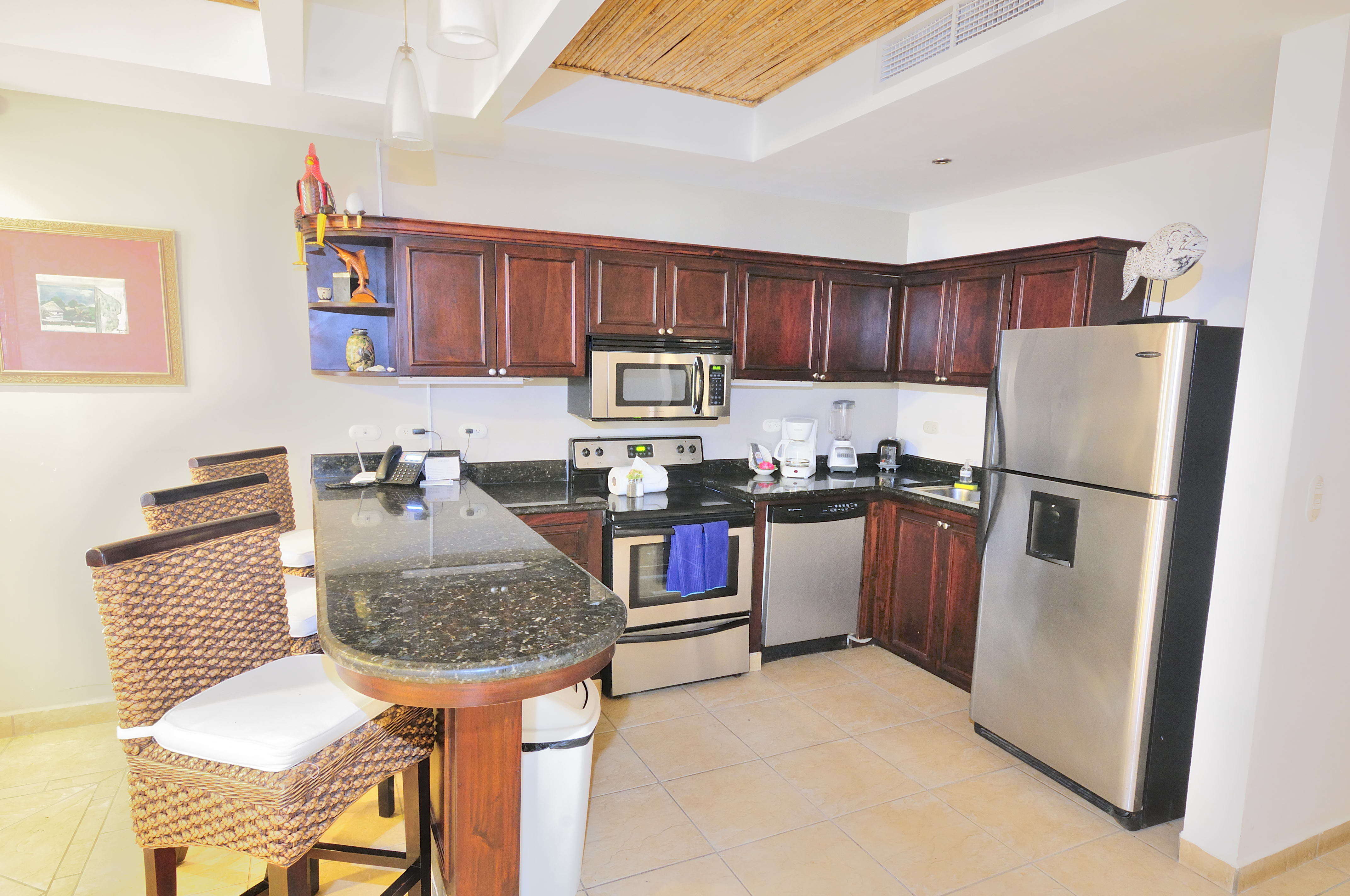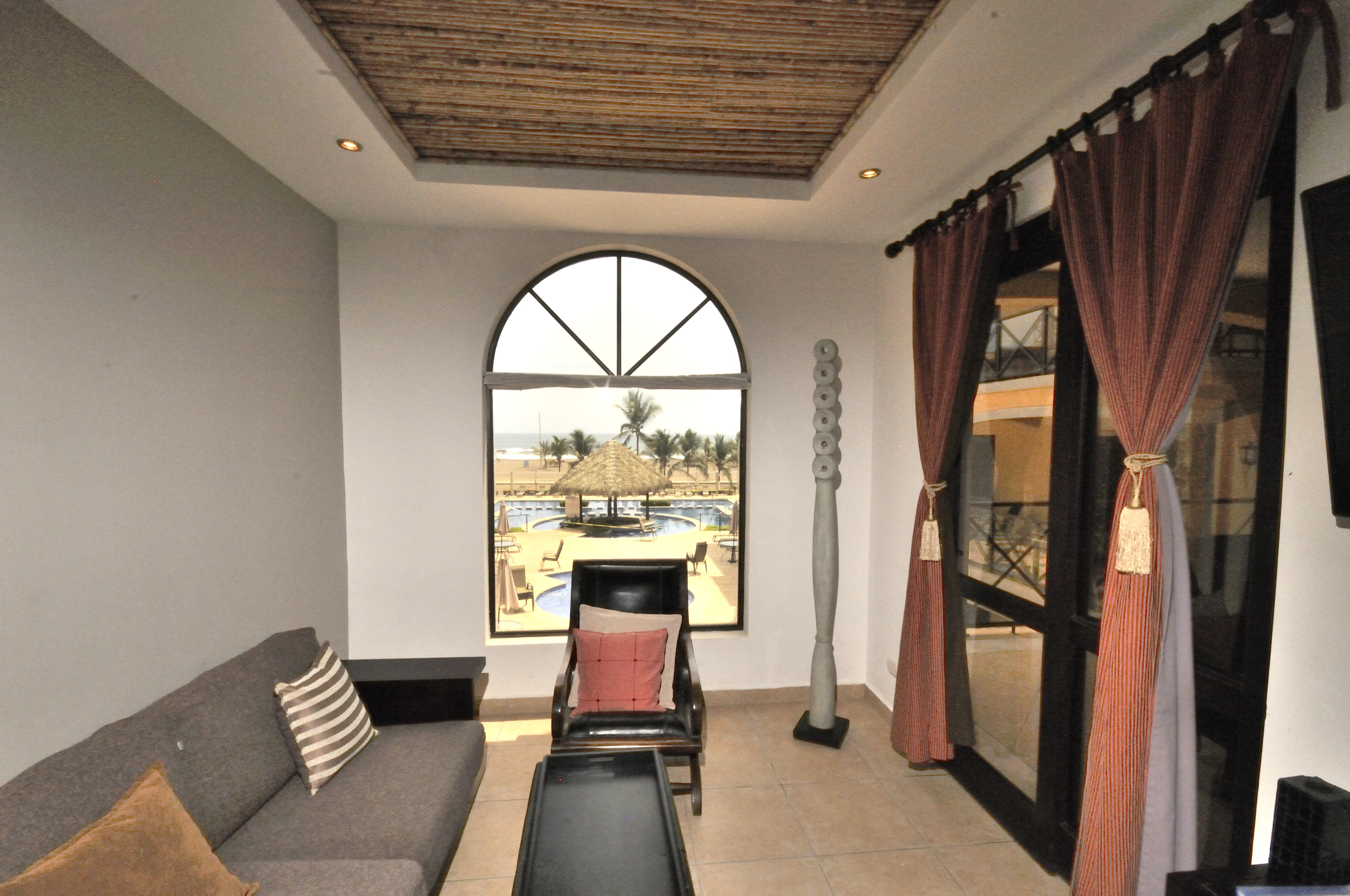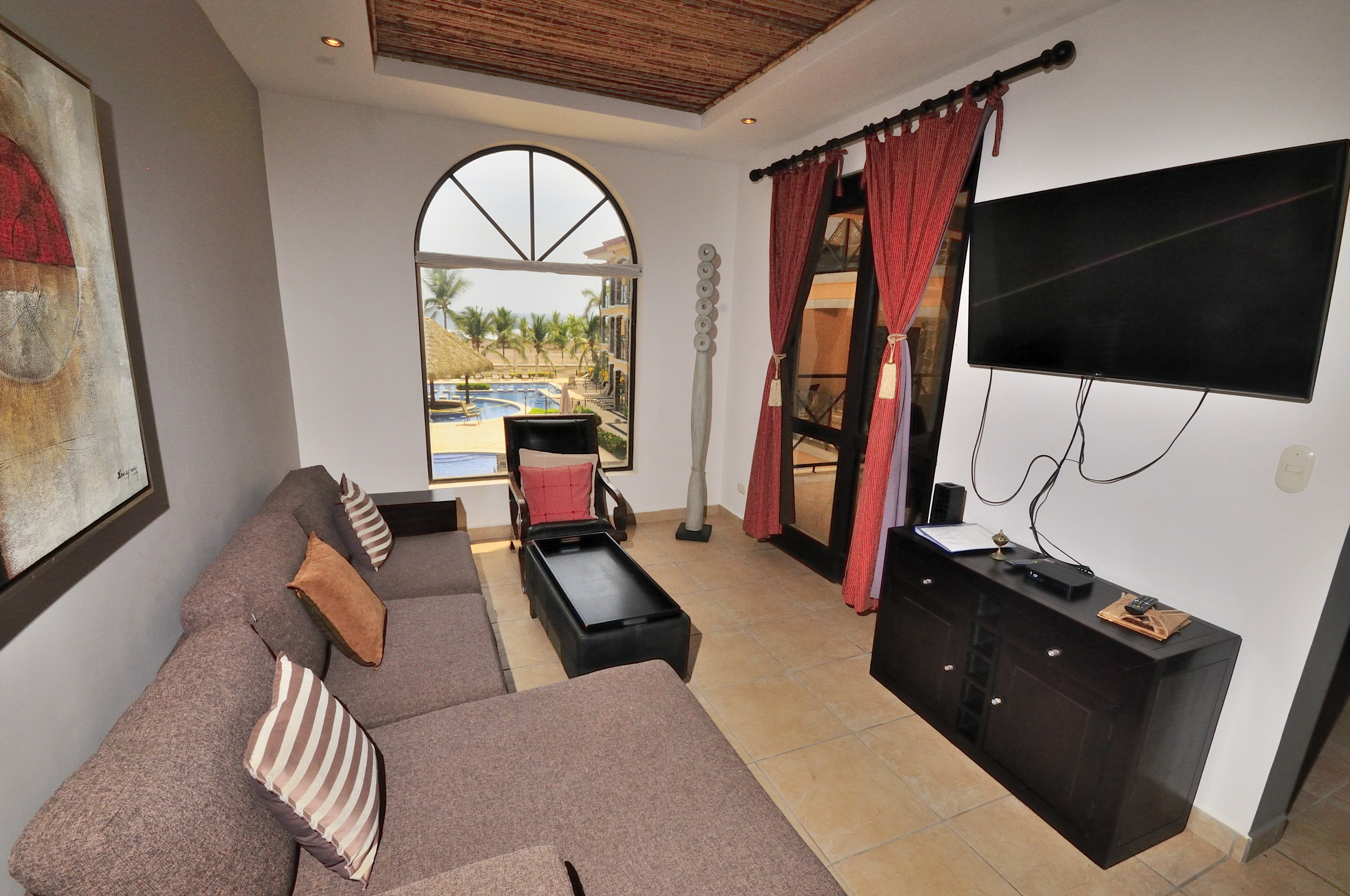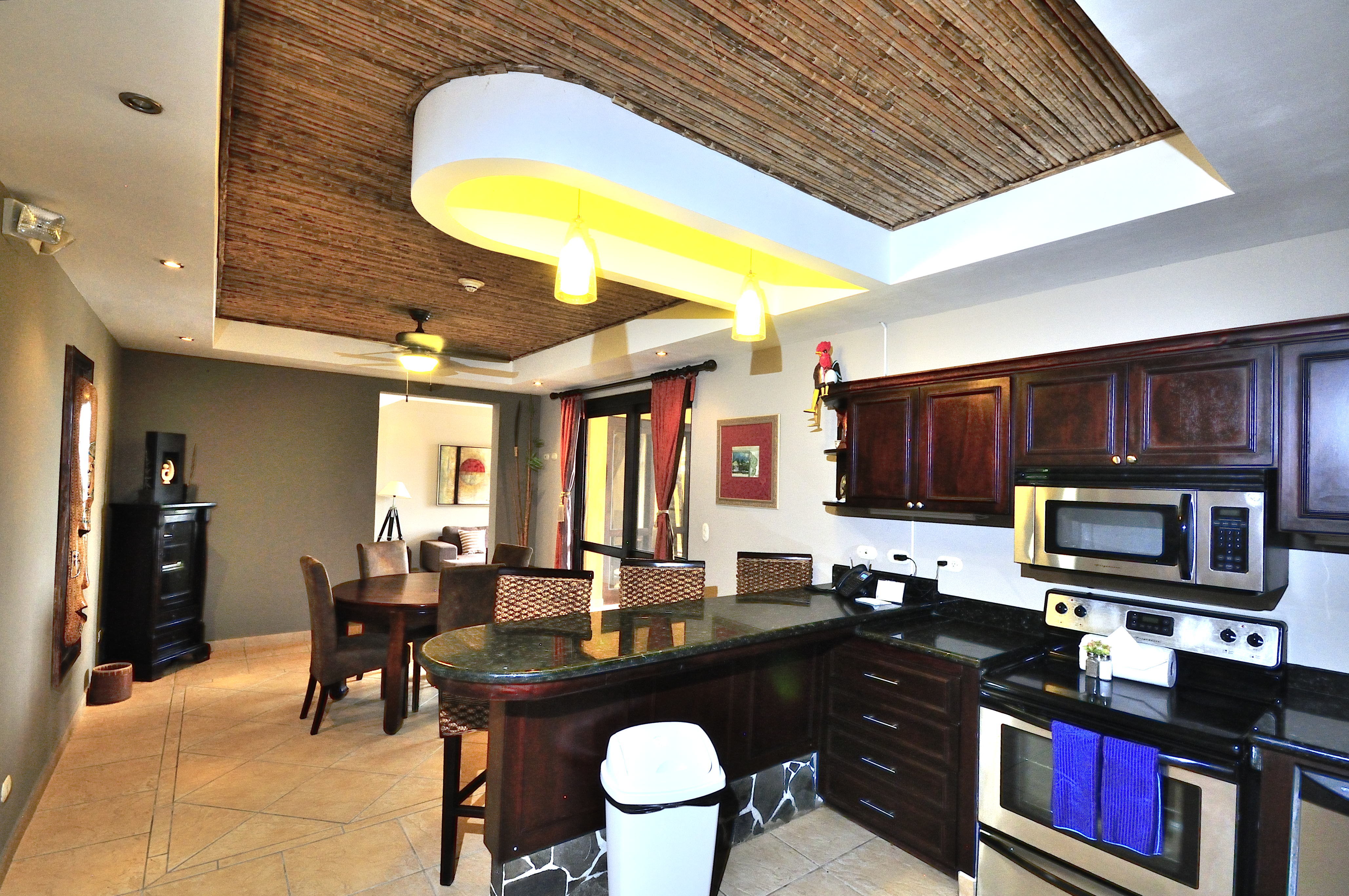 Bahia Encantada F2 is an ocean view three bedroom condo in Jaco Beach. Located on the second floor, this residence affords views over the expansive pool to the Pacific. The unit spans 1,635 square feet with 3 bedrooms and 2.5 bathrooms. This condominium is being offered fully furnished and includes stainless steel appliances and granite countertops. Upgrades include new A/C units, remodeled master bathroom, bamboo ceilings, new refrigerator, BBQ, dishwasher and 2 new beds.