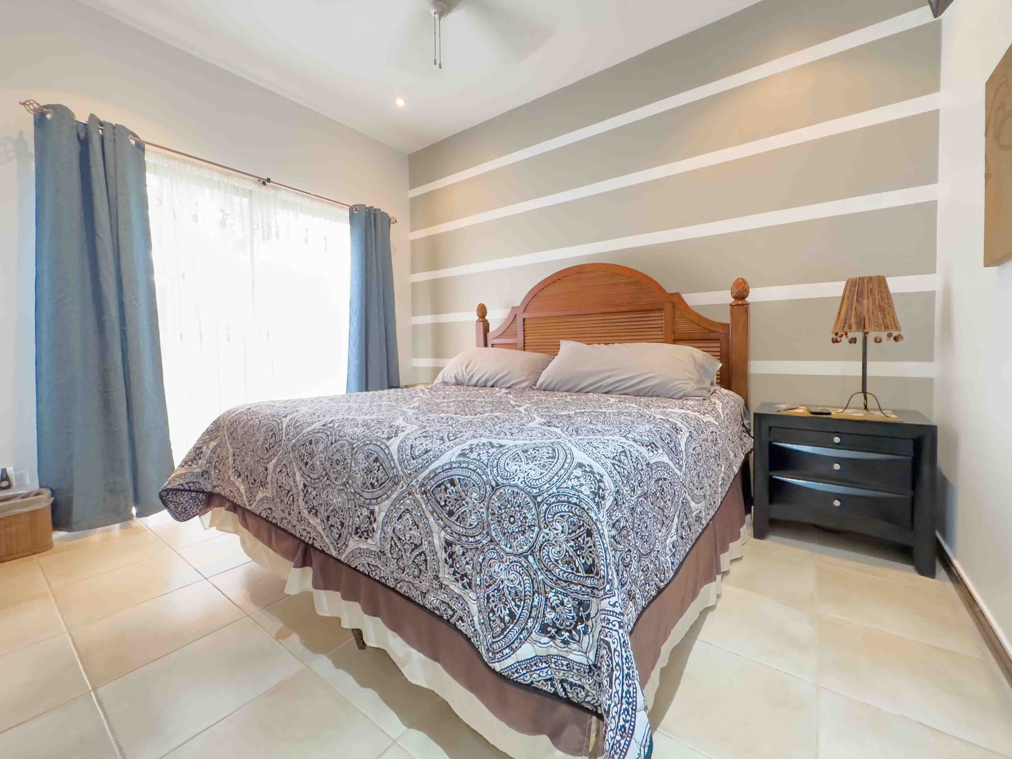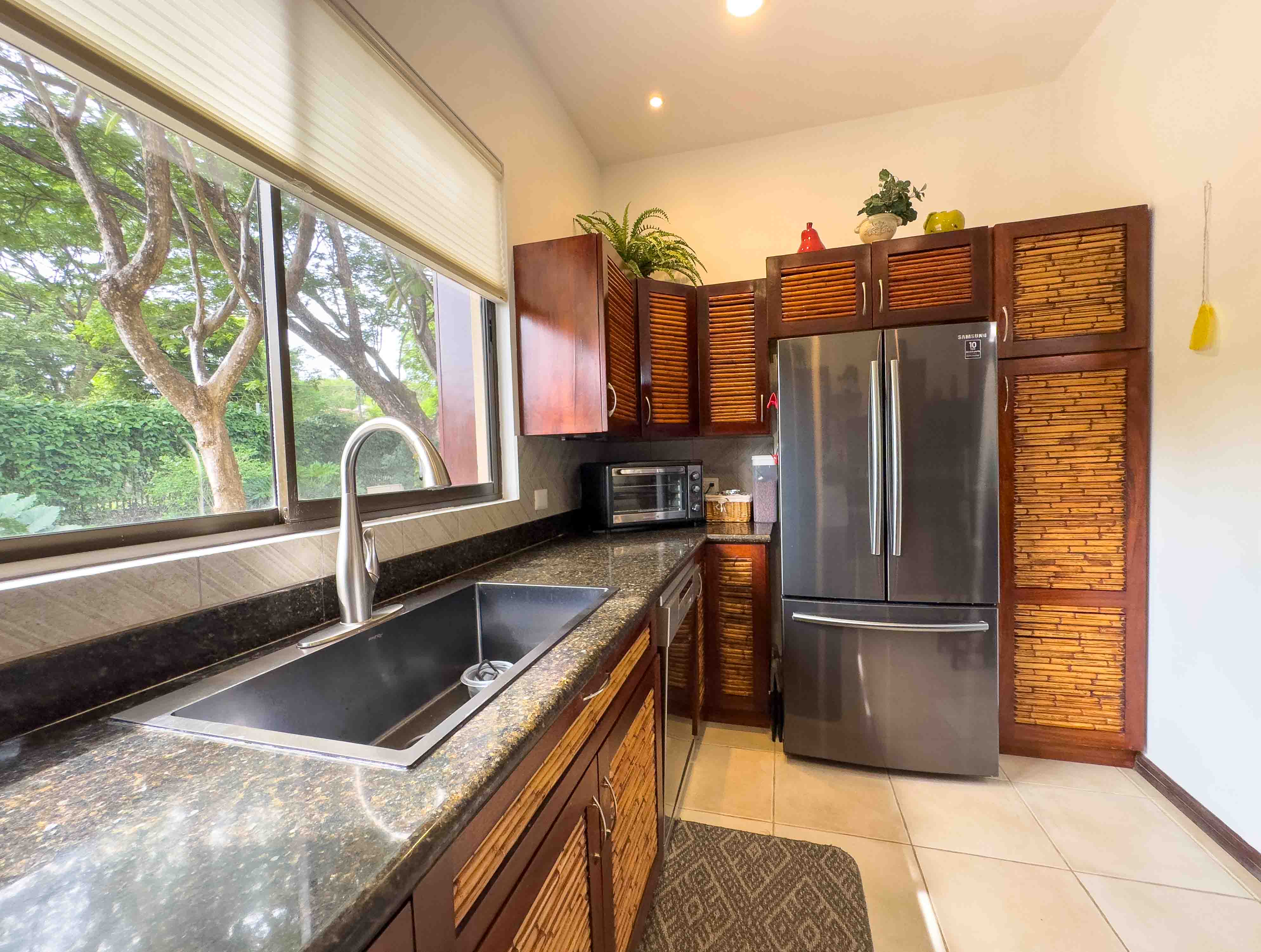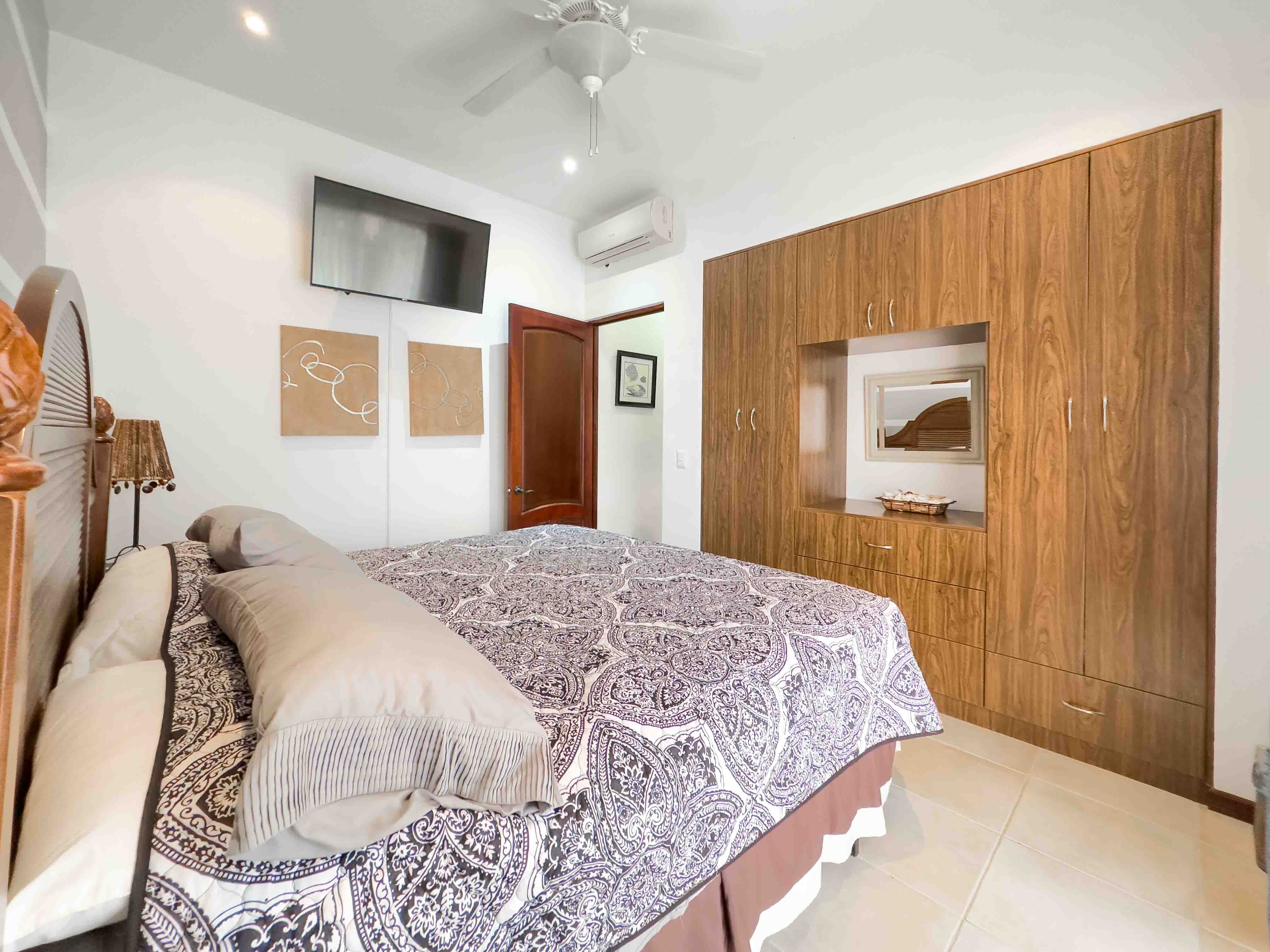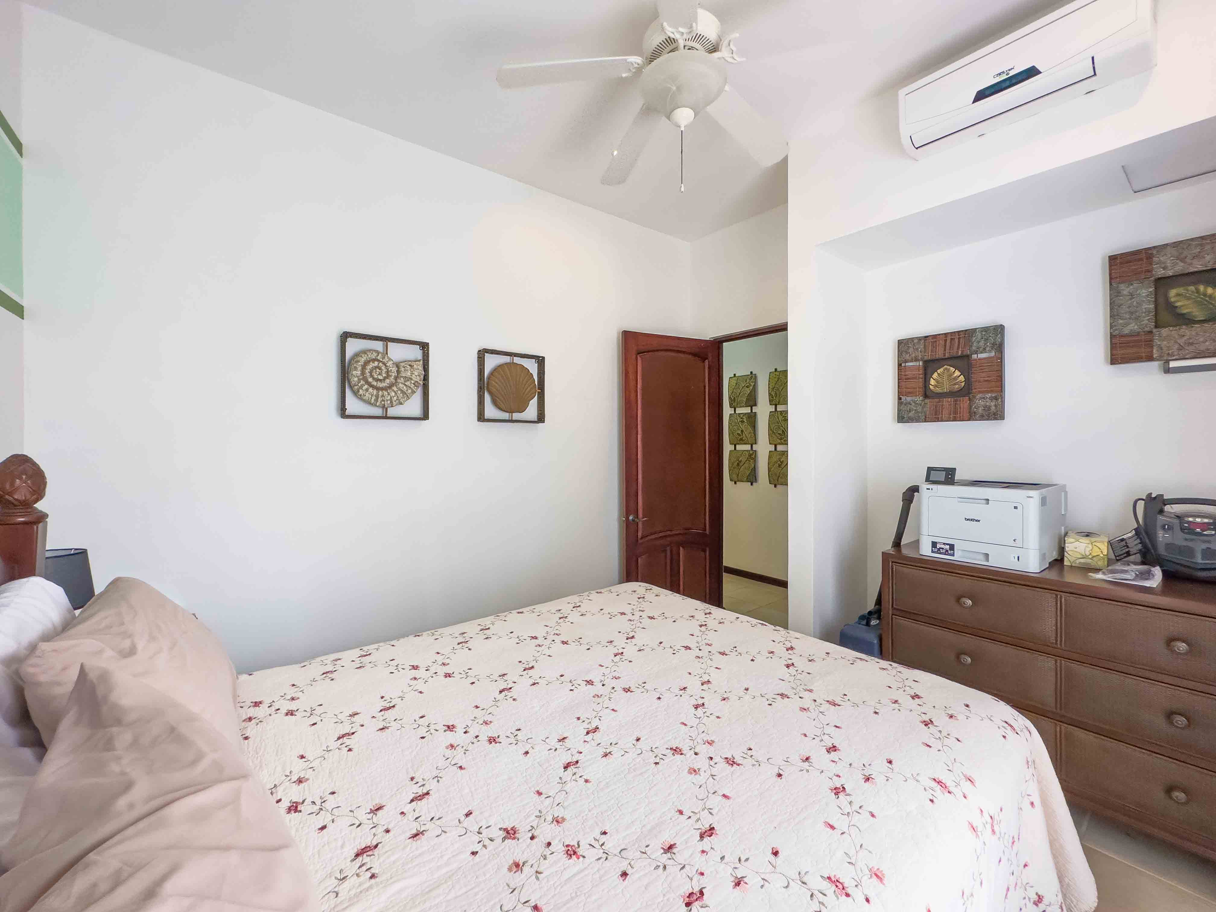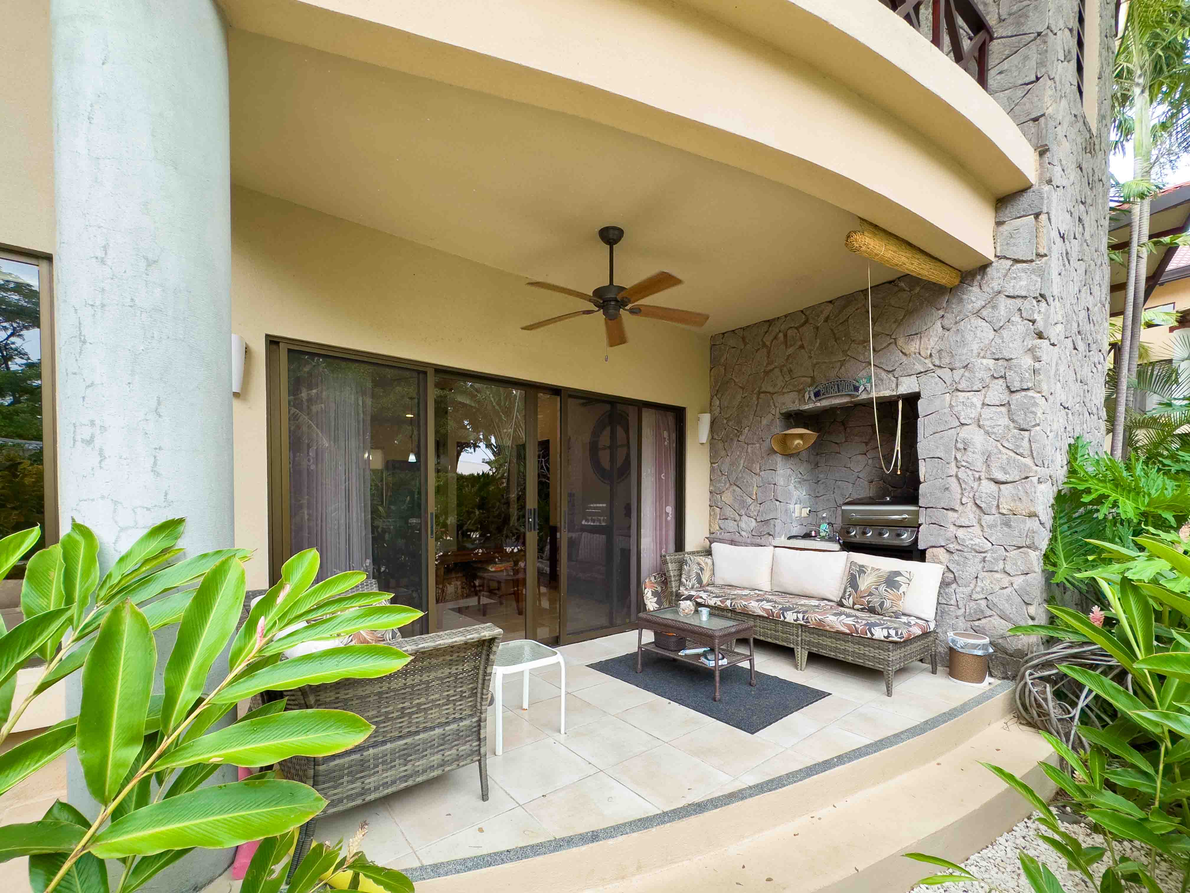 This ground-floor condo offers an open concept floor plan, with tropical style interior living room and kitchen, the kitchen has lots of storage space, granite countertops, and hardwood cabinets, lots of natural light and privacy, wide sliding doors open to a patio with outdoor kitchen and BBQ, direct access to one of the two beautiful swimming pools within Sombras. Unit #202 has a spacious master suite with an ensuite bathroom and walking closet, two guest bedrooms, and a guest bathroom. The condo comes fully furnished and is ready to rent it out or make it your new home. There is a parking space for each unit and one will appreciate the walk under the shade from the parking to the condo on a sunny day.