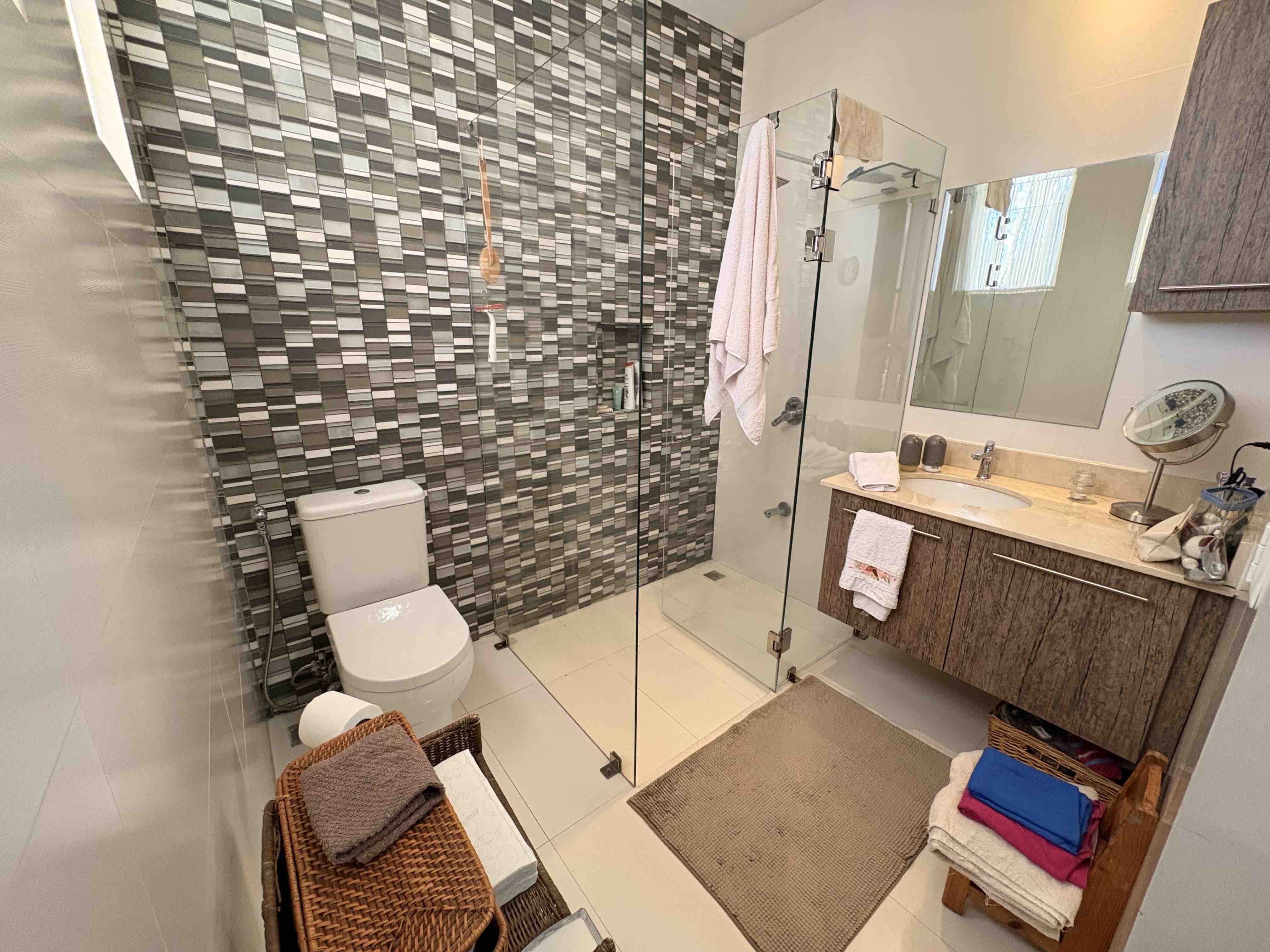 La propiedad ofrece 200 m² habitables más una terraza de 25 m² (cerrada con ventanales que pueden abrirse para integrar el exterior), logrando espacios generosos y muy bien iluminados. Cuenta con 3 habitaciones, cada una con baño completo y clóset; la habitación principal incluye walk-in closet.
