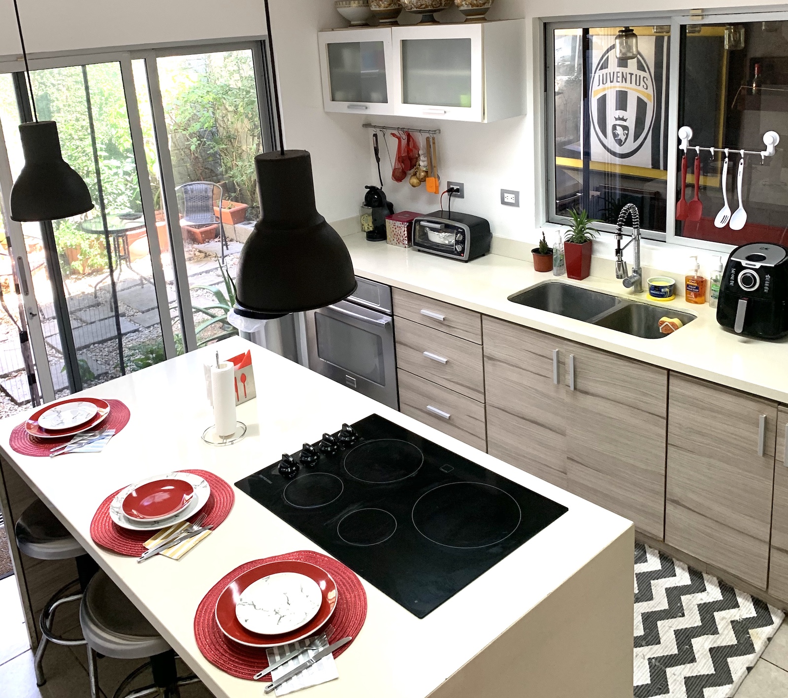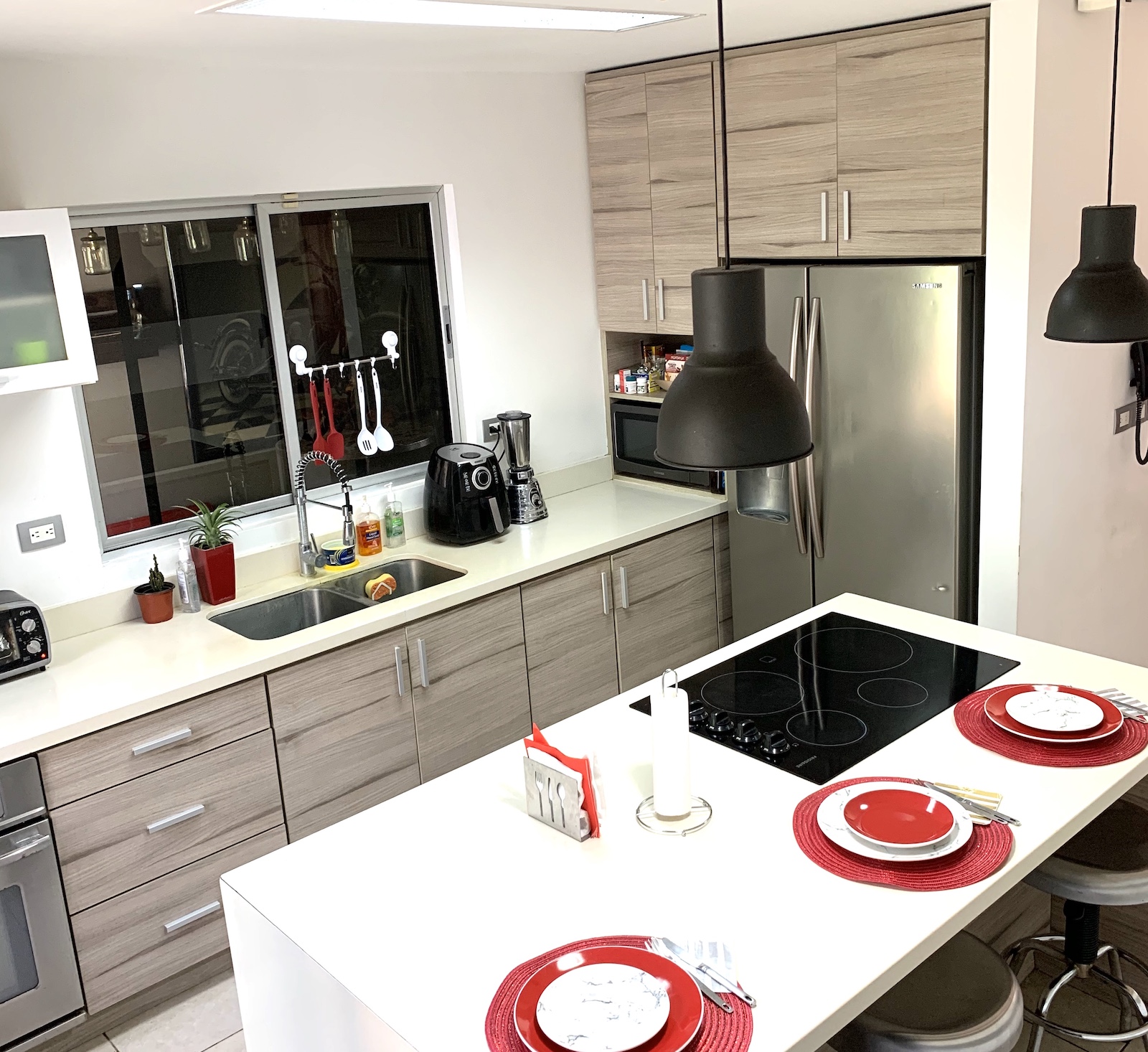 On the first floor, there is a large open space that combines the living room and dining room, connecting to the covered terrace and the garden, the kitchen with island and quartz countertops, a half guest bathroom, laundry area, and maid's bedroom with a full bathroom. On the second floor, there is a TV room, an area for a desk, the master bedroom with its own bathroom and a walk-in closet; 2 other ample bedrooms with a built-in closet each, and another full bathroom shared by these bedrooms.