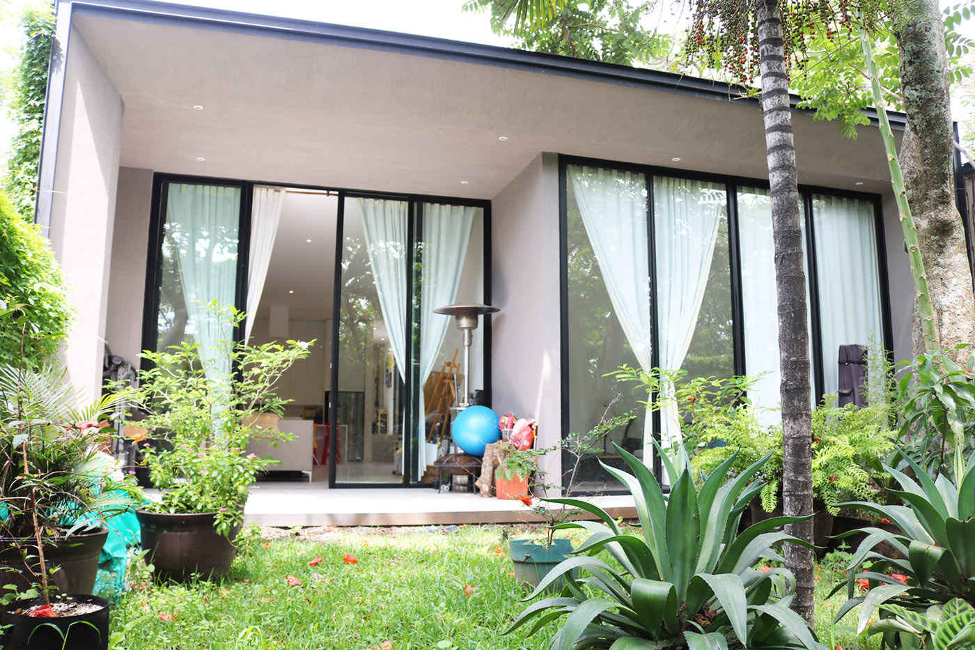 La casa es de UN SOLO PISO, 235m2 (2,530 sq ft) de construcción, de diseño contemporáneo y hermosos acabados. Cocina, sala y comedor, abiertos, con buenos espacios y distribución y techos altos, ventanales y puertas corredizas que permiten la brisa y luz natural correr por la casa todo el día. Varios patios internos y un patio trasero, bien decorado, con zacate, lindas plantas y árboles maduros. Cada habitación tiene su propio baño privado y closet, el dormitorio principal tiene un walk-in closet muy espacioso, su baño privado y acceso al jardín.