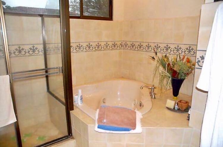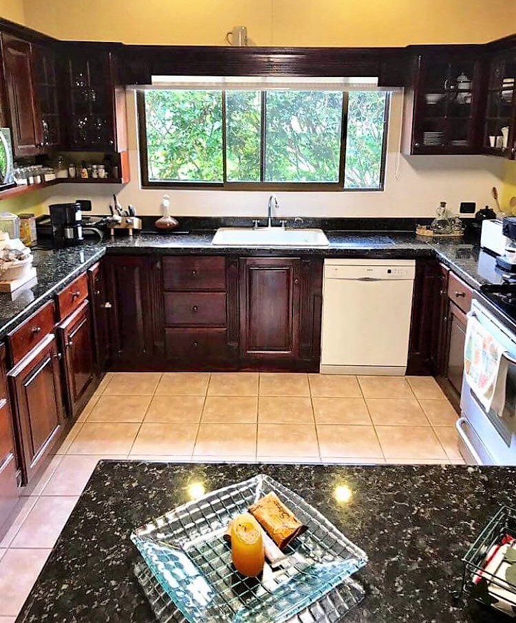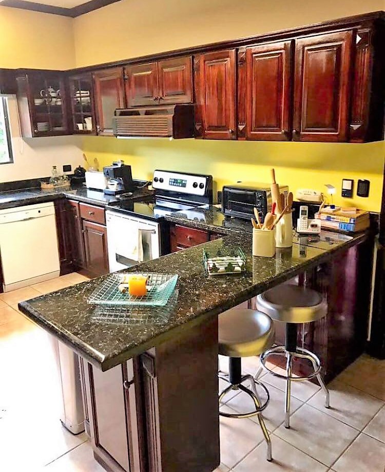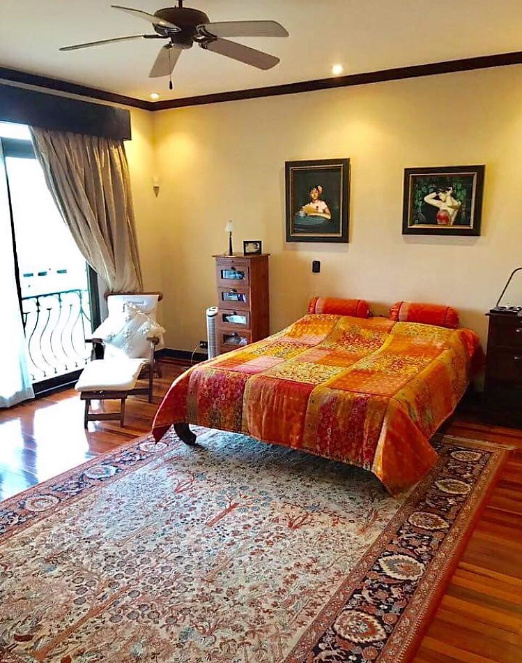 The 301-square-foot master bedroom has a spacious walk in closet, a private bathroom with Jacuzzi, and a beautiful view of the Heredia mountains, from where you can enjoy a beautiful sunset.