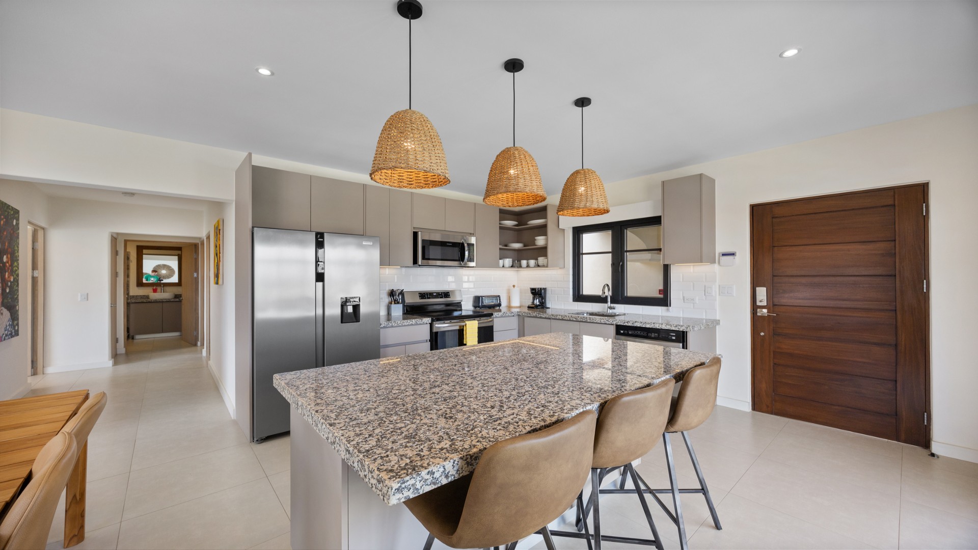 Inside, you can find a bright and breezy open-concept layout with refined finishes, natural materials, and a tasteful palette. The spacious kitchen and living area flow out onto a private balcony where sweeping ocean vistas set the scene for unforgettable mornings and magical sunsets.