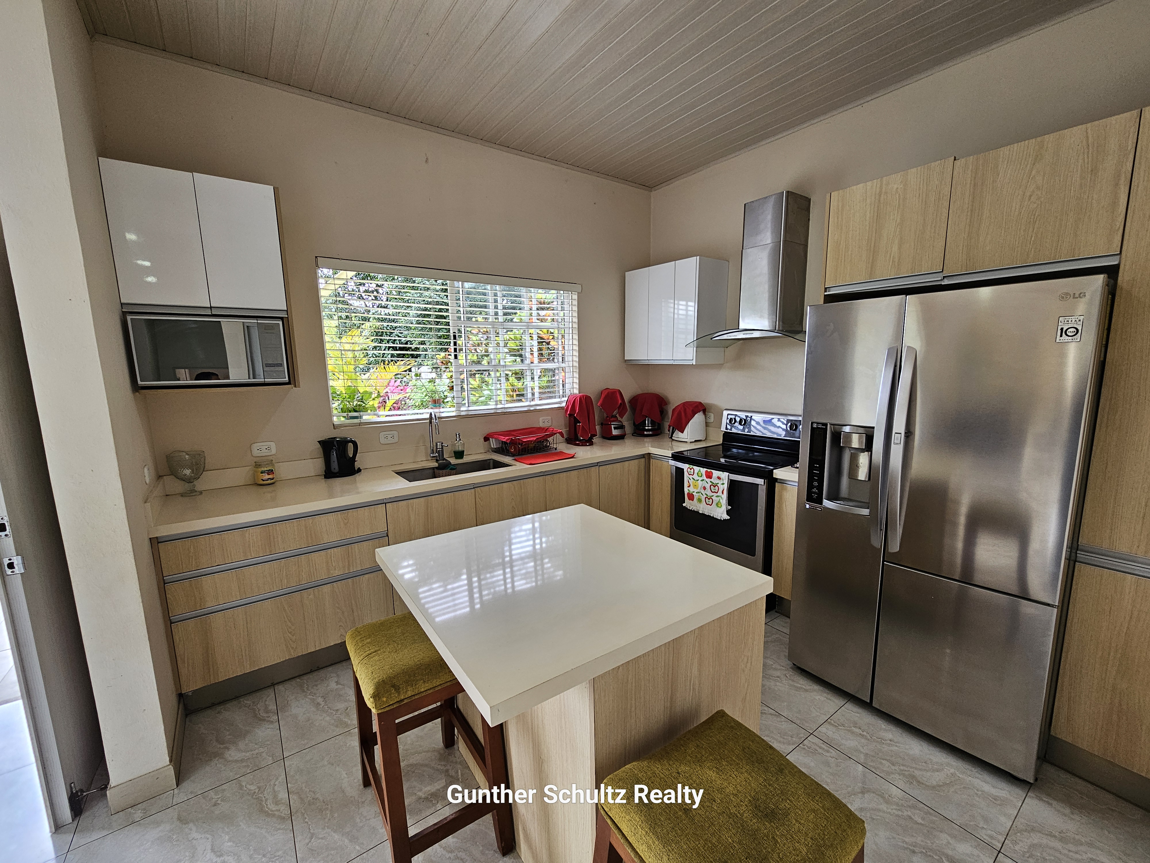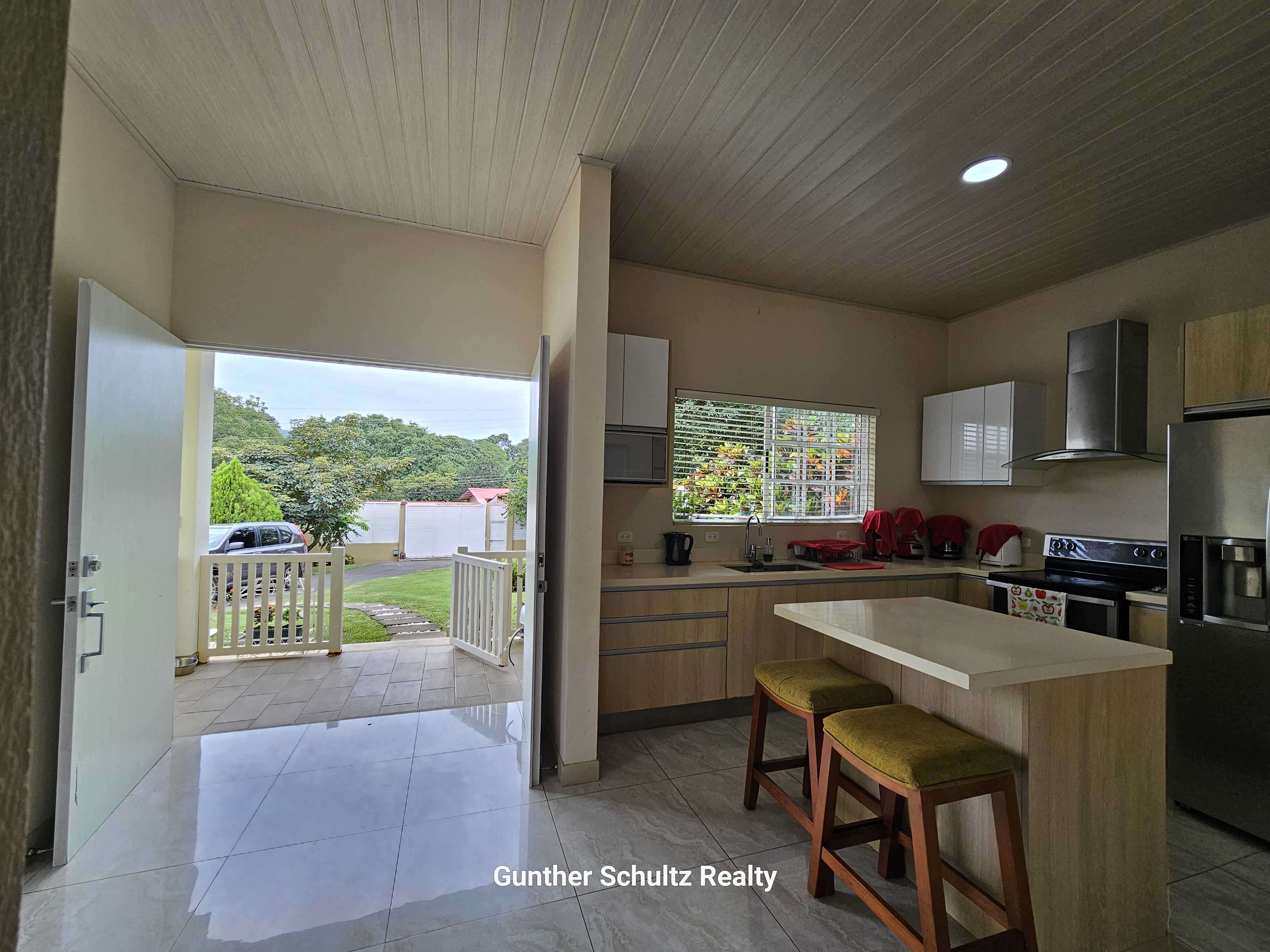• Large kitchen with central island and pantry, cozy living room, and semi-open dining area on the terrace