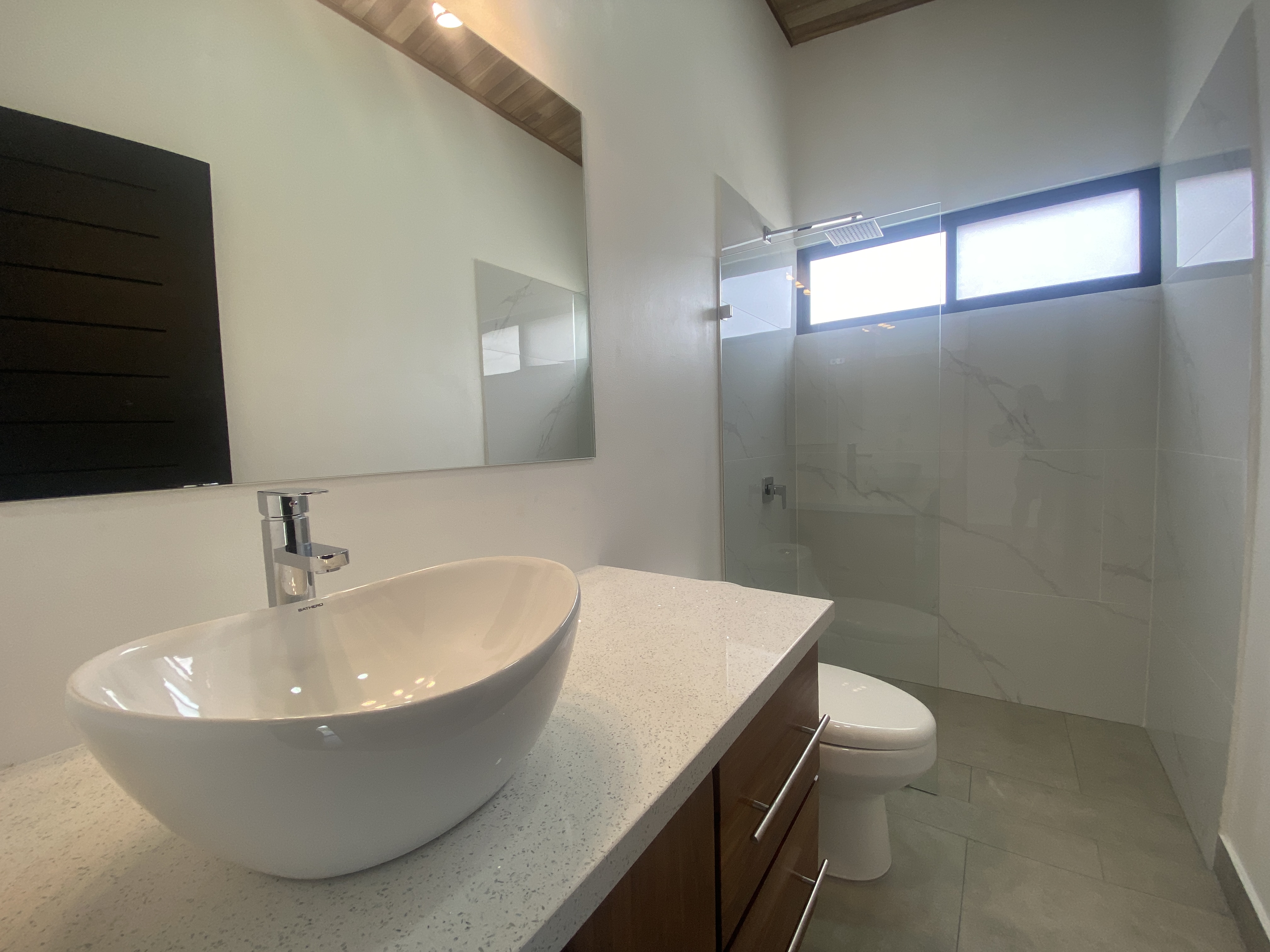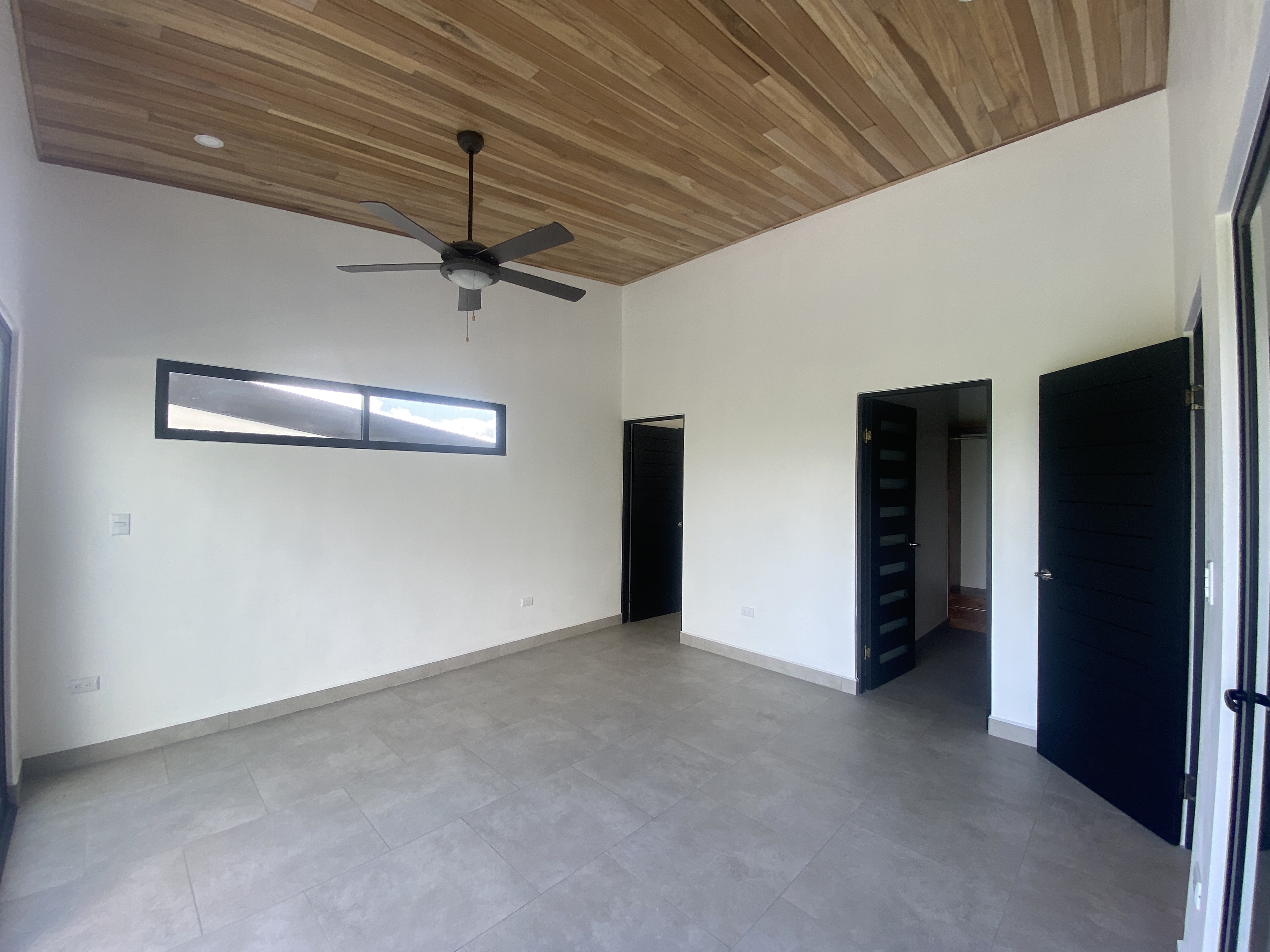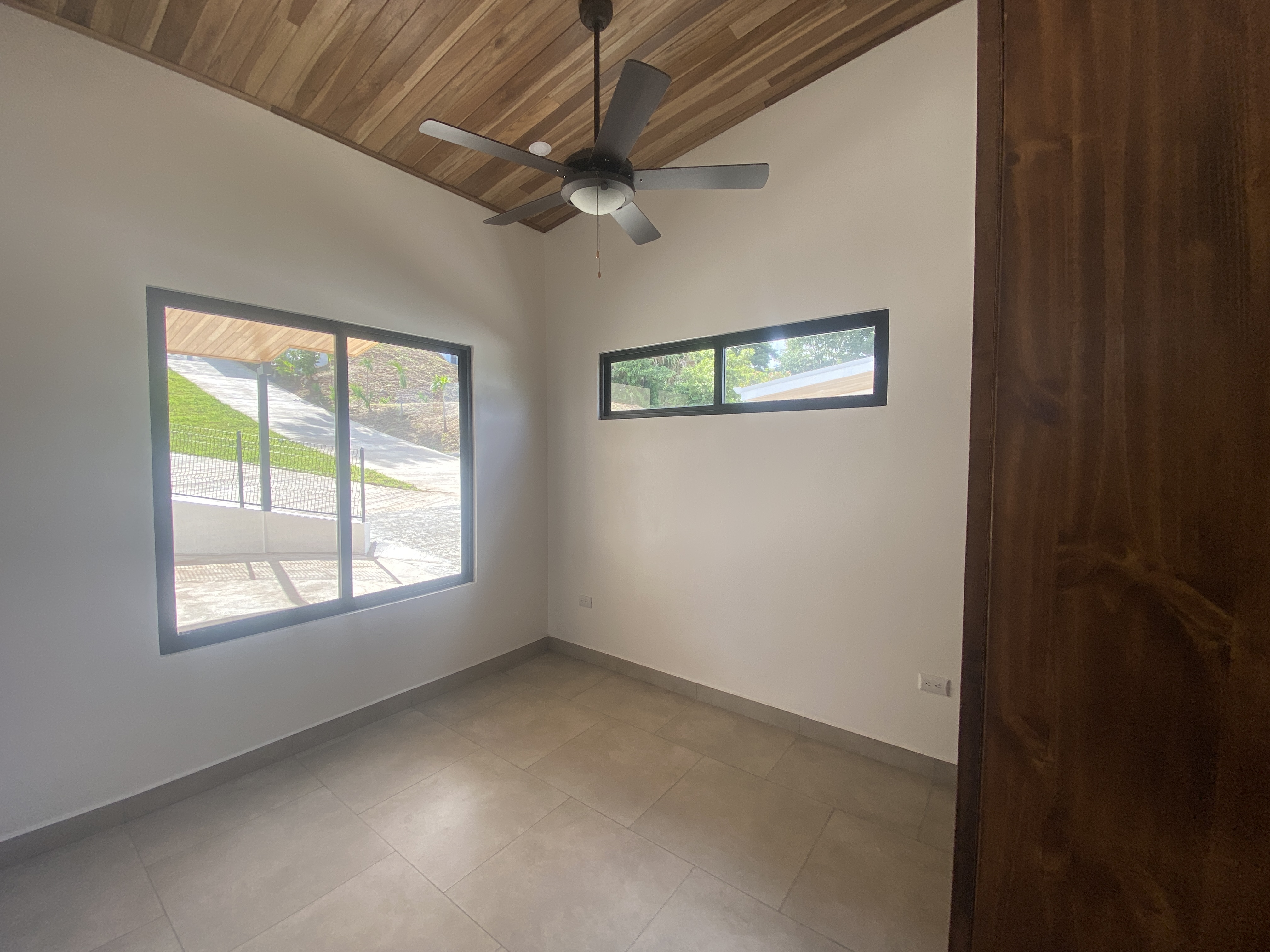 The home features a spacious master suite with a luxurious bathroom and walk-in closet, while two guest bedrooms share a stylish bathroom. The open-concept living area is anchored by a gourmet kitchen with custom Guanacaste wood cabinetry and quartz countertops. Large bay windows flood the living spaces with natural light and showcase sweeping mountain views.