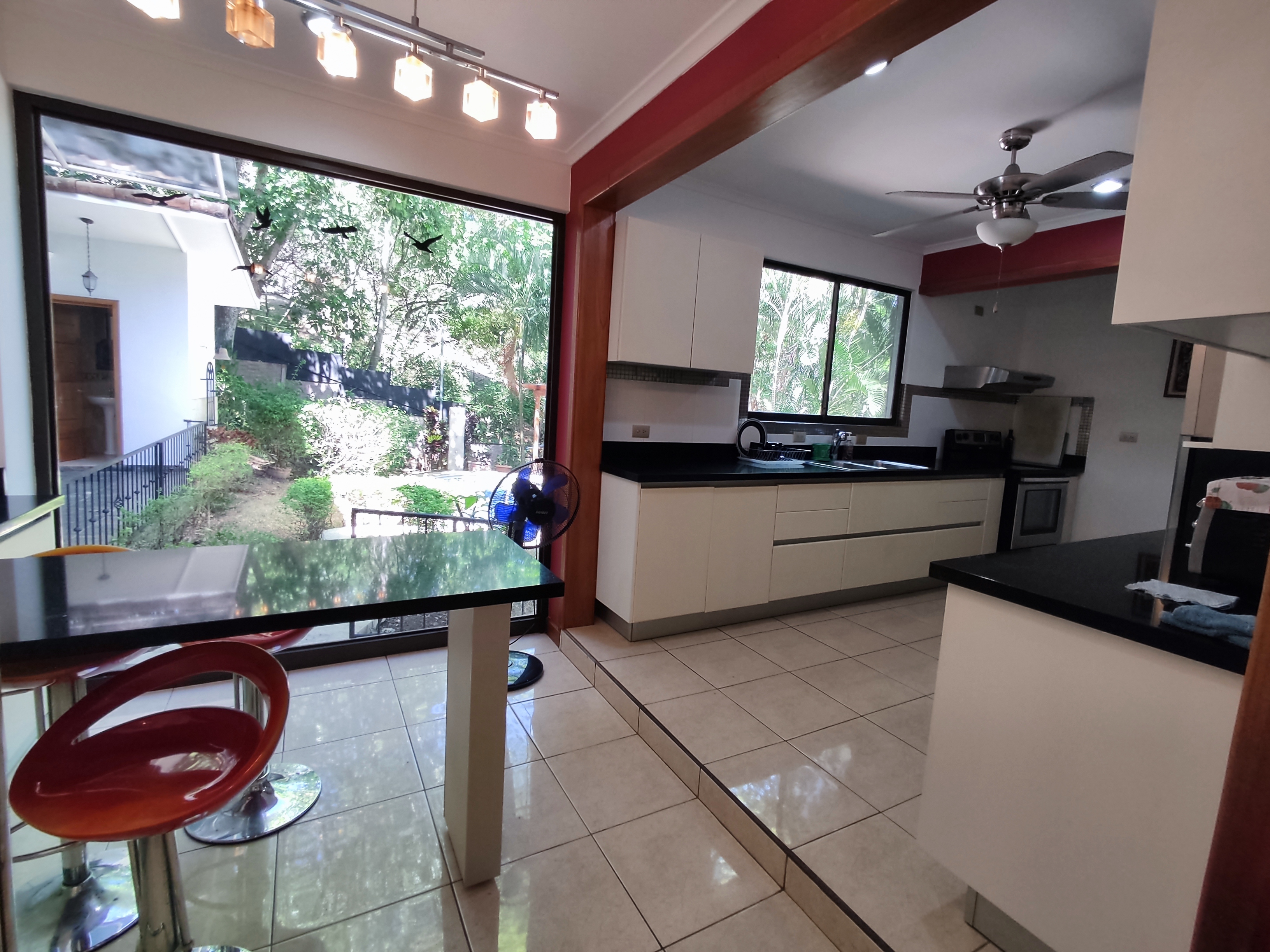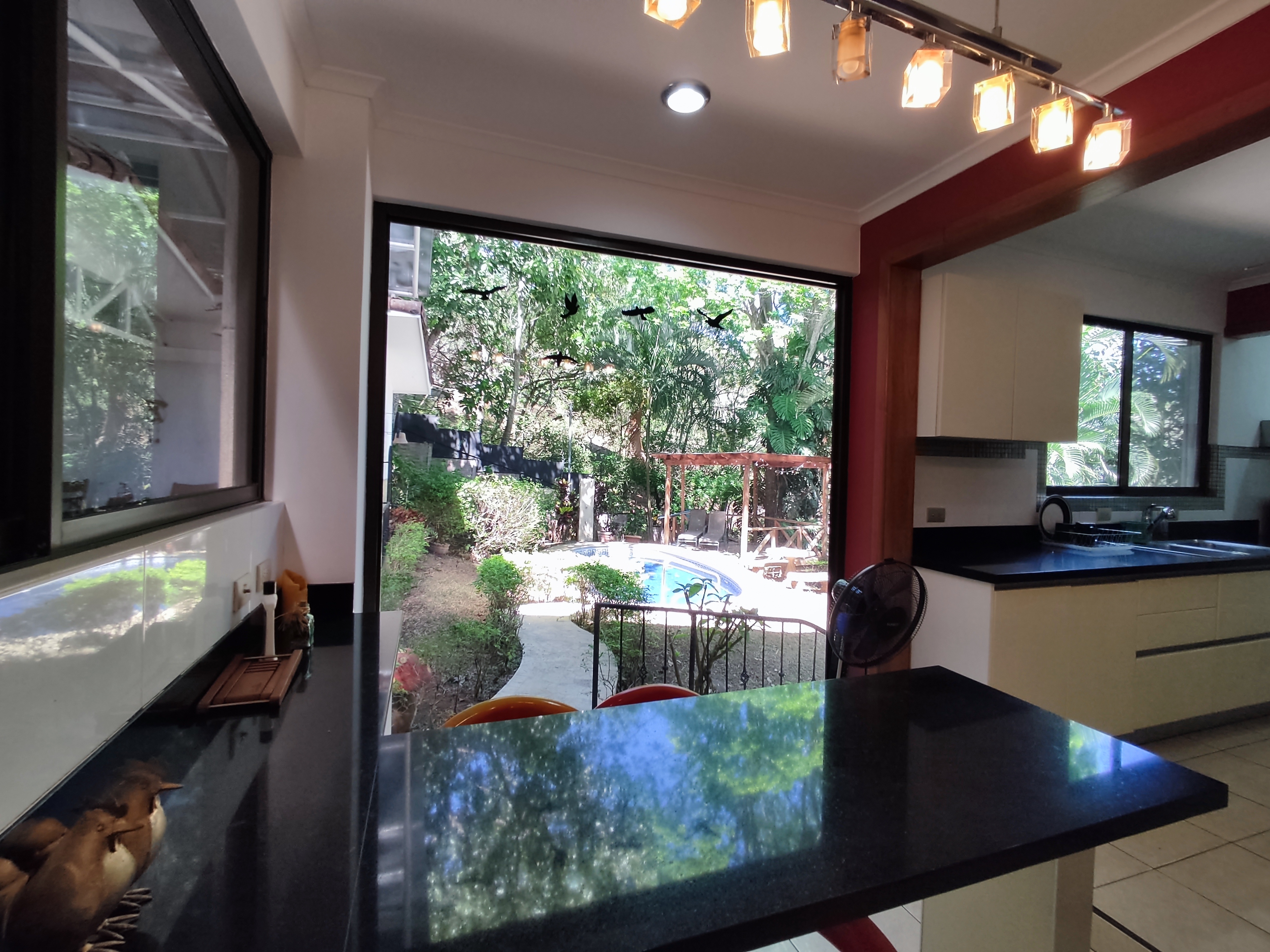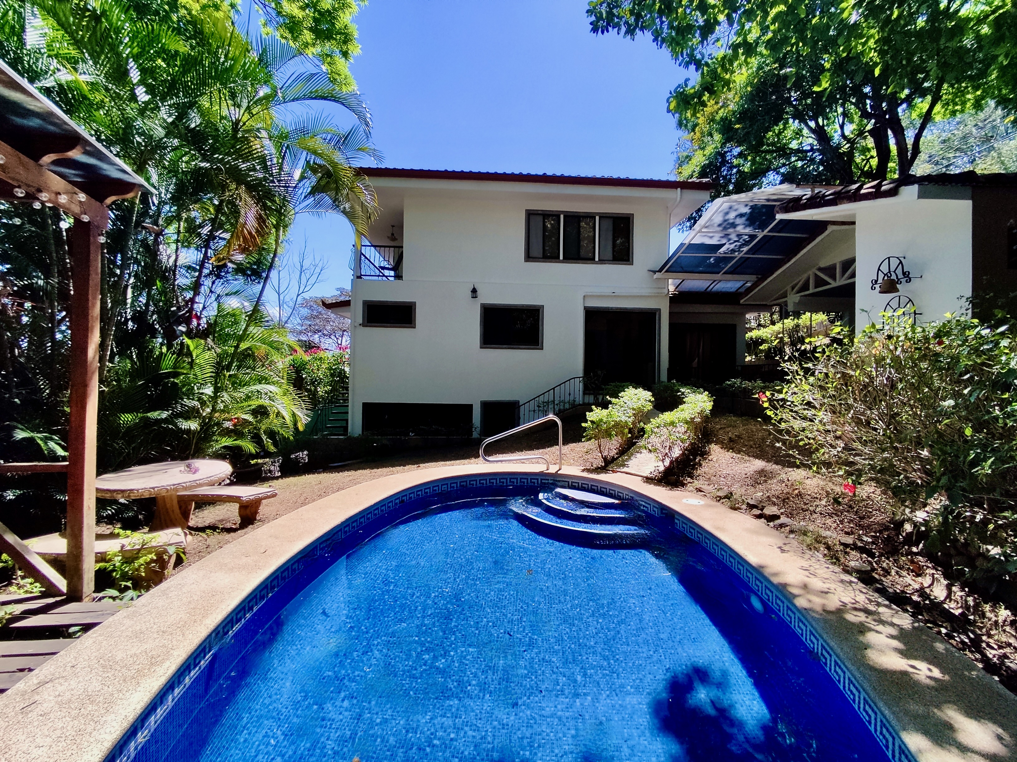 The semi-underground level offers a bodega, laundry, and a small apartment ideal for rental income or staff accommodation. The outdoor area features a swimming pool, mature fruit trees, and a covered living space perfect for enjoying Costa Rica’s climate.