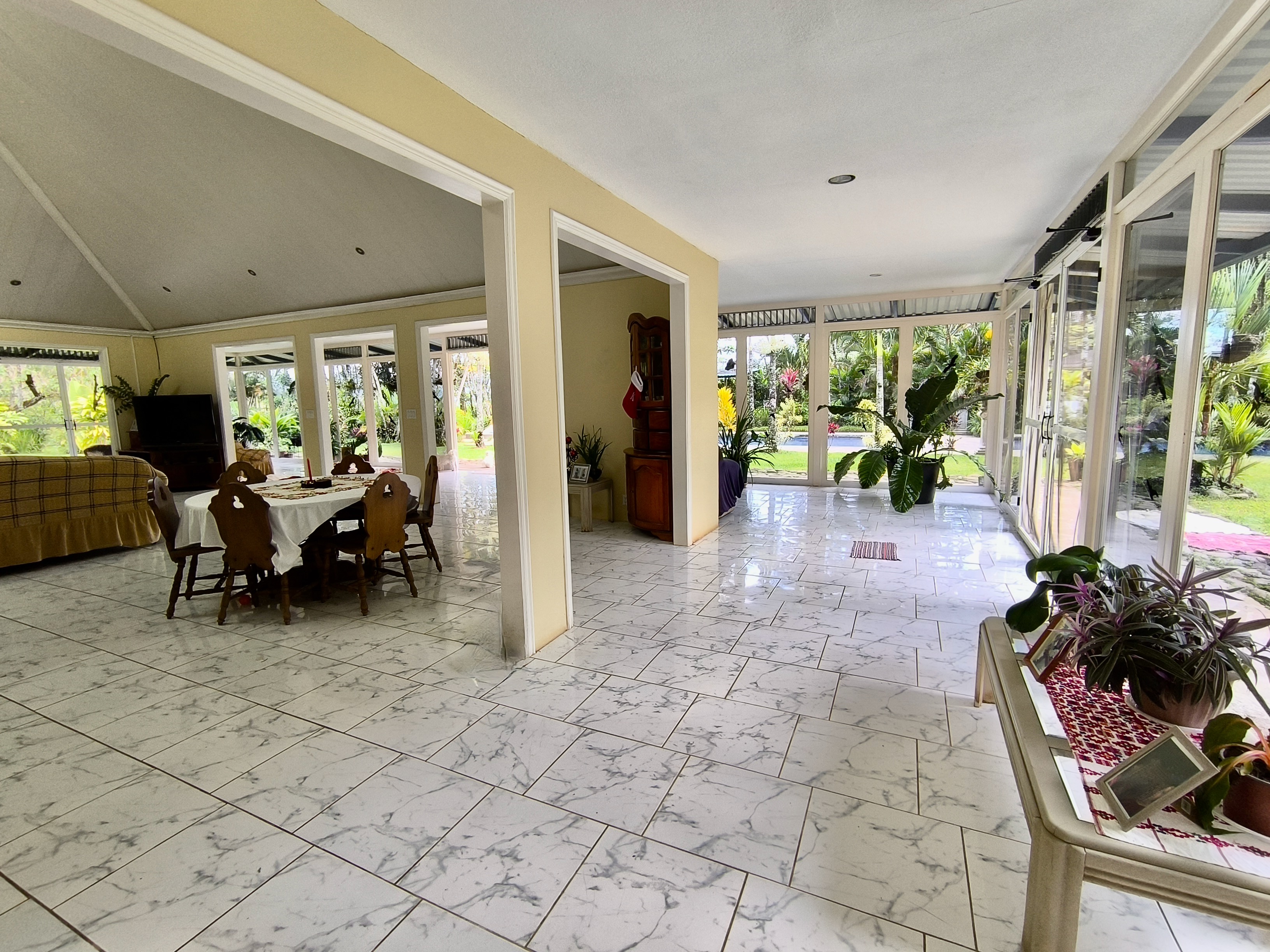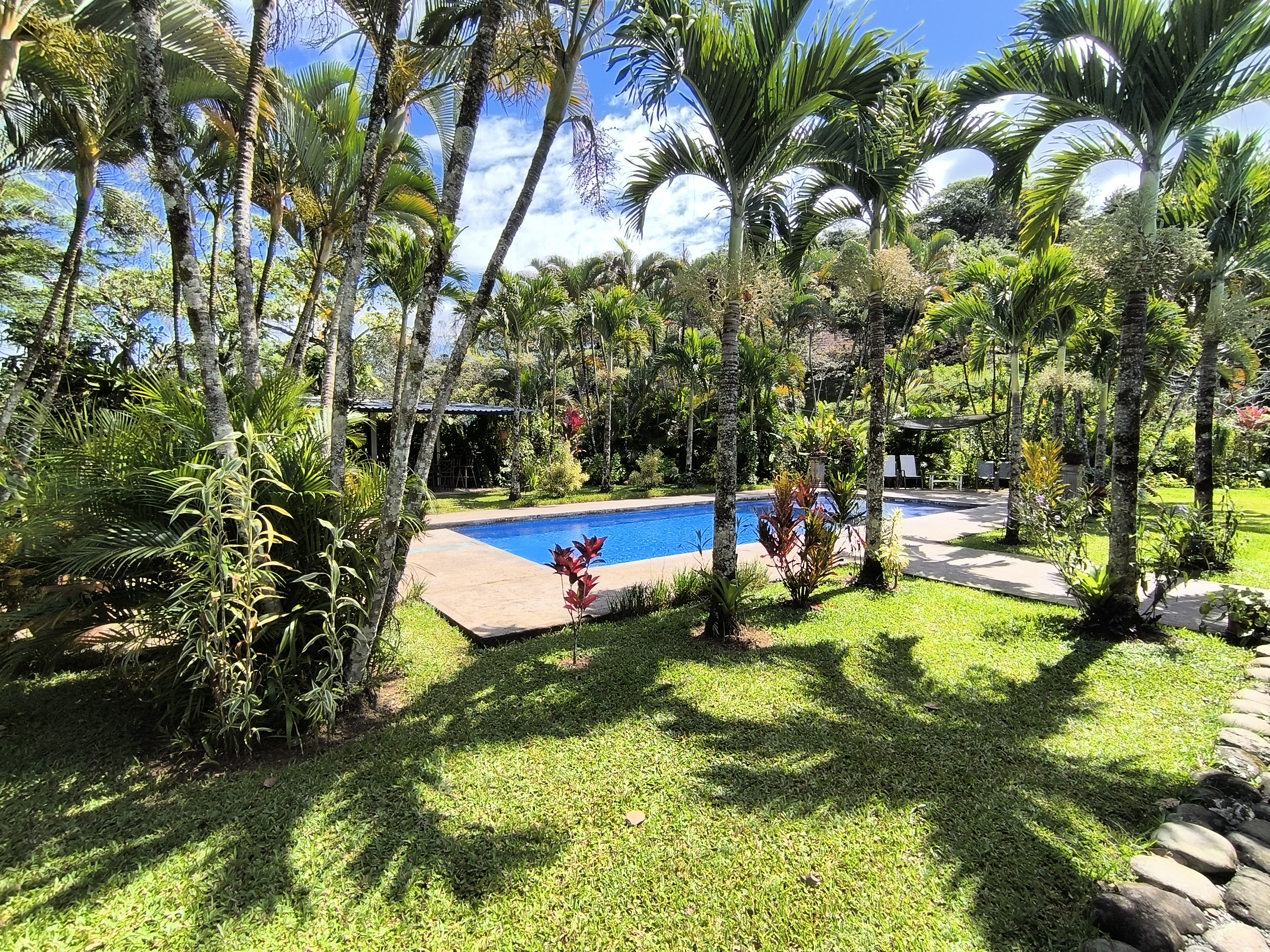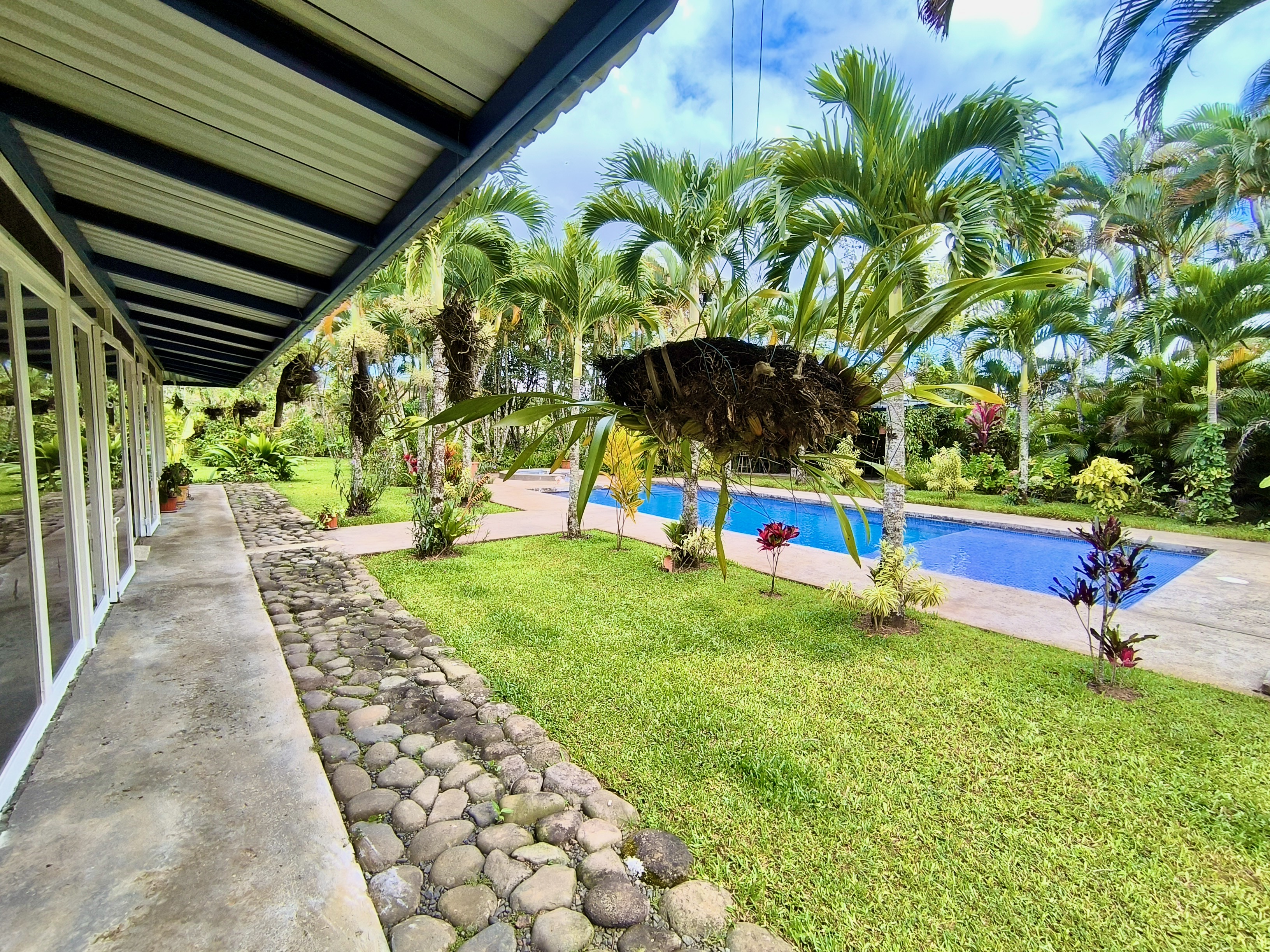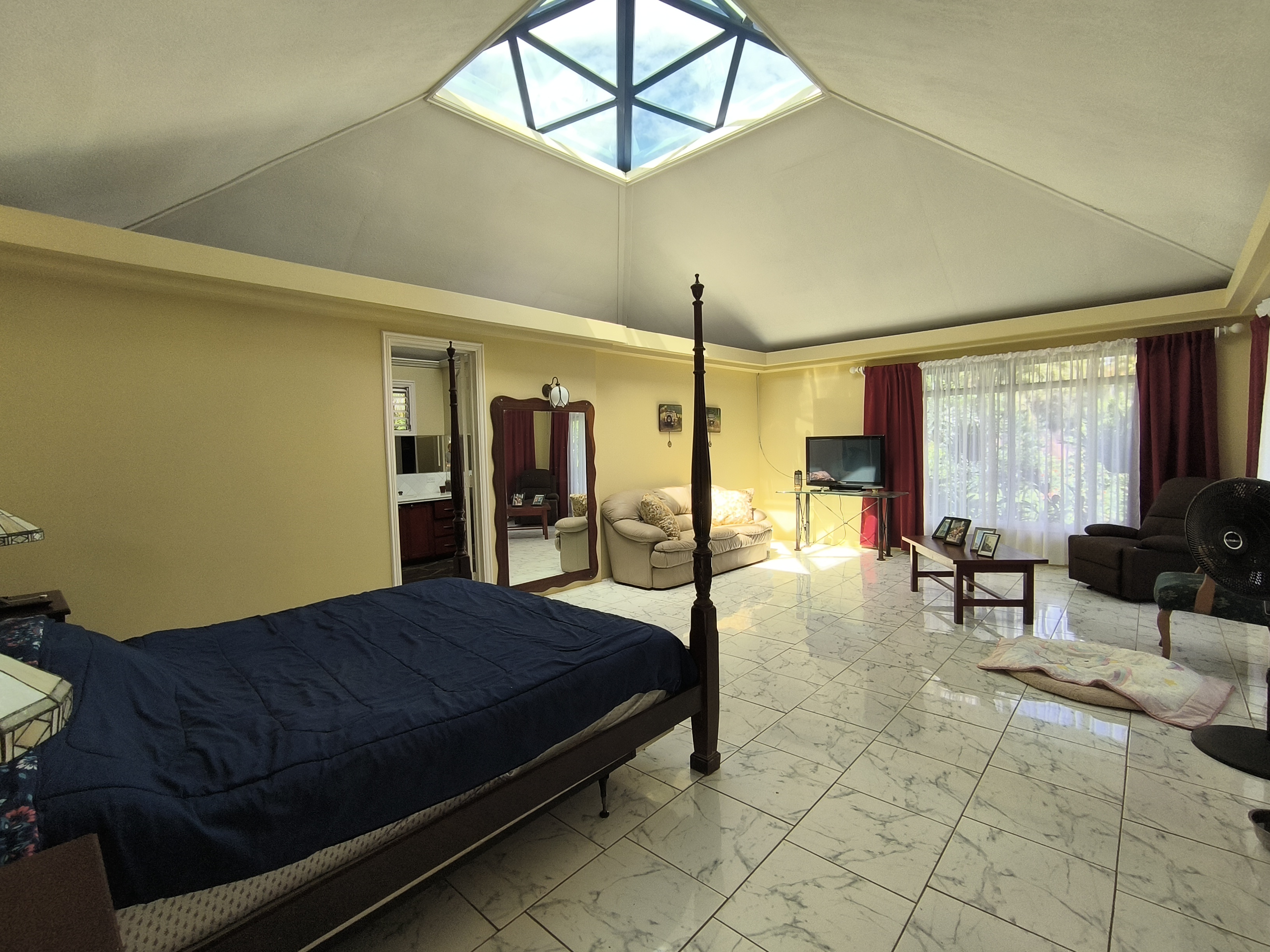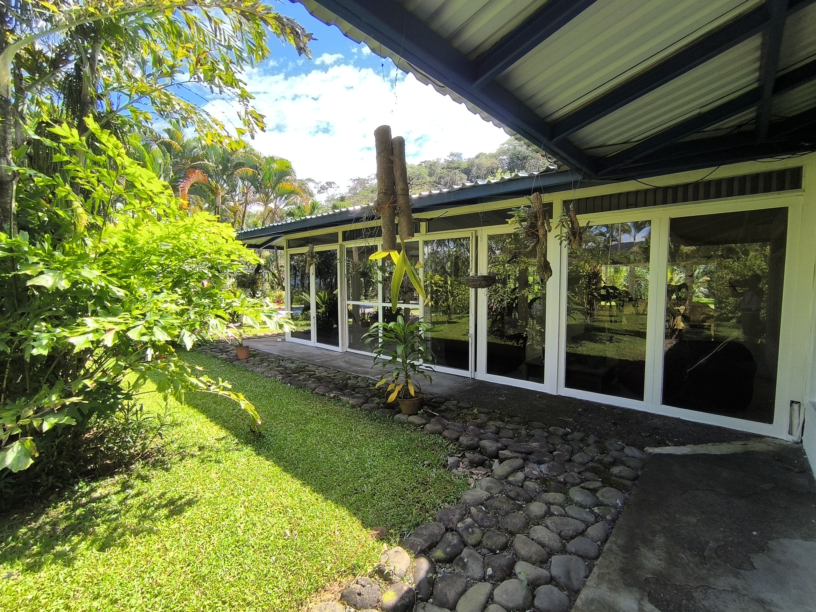 The main living area is bright and airy, featuring a skylight and large sliding glass doors. The master bedroom includes an en-suite bathroom and a walk-in closet, while two guest bedrooms on the opposite side of the house share a bathroom. Outdoor amenities include a large terrace overlooking an 11m x 5m swimming pool and a relaxing jacuzzi, as well as a 7,000 m² garden with lush greenery, fruit trees, and tropical plants. A covered carport accommodates three vehicles. The owner also offers the possibility of purchasing an adjacent property.