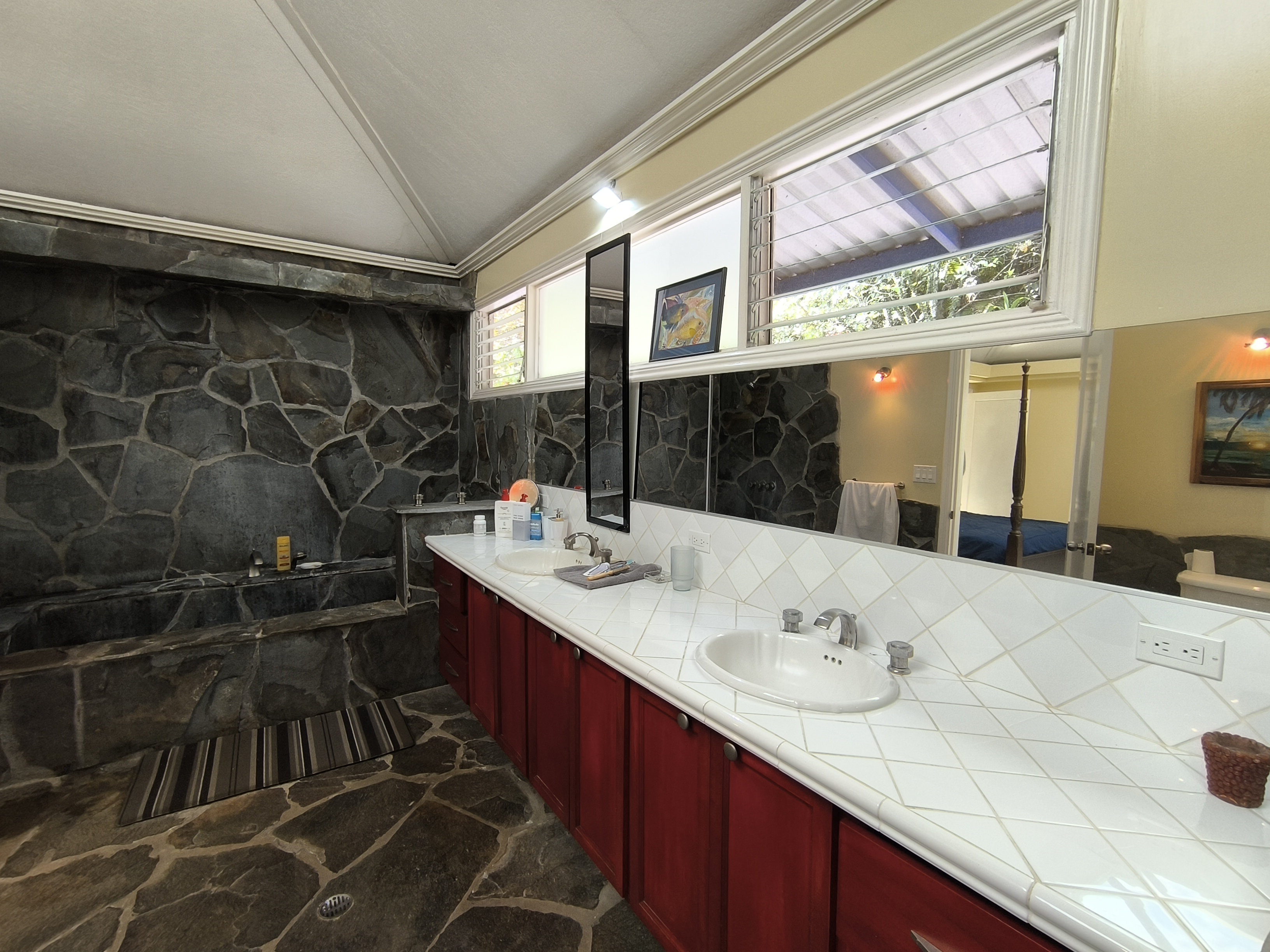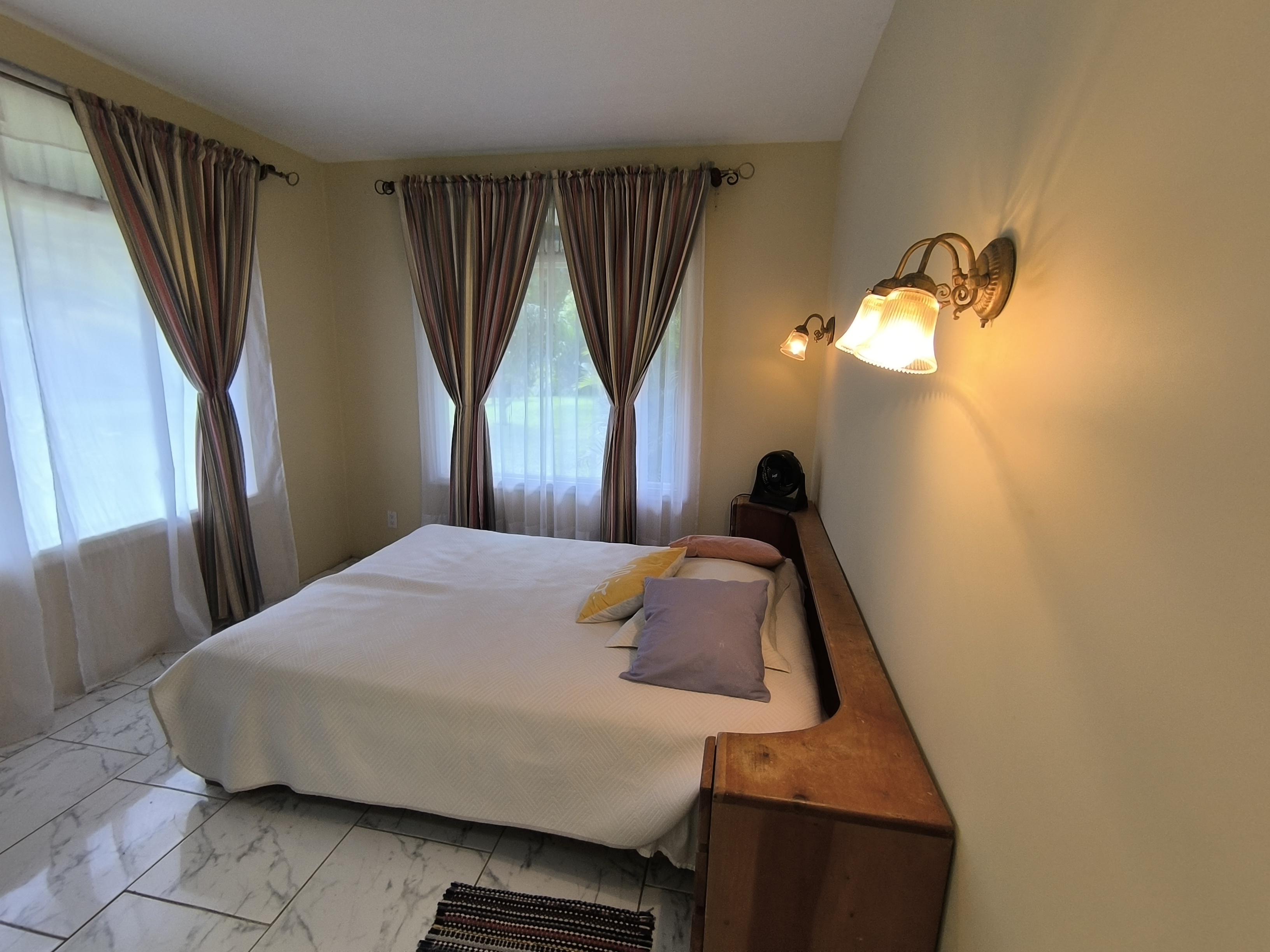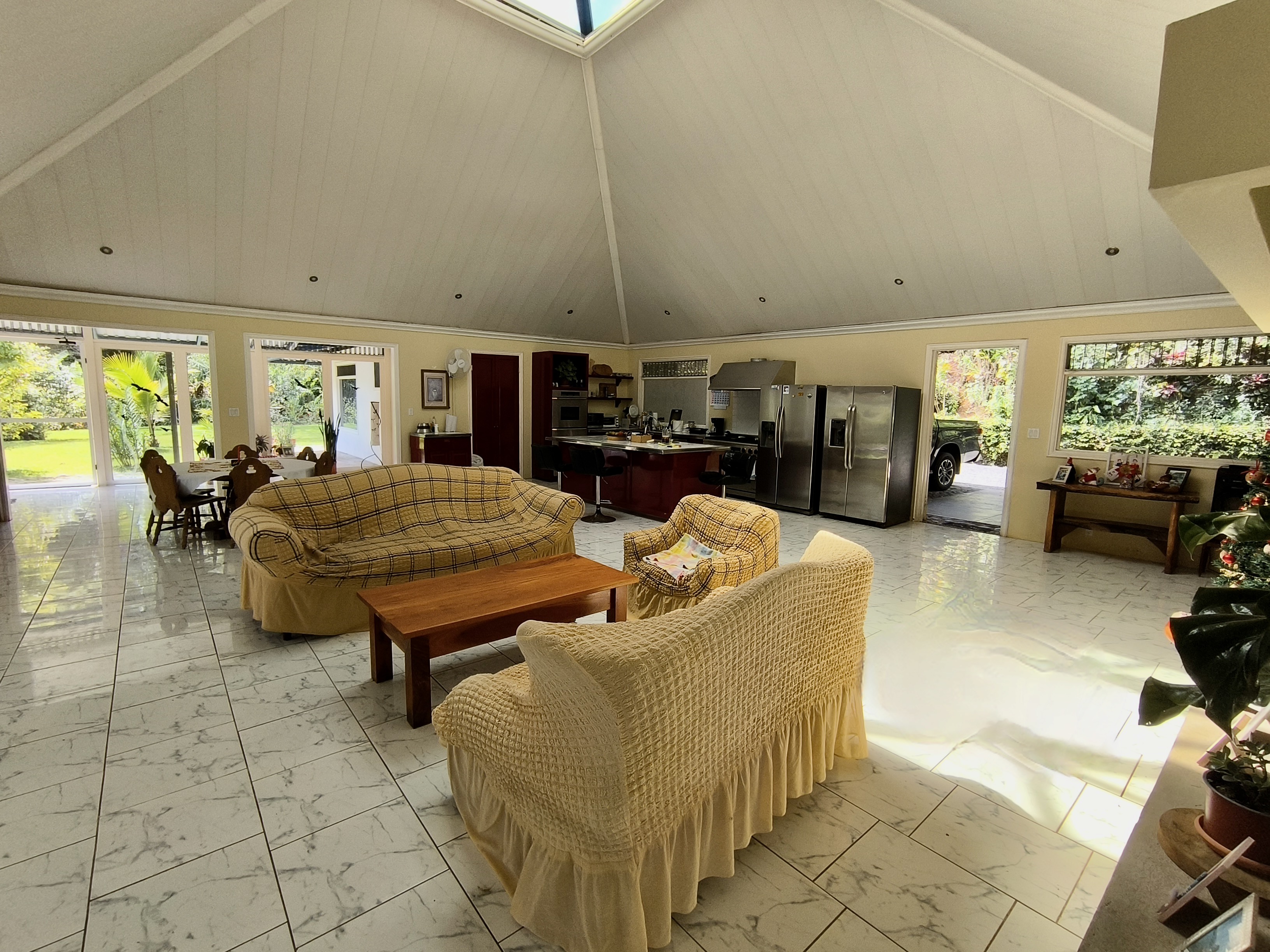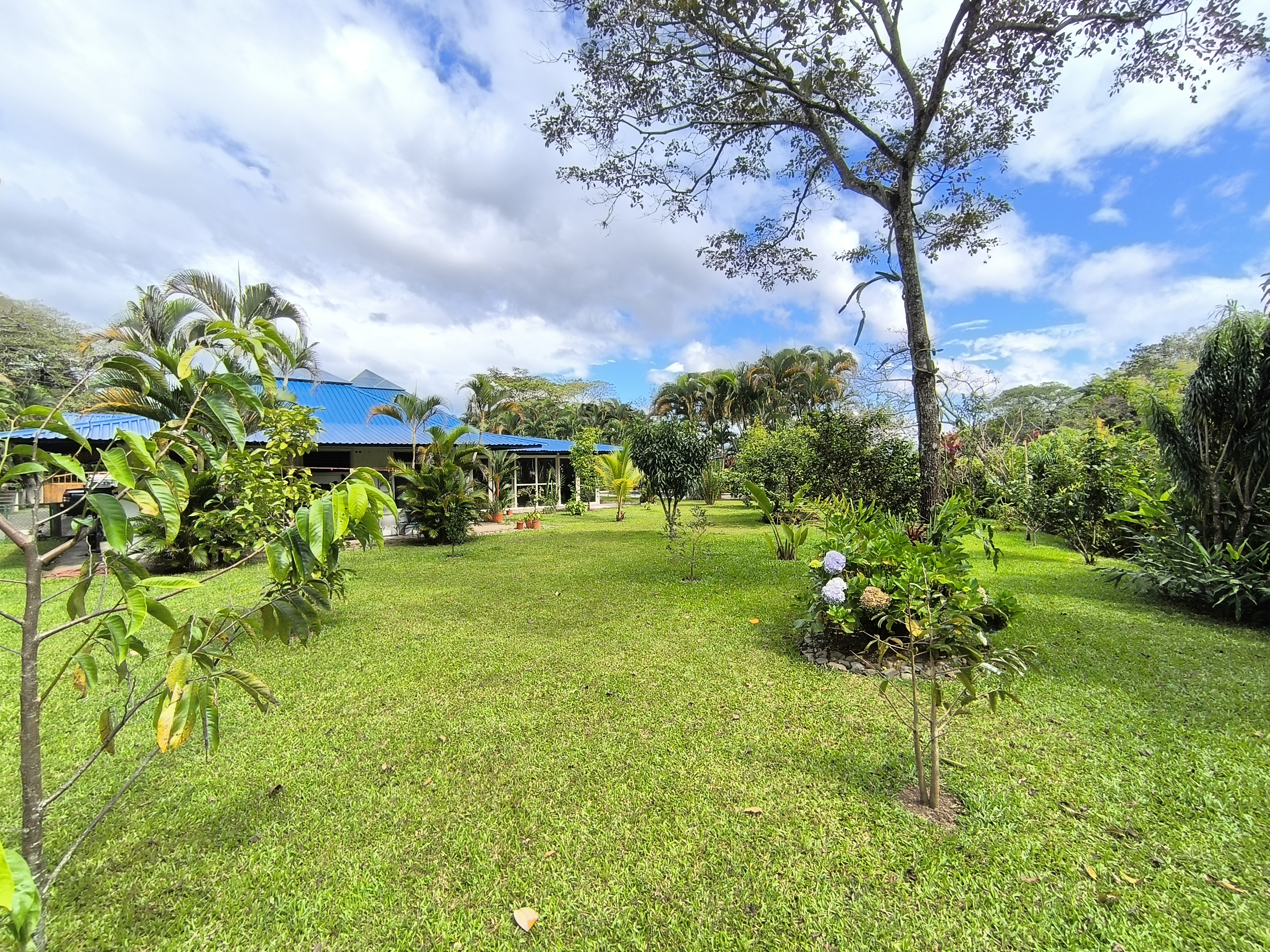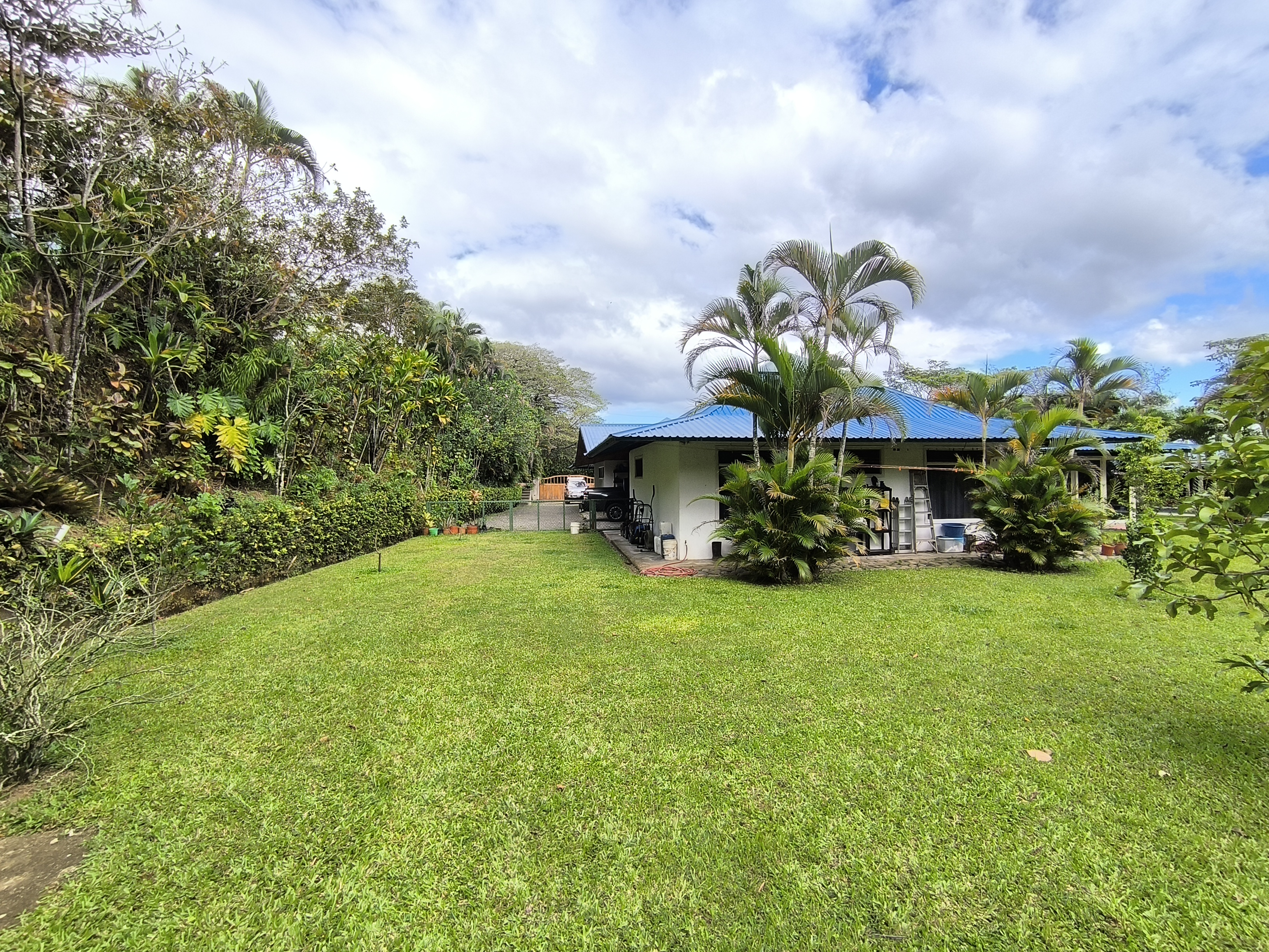 The main living area is bright and airy, featuring a skylight and large sliding glass doors. The master bedroom includes an en-suite bathroom and a walk-in closet, while two guest bedrooms on the opposite side of the house share a bathroom. Outdoor amenities include a large terrace overlooking an 11m x 5m swimming pool and a relaxing jacuzzi, as well as a 7,000 m² garden with lush greenery, fruit trees, and tropical plants. A covered carport accommodates three vehicles. The owner also offers the possibility of purchasing an adjacent property.