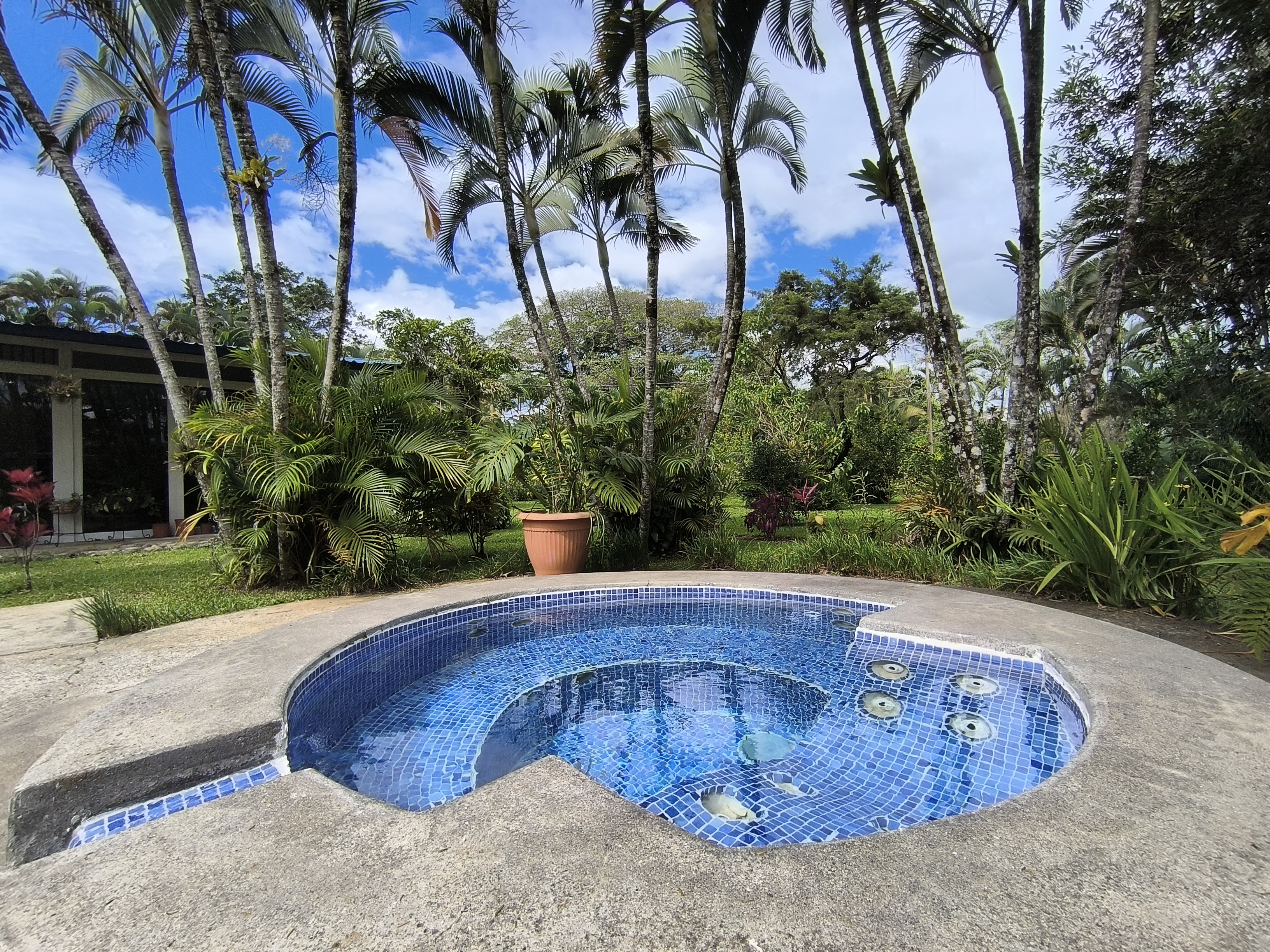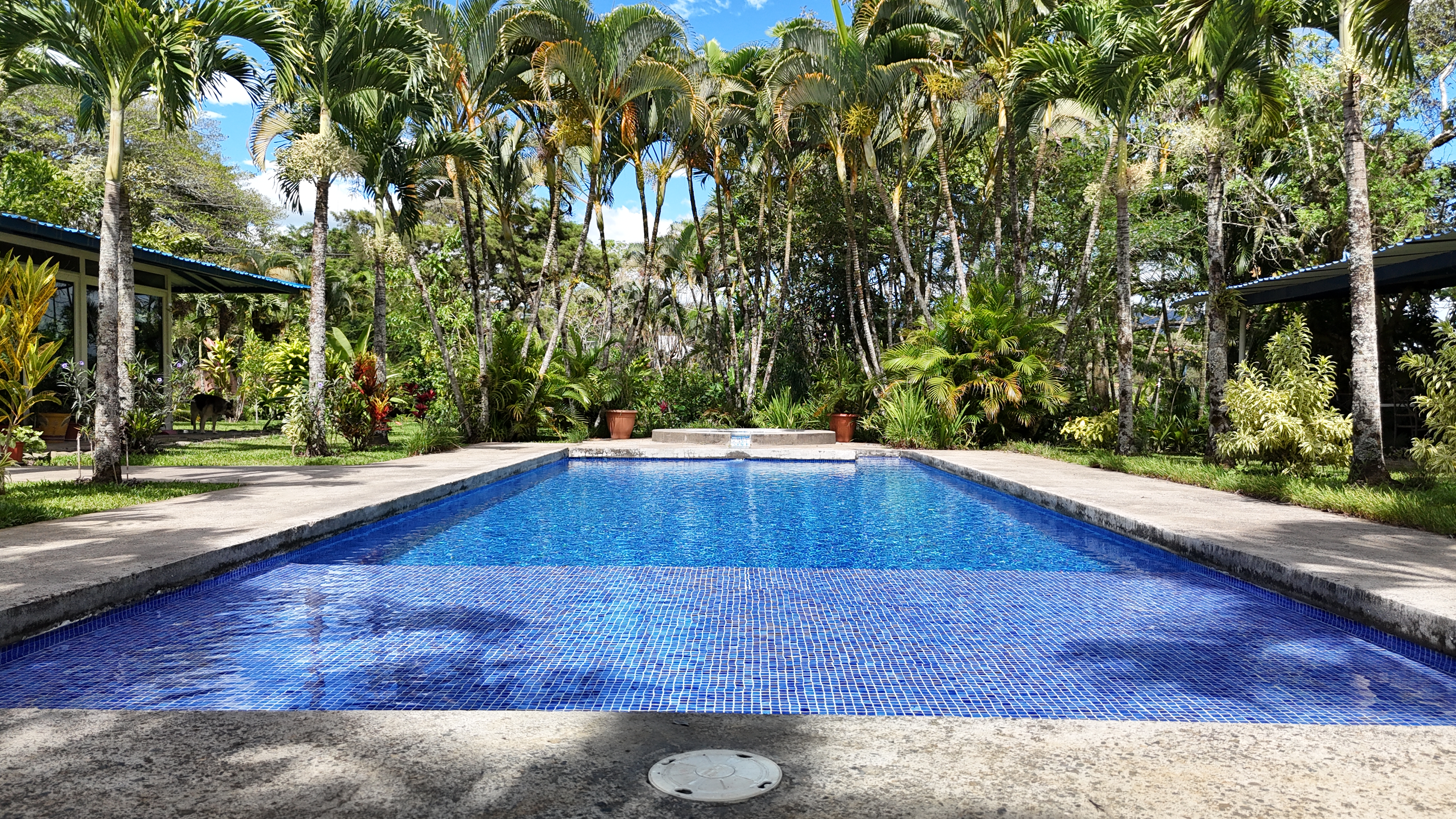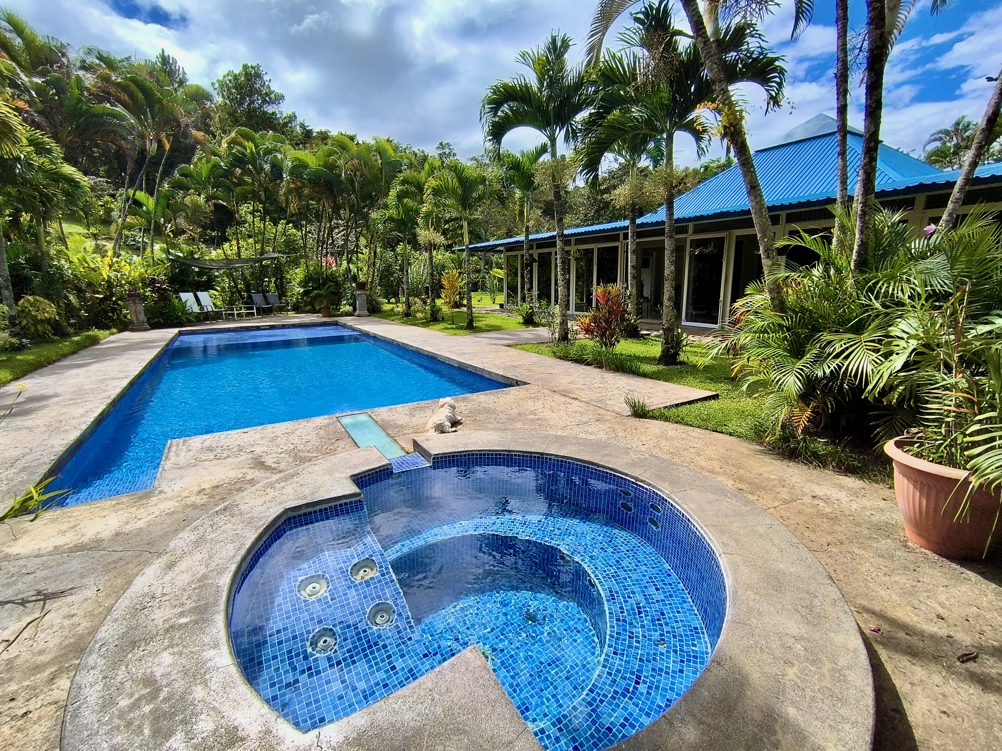 Property Features: • Single-story house in a private community of six homes • Master bedroom with en-suite bathroom and walk-in closet • Two guest bedrooms sharing one bathroom • Spacious open-plan living area with skylight and large sliding doors • Expansive terrace with views of the swimming pool and jacuzzi • 11m x 5m swimming pool and jacuzzi • 7,000 m² landscaped garden with fruit trees and tropical plants • Covered carport for three vehicles • Option to purchase adjacent property