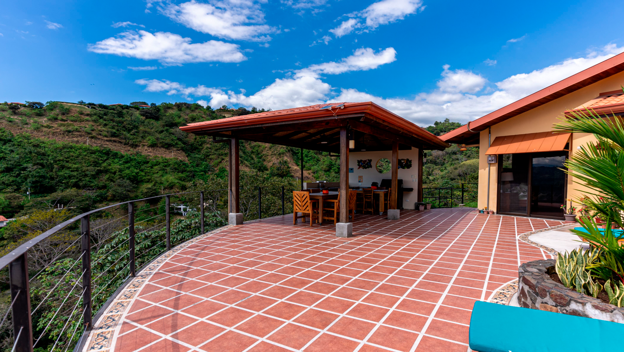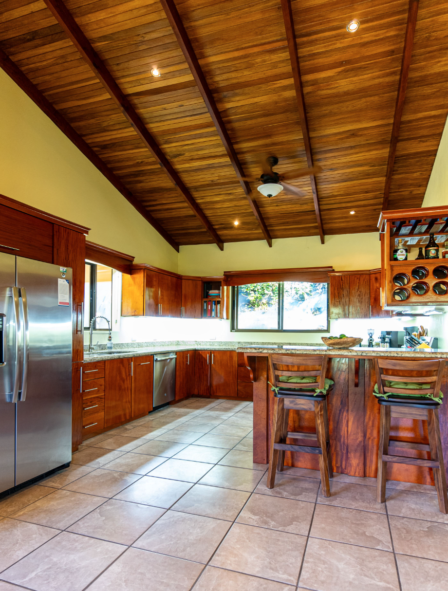 The outdoor living spaces are a true highlight, showcasing stunning views and a large, covered terrace that flows into a rancho-style BBQ area, perfect for hosting gatherings. Adjacent to this space is a sparkling pool area, ideal for relaxing or entertaining. Additional outdoor seating along the west side of the house offers even more opportunities for al fresco living. At the front of the property, you’ll find a two-car carport and a separate storage structure with abundant space. The home is surrounded by lush tropical landscaping, creating a serene and private environment—all just 7 minutes from the town center.