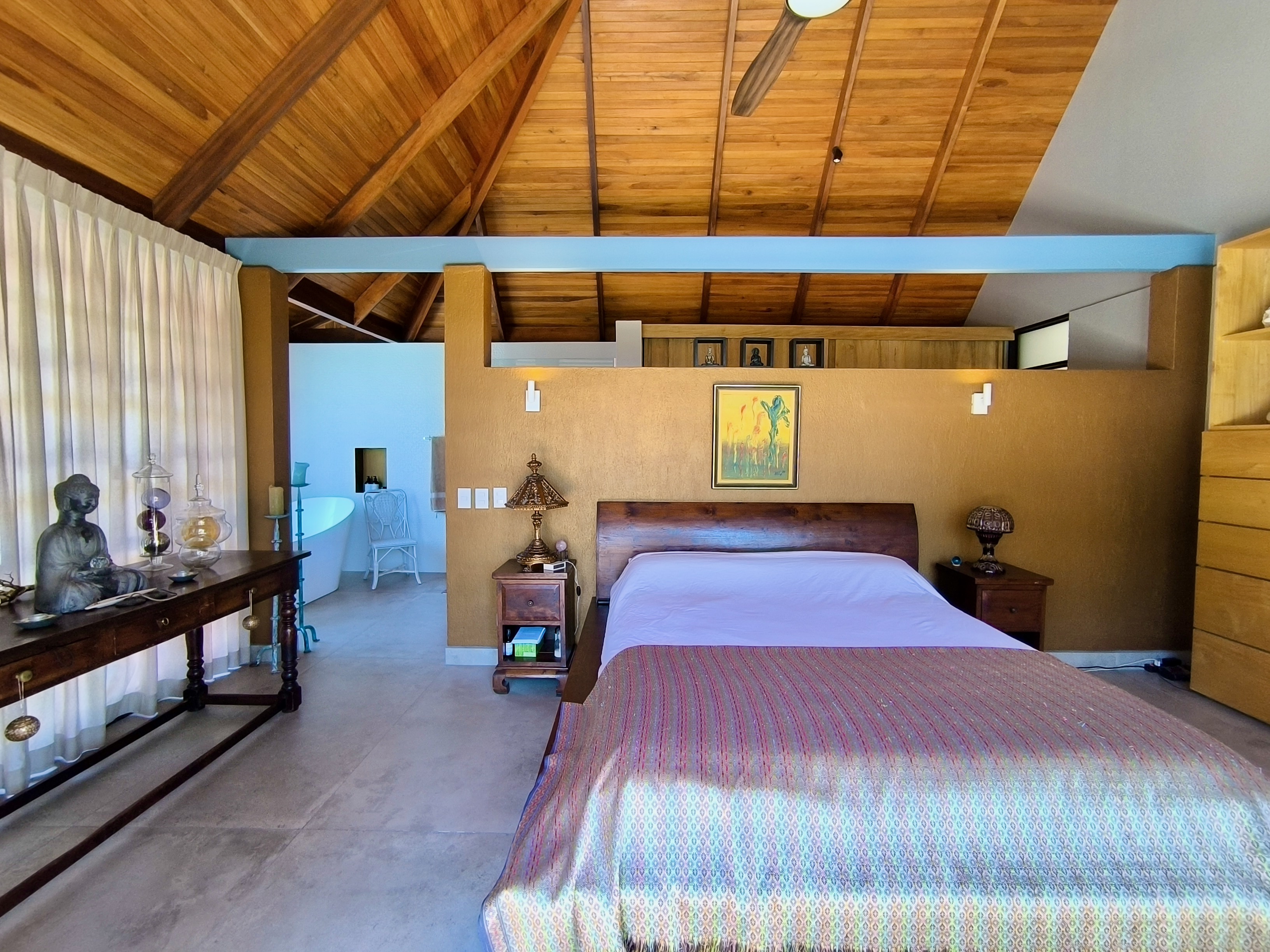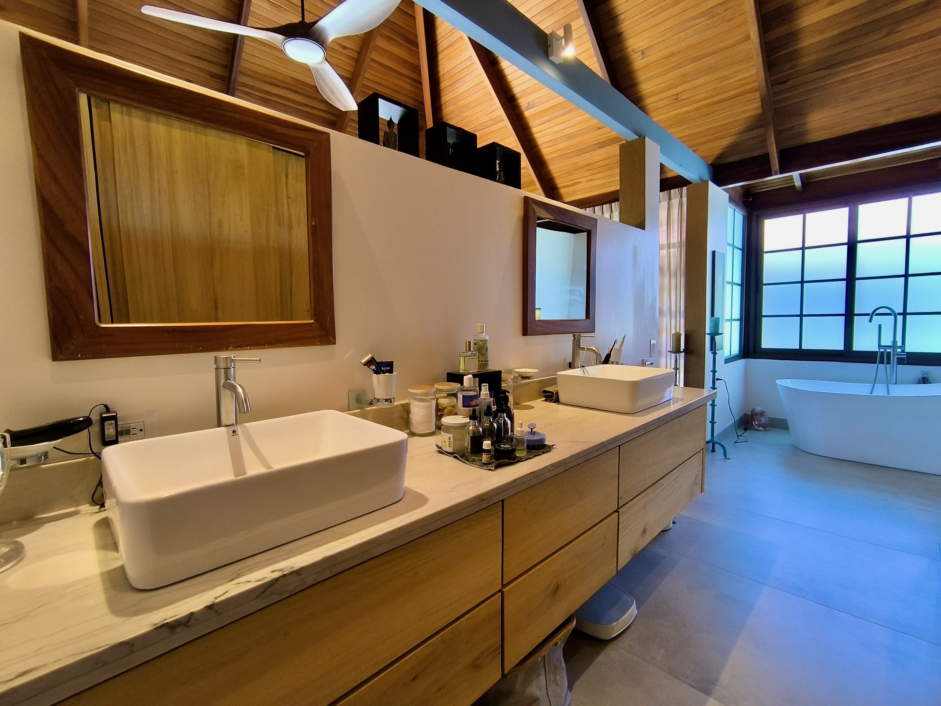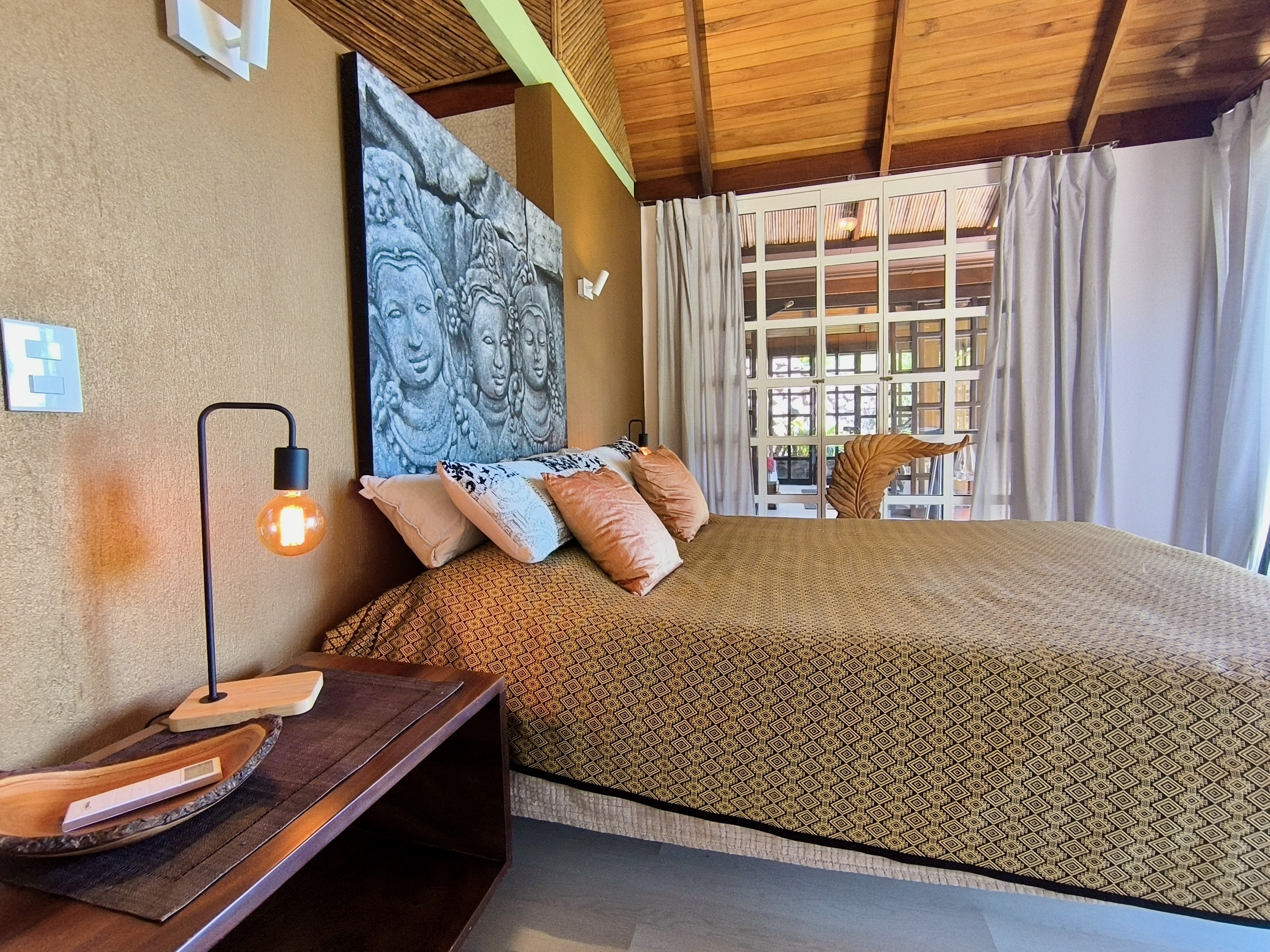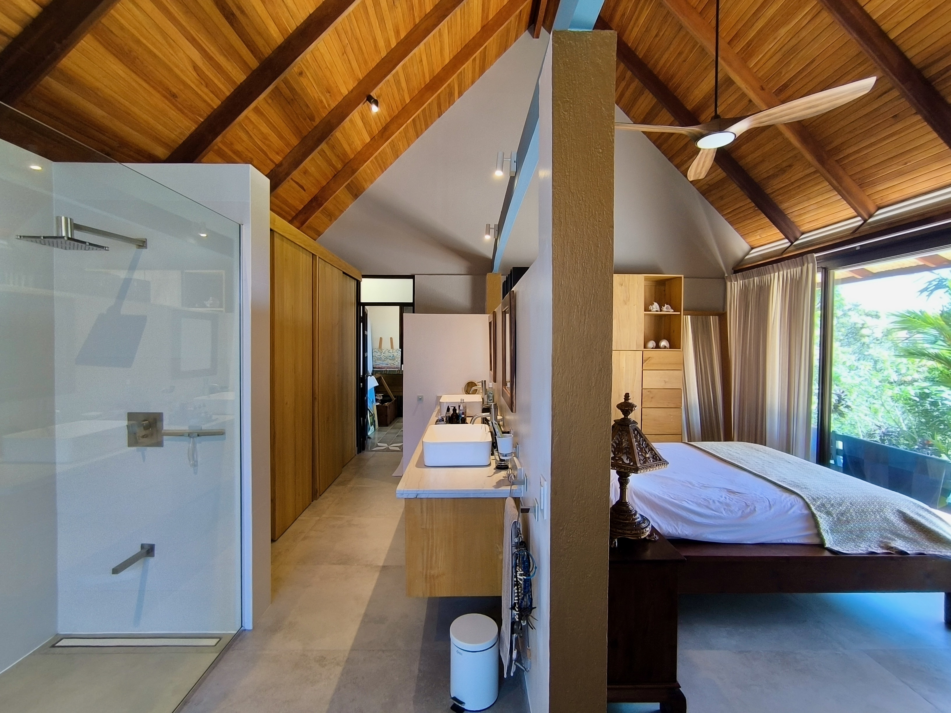 This extraordinary property blends Balinese elegance with Costa Rican beauty, offering distinct living spaces across multiple pavilions. The main pavilion features an open-plan kitchen, dining, and lounge with soaring exotic wood ceilings and floor-to-ceiling glass walls that merge the home with its lush tropical gardens.
