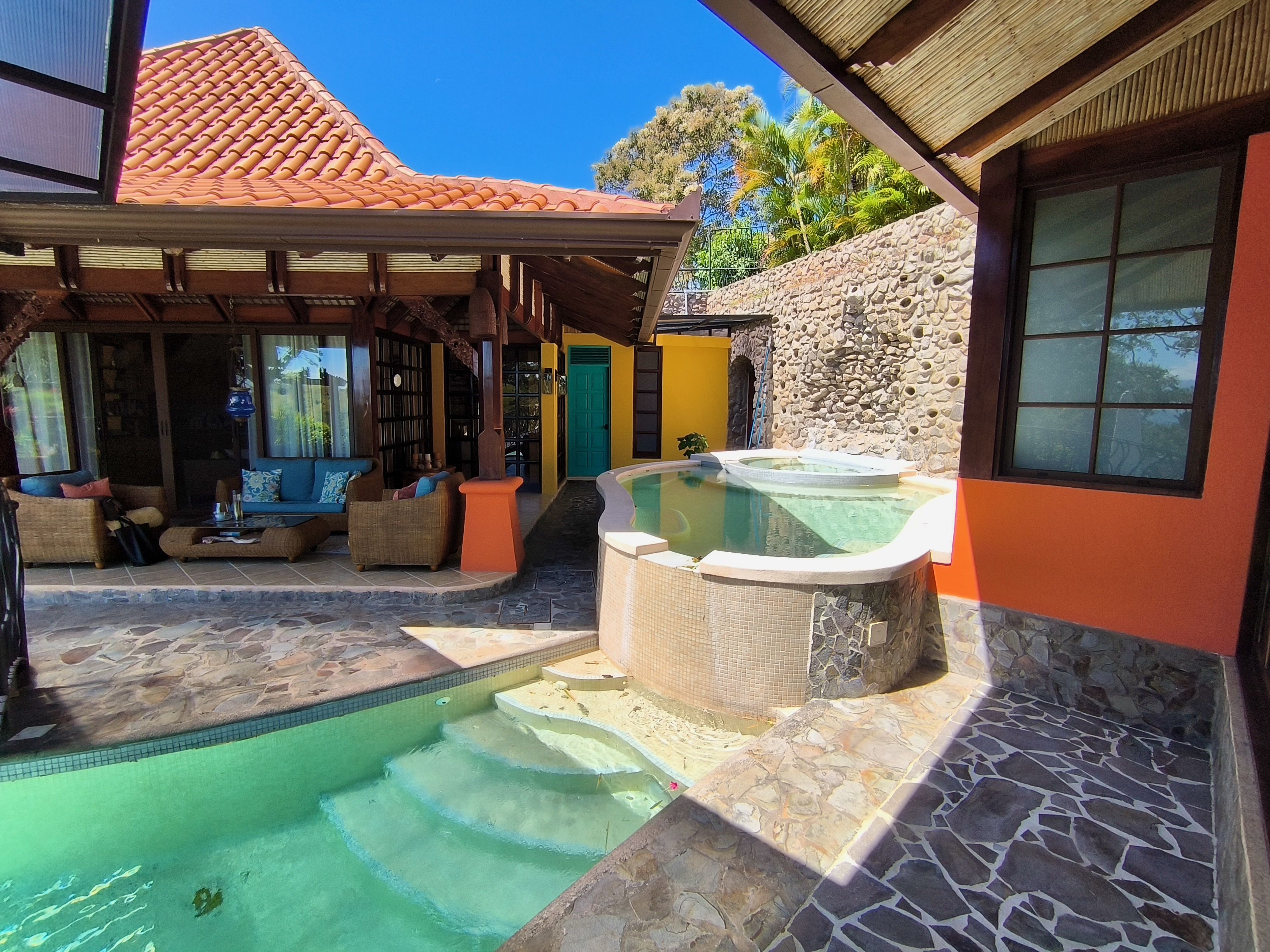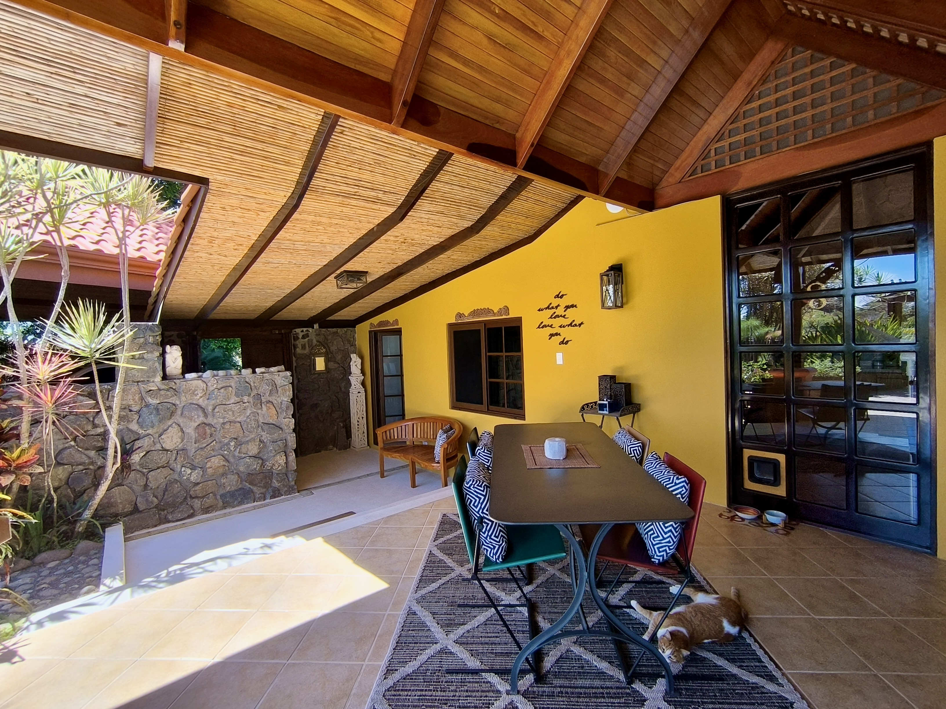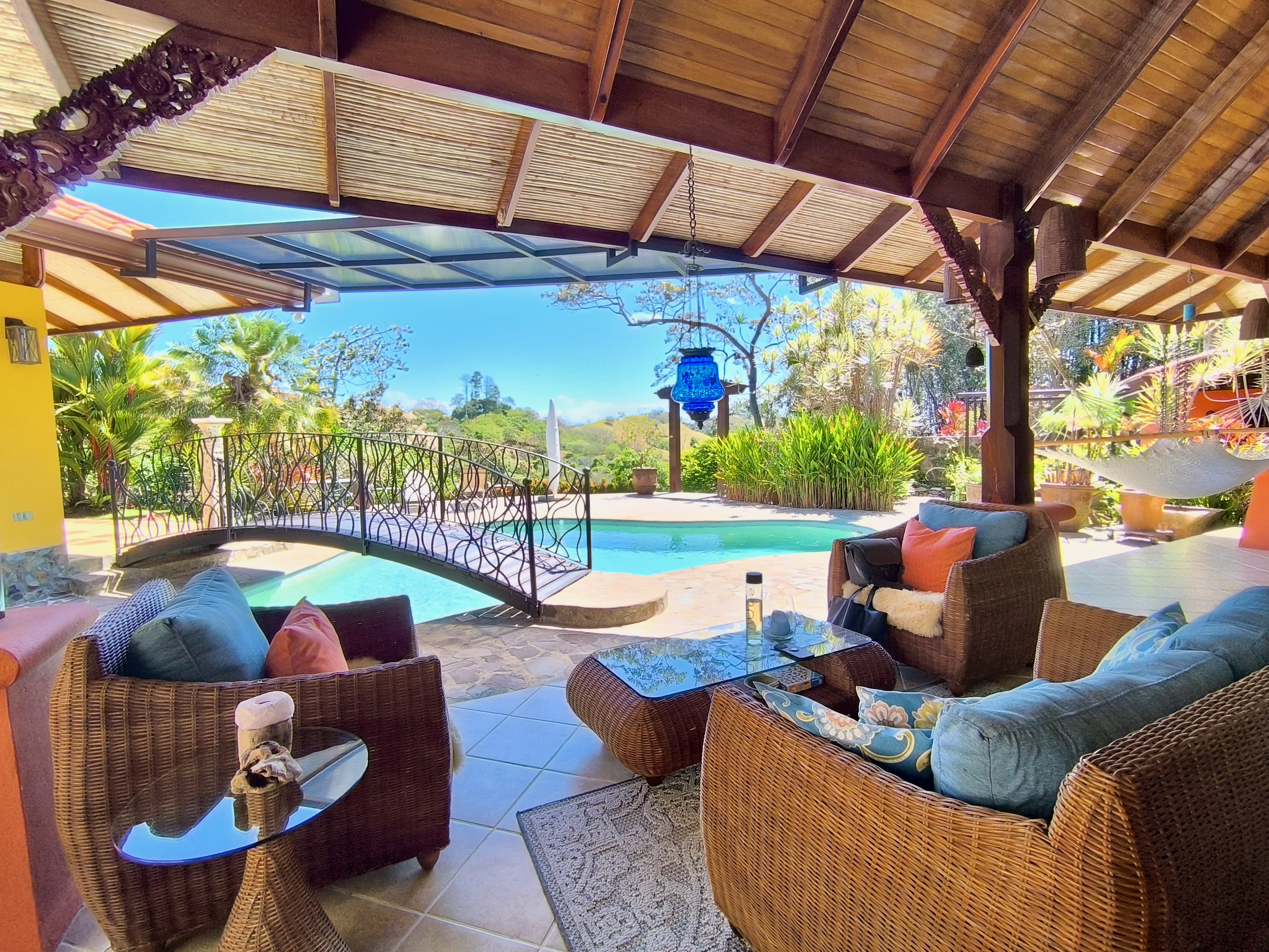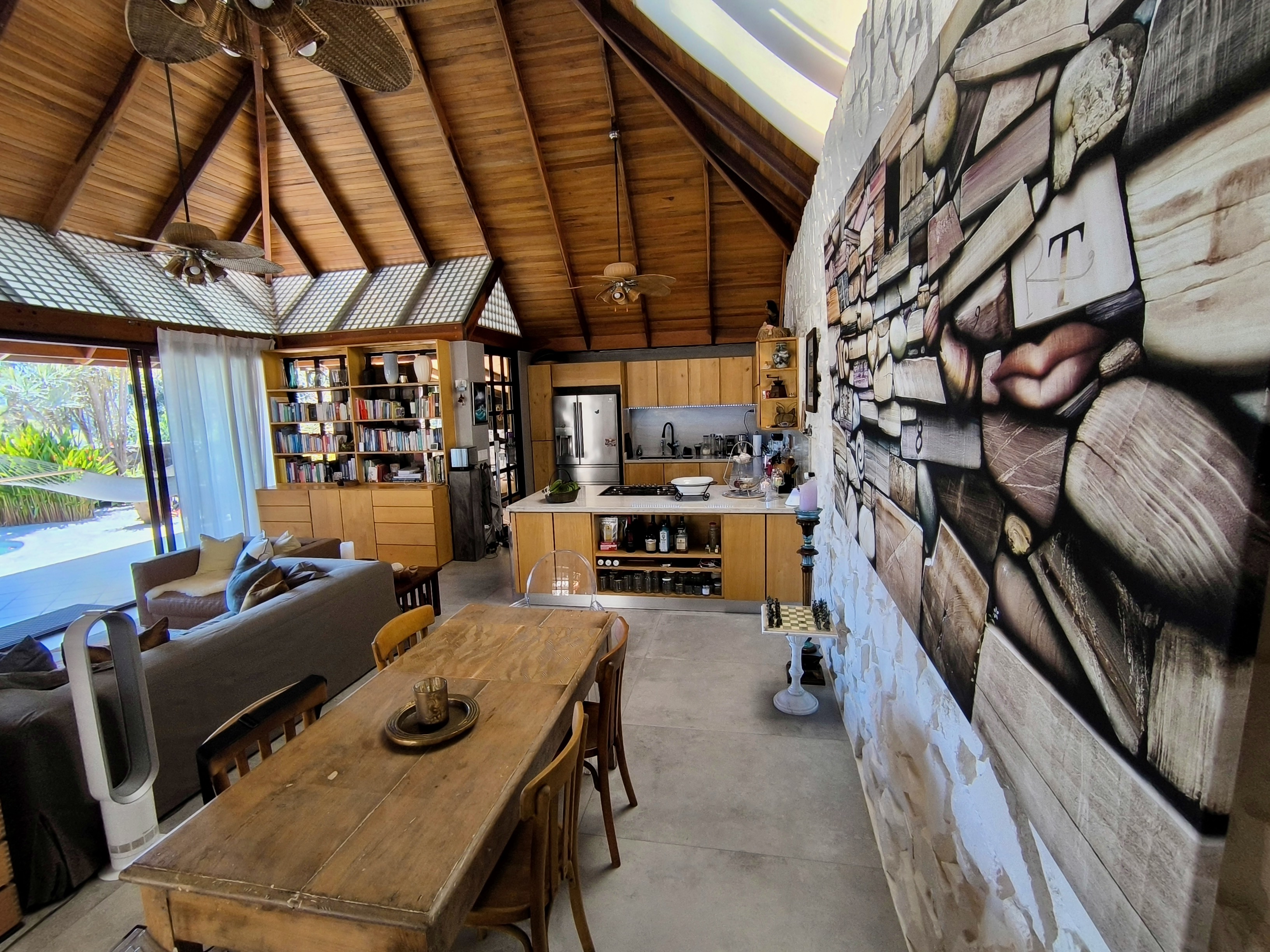 This extraordinary property blends Balinese elegance with Costa Rican beauty, offering distinct living spaces across multiple pavilions. The main pavilion features an open-plan kitchen, dining, and lounge with soaring exotic wood ceilings and floor-to-ceiling glass walls that merge the home with its lush tropical gardens.