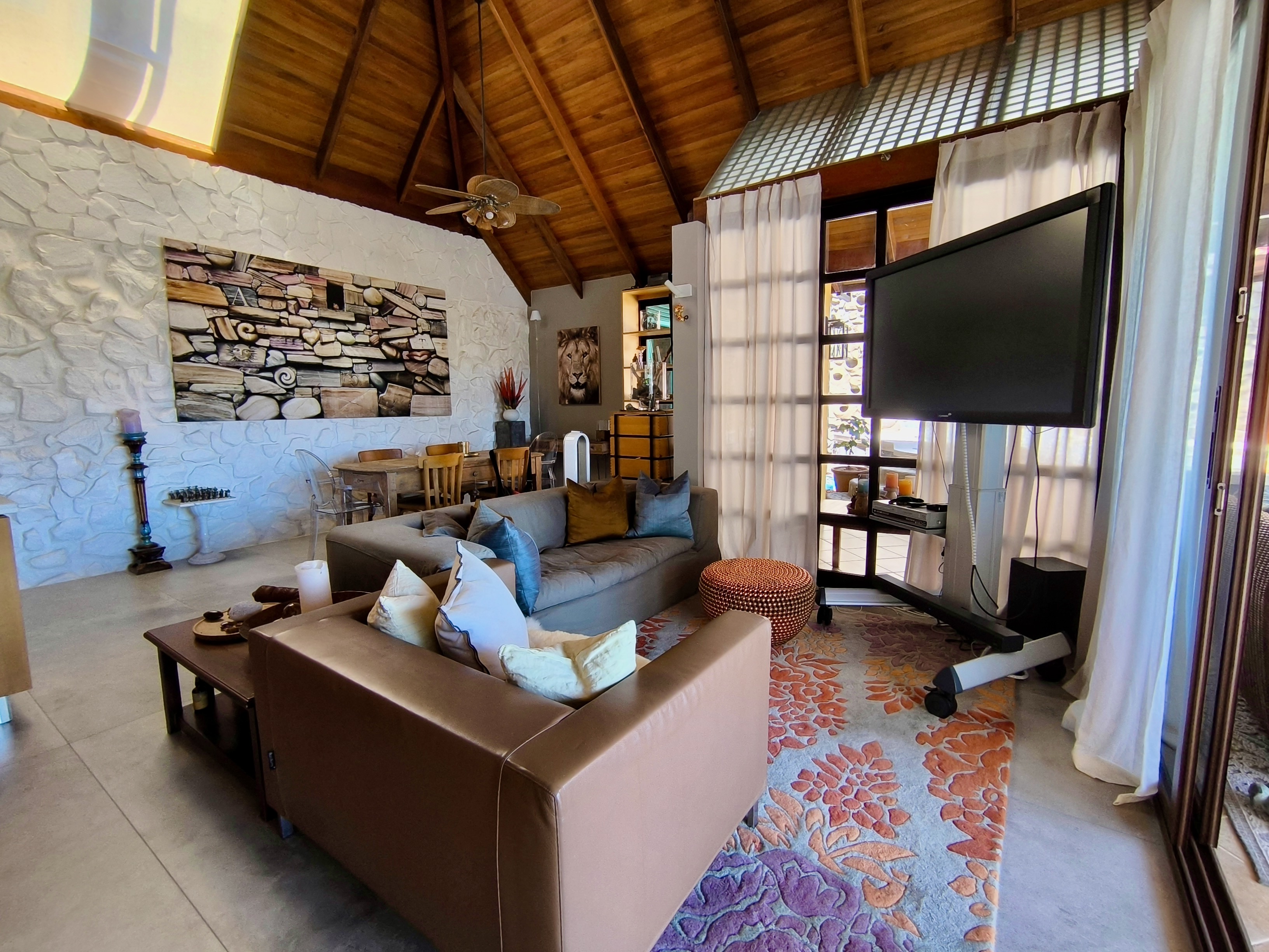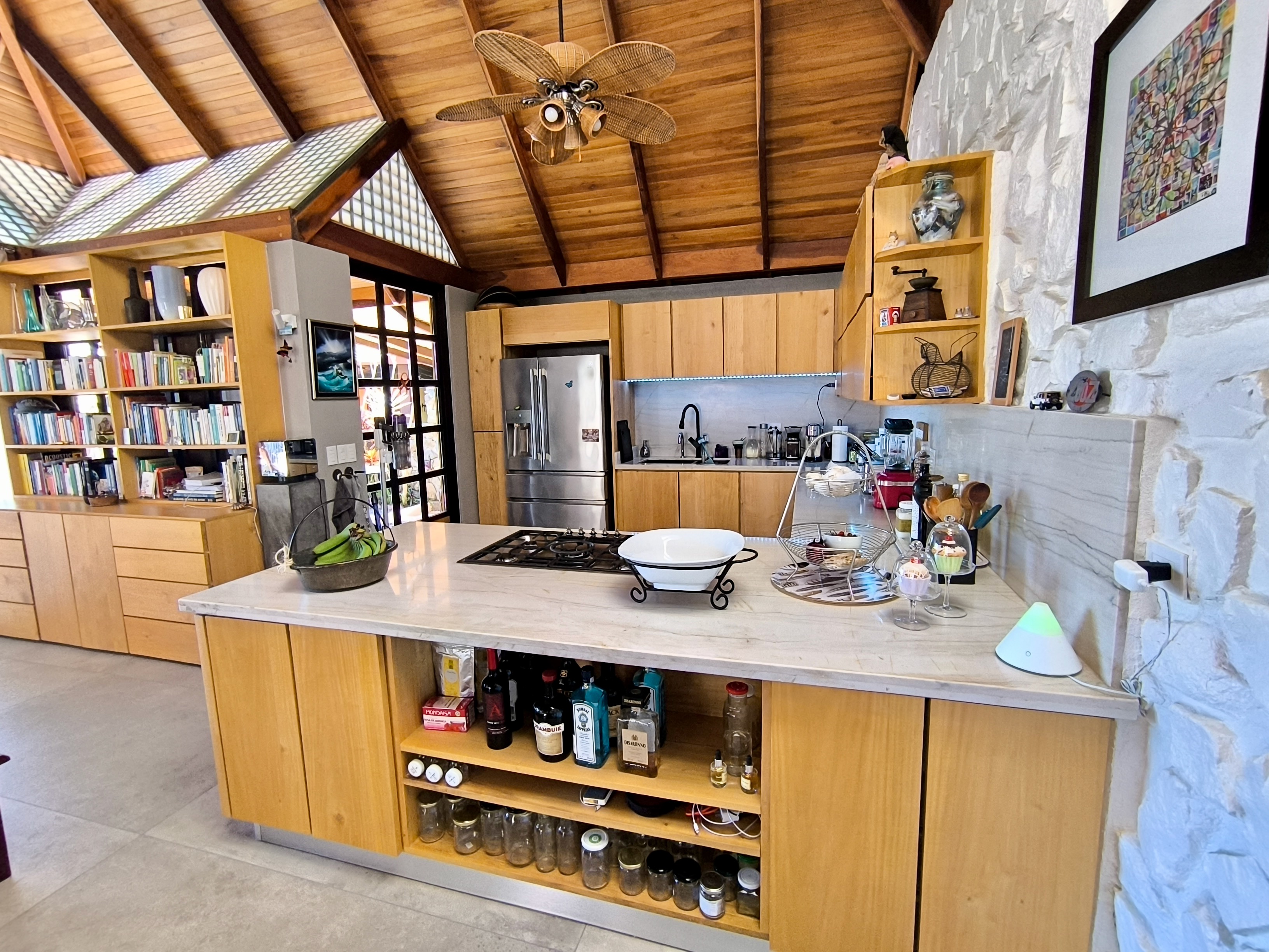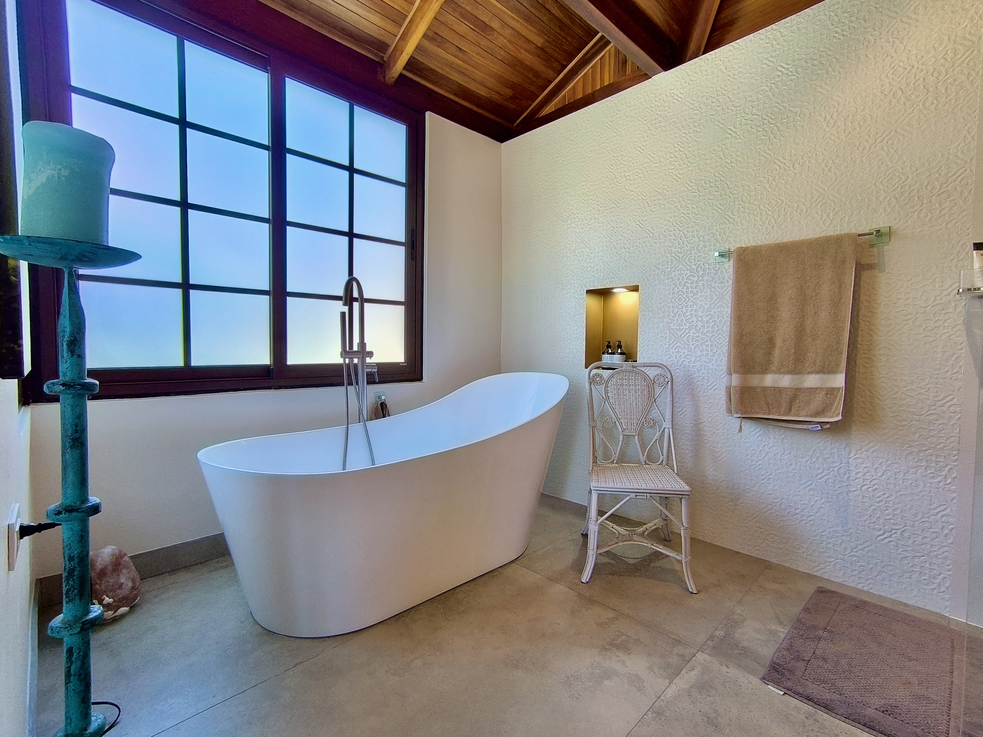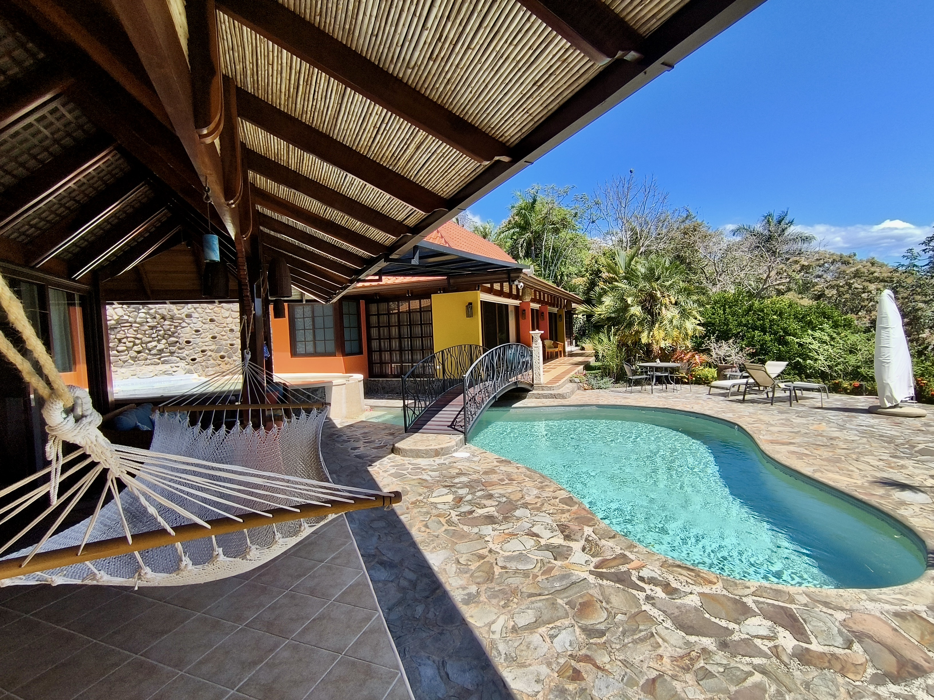 This extraordinary property blends Balinese elegance with Costa Rican beauty, offering distinct living spaces across multiple pavilions. The main pavilion features an open-plan kitchen, dining, and lounge with soaring exotic wood ceilings and floor-to-ceiling glass walls that merge the home with its lush tropical gardens.