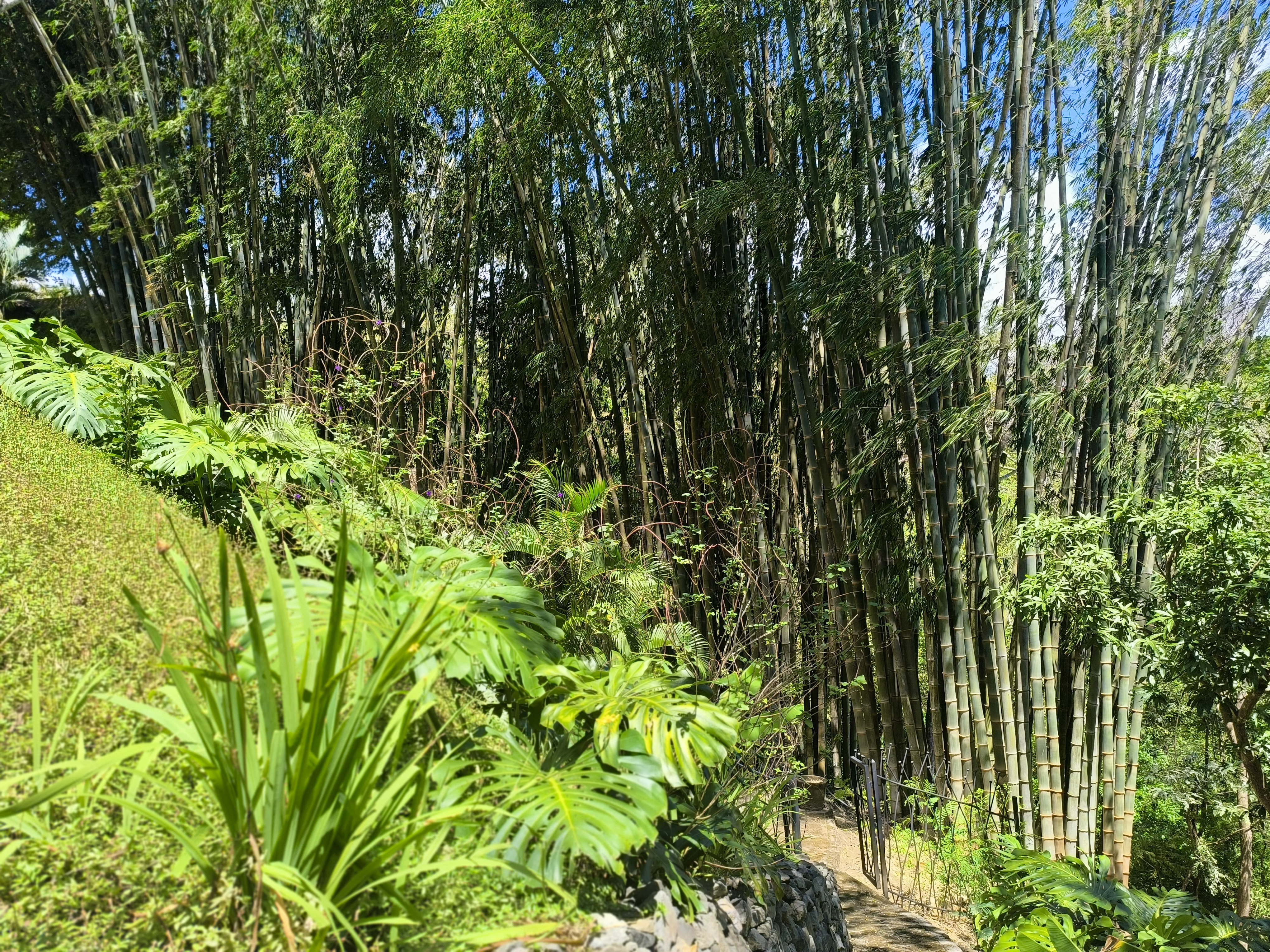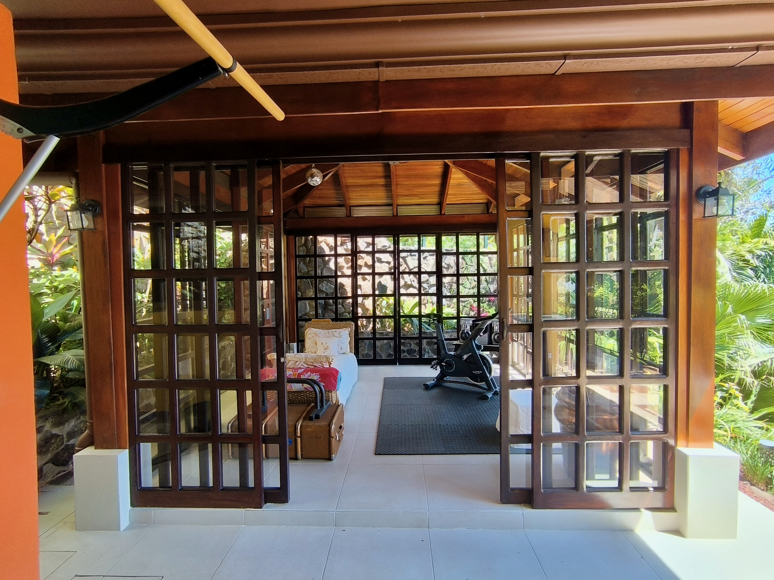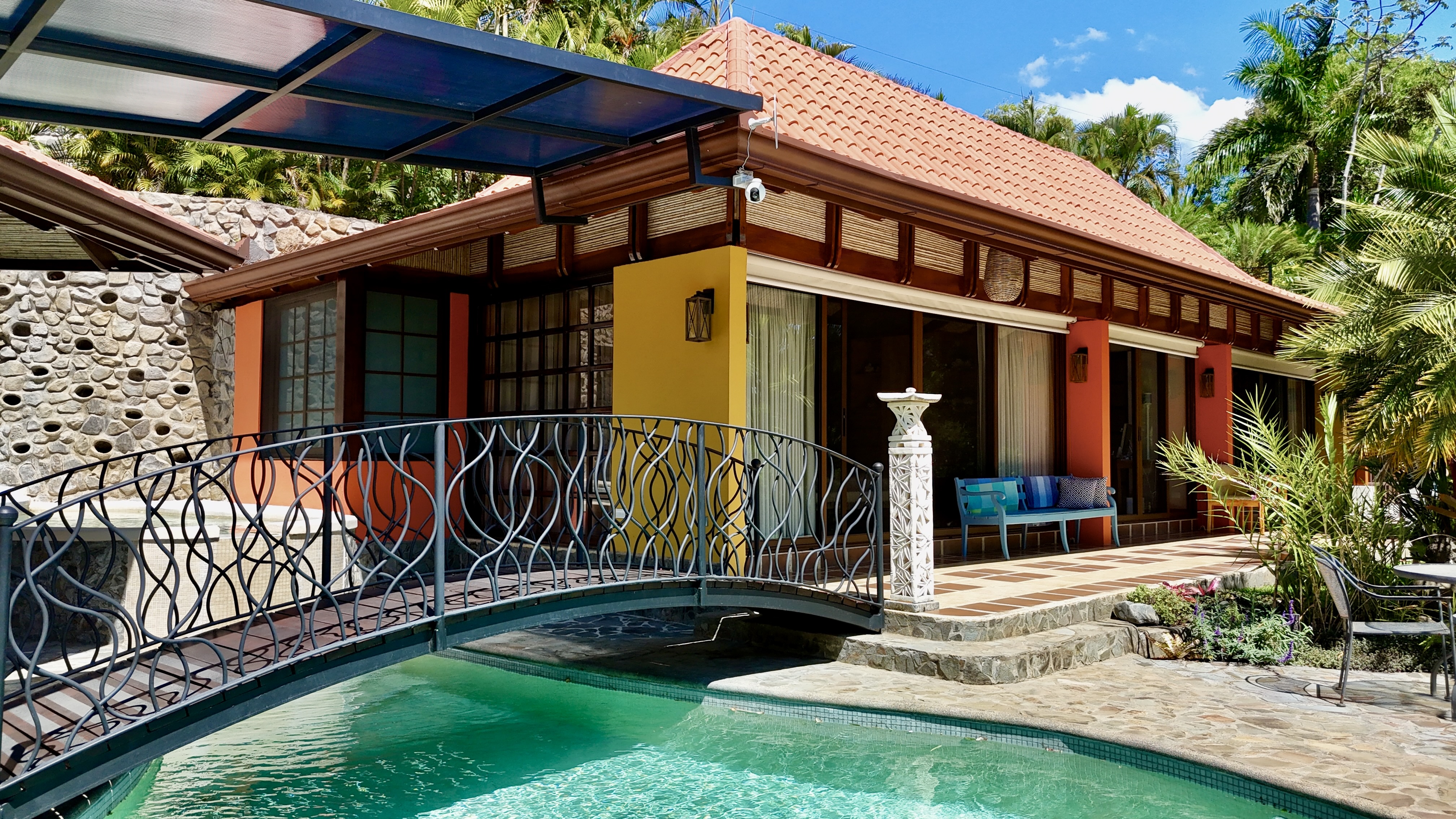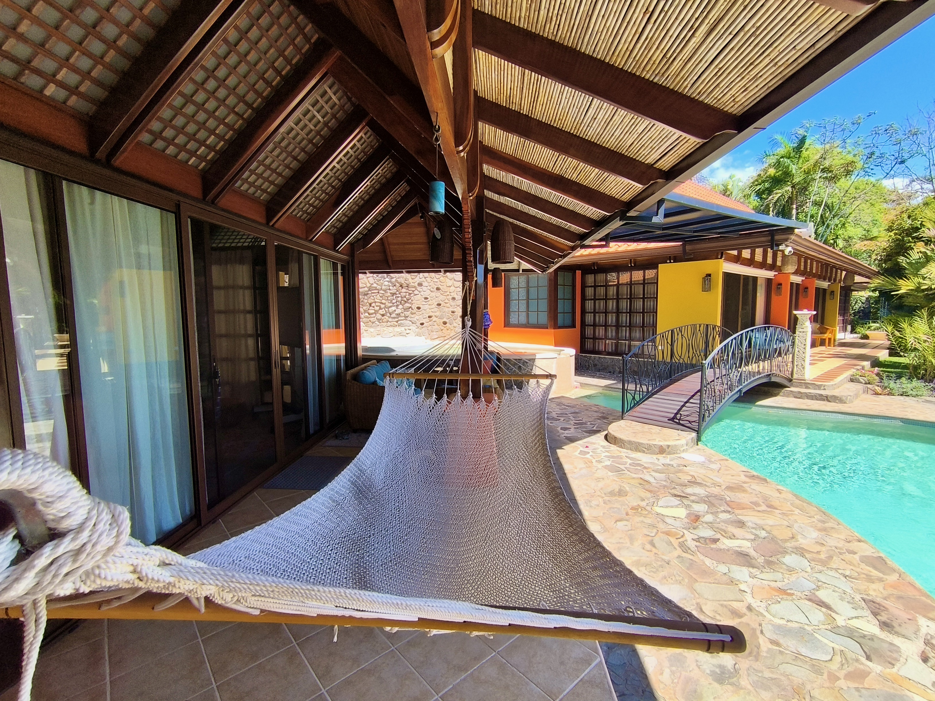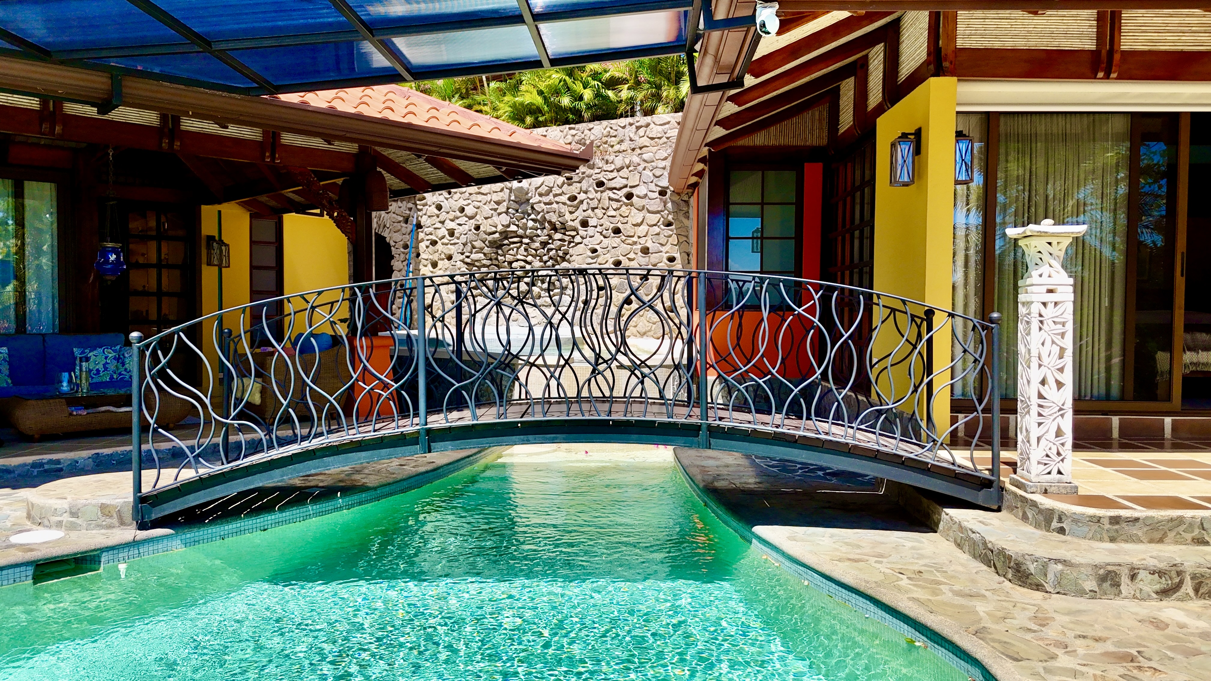 Outdoors, a pool with water features, a graceful iron bridge, textured stone walls, and tropical landscaping create an enchanting environment. Trails lead to a coffee plantation and a bamboo grove where the sound of towering bamboo swaying in the wind creates an unforgettable experience.
