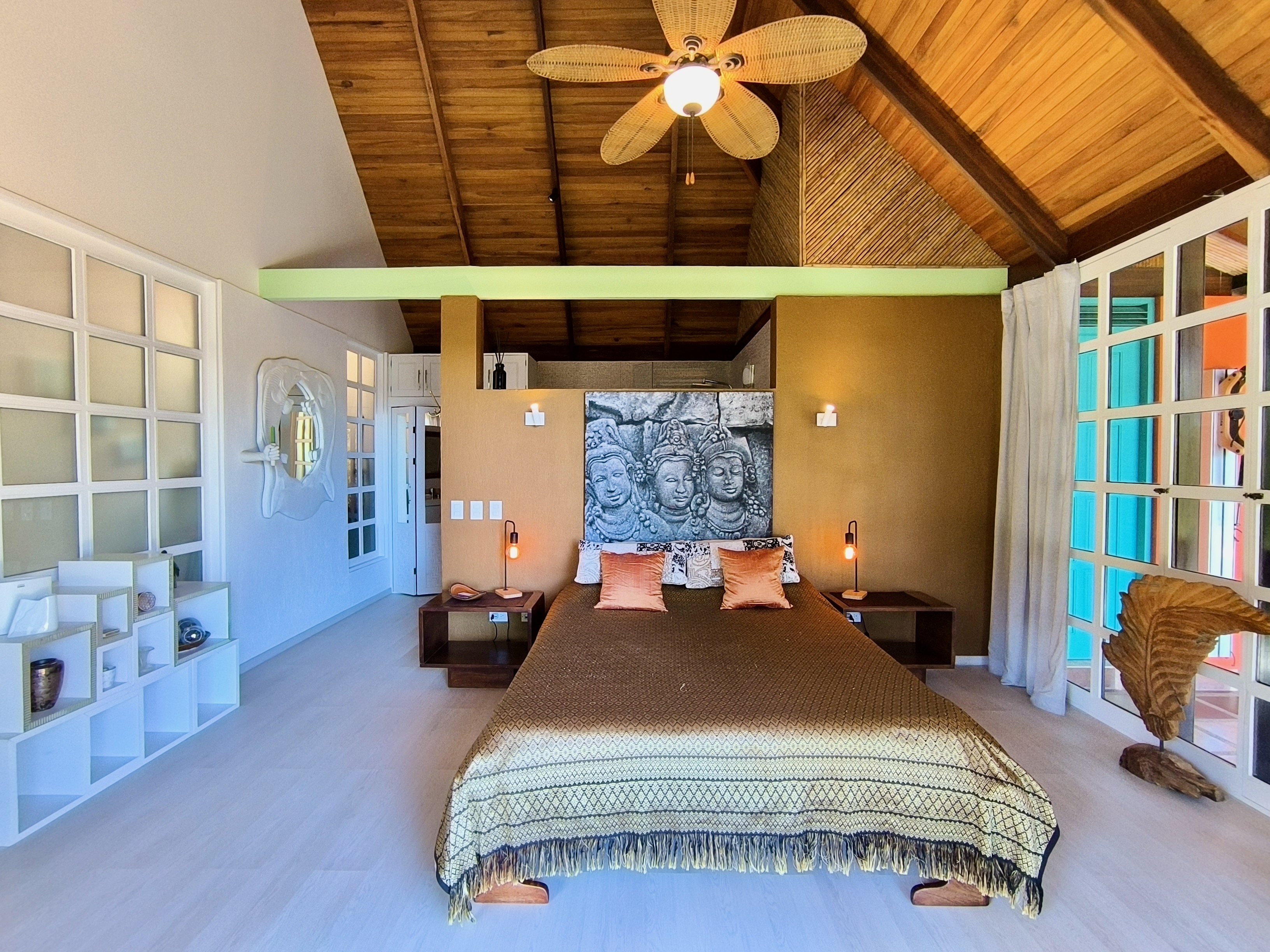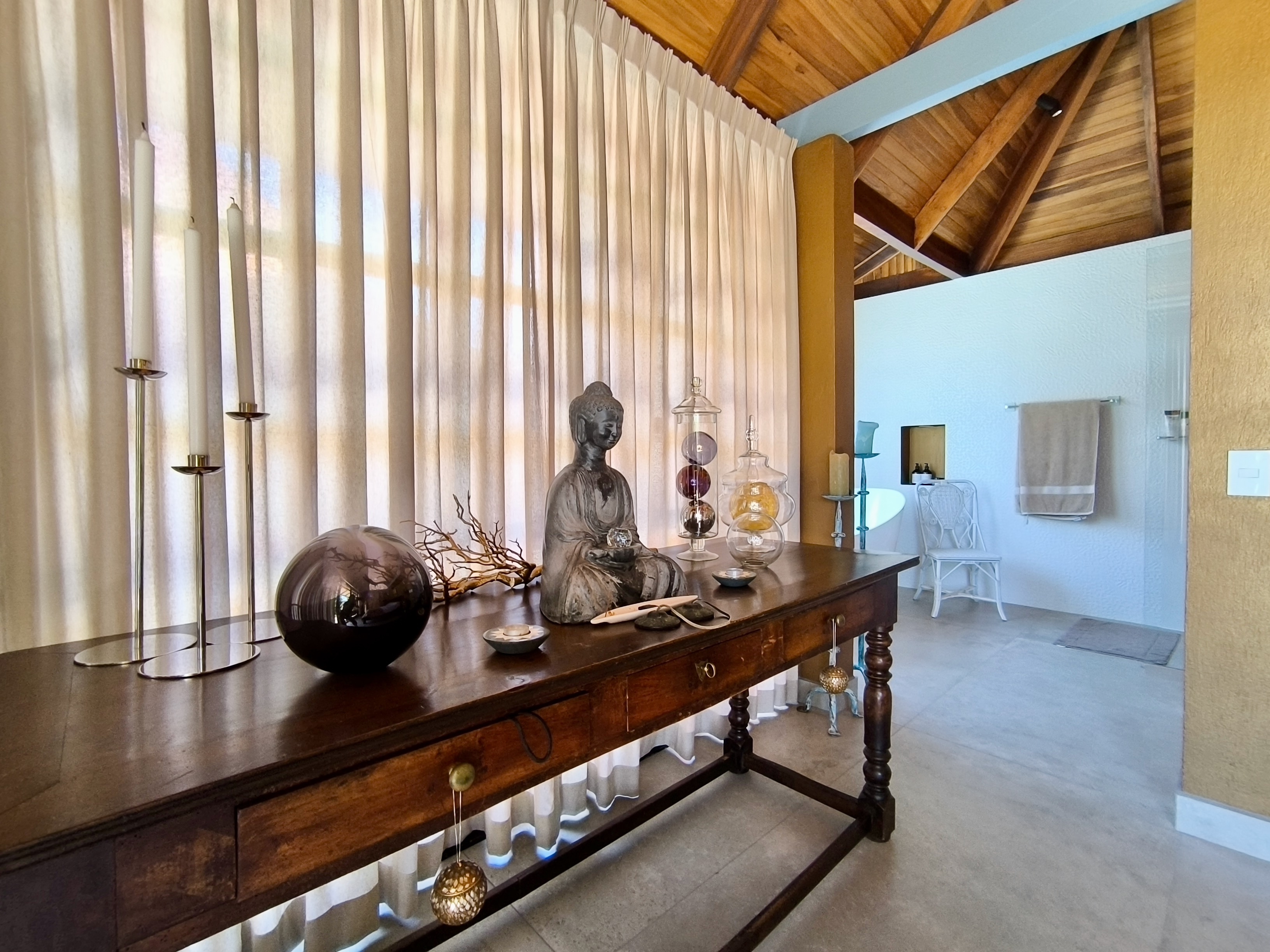 A second pavilion includes a spacious bedroom, refined bathroom, and an adjoining versatile room—currently an artist’s studio—that could easily become another bedroom, gym, or office. This pavilion also features an additional bedroom with its own en-suite bath. A separate structure pays homage to Balinese temple traditions, adding a spiritual dimension to the estate.