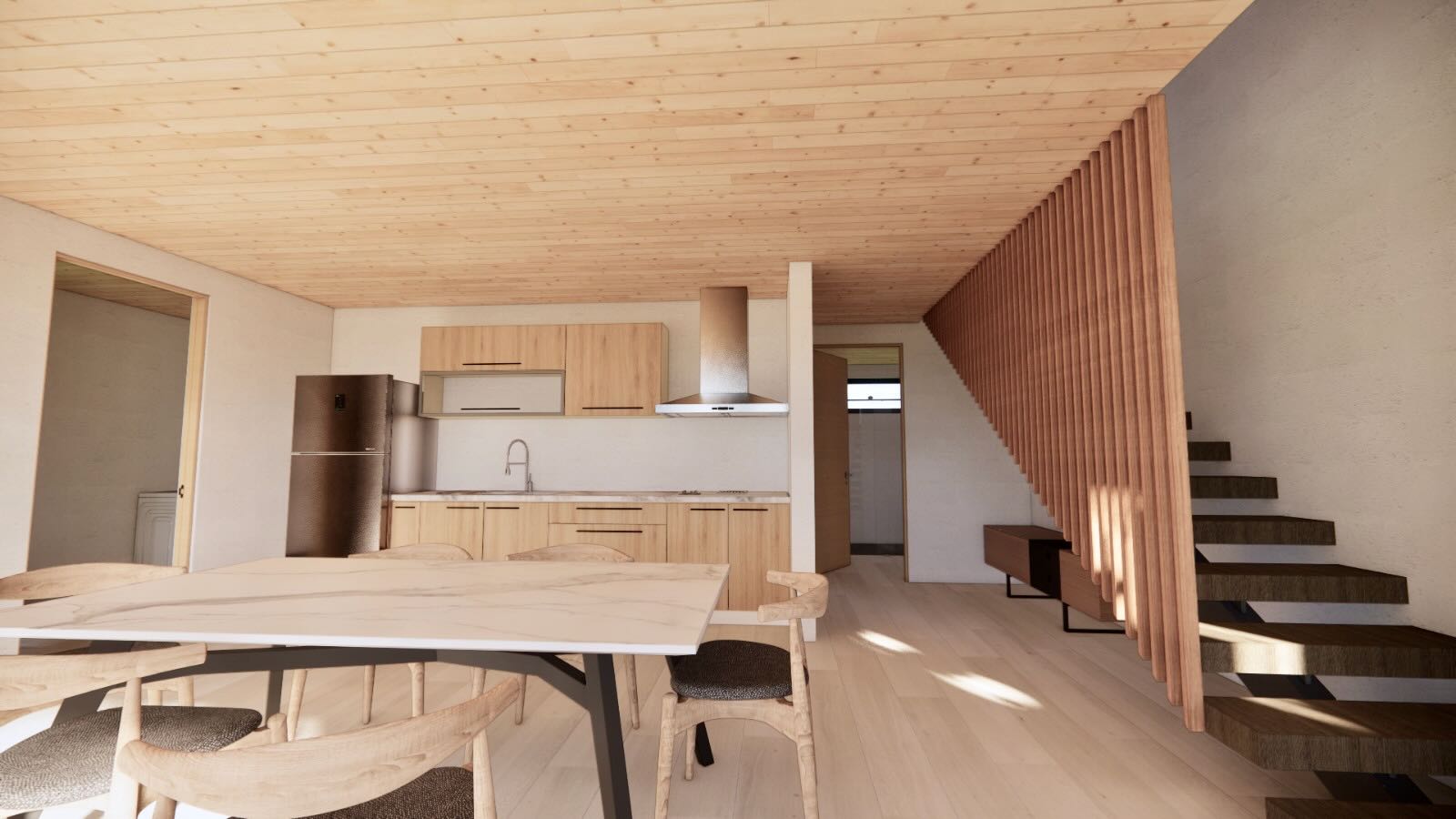 The main floor features a bright open-concept kitchen, dining, and living area, a guest half bath, a convenient laundry room, and a spacious master suite with a walk-in closet and private bath. A terrace extends the living space outdoors, where you can relax and admire the impressive ocean views. Upstairs, you’ll find an open landing ideal for a home office, a guest bedroom with a shared bathroom, and a second master suite with a private bath, walk-in closet, and a balcony offering panoramic vistas. The private pool completes this inviting property.