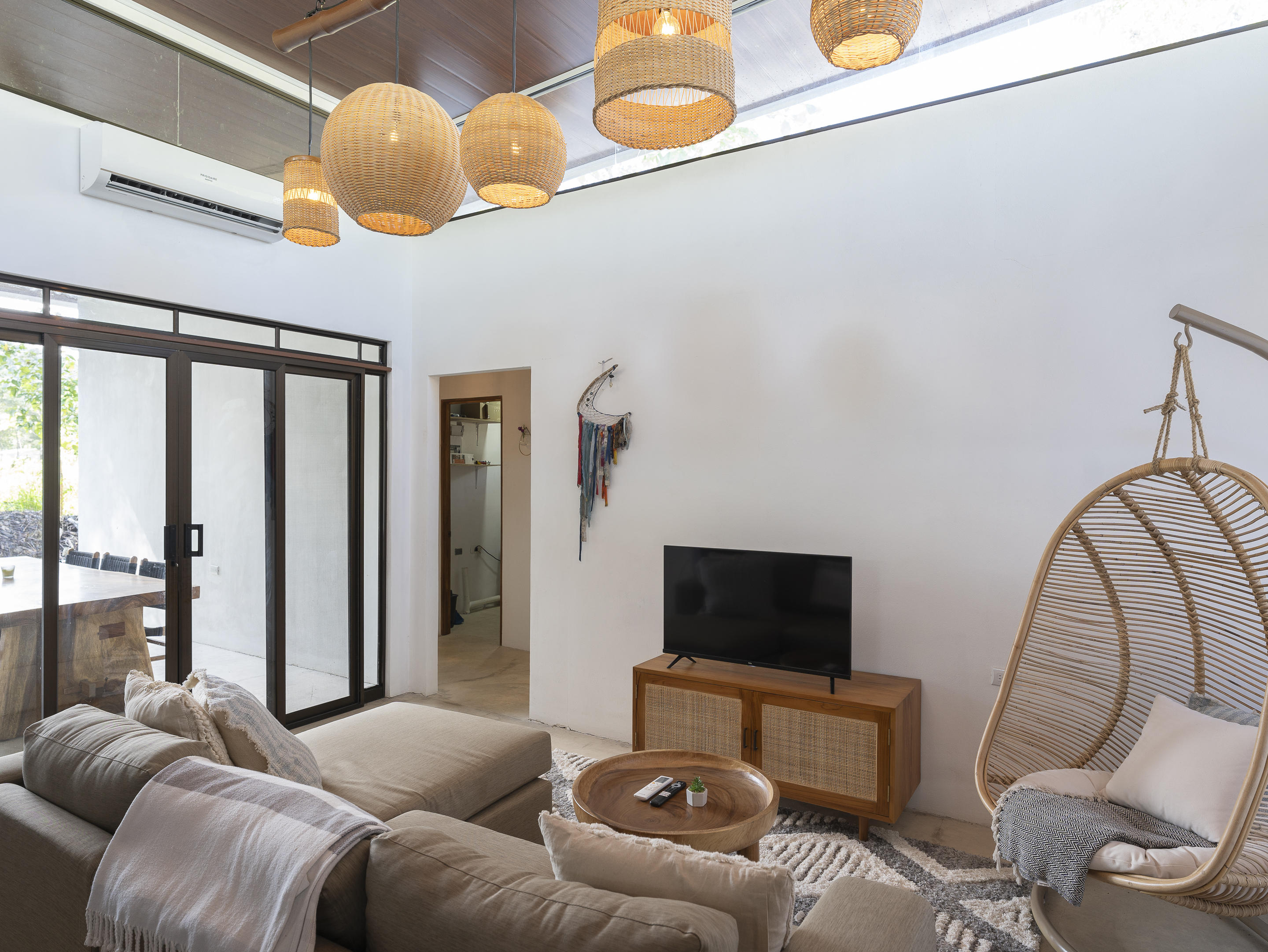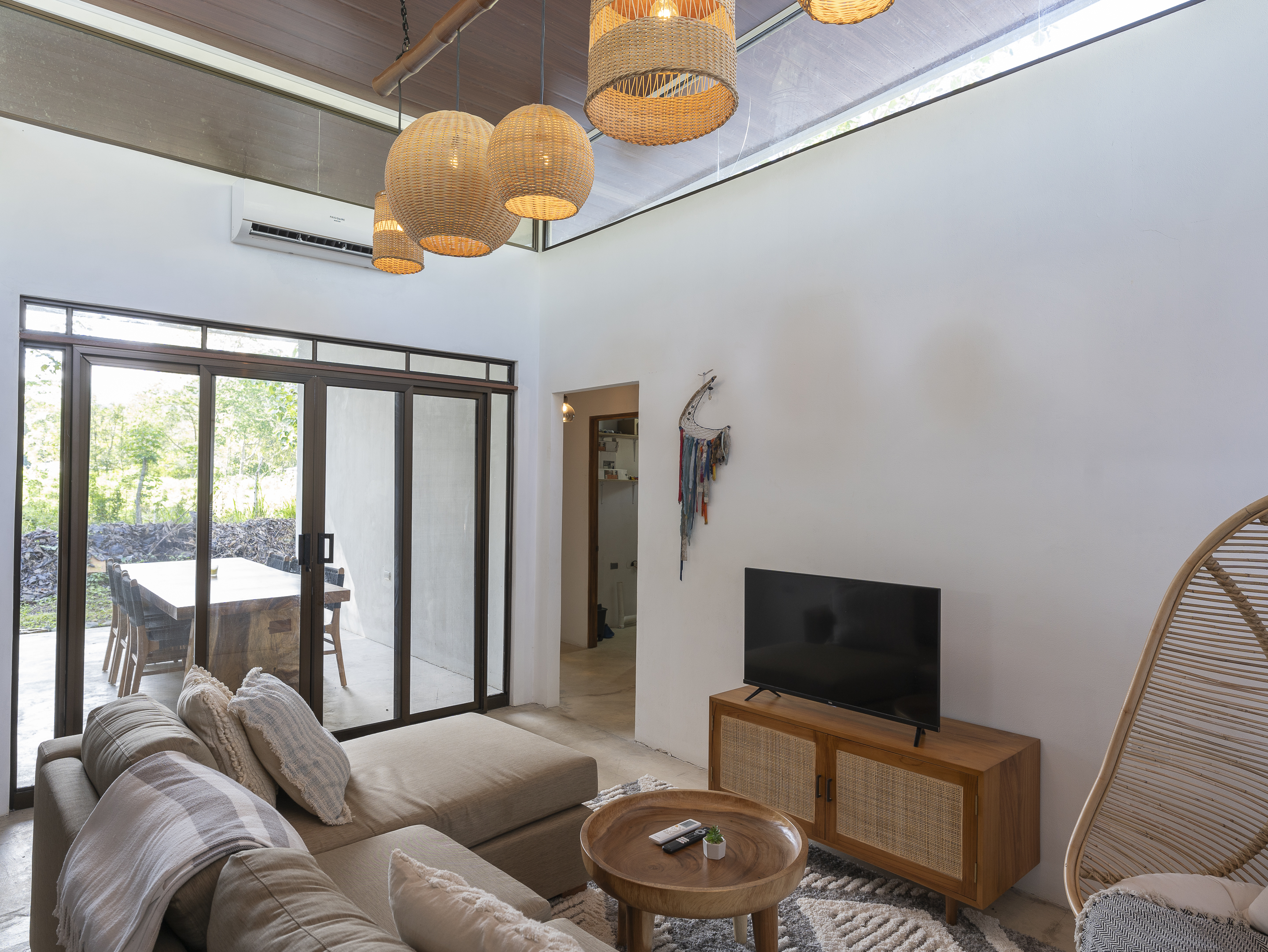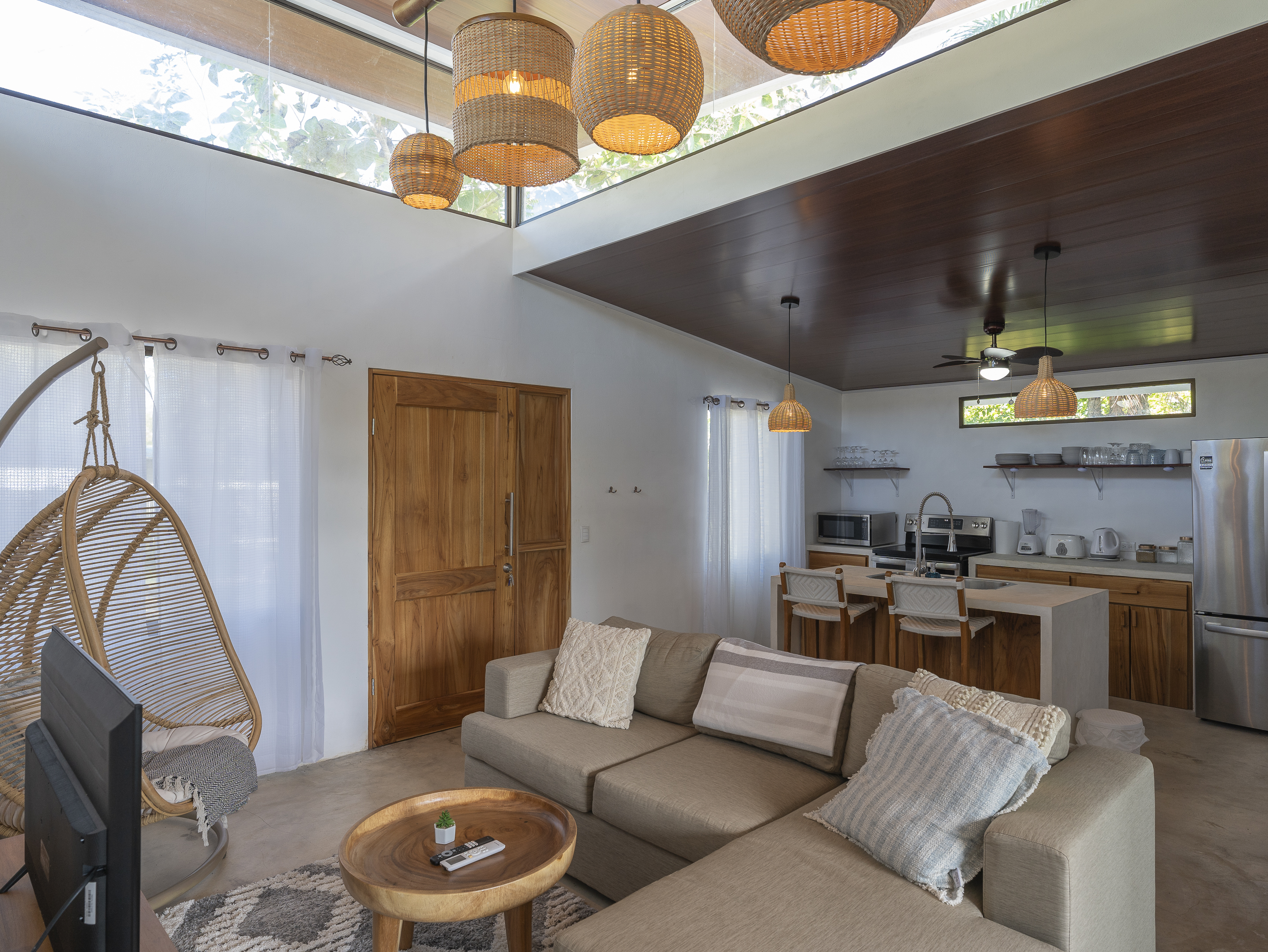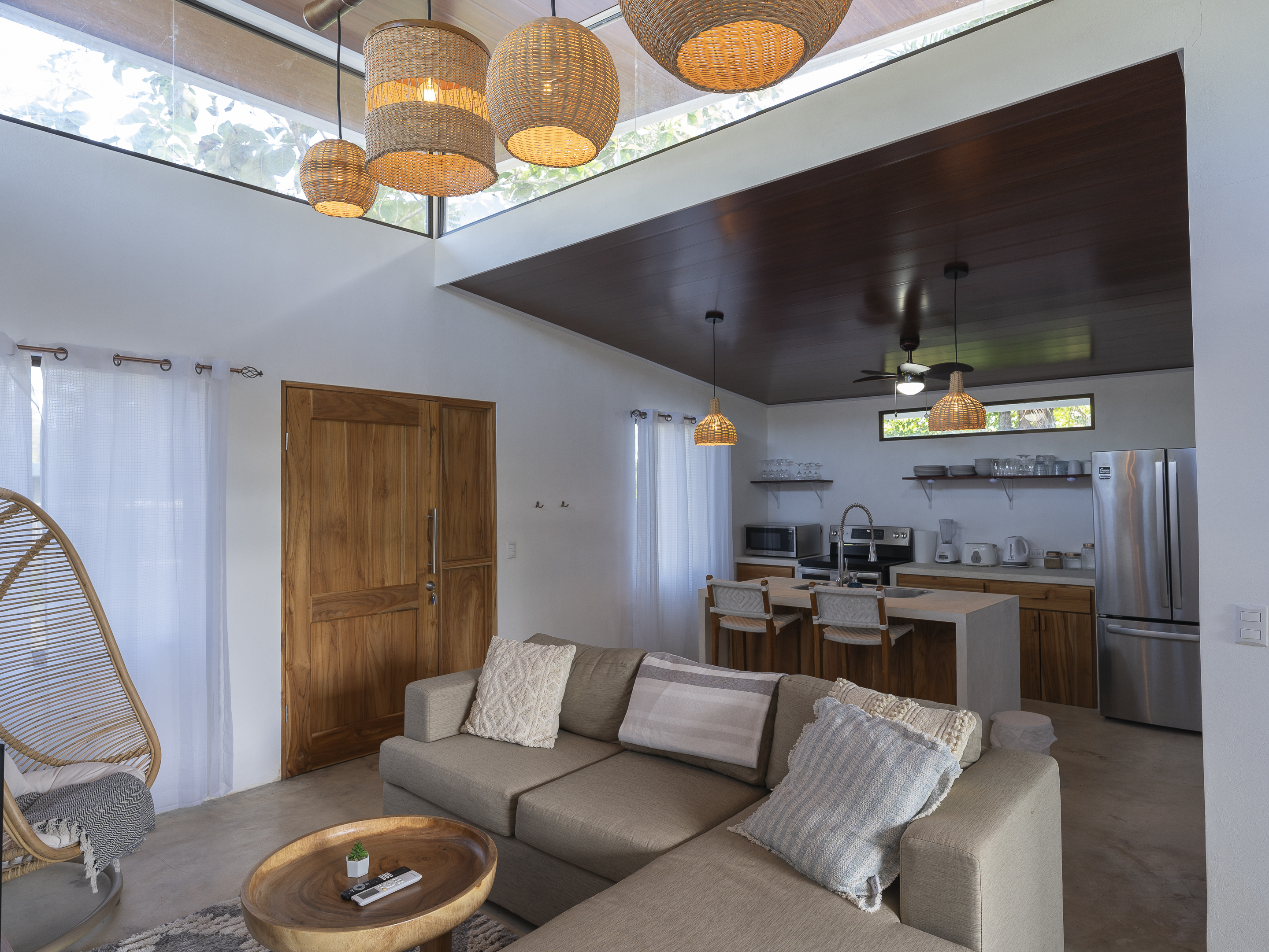 Casa Estrella features 3 bedrooms and 2 bathrooms, with air conditioning in every room to keep you comfortable year-round. The house is equipped with brand-new, modern appliances, including a front-loading washer and dryer. The covered outdoor dining area allows for seamless indoor/outdoor living, while the tall ceilings with skylights let you enjoy stargazing at night. Additional highlights include Bali light fixtures, a double shower in the master bathroom, and double sinks in the bathrooms for added convenience.