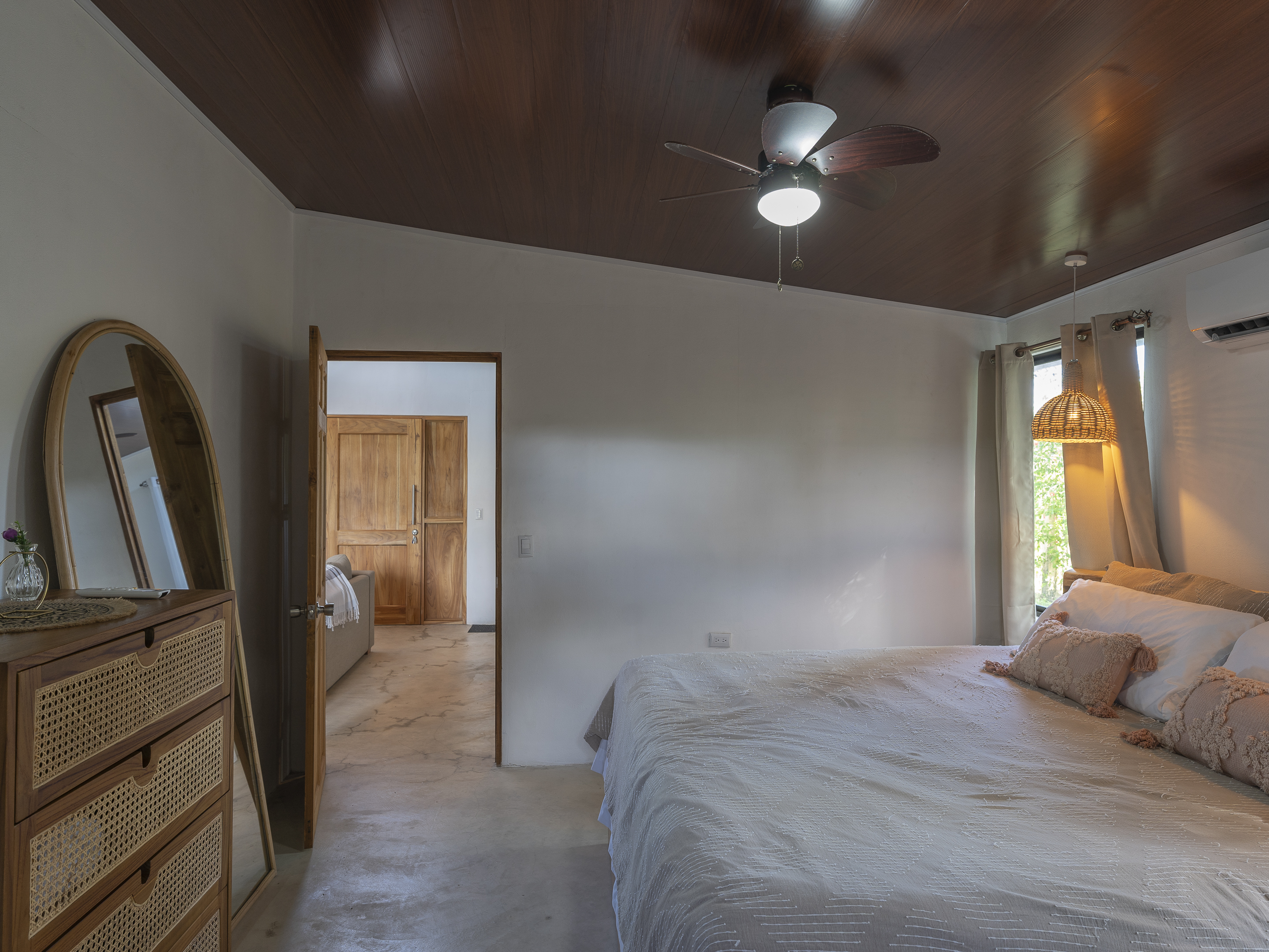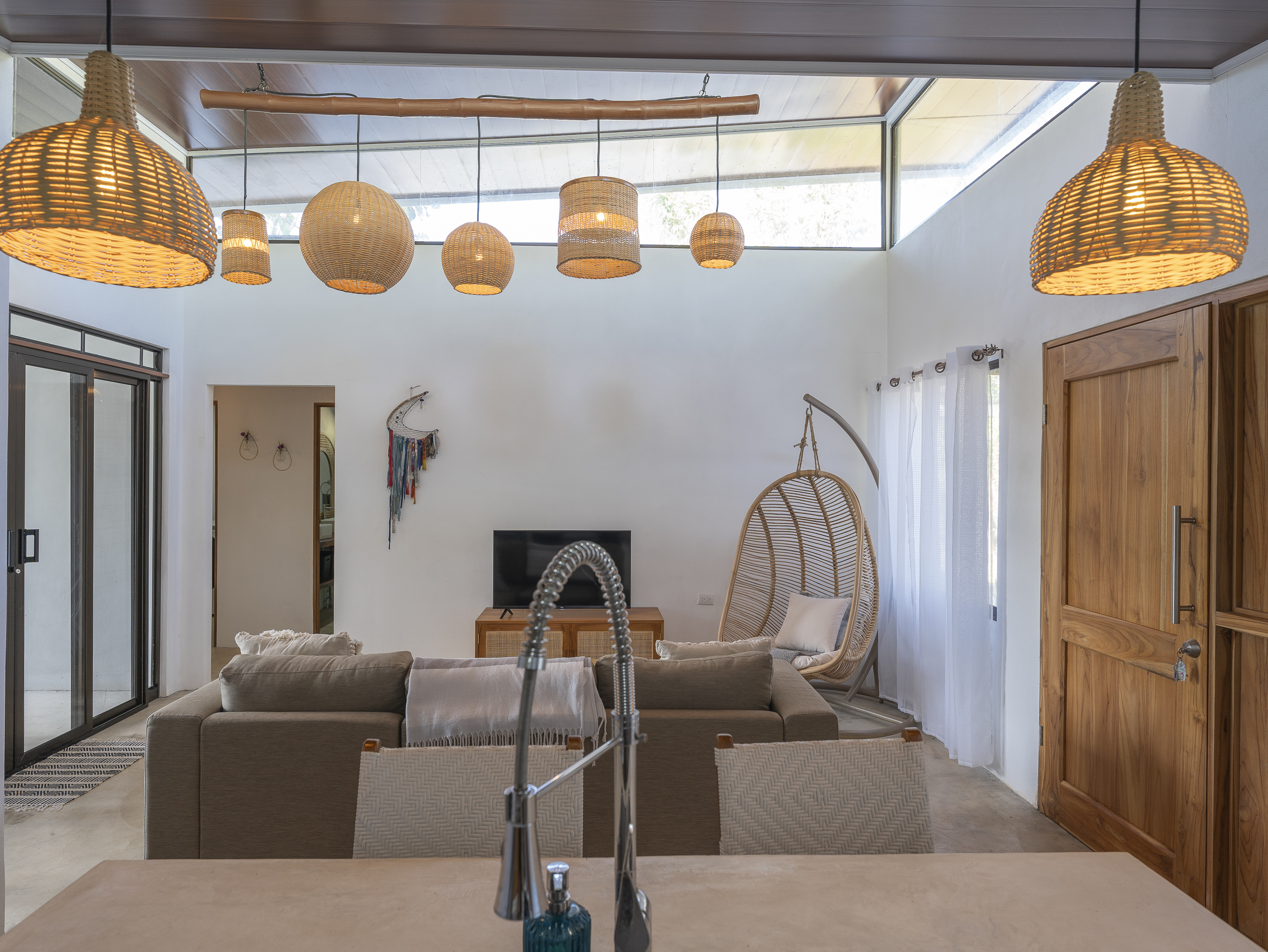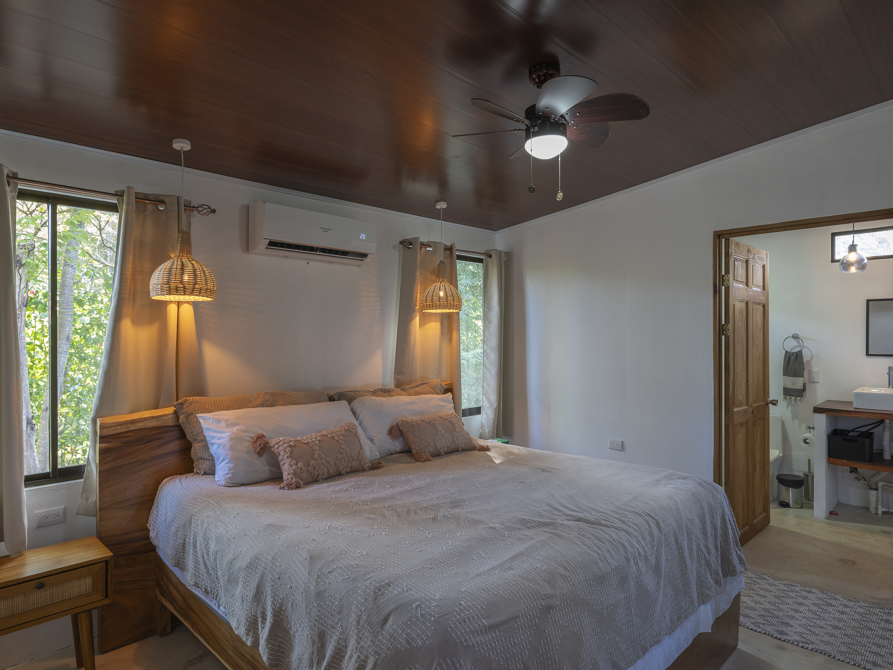 Casa Estrella features 3 bedrooms and 2 bathrooms, with air conditioning in every room to keep you comfortable year-round. The house is equipped with brand-new, modern appliances, including a front-loading washer and dryer. The covered outdoor dining area allows for seamless indoor/outdoor living, while the tall ceilings with skylights let you enjoy stargazing at night. Additional highlights include Bali light fixtures, a double shower in the master bathroom, and double sinks in the bathrooms for added convenience.