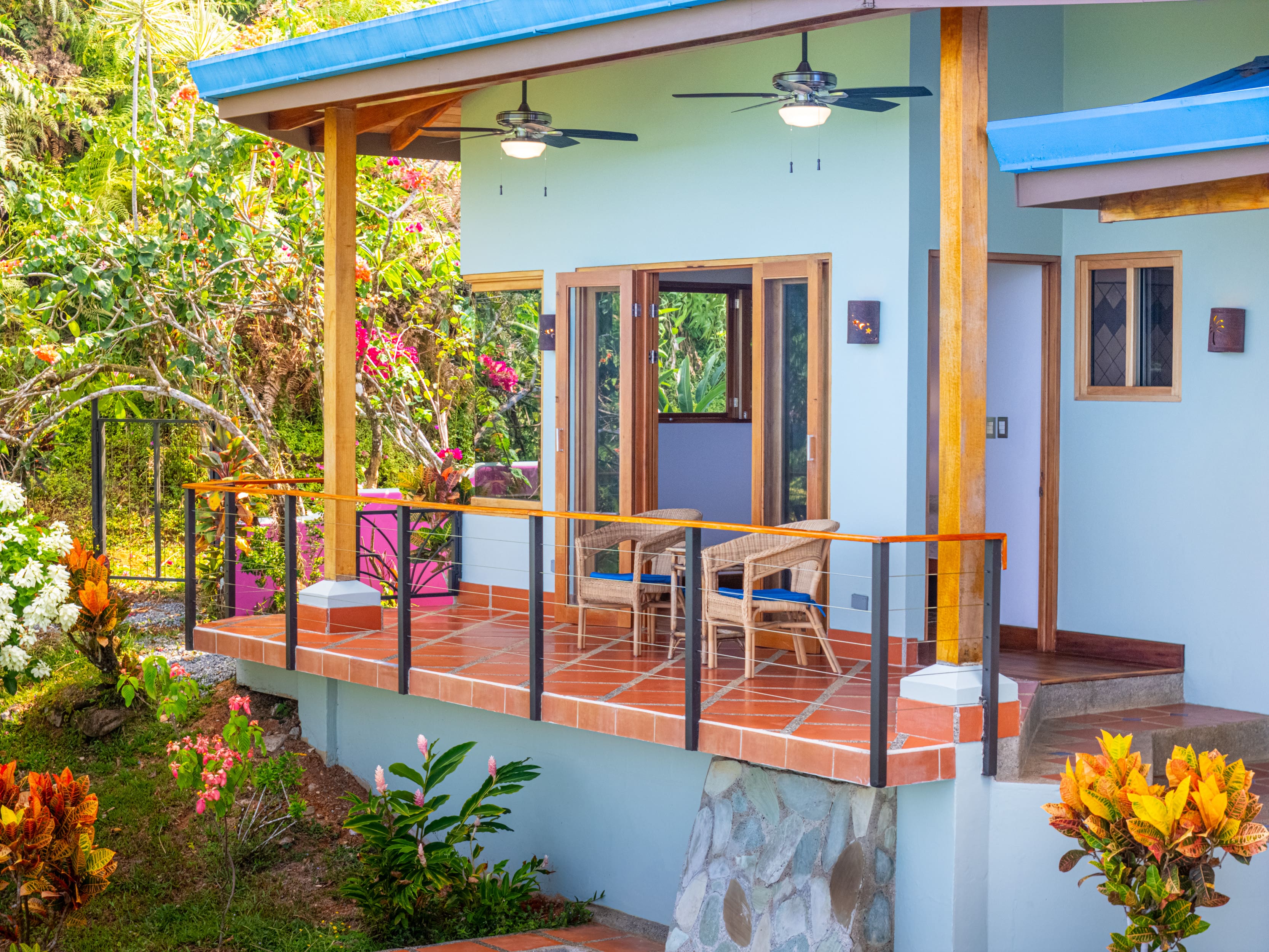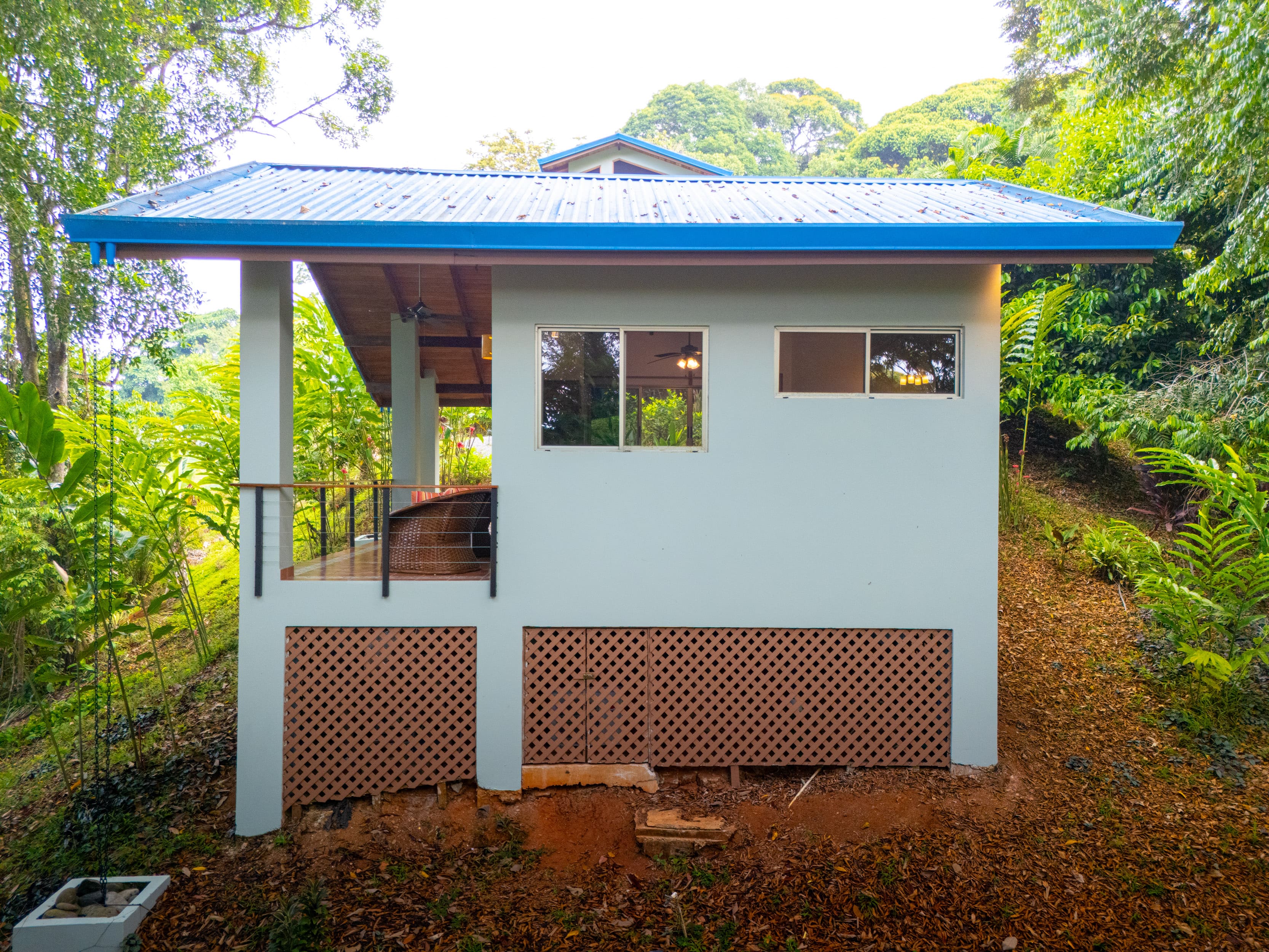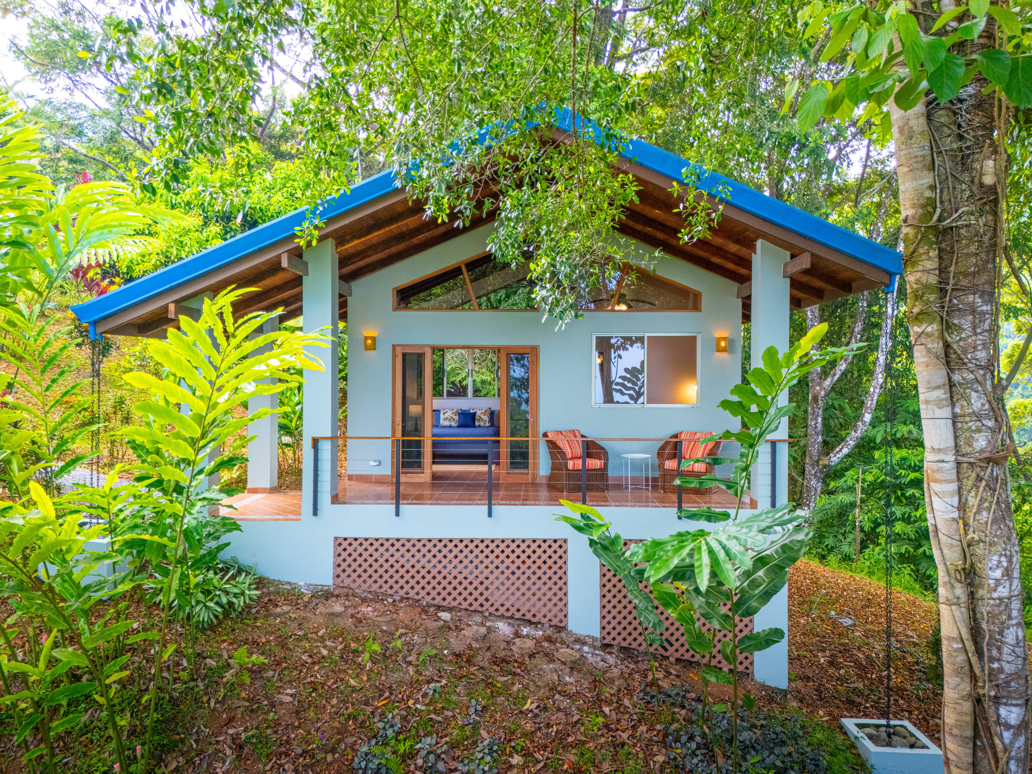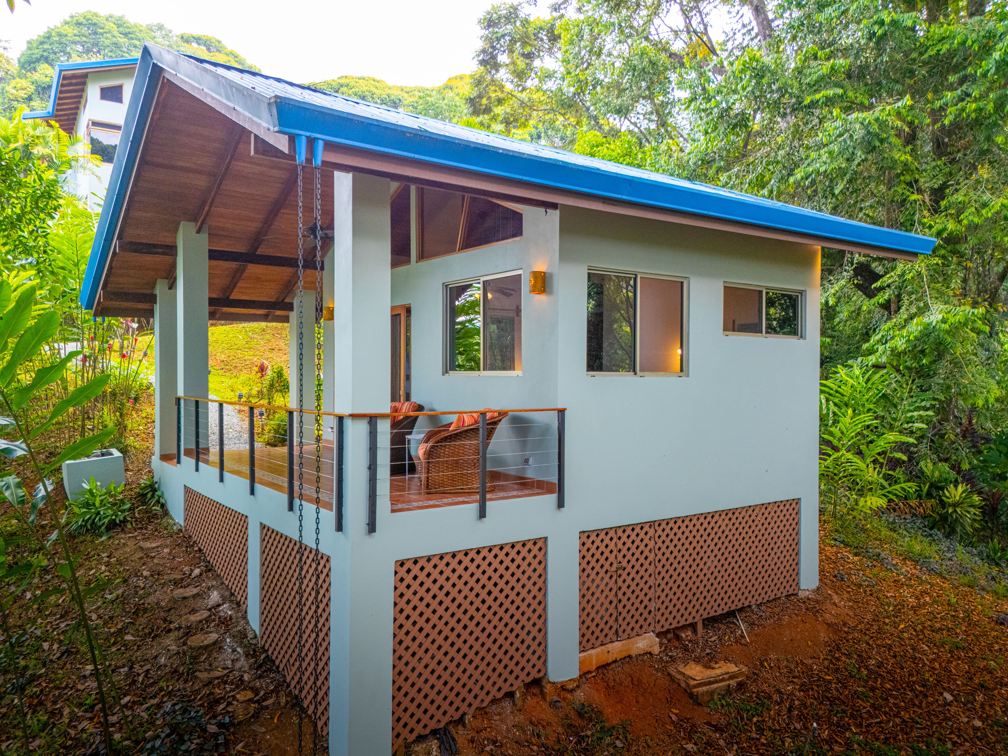 A short path leads to a fully independent guest house tucked among old-growth trees. With its own ocean-view terrace, a full kitchen, bathroom, and large windows perfectly framing the horizon and forest, it’s a favorite spot for guests to enjoy both connection and privacy during their stay.