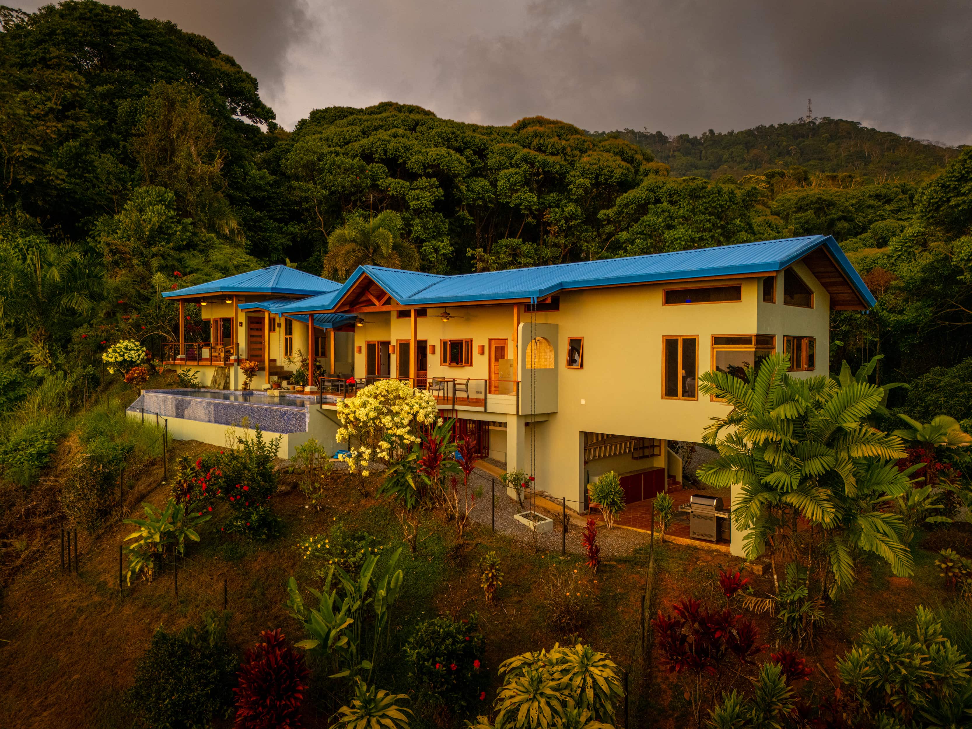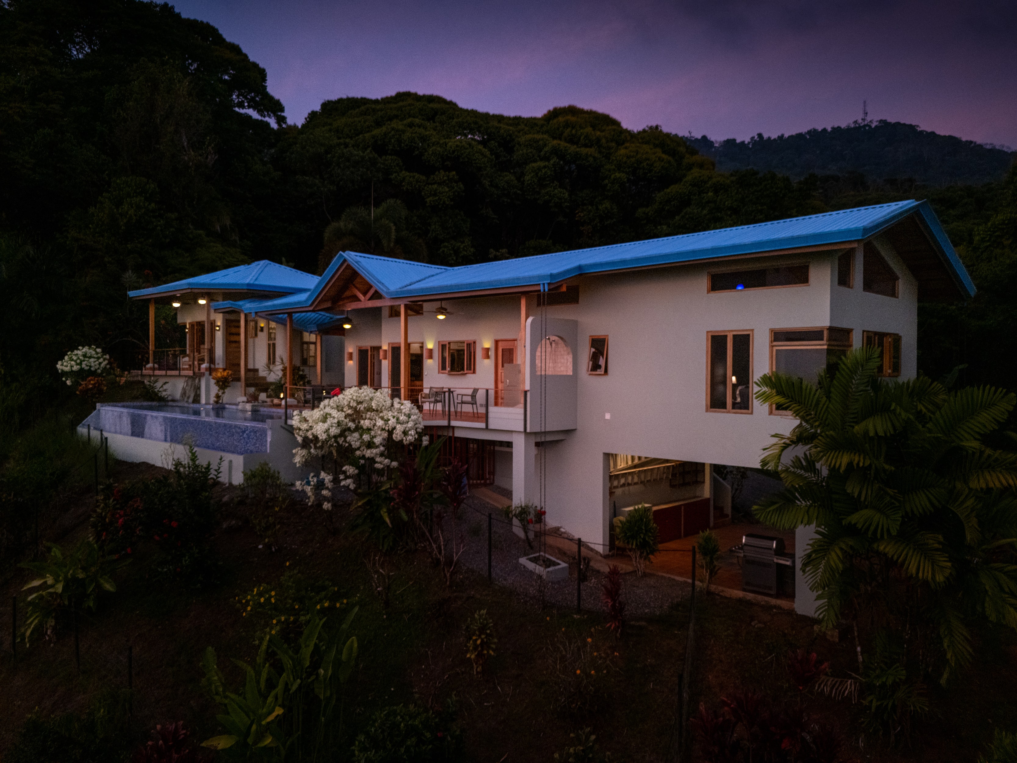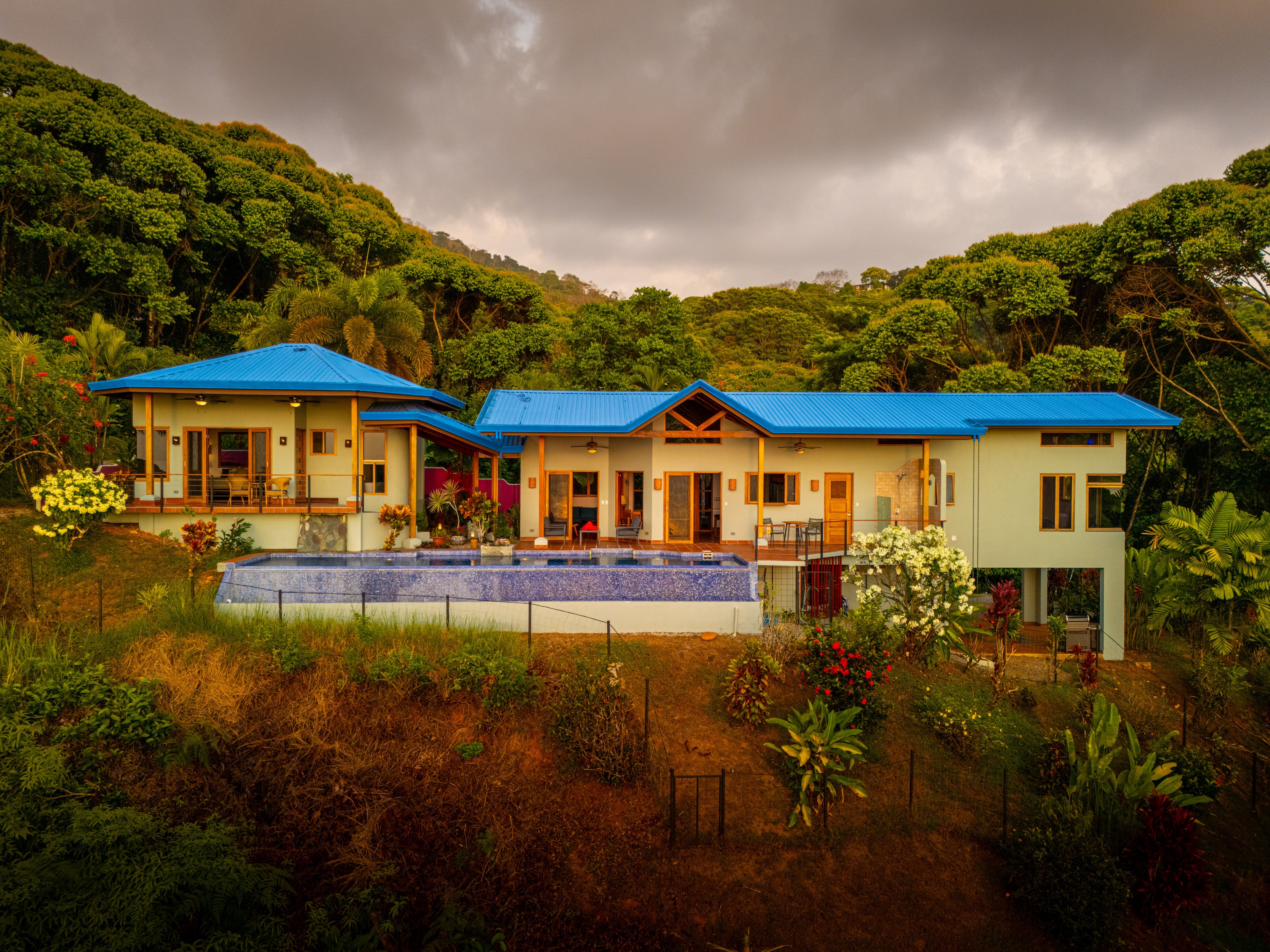 The main house features an open-concept design with multiple walkouts to the terrace and 41-foot infinity-edge lap pool. The kitchen is a chef’s dream with hand-crafted custom cabinetry, porcelain countertops, and a seamless flow into the living and dining areas, all of which are finished with beautiful local wood and terracotta floors. Soaring ceilings and clean lines echo a mid-century modern aesthetic, softened by the warmth of the wood and the lush environment outside.