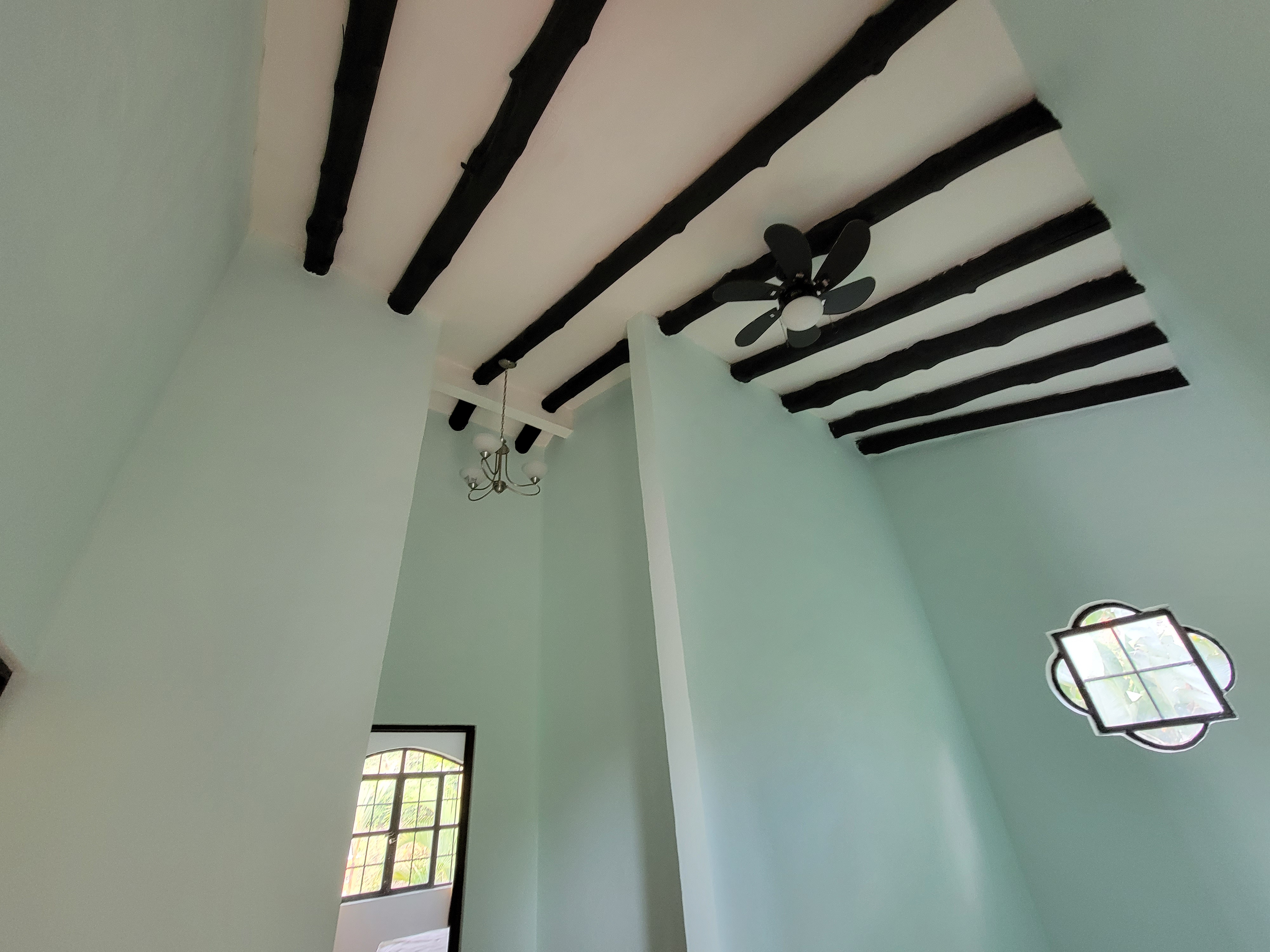 The entire home was recently painted and updated inside and out, including the ceilings with newly sealed and finished wood beams inside and new fascia boards outside. The high ceilings upstairs keep the home cool, even on the hottest summer days. Every room has its own AC and a ceiling fan too so you can choose to use only the ones you need at any given time, saving energy costs.